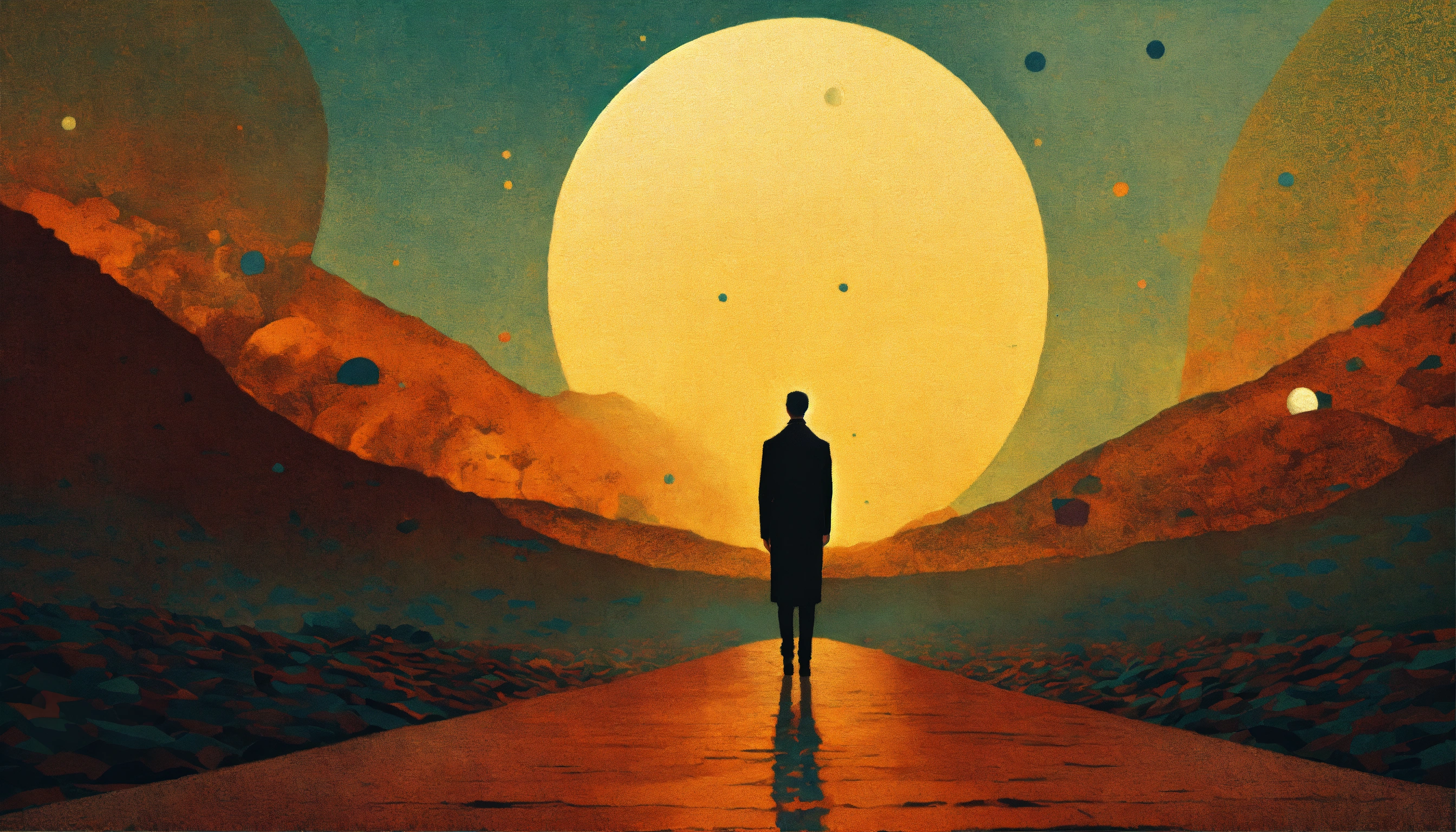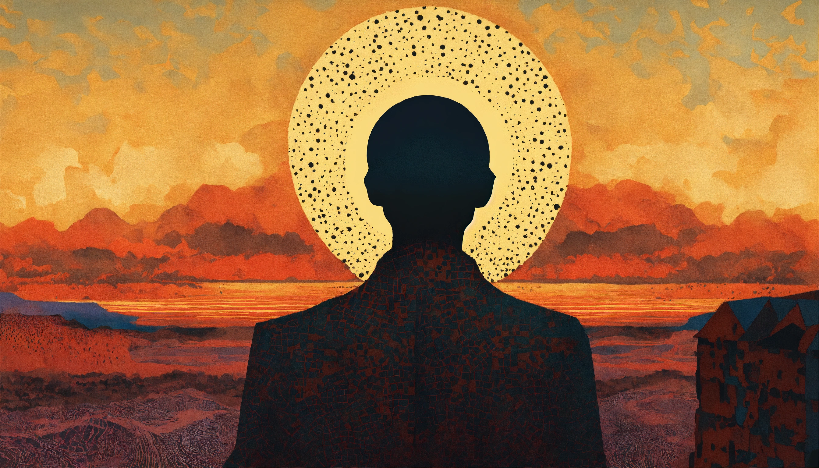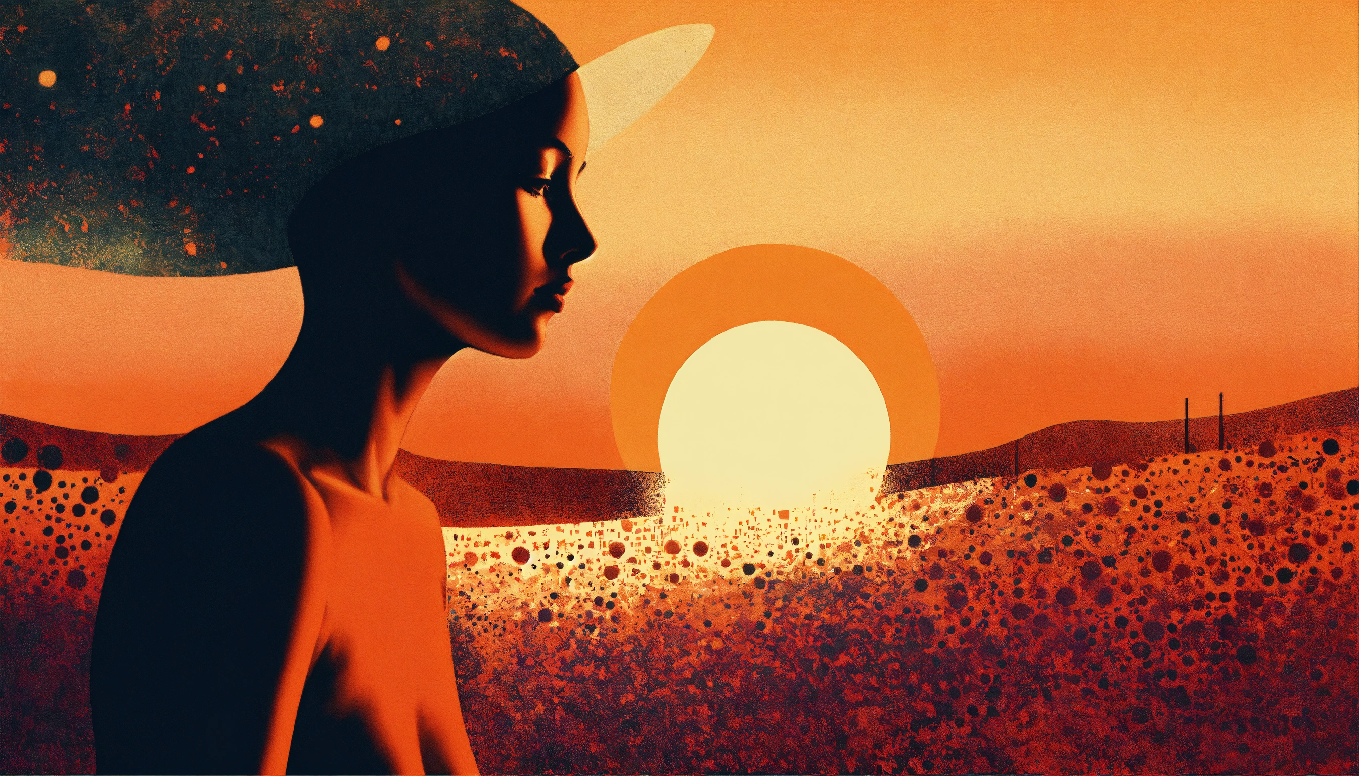Sun profile + halftone pattern + editorial illustration of the memento morti + higly textured, genre defining mixed media collage painting + fringe absurdism + award winning halftone pattern illustration + simple flowing shapes + subtle shadows + paper texture + minimalist color scheme + inspired by zdzisław beksiński.