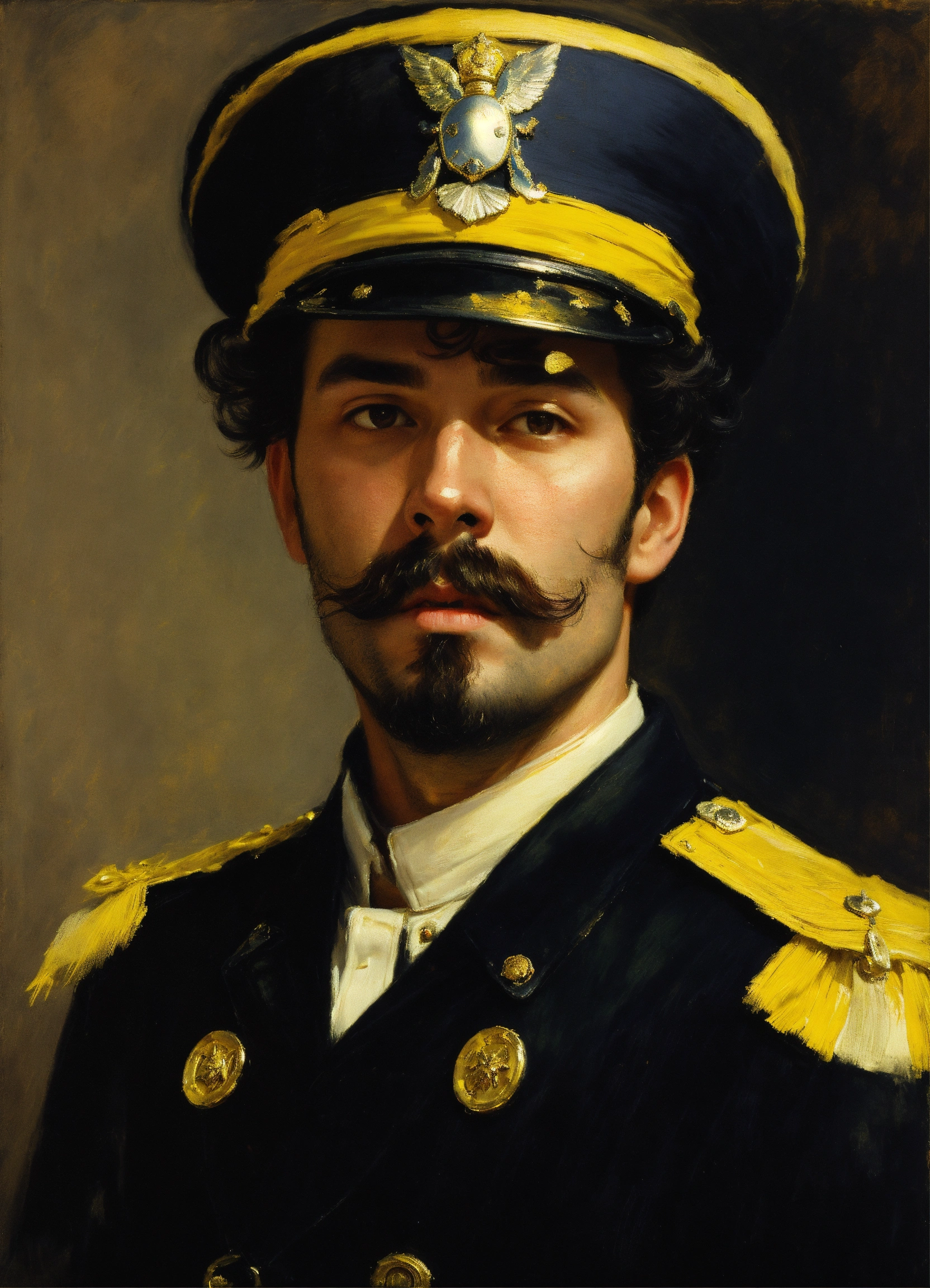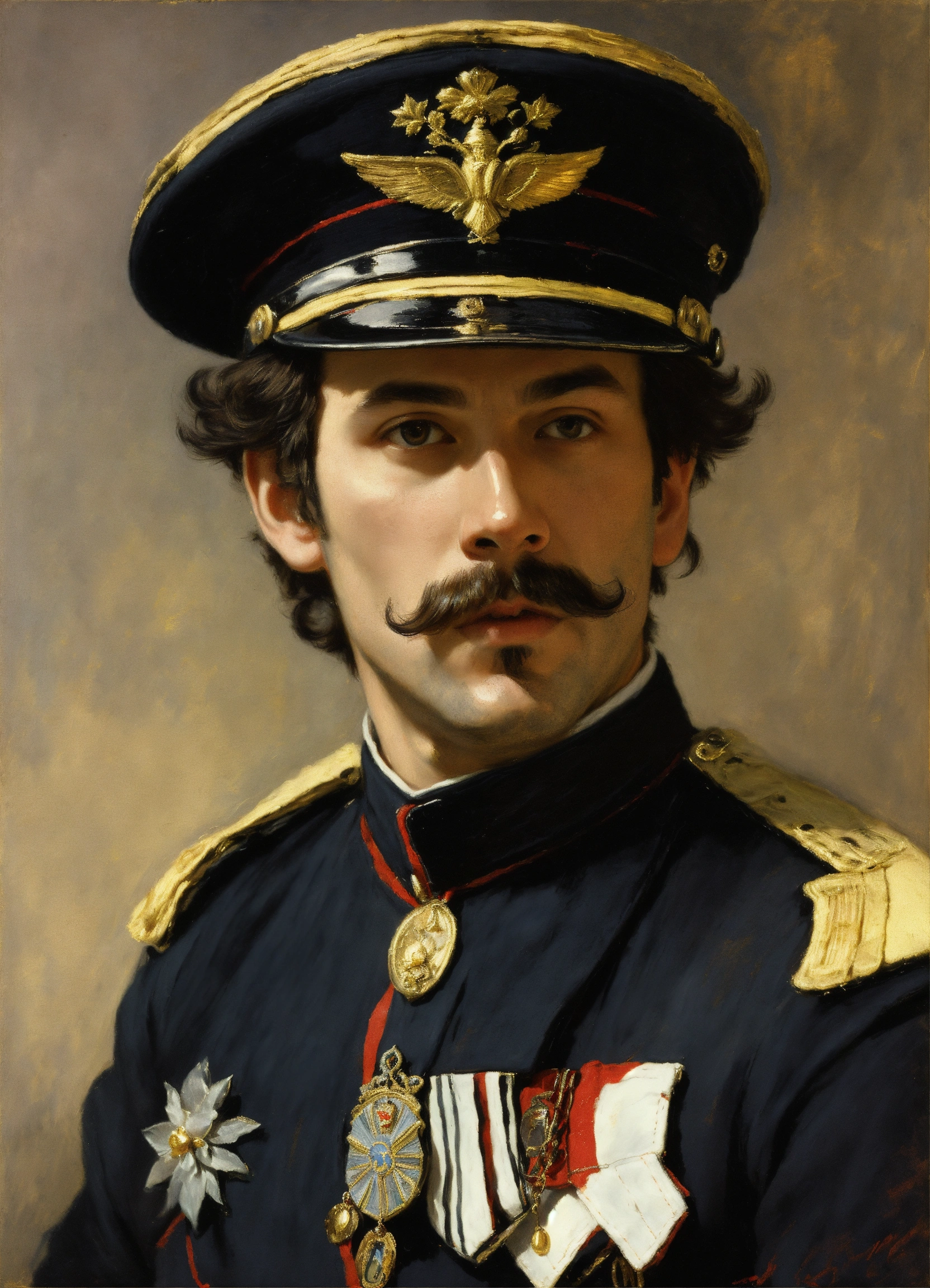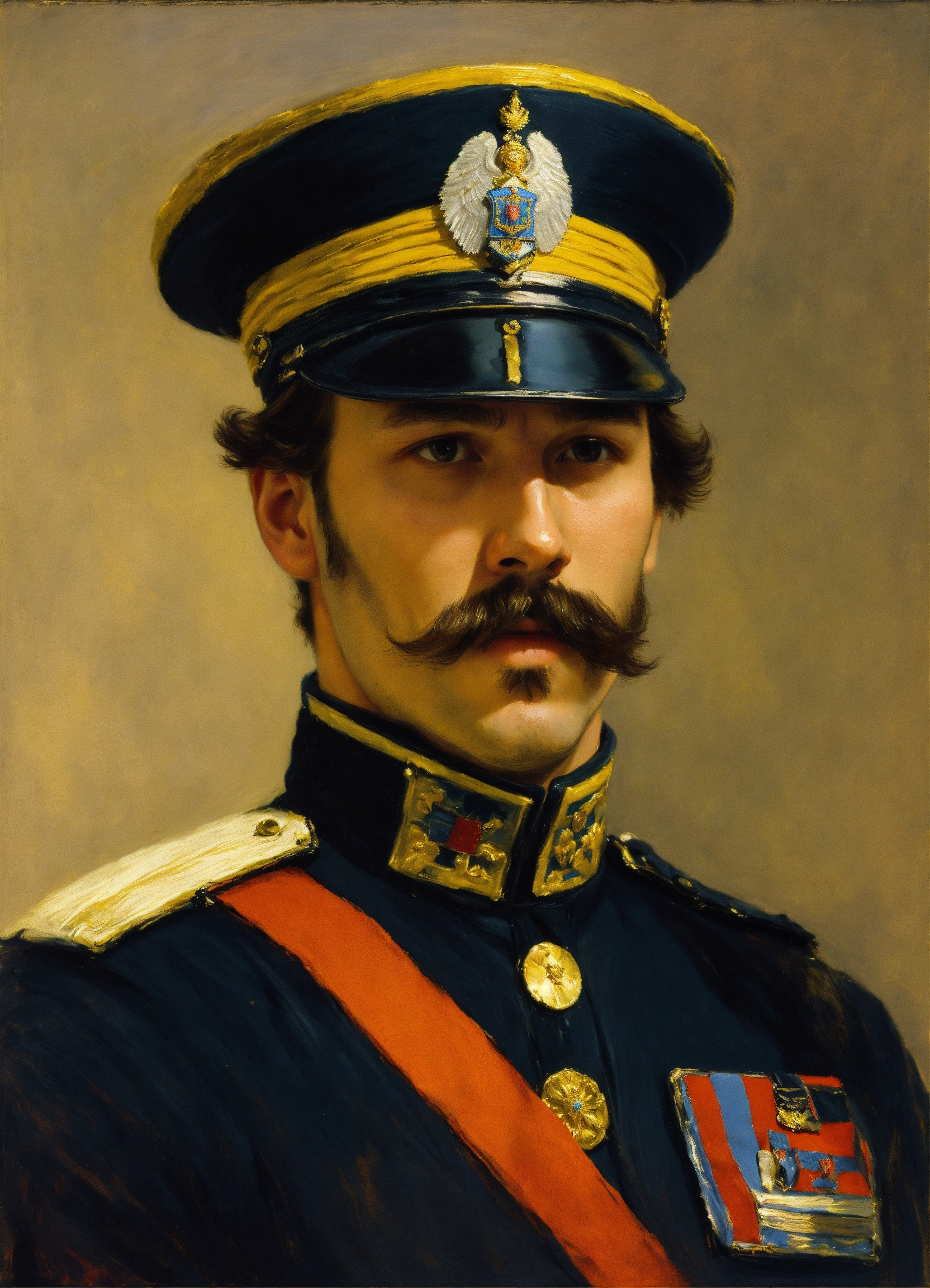 Artwork by ilya repin a middle-aged young man in his mid-thirties, with a handsome face, white and yellow skin. there is a slight mustache on the face. black hair trembling wearing the uniform of a patrol officer with the rank of sergeant