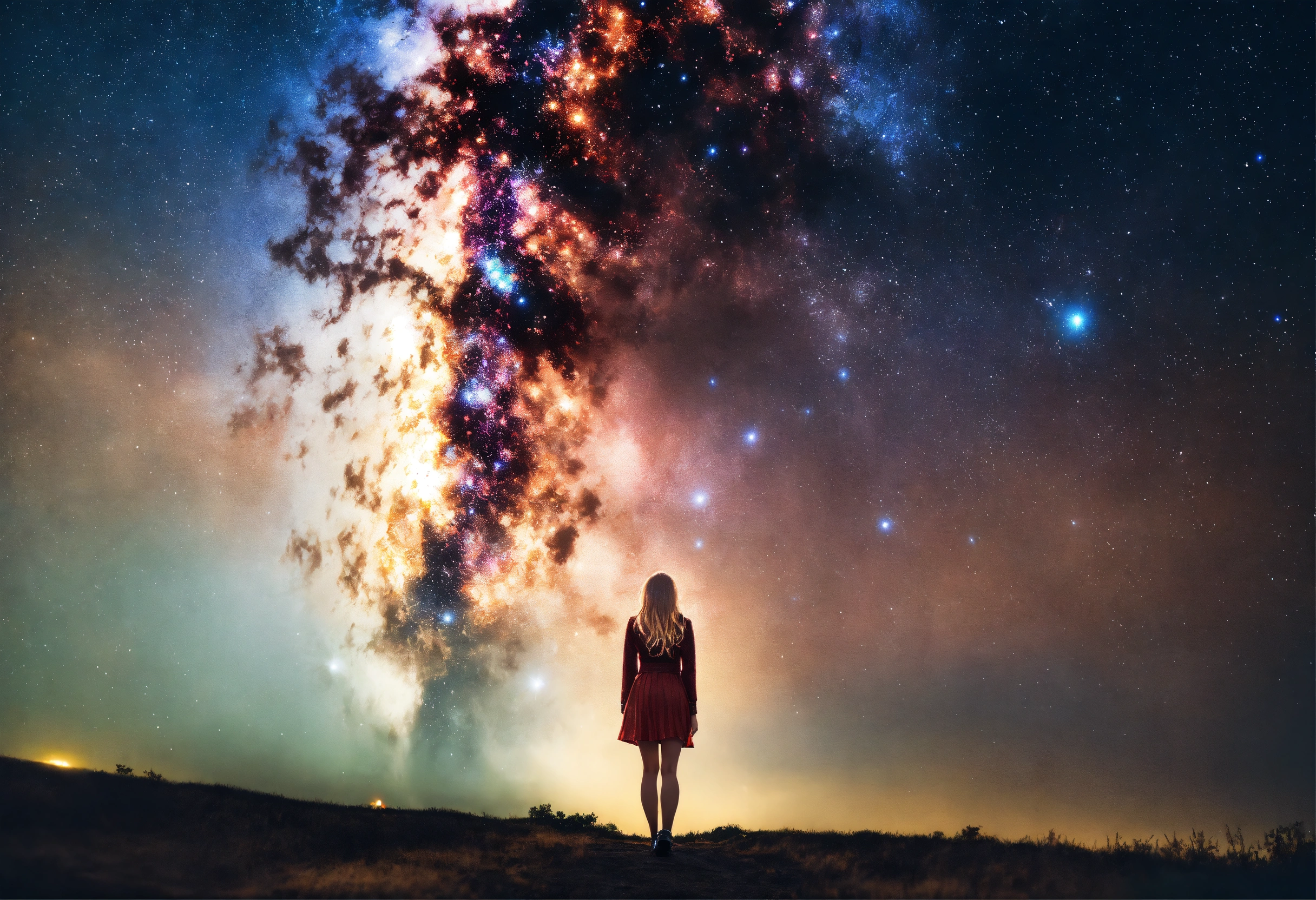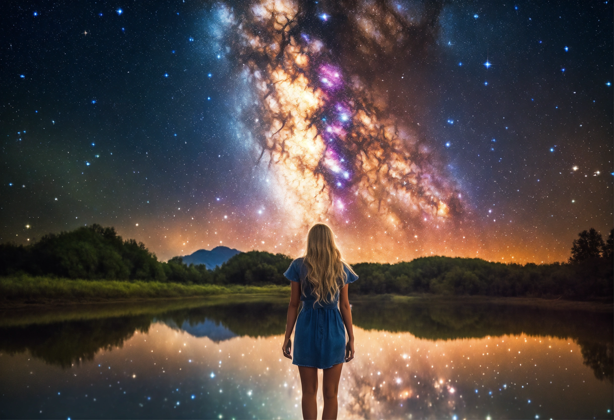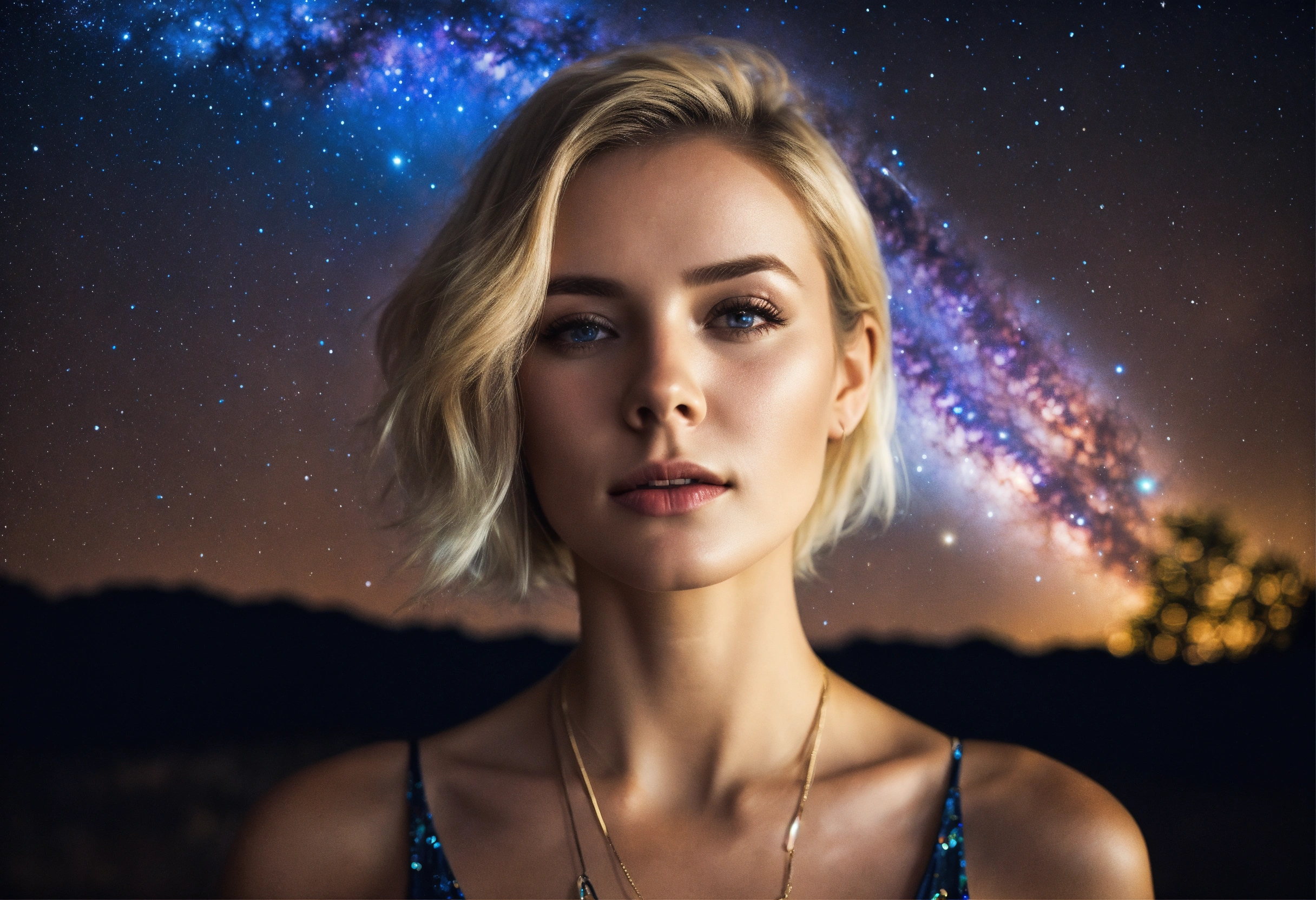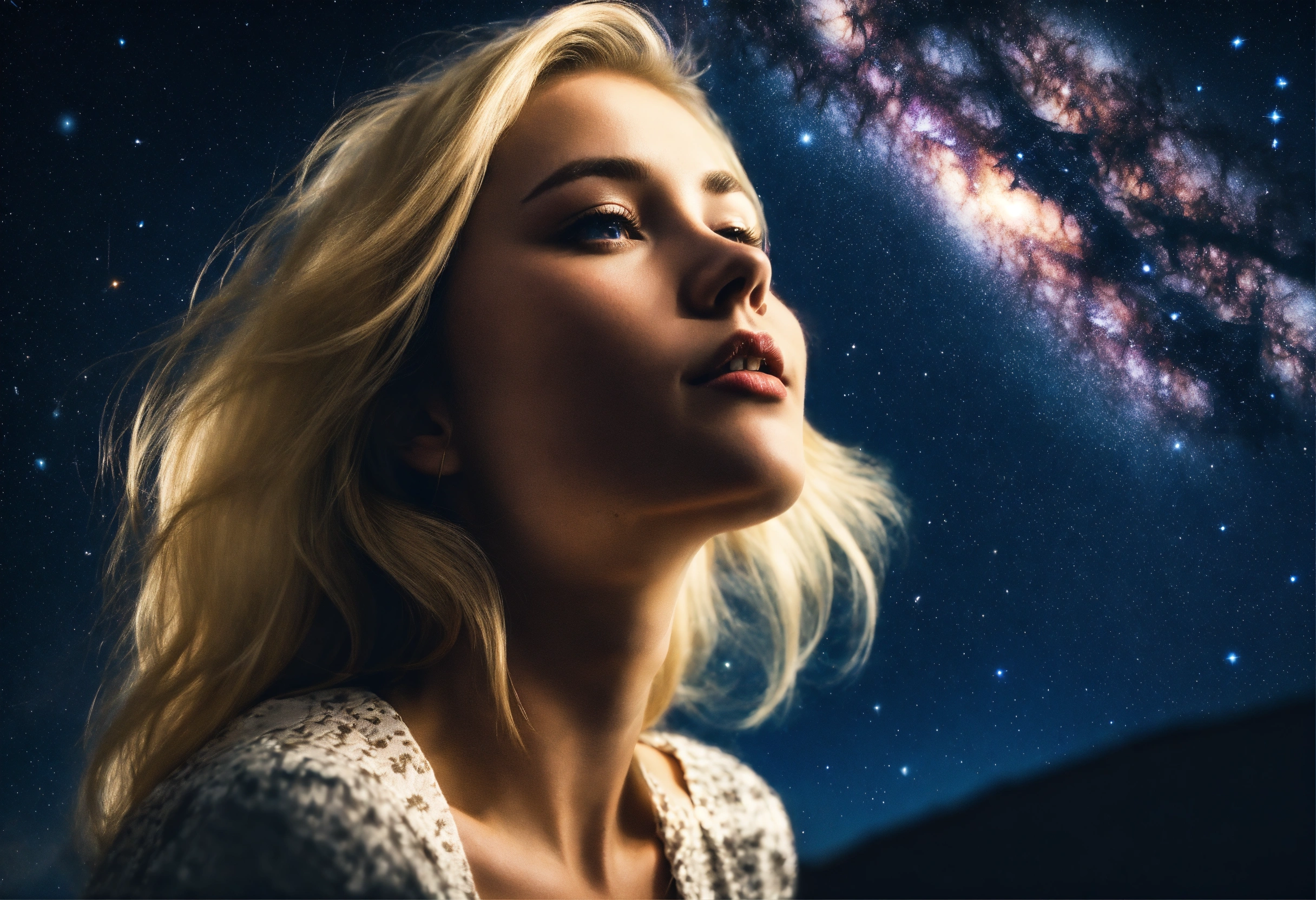 Picture of a blonde woman standing under the galaxy with the stars falling on her with a bright light shining above her