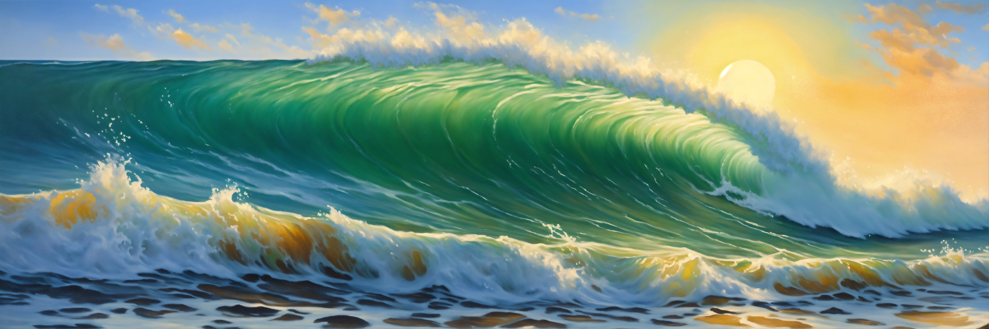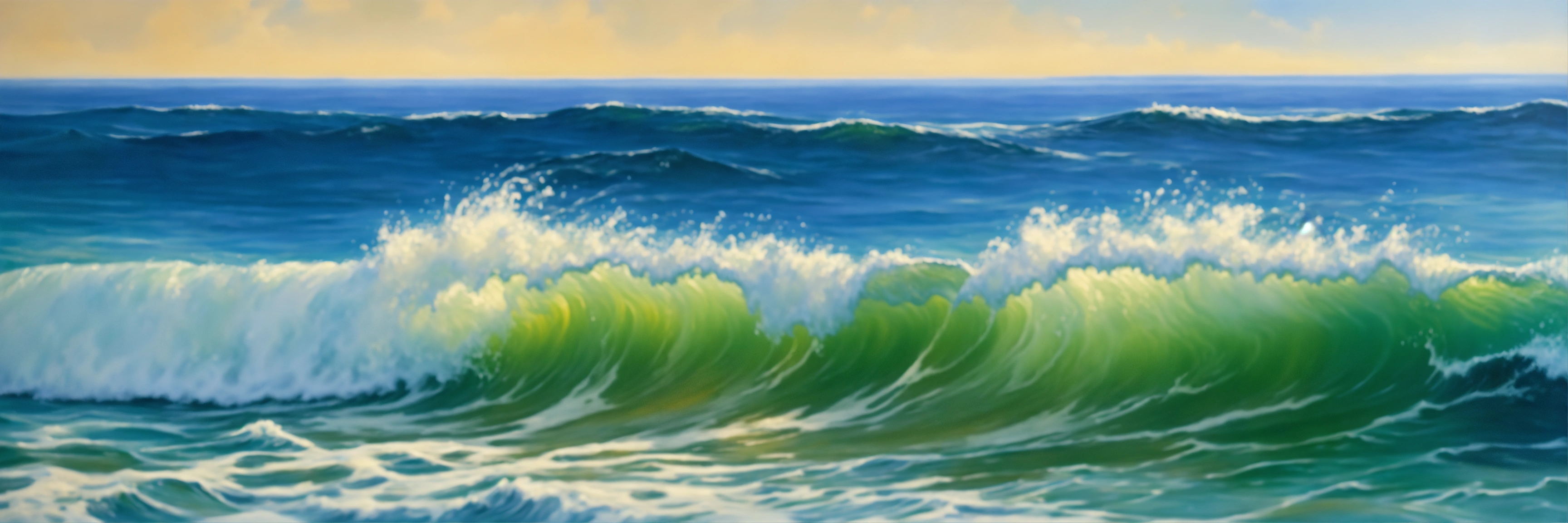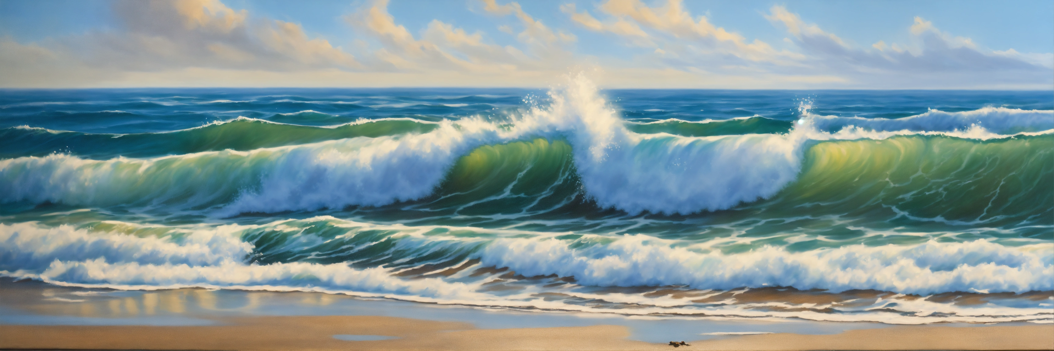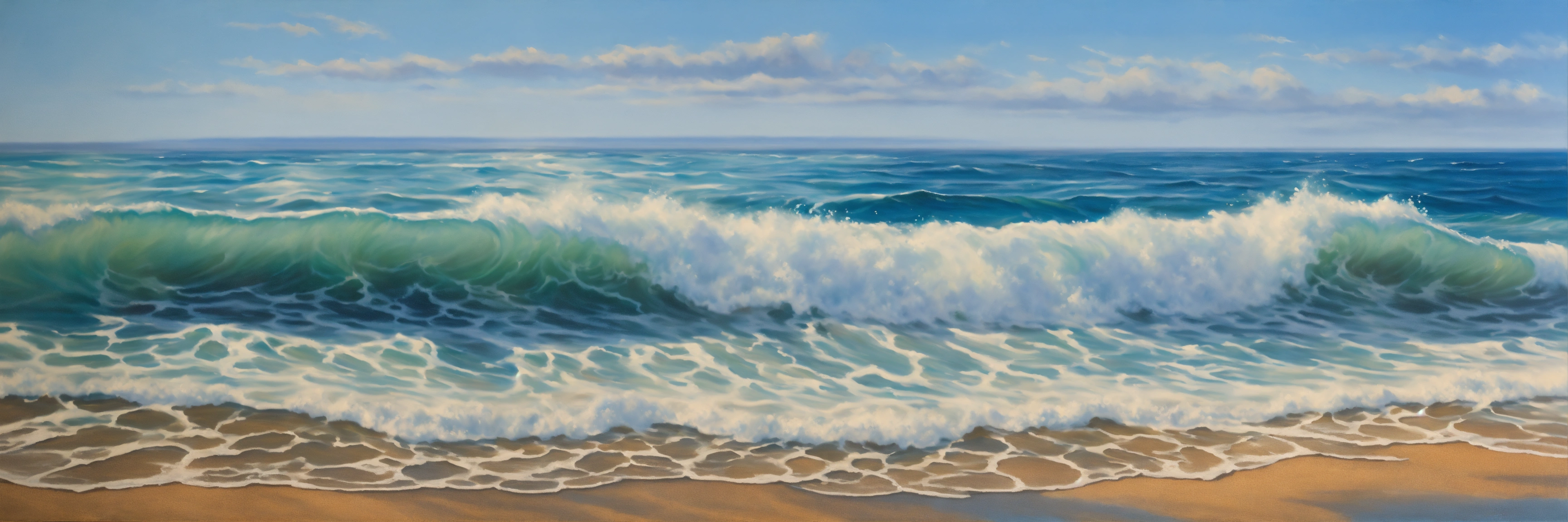 Seascape a panoramic format oil painting of a long sea wave with foam, under the noon daylight and blue sky.
