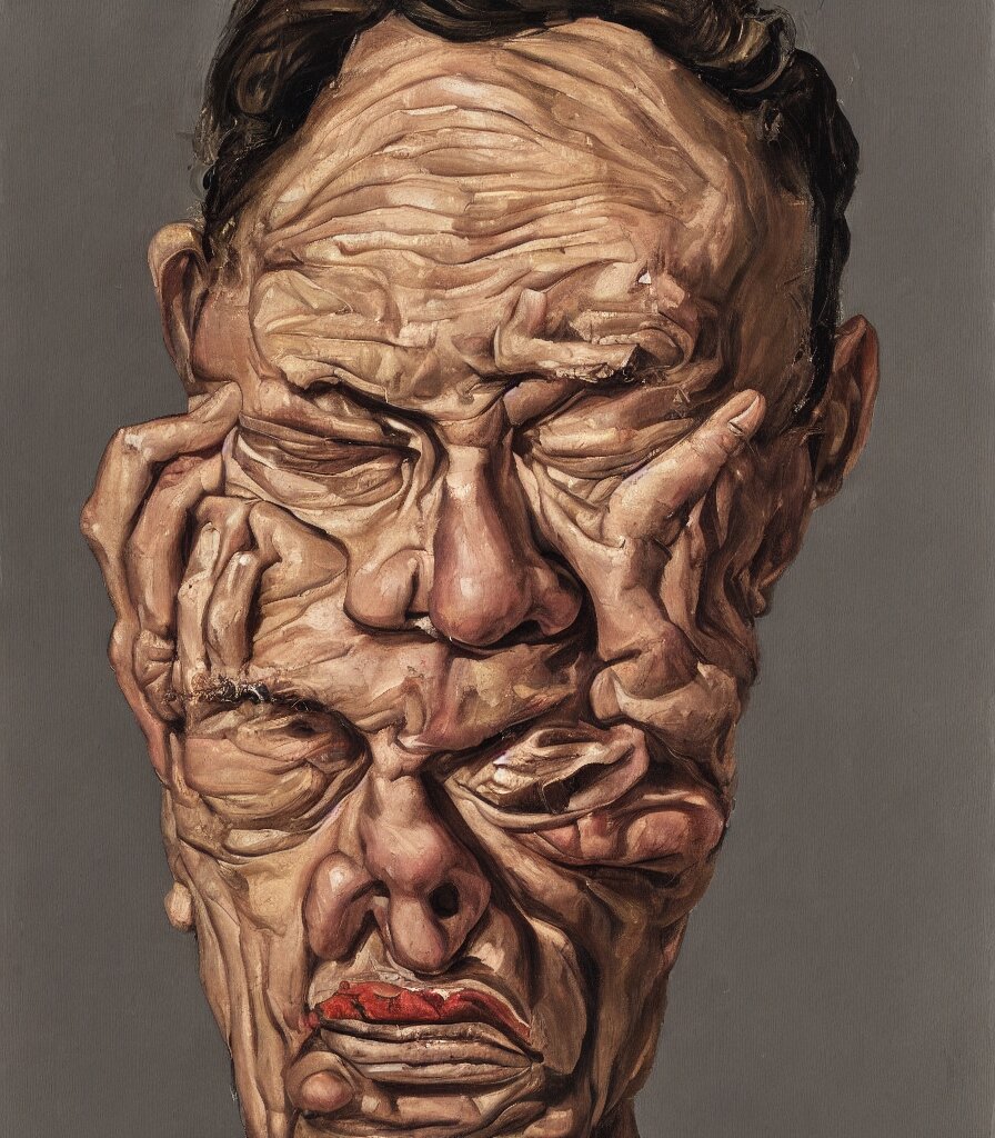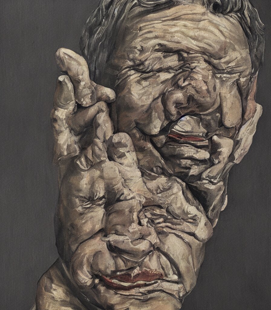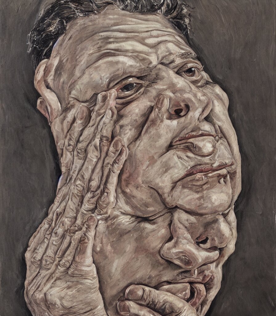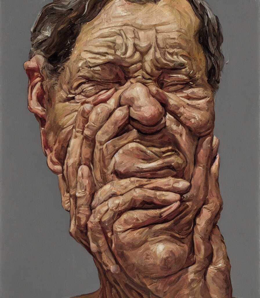 Portrait of a muculous man in the style of lucian freud. mouth slightly open. he has closed her eyes, leaping towards us. face has many wrinkles, cuts, tired. he is looking down on us. oil painting, thick brush strokes. hard, strong shadows under the head. high contrast. clean gray brown background. lit by a single hard light from above their heads. colorful face. perspective from below. hyperrealistic. discomfort