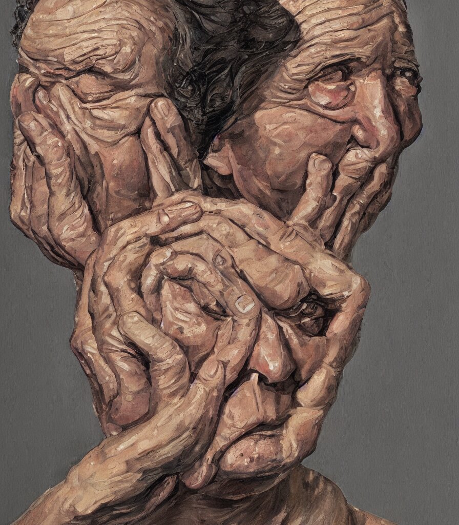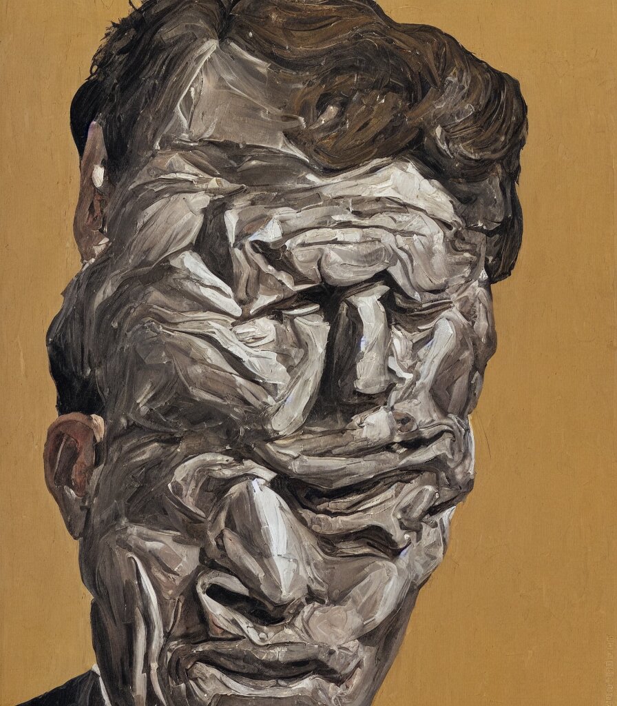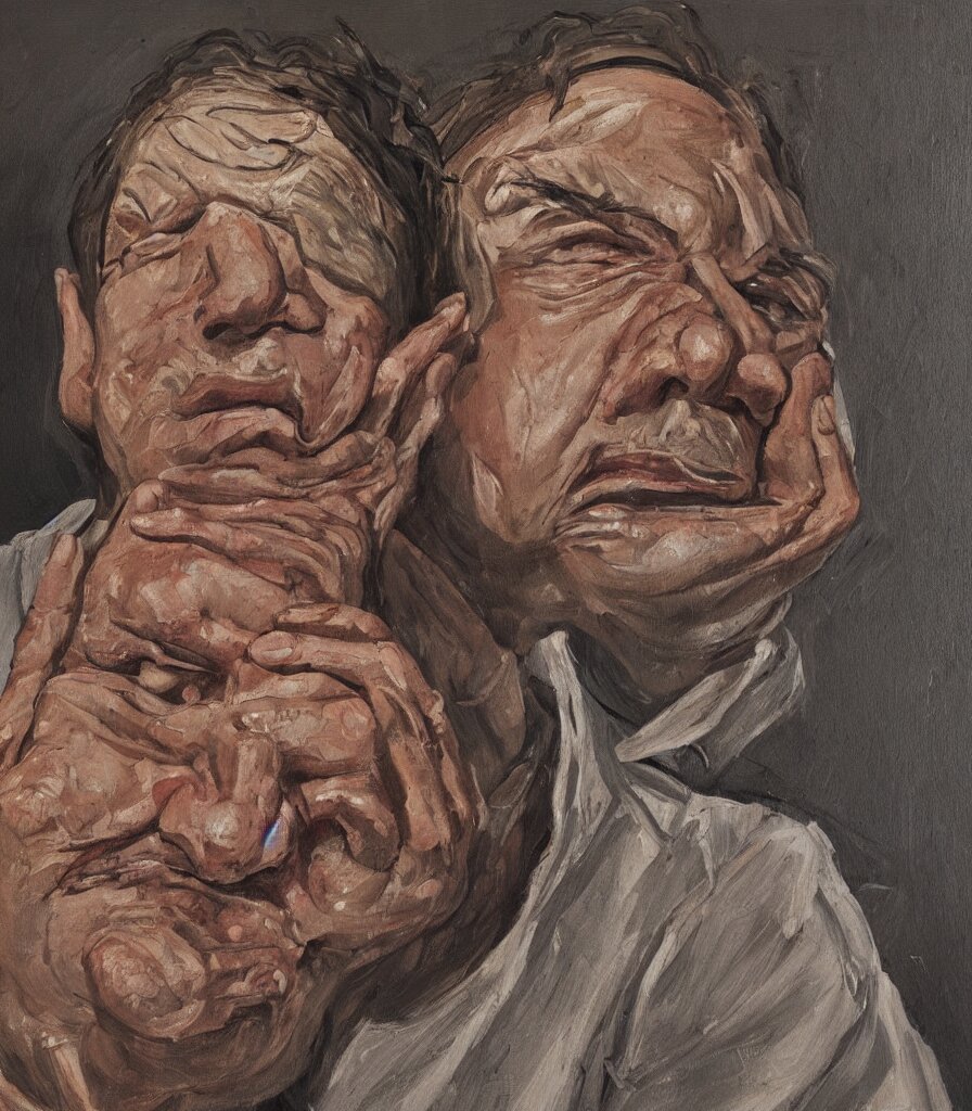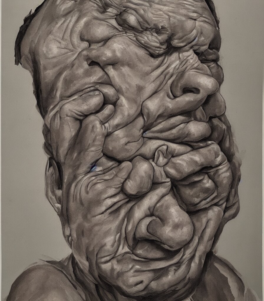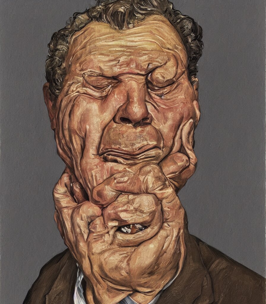 Portrait of a muculous man in the style of lucian freud. mouth slightly open. he has closed her eyes, leaping towards us. face has many wrinkles, cuts, tired. he is looking down on us. oil painting, thick brush strokes. hard, strong shadows under the head. high contrast. clean gray brown background. lit by a single hard light from above their heads. colorful face. perspective from below. hyperrealistic. discomfort