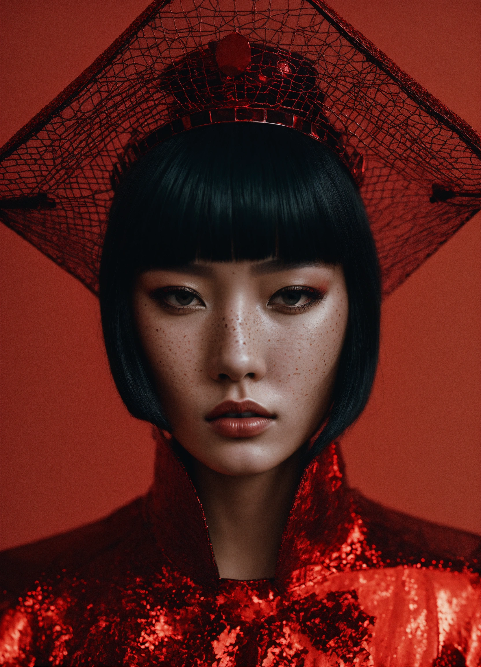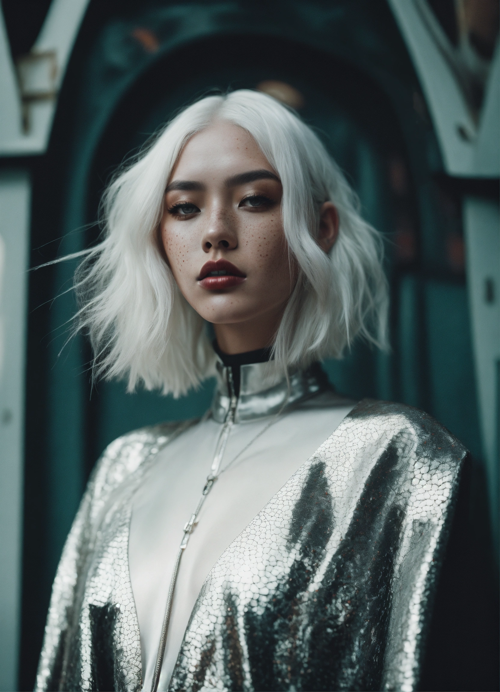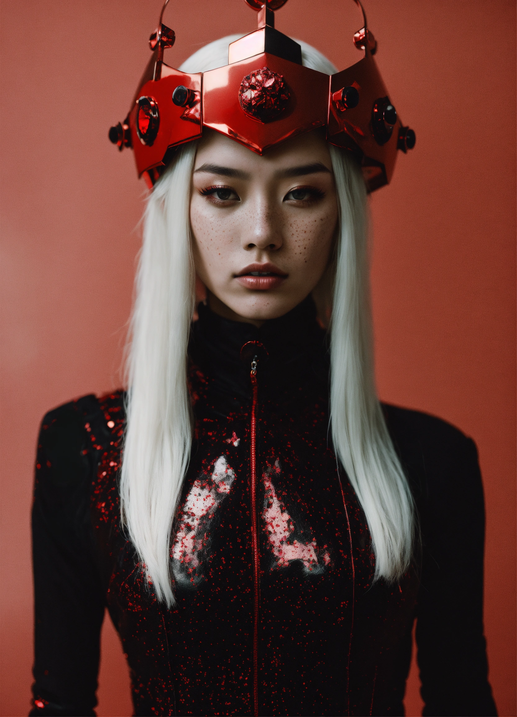 Beautiful model with attitude, asian exótico, white hair with red subtones, freckles, haris nukem, editorial magazine, full body, fashion photography, high future fashion, alessio albi photographer, halo, metal crown in head, black outfit