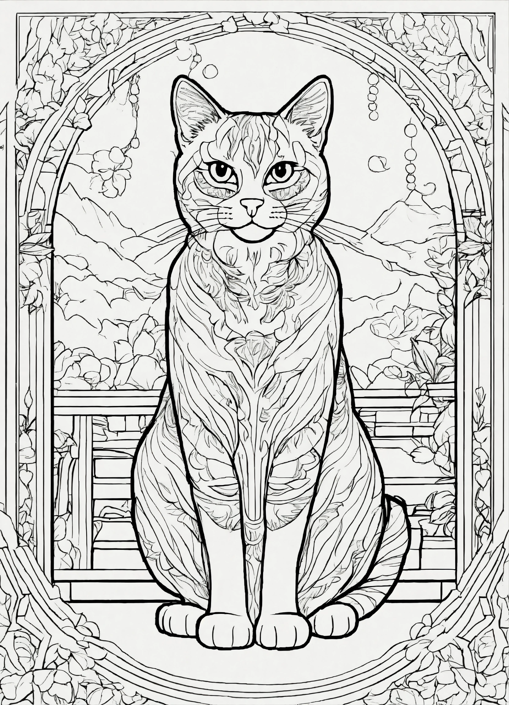 Cat style coloring book for kids, outline art, drawing, sketch, b&w, not overcrowded, not bold, symmetrical, white background