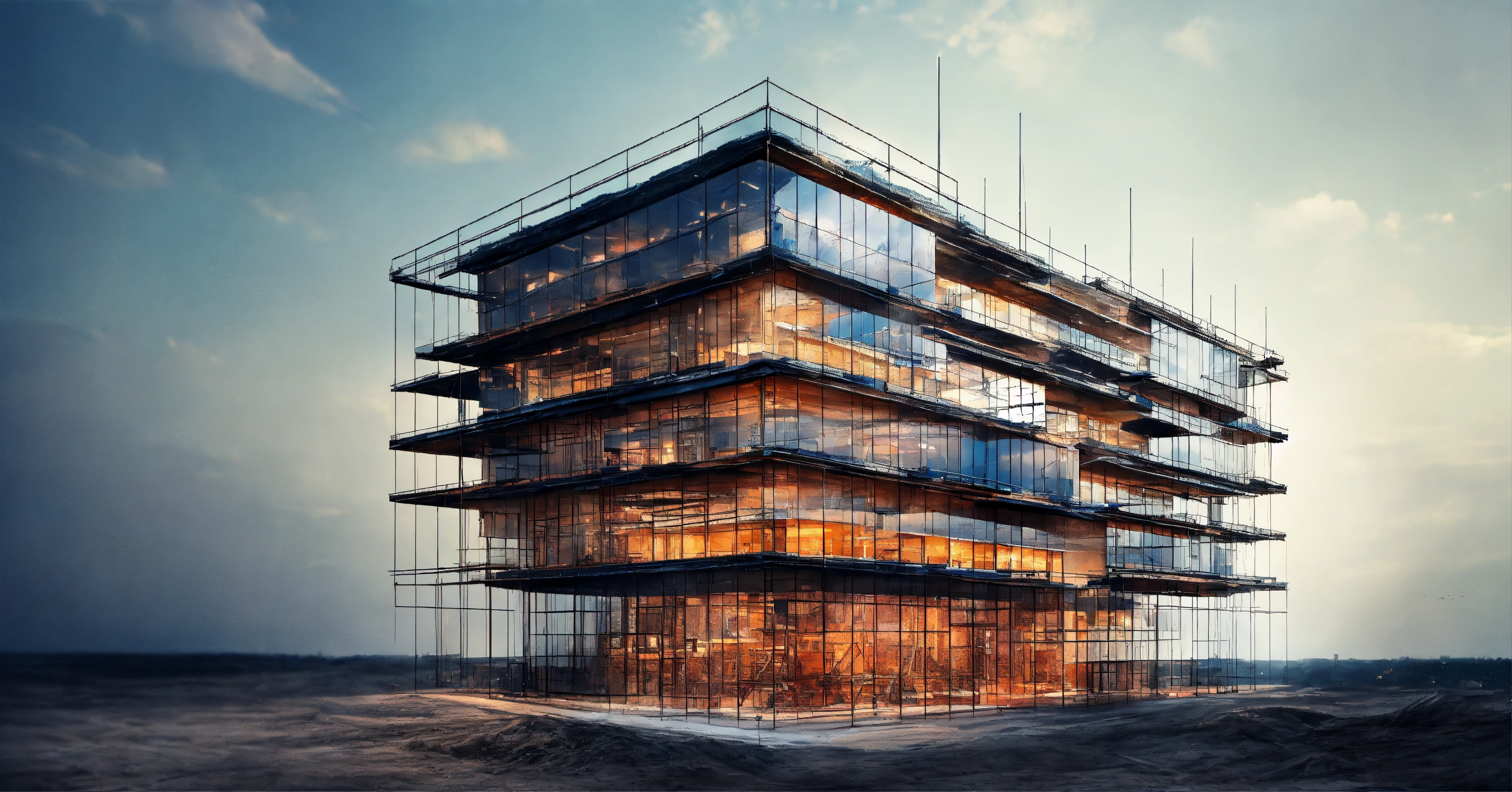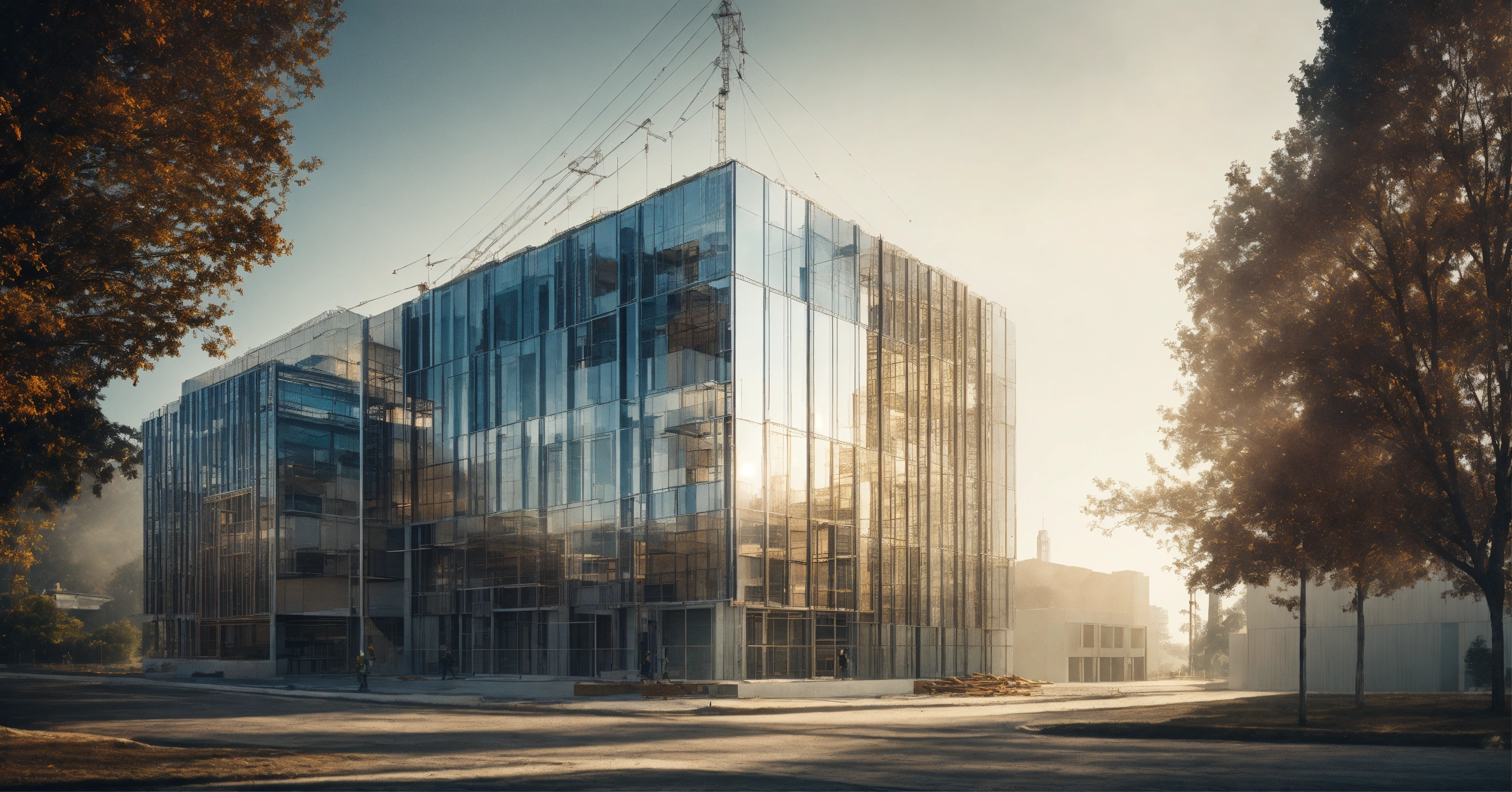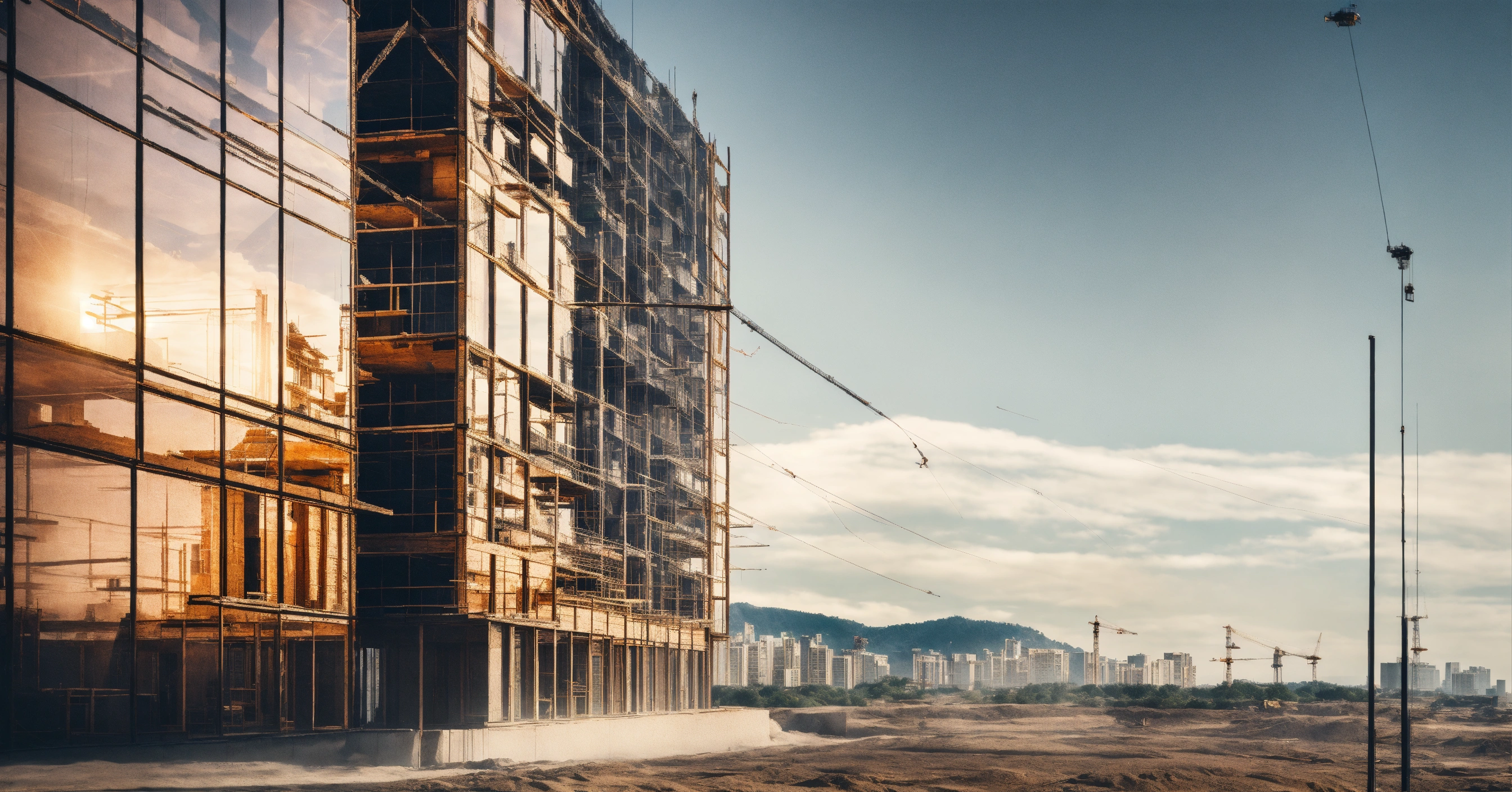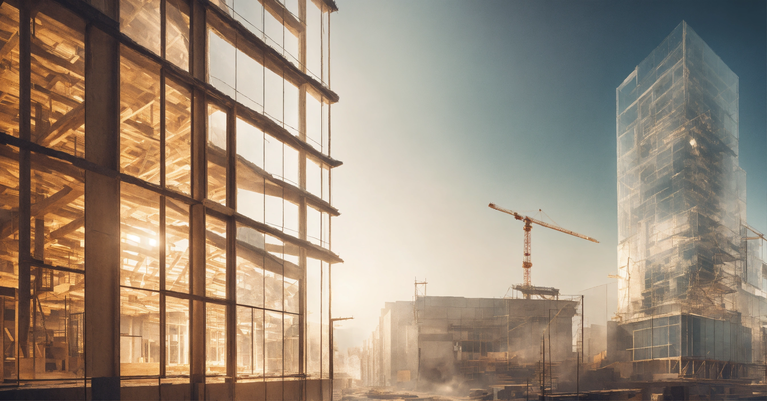 Future building construction engineering project devotion and side view of a bulding head in double exposure effect on white background, misterious, high quality photo, cinematic shot, cinematic, realistic, film grain, volumetric light, imax, photorealistic, hyperdetailed textures, sharp focus, studio photo, masterpiece, epic scene