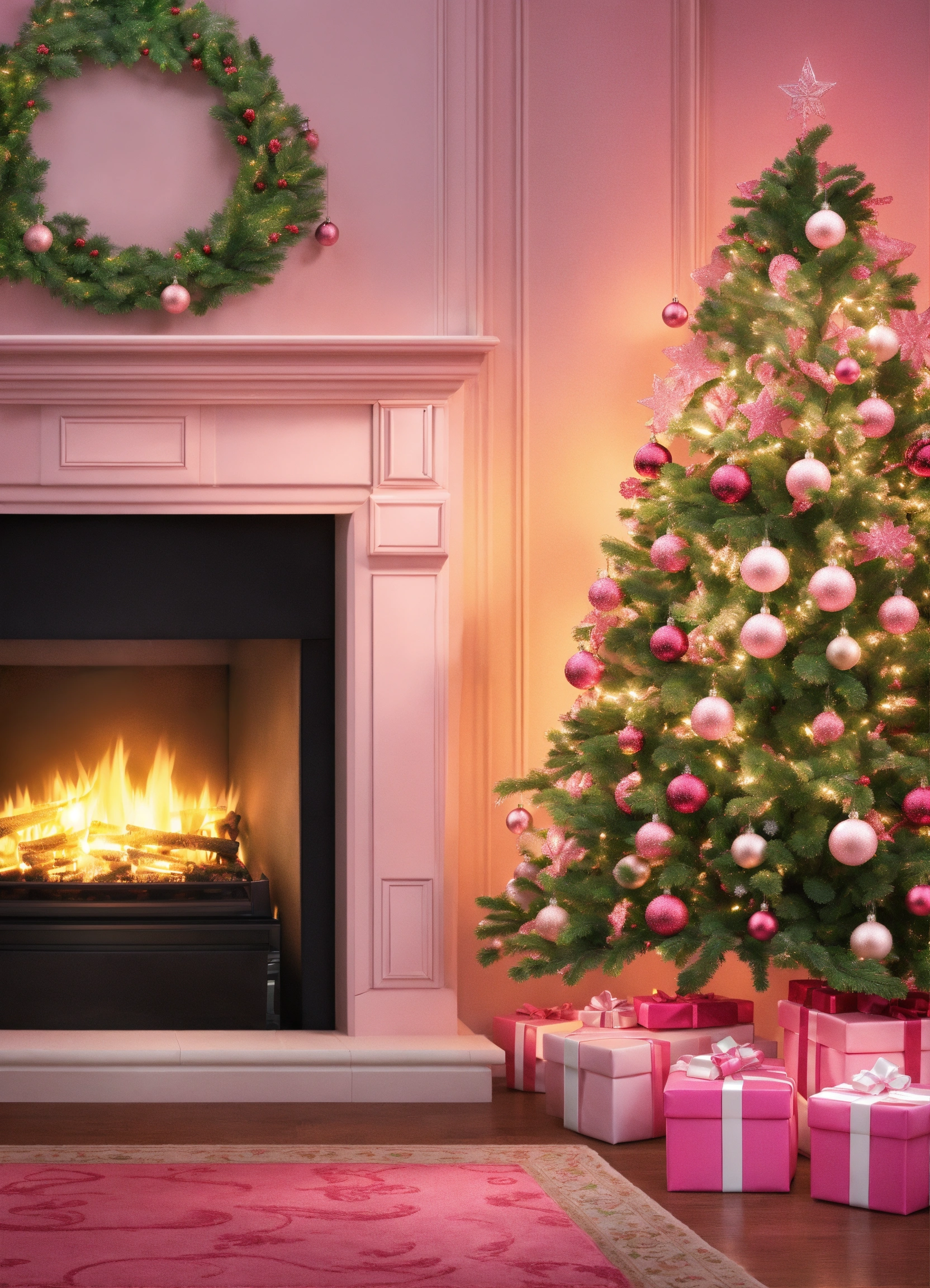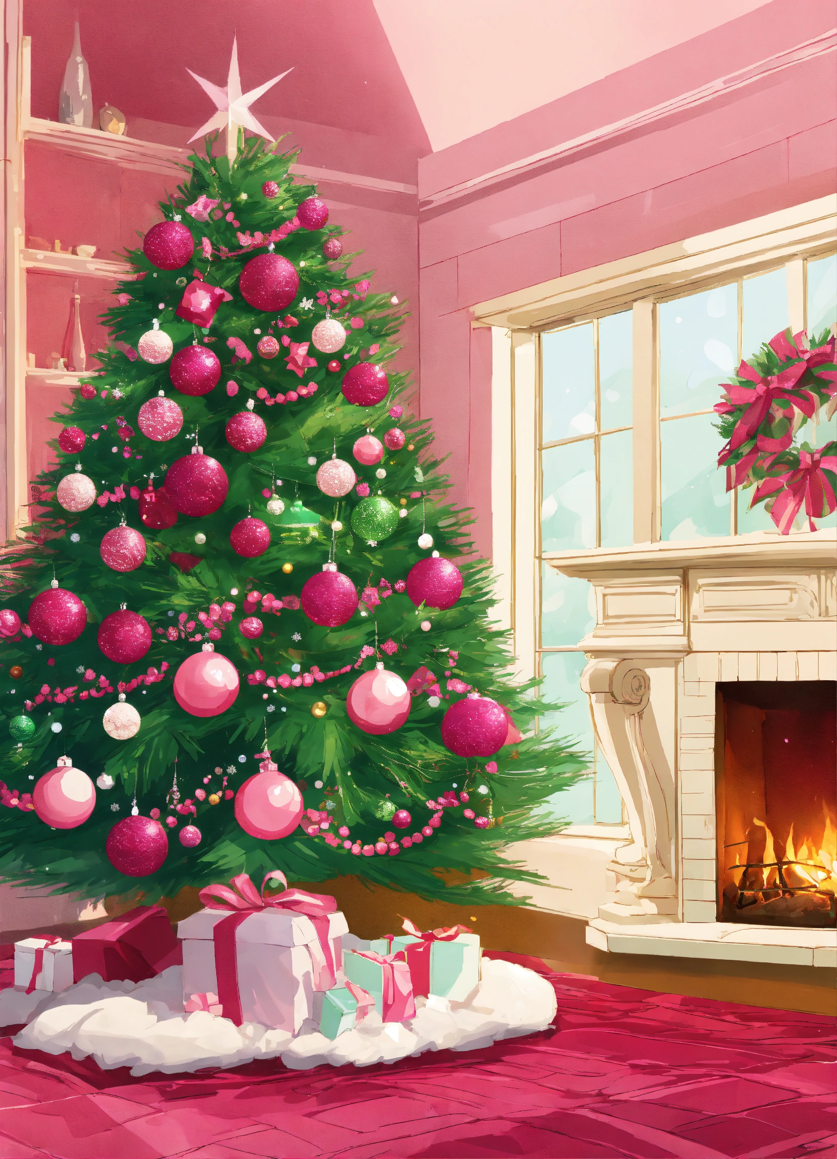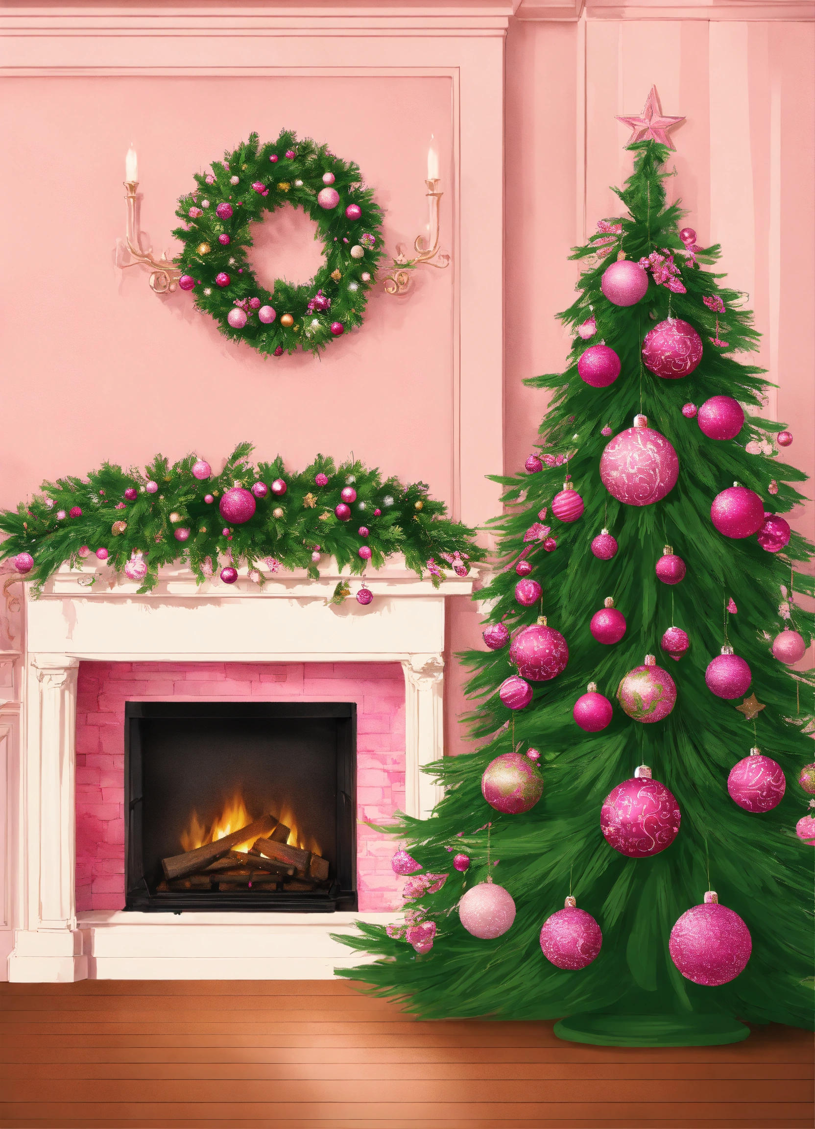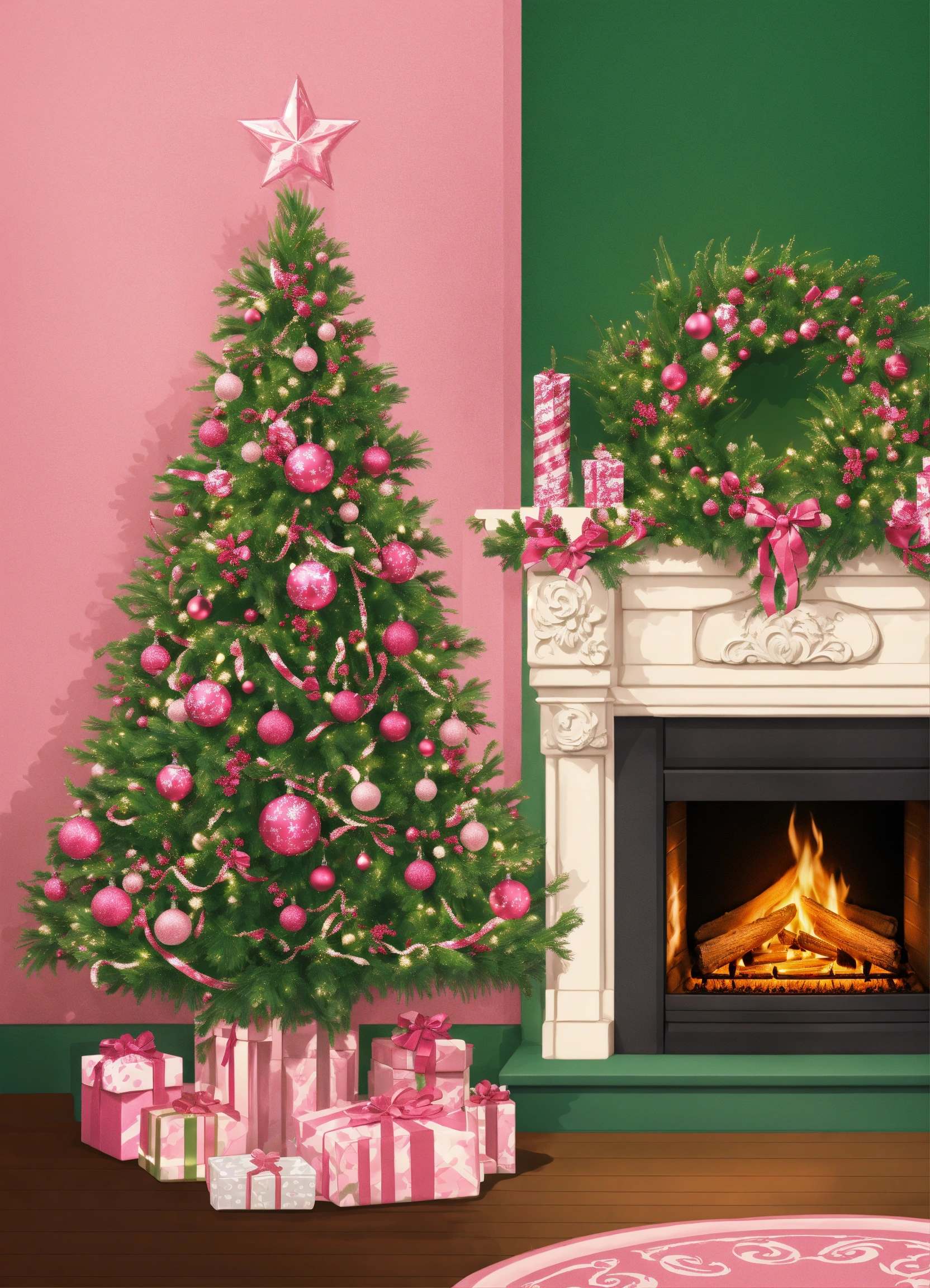 Clipart style, beautiful detailed pink and green christmas tree with white fireplace in the background