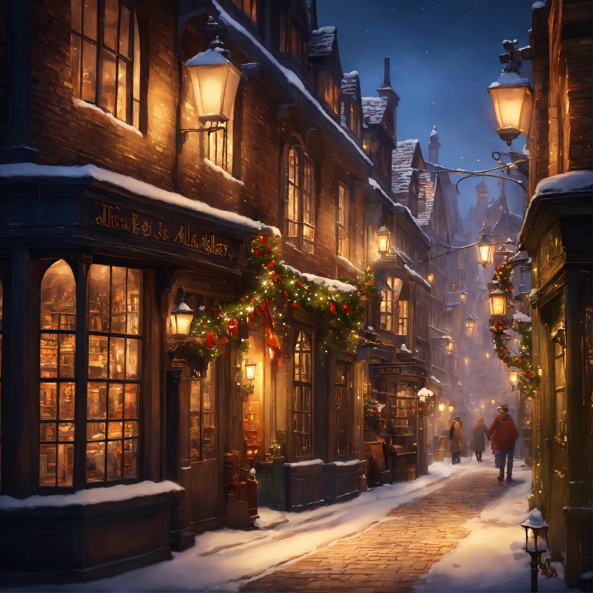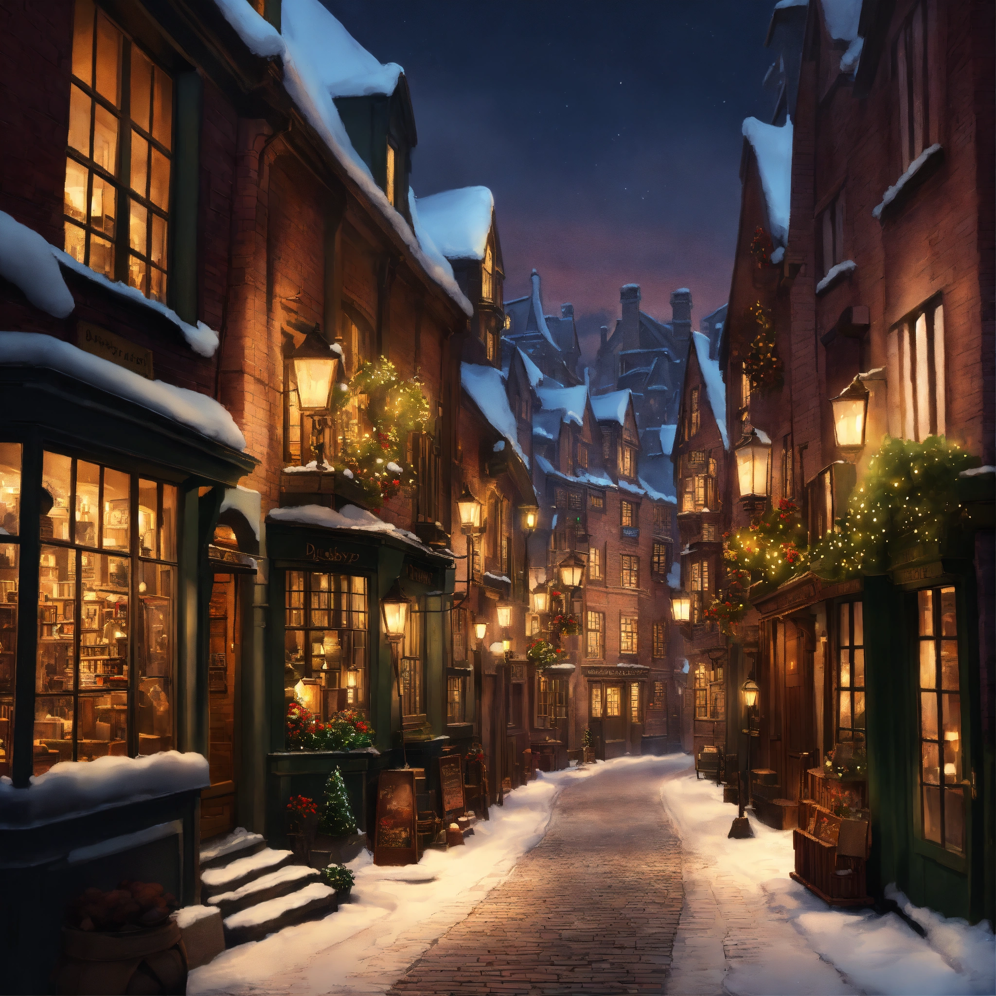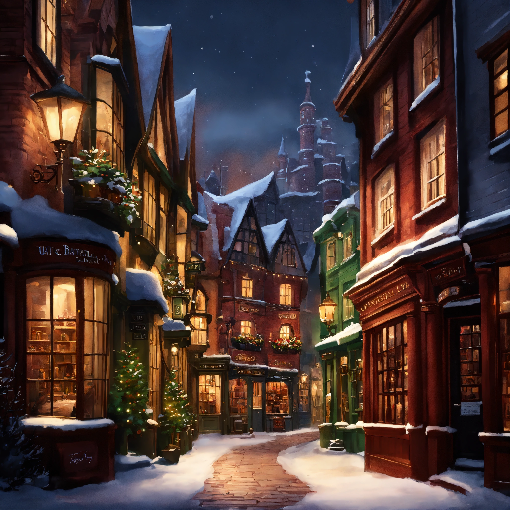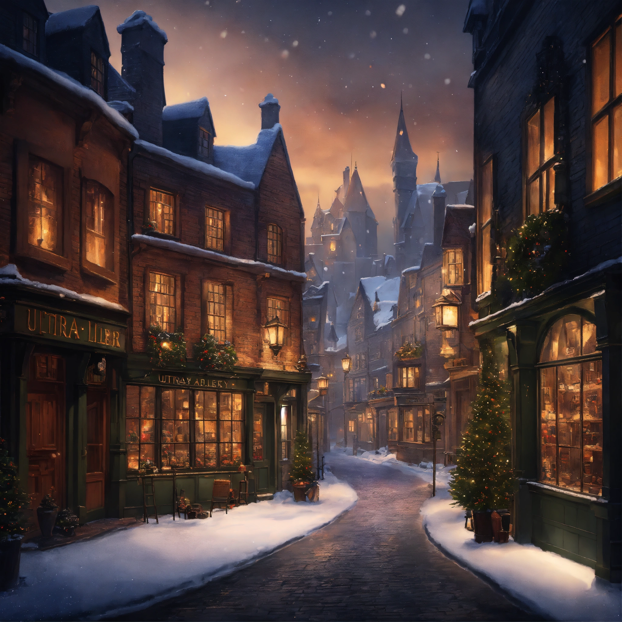 Epic beautiful shot of a ultra detailed and ultra cozy diagon alley in winter, evening atmosphere, ultra cozy, luminous, digital painting, little photorealistic, sharp focus, ultra cozy and inviting, wish to be there. very detailed, arty, should rank high on youtube for a dream trip.