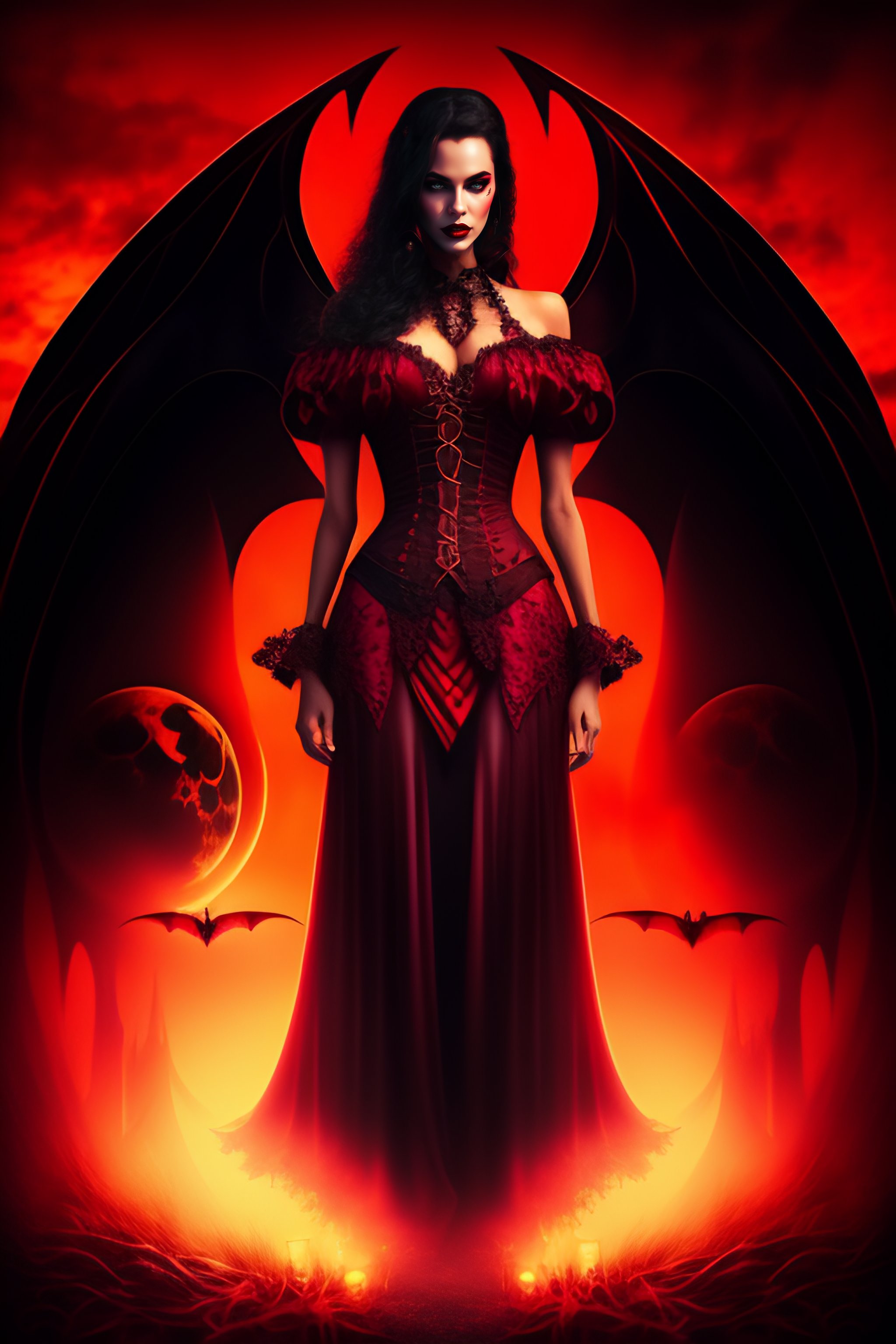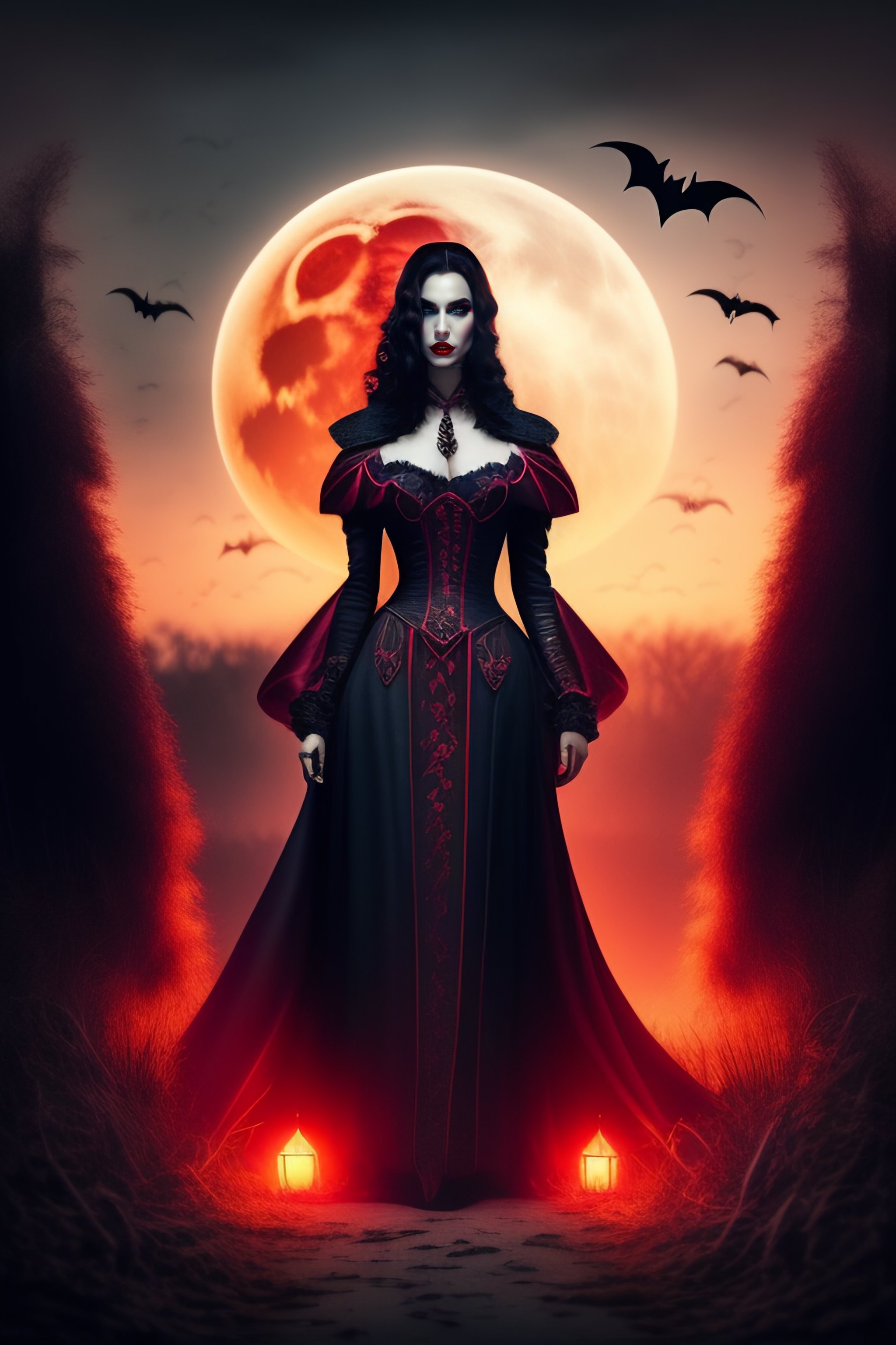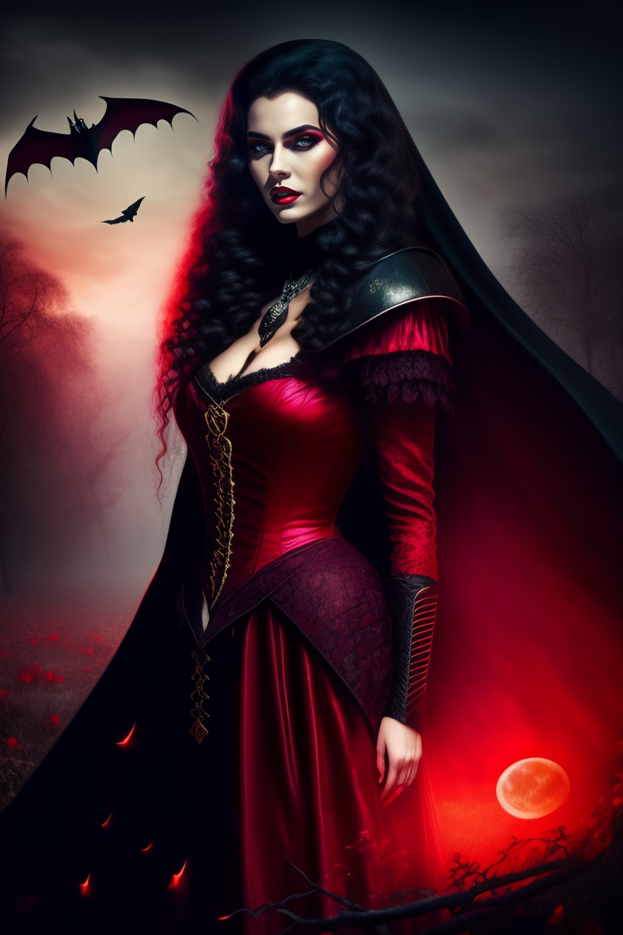 Dracula's lover, vampire woman, blood moon background, graveyard, transylvania, romanian, bat-like features, tattered dress, dark nighttime background, dead trees, vampire queen, selena underworld style
