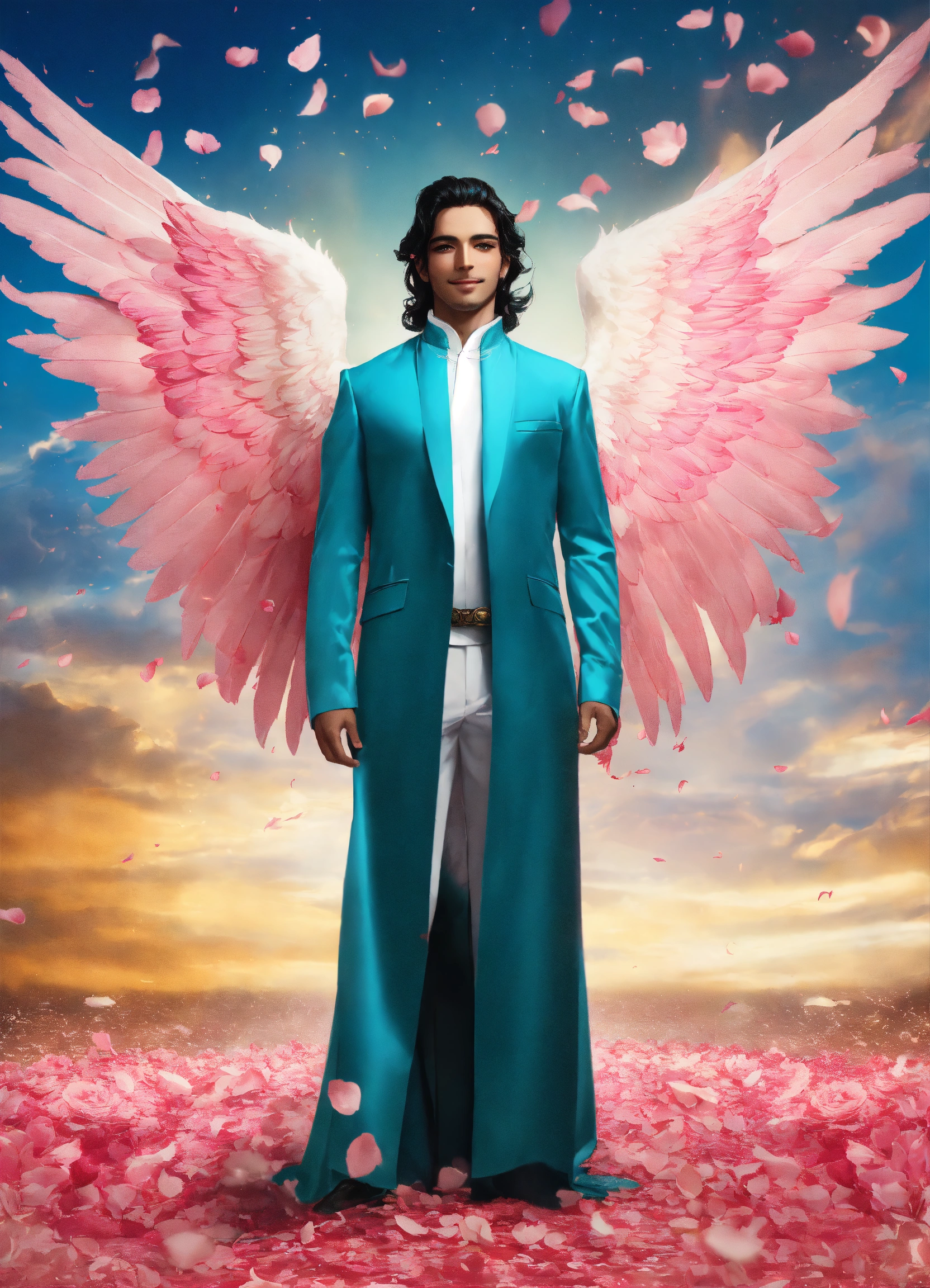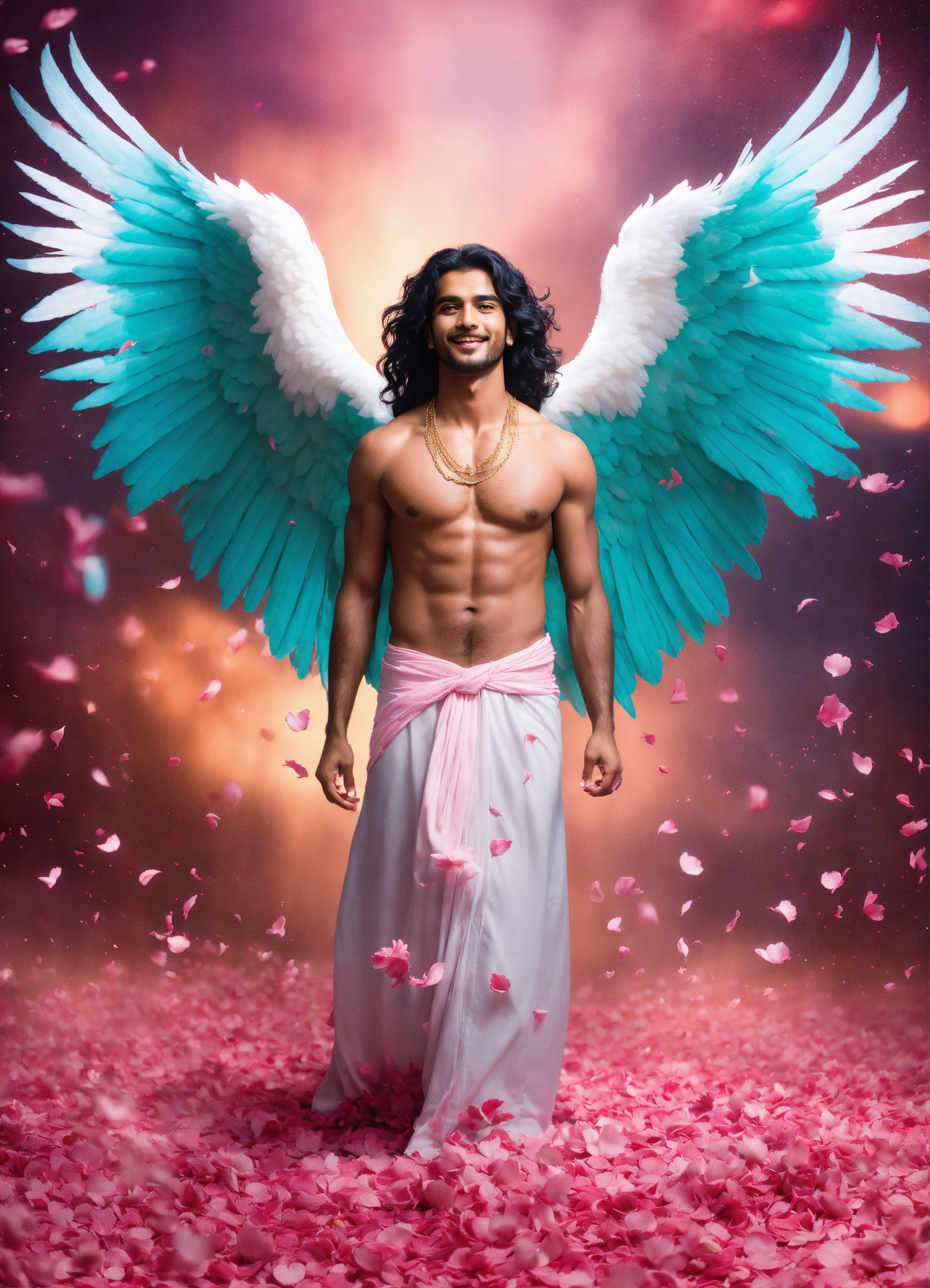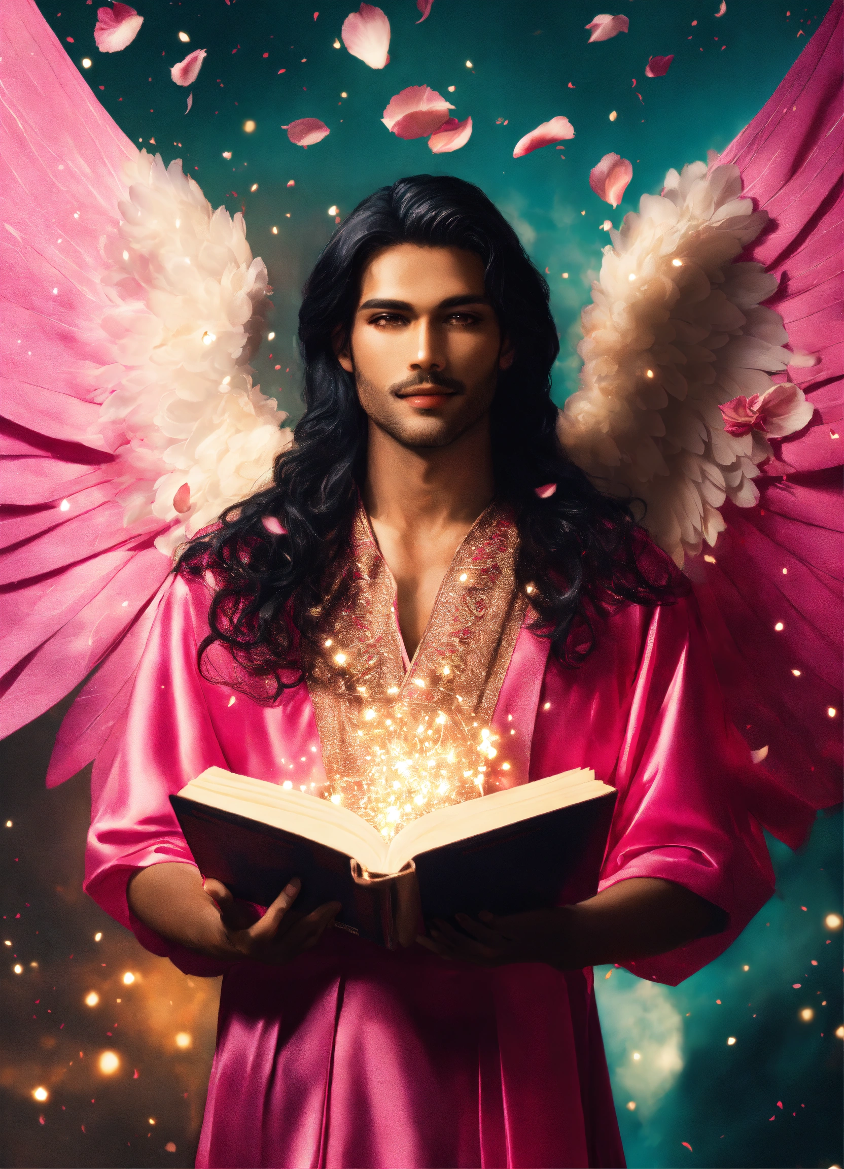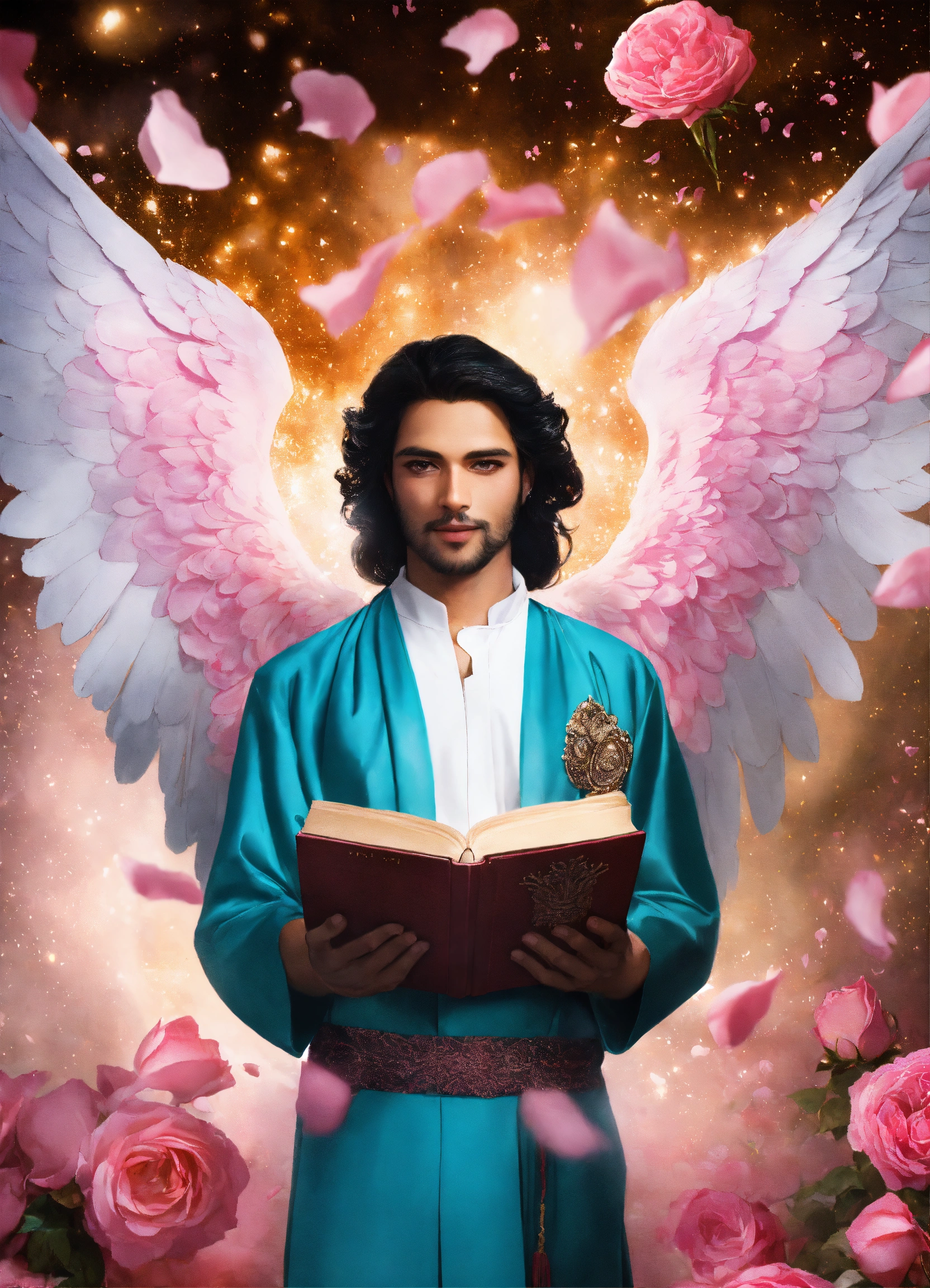 Surrealistic photographic full body portrait of masculine robust archangel with massive gigantic white wings spreading out from his back, young indian supermodel male, background is explosion of rose petals and sparkles, knowledge, wisdom, learning, eternal connection to the creator, teacher, guide, spiritual leader, holy spirit glow, smiling and holding open a large book, staring intensely straight ahead directly into camera as if listening to me, long black hair, loving dark eyes centred towards me, wearing teal and pink raja robes with high neckline, magazine photoshoot, film grain.