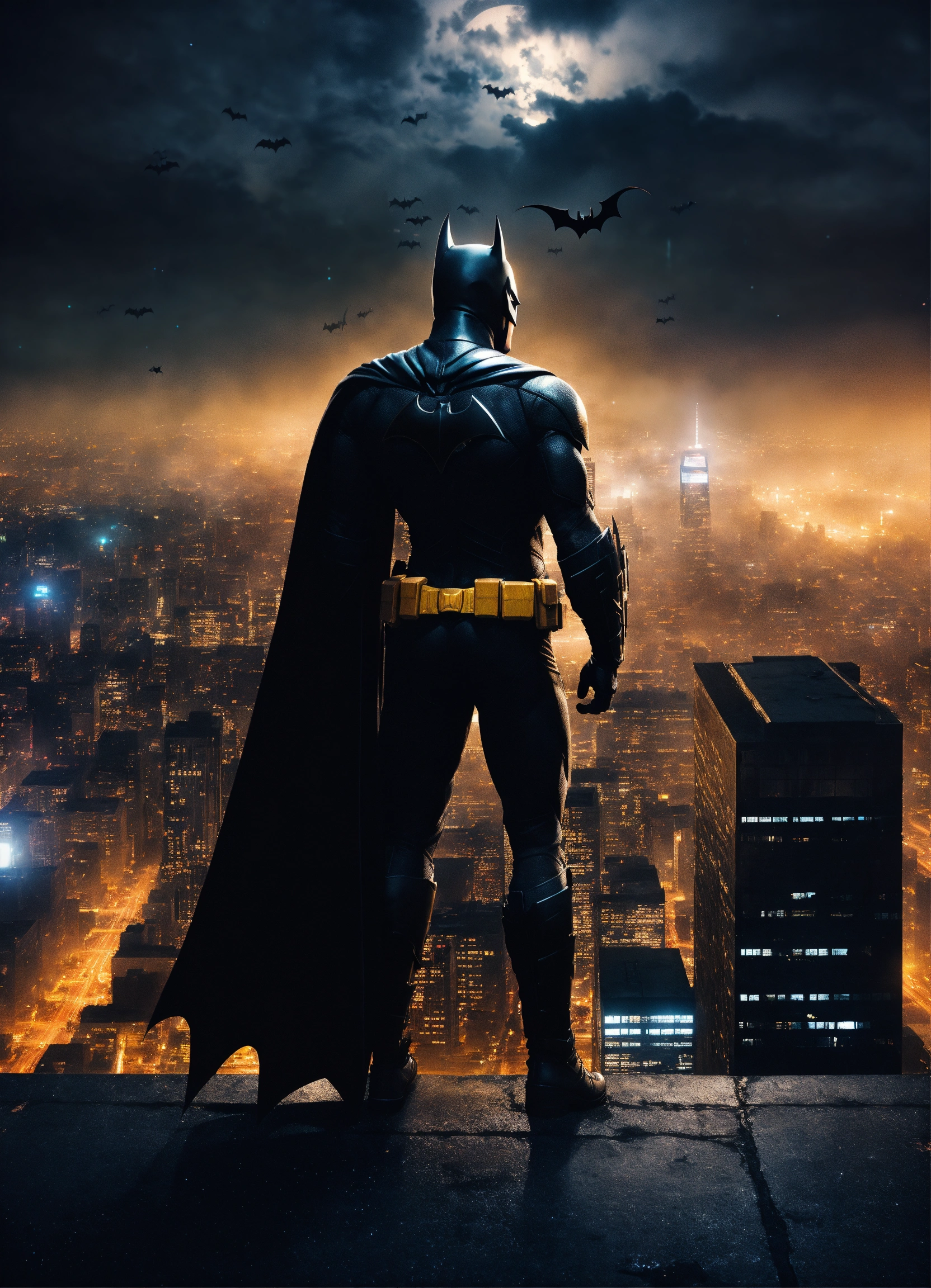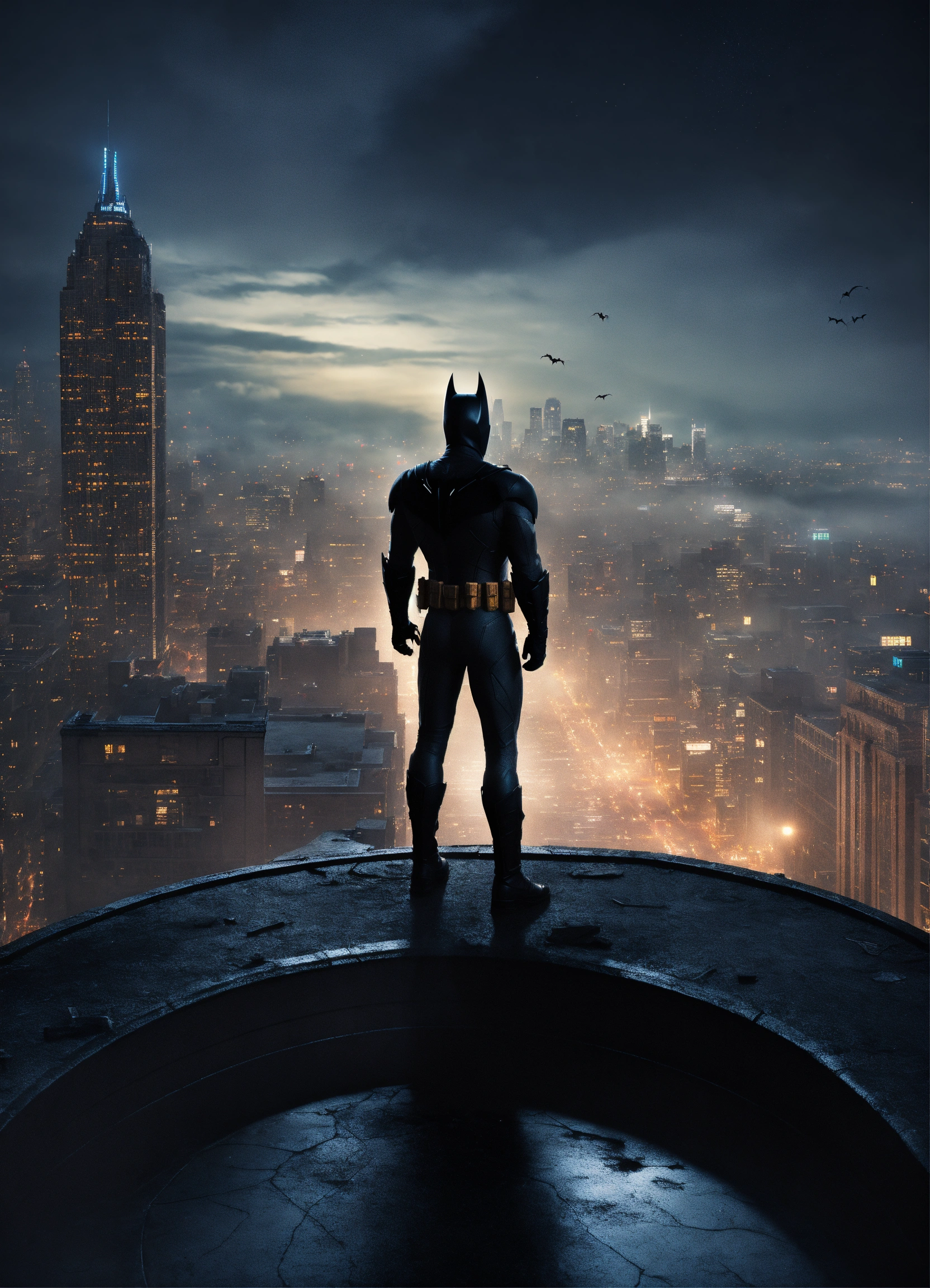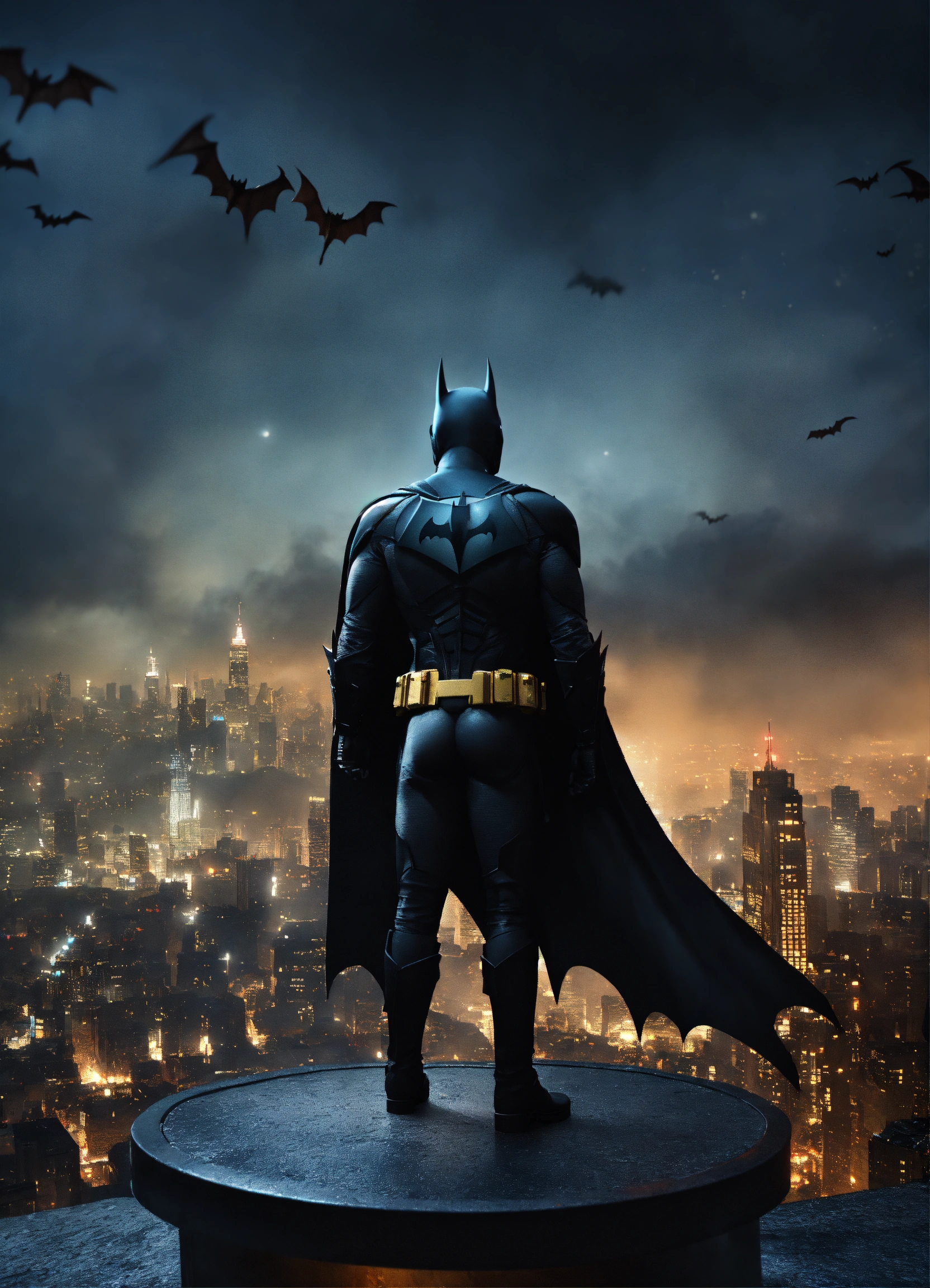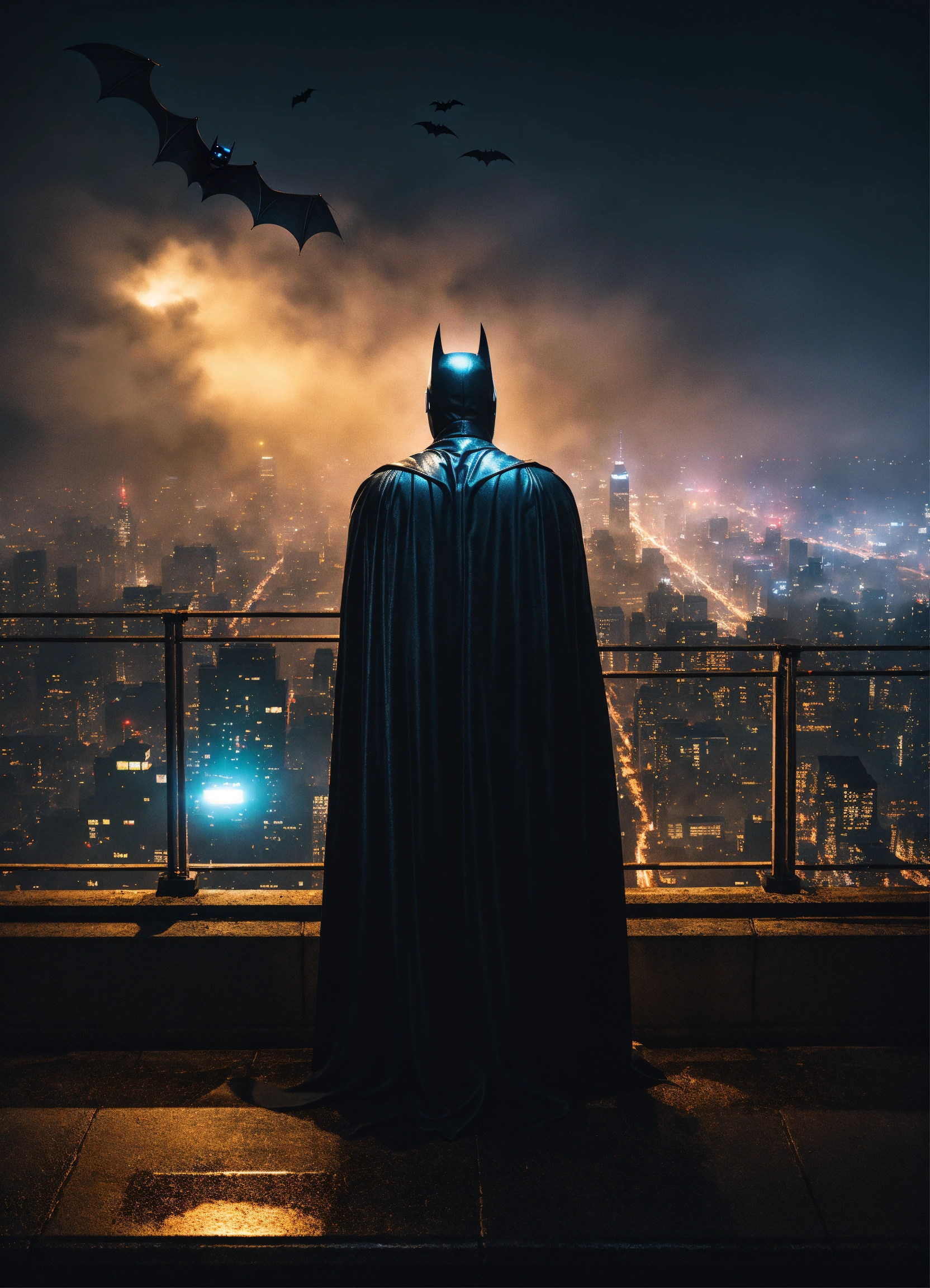 5 [foreground batman standing on ledge of building overlooking gotham city; texture fog; insanely detailed, photorealistic, shot on a sony a7riii] + [background gotham city at night with spotlight shining a bat signal to the sky, vanishing point, tiny bats flying in distance ; dynamic light, 3d render] [ambient bokeh lights, sparkles], photo, cinematic, 3d render