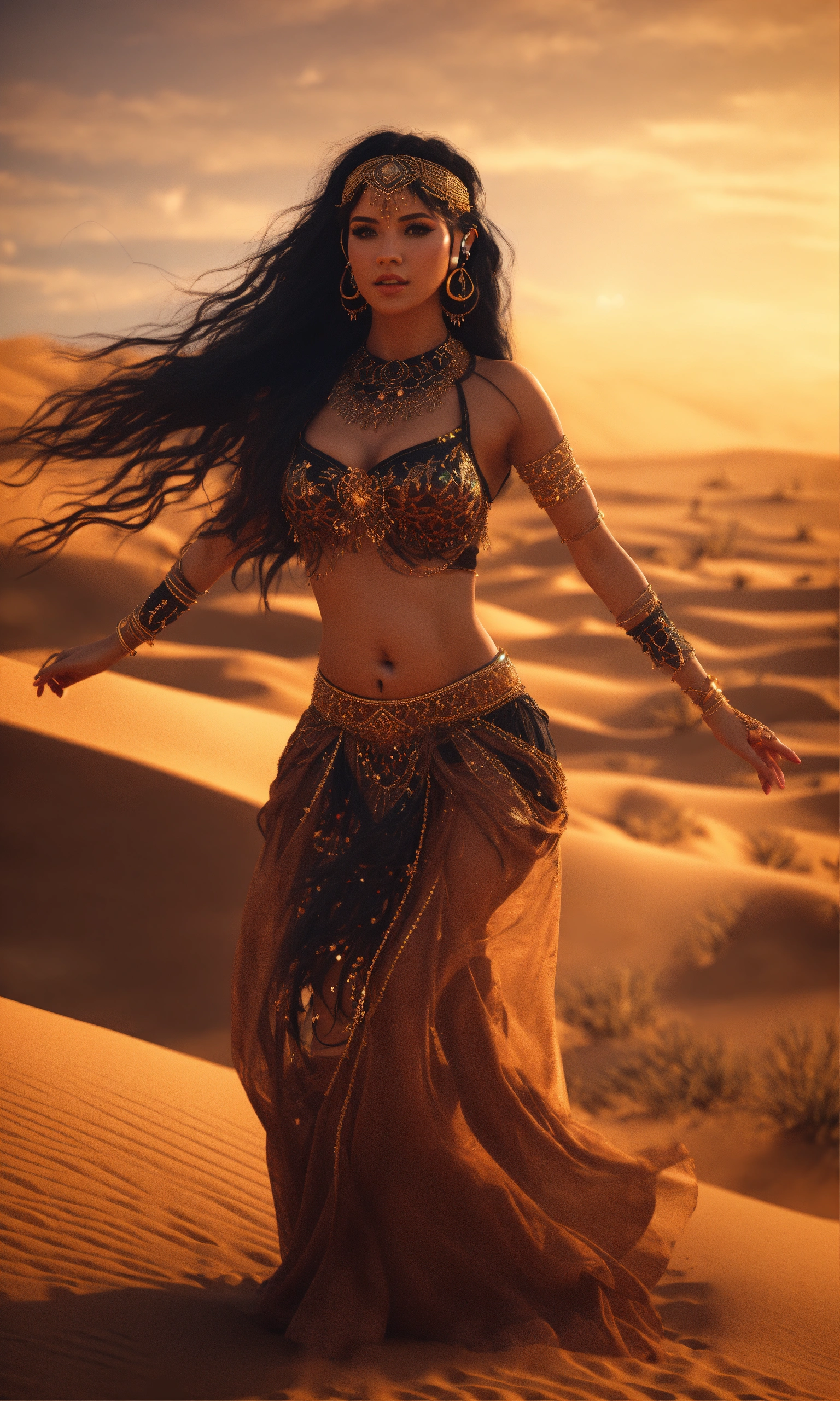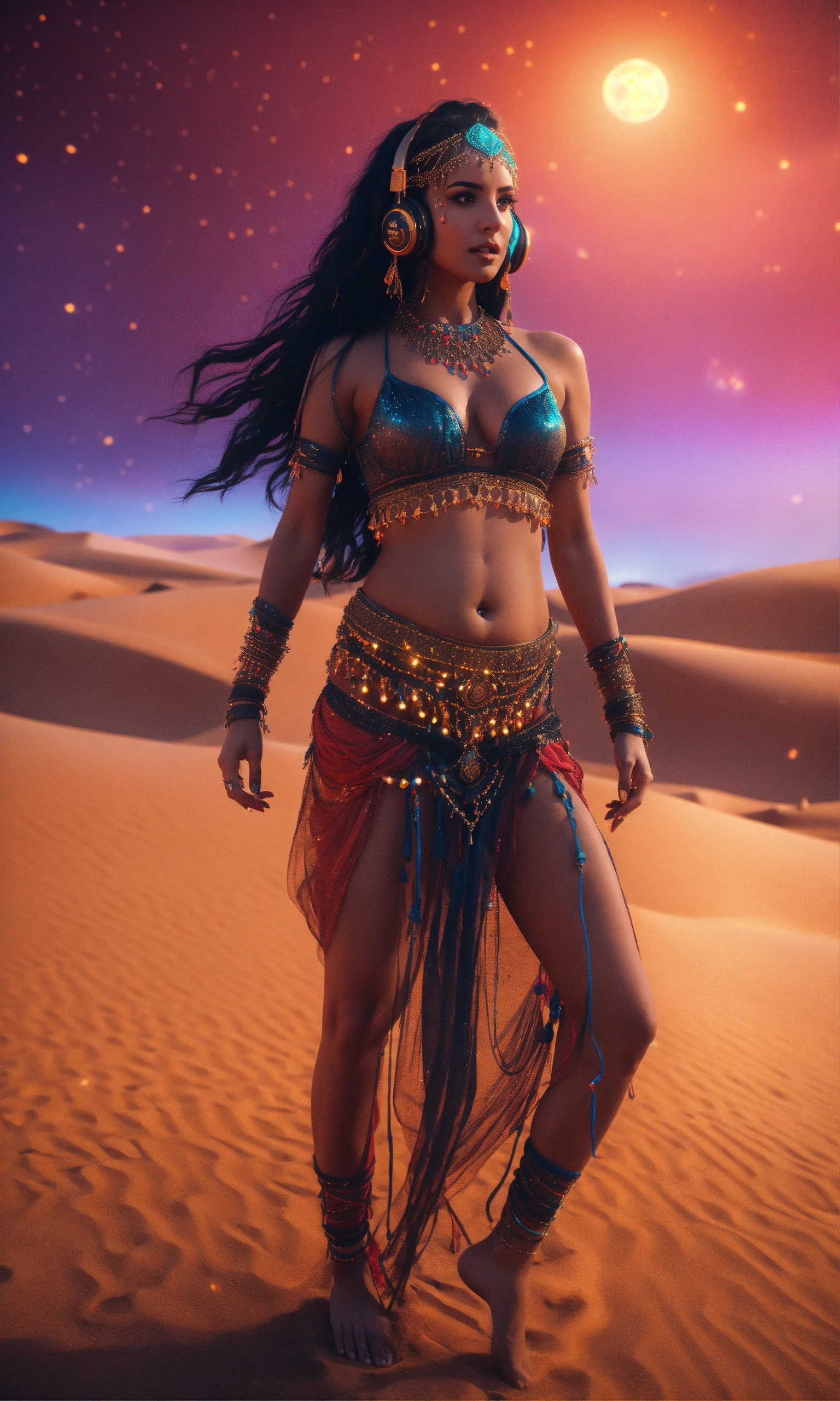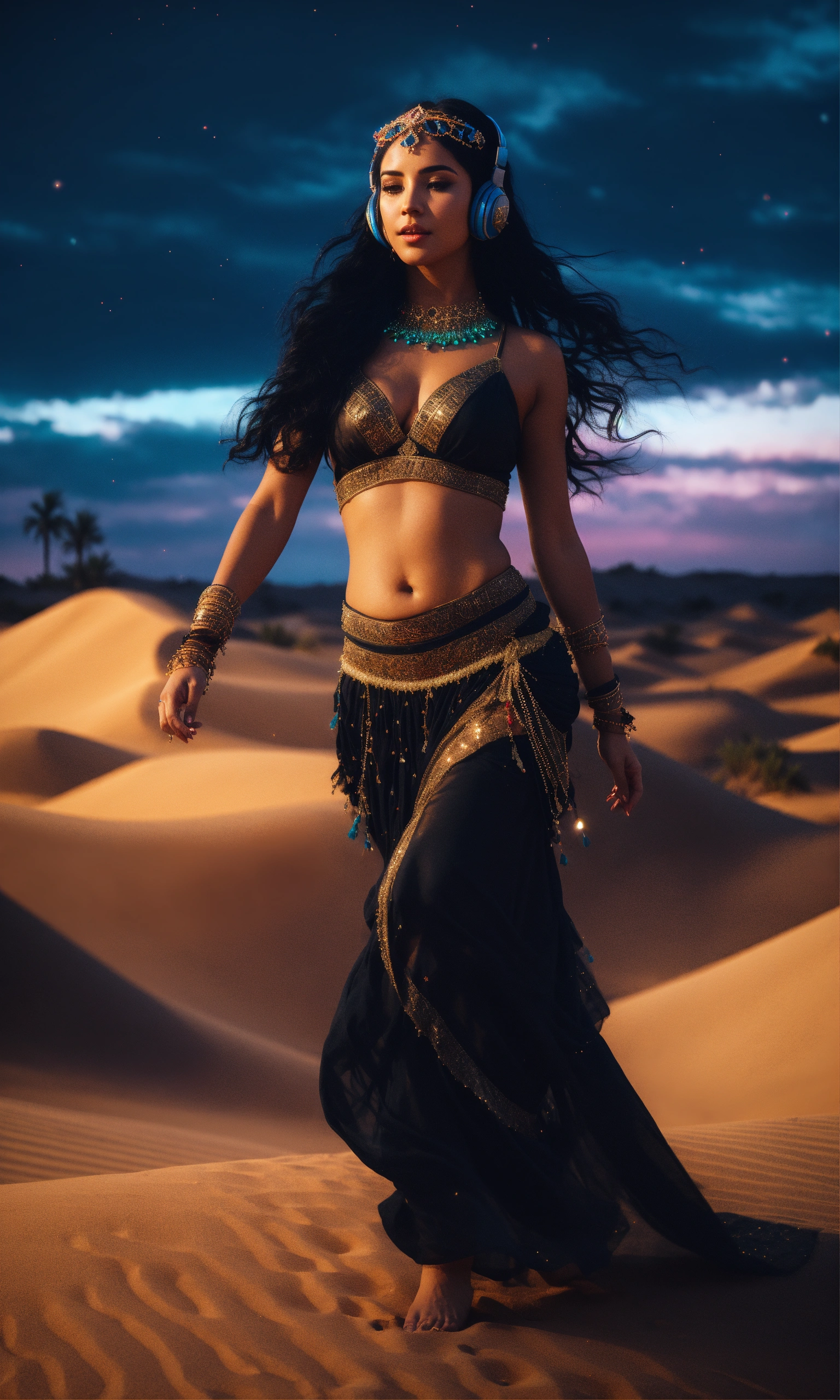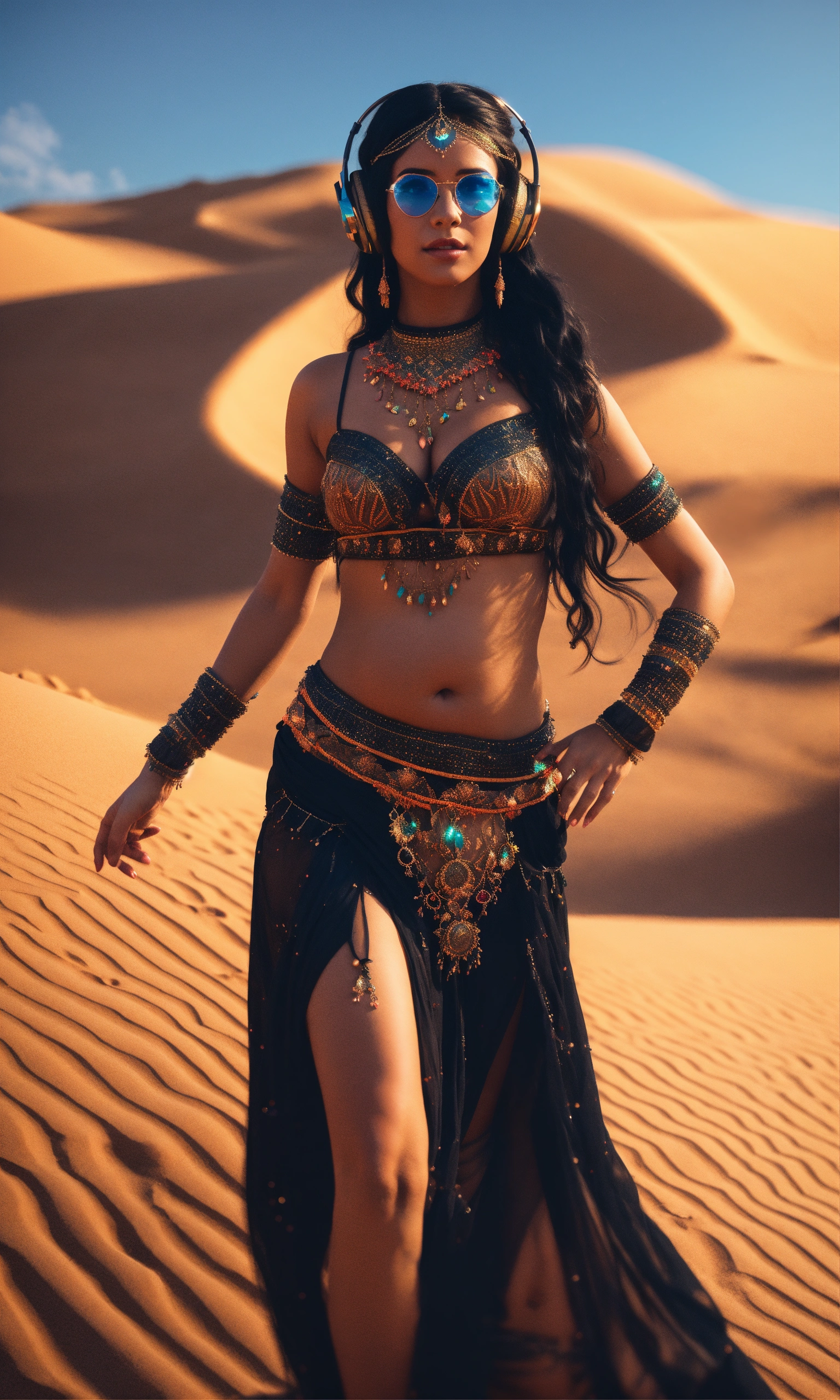 A girl with long black hair in glasses and headphones in a black belly dance fusion costume, stands in the middle of the dunes and dances a belly dance fusion, with a camel, futurism neon, 8k, unreal engine render
