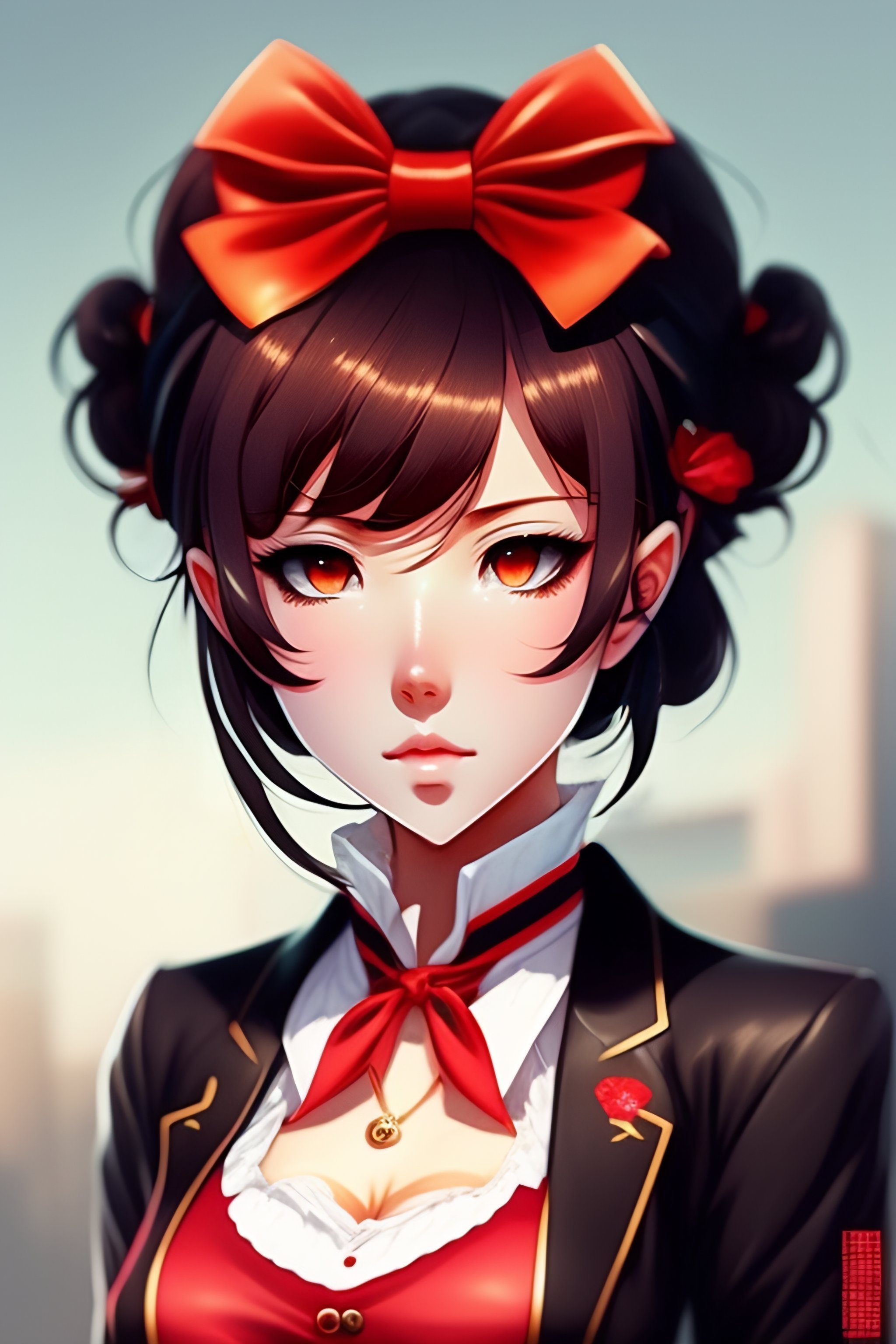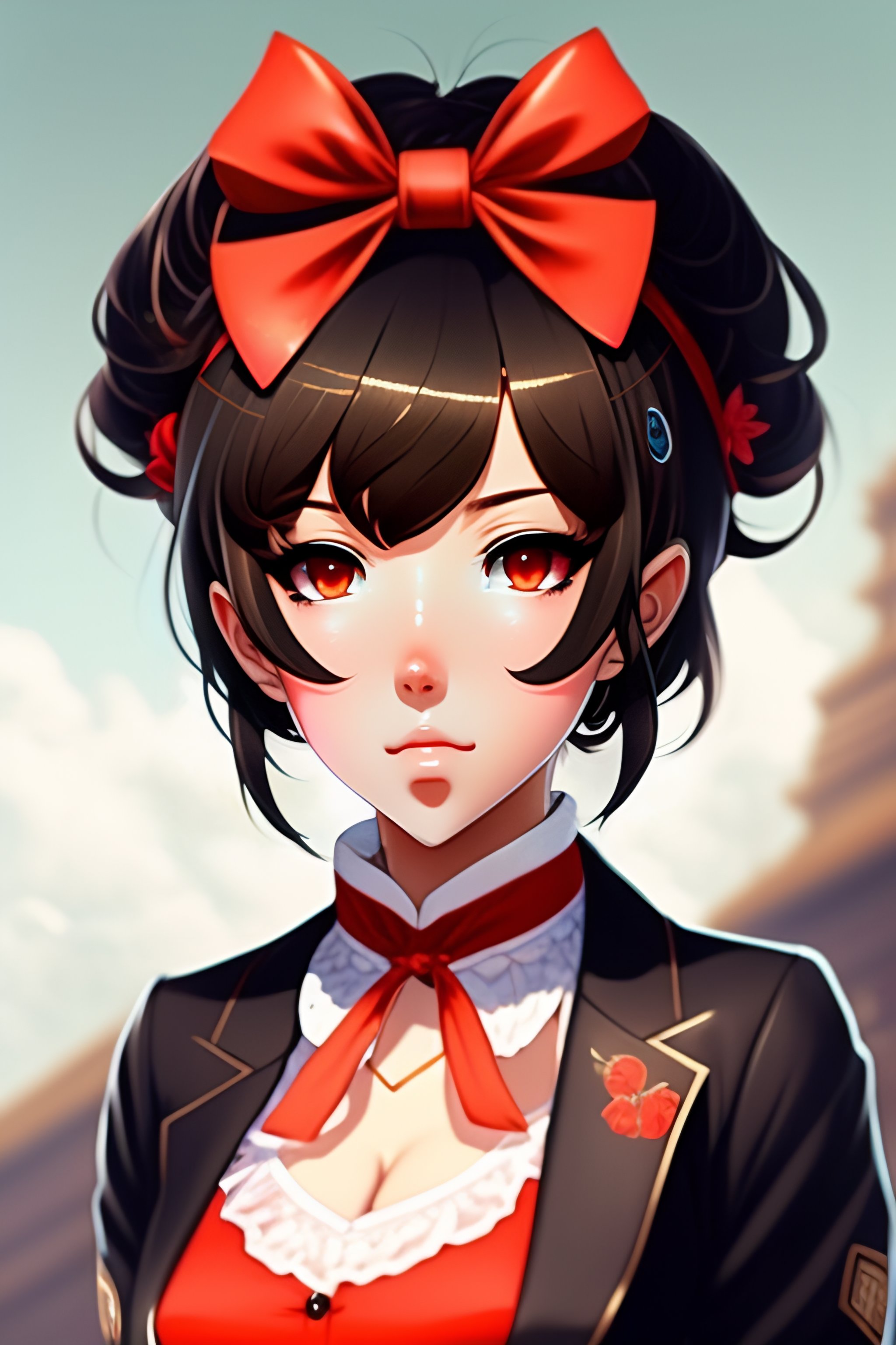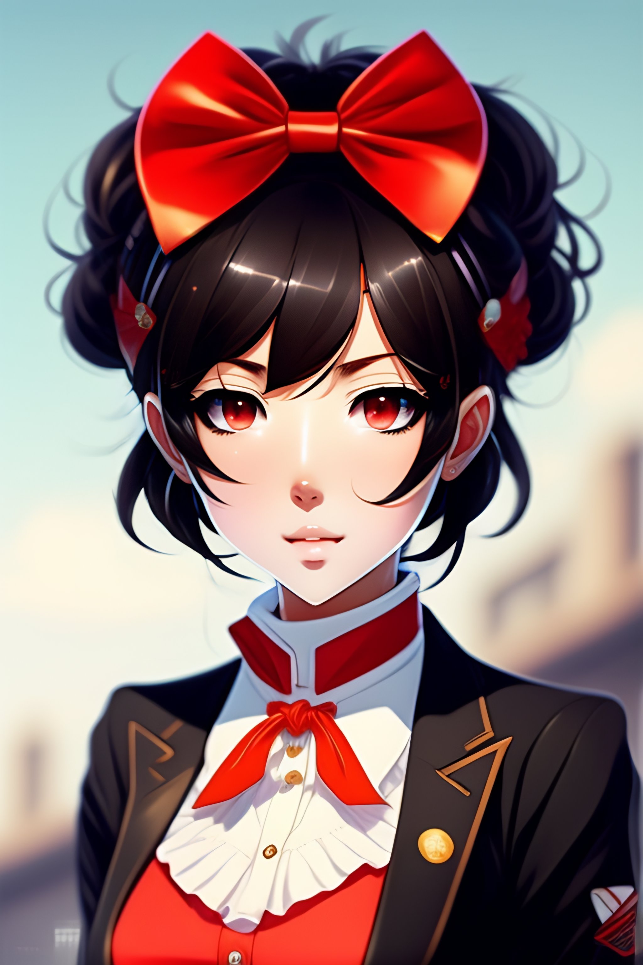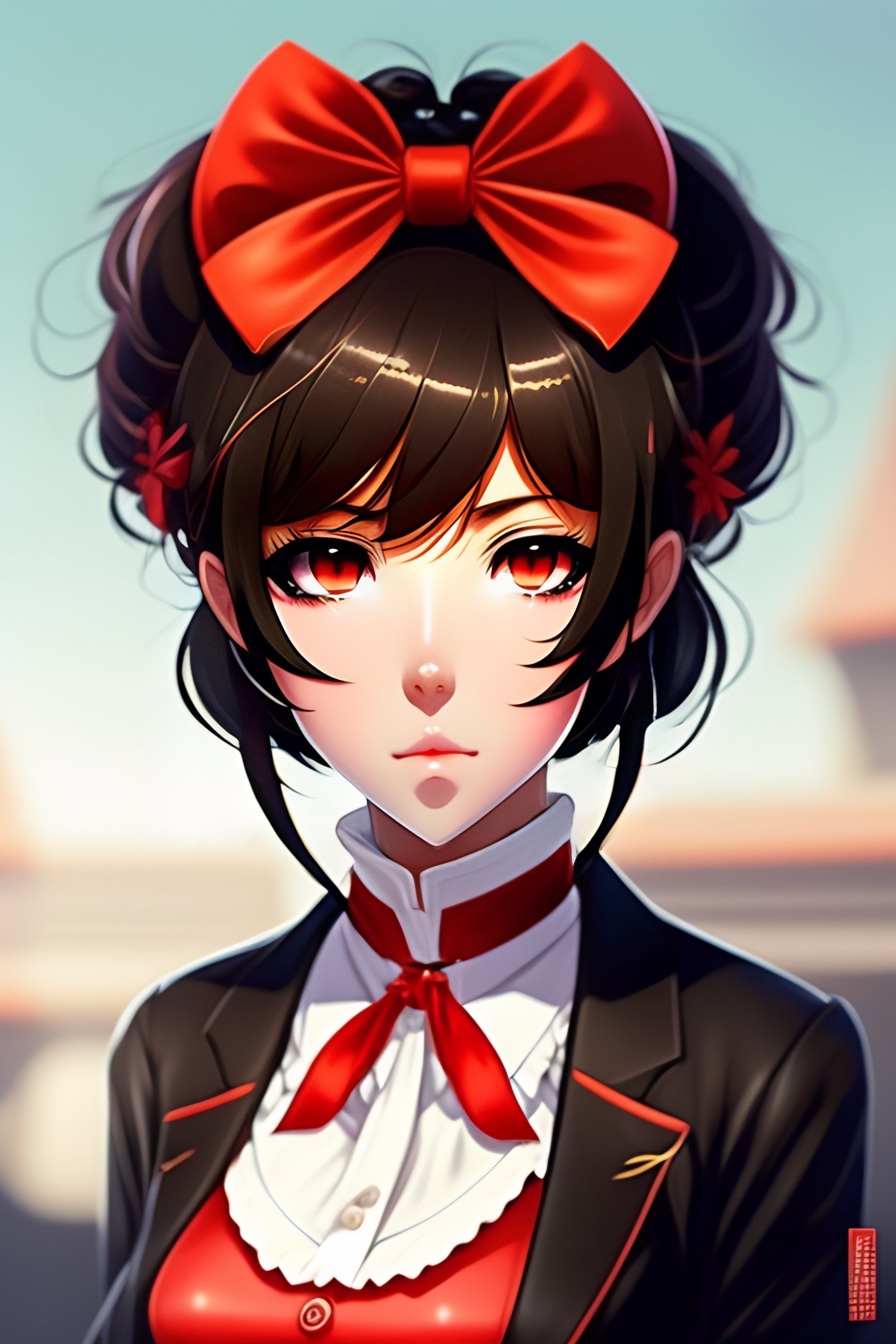Anime girl, elegant black jacket, hairband with bow, loose white shirt with red accents, (short red pants), short brown hair, brown eyes