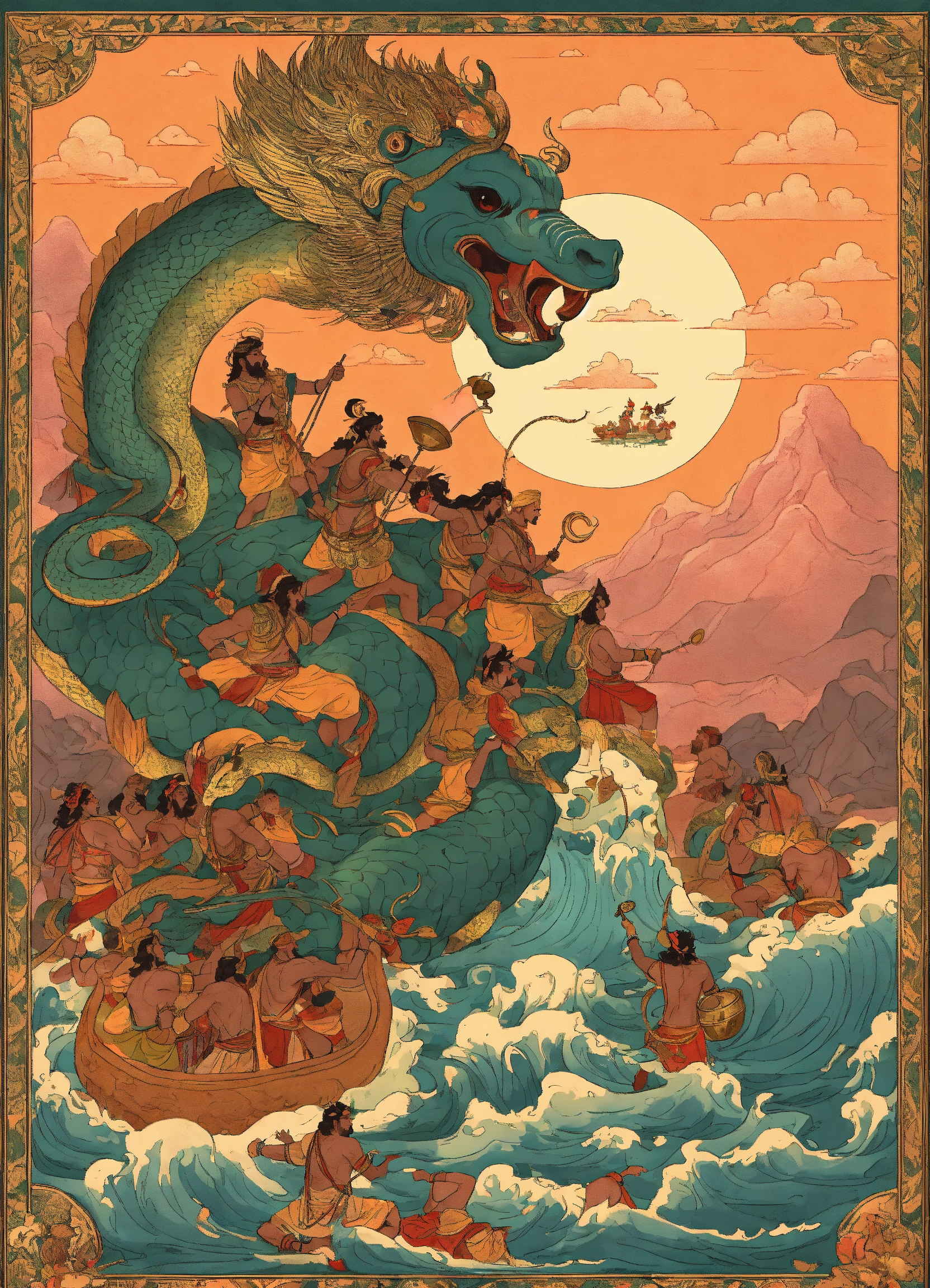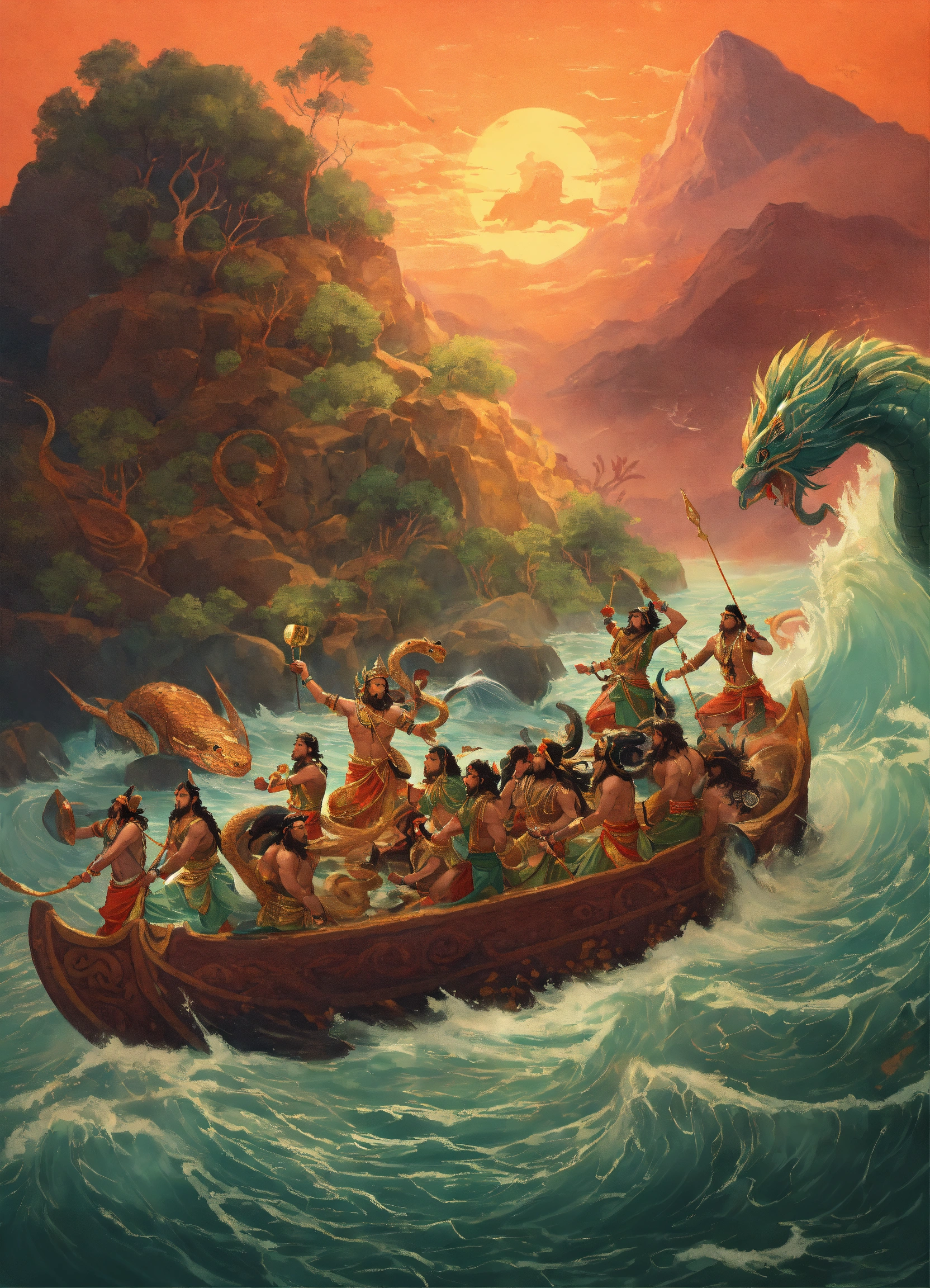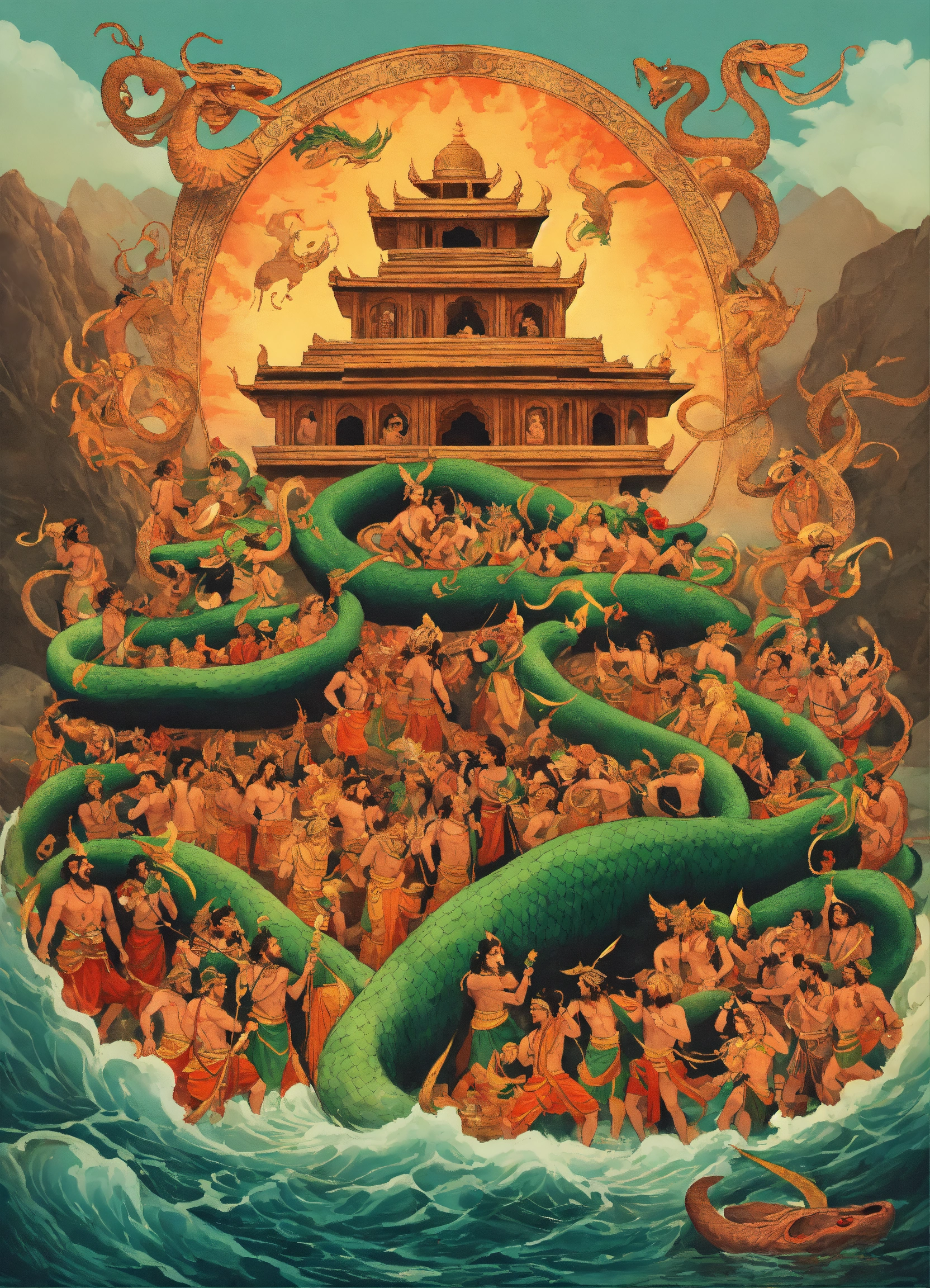 Create an illustration of a mesmerizing indian mythological scene with gods and demons gathered around the ocean, ready to fight each other for the elixir of life, in the samudra manthan scene where a large snake is tied around a huge mountain to churn the milk sea