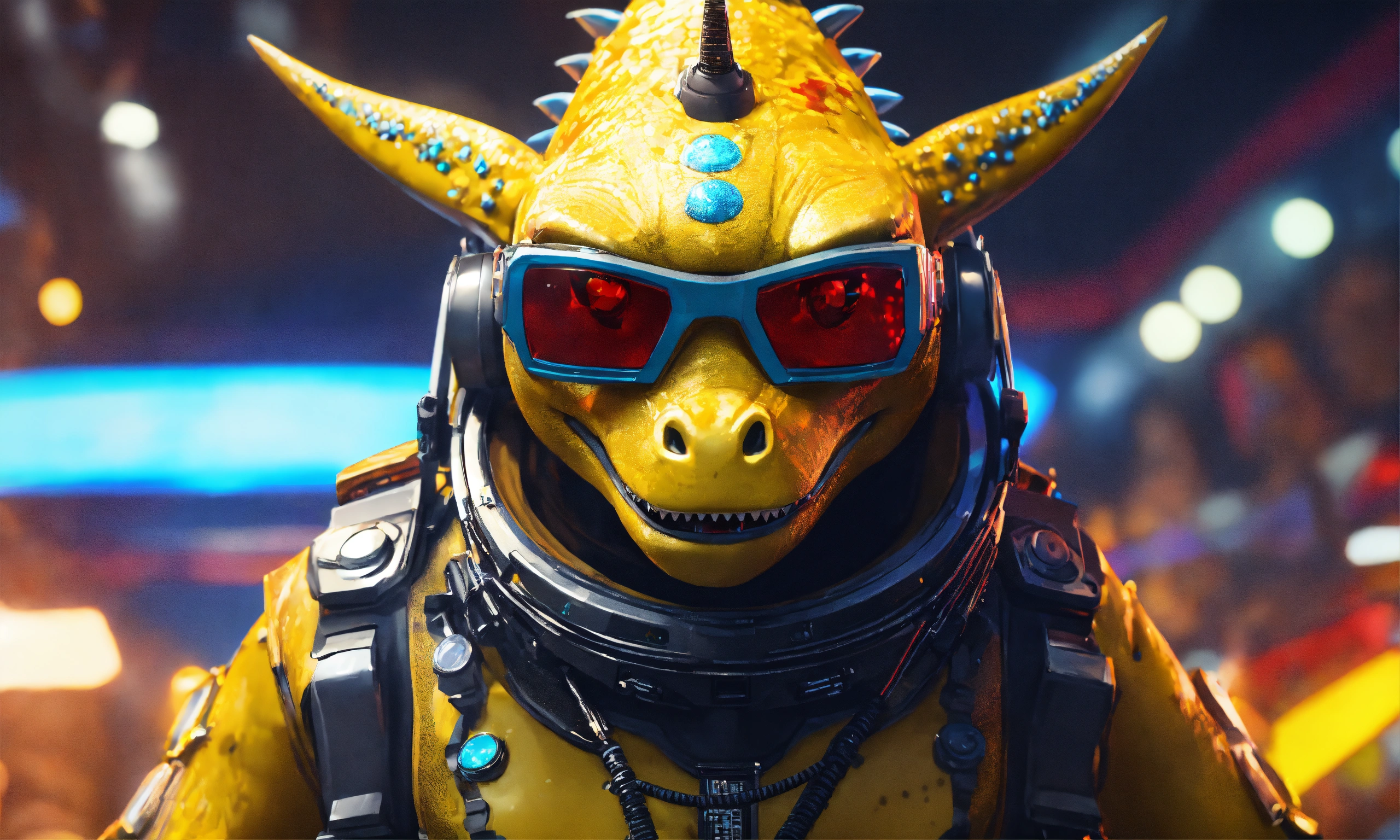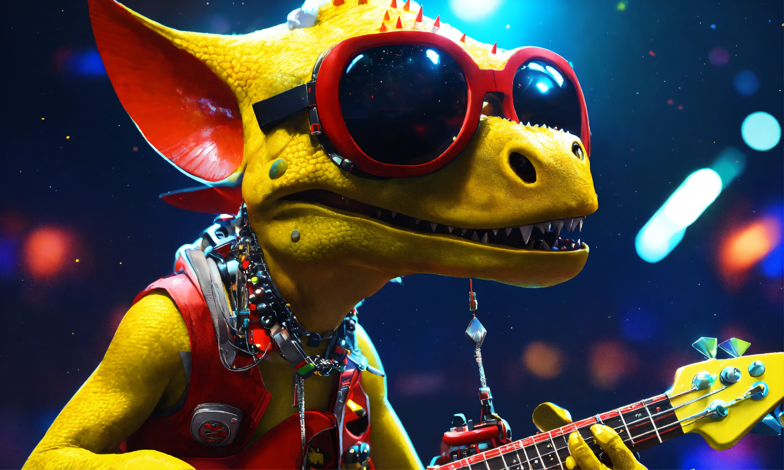 Close up on 1000 lb adorable stylish yellow alien cartoon dinosaur with red spots and spikes, and wearing hi-tech jewelry and cool space glasses, playing a long hi tech space bass blaster with his band on stage at a concert on venus, its like a rave with all types of humanoids and alien creatures dancing and enjoying the music, pixar, unreal engine, 8k