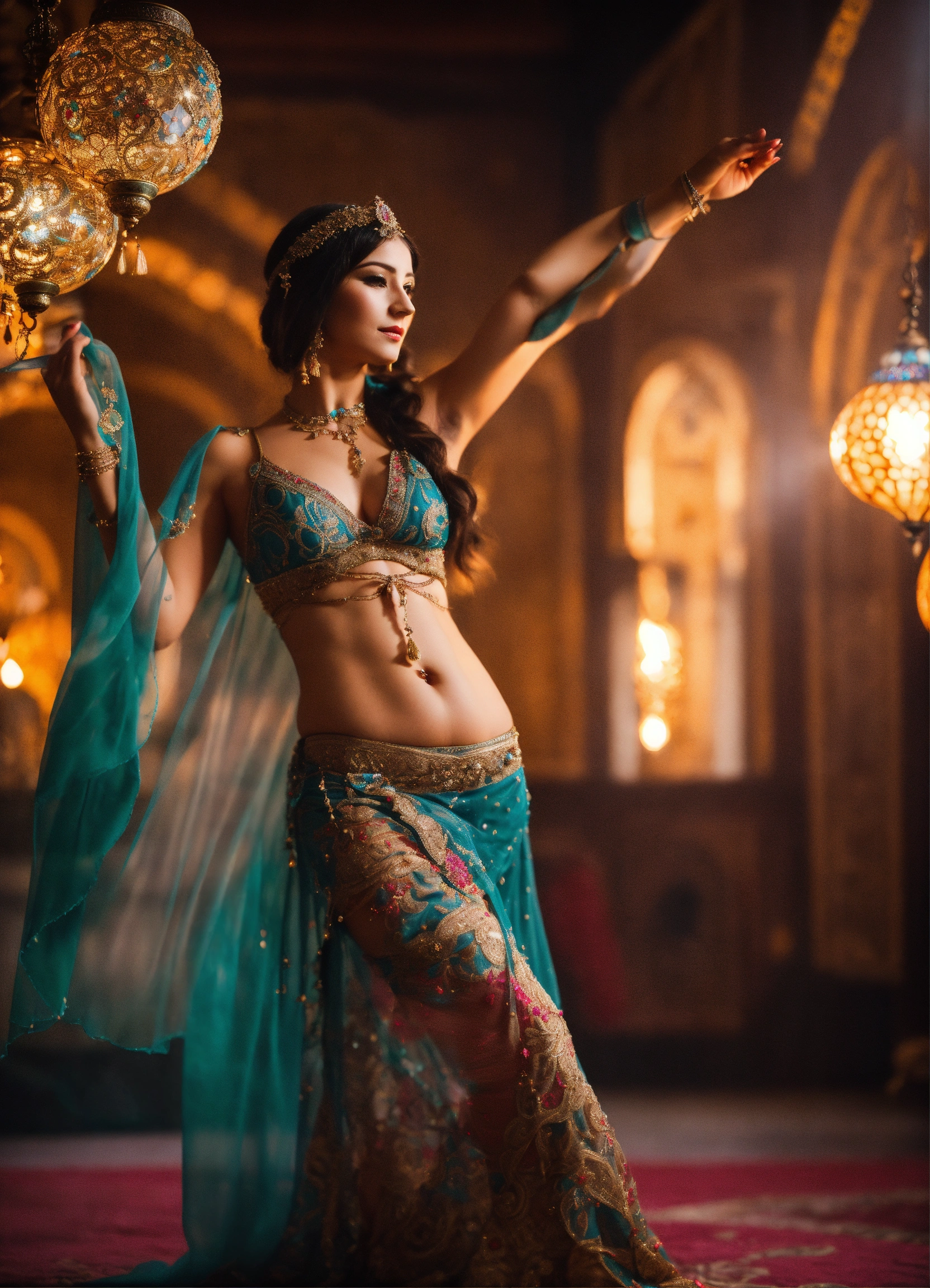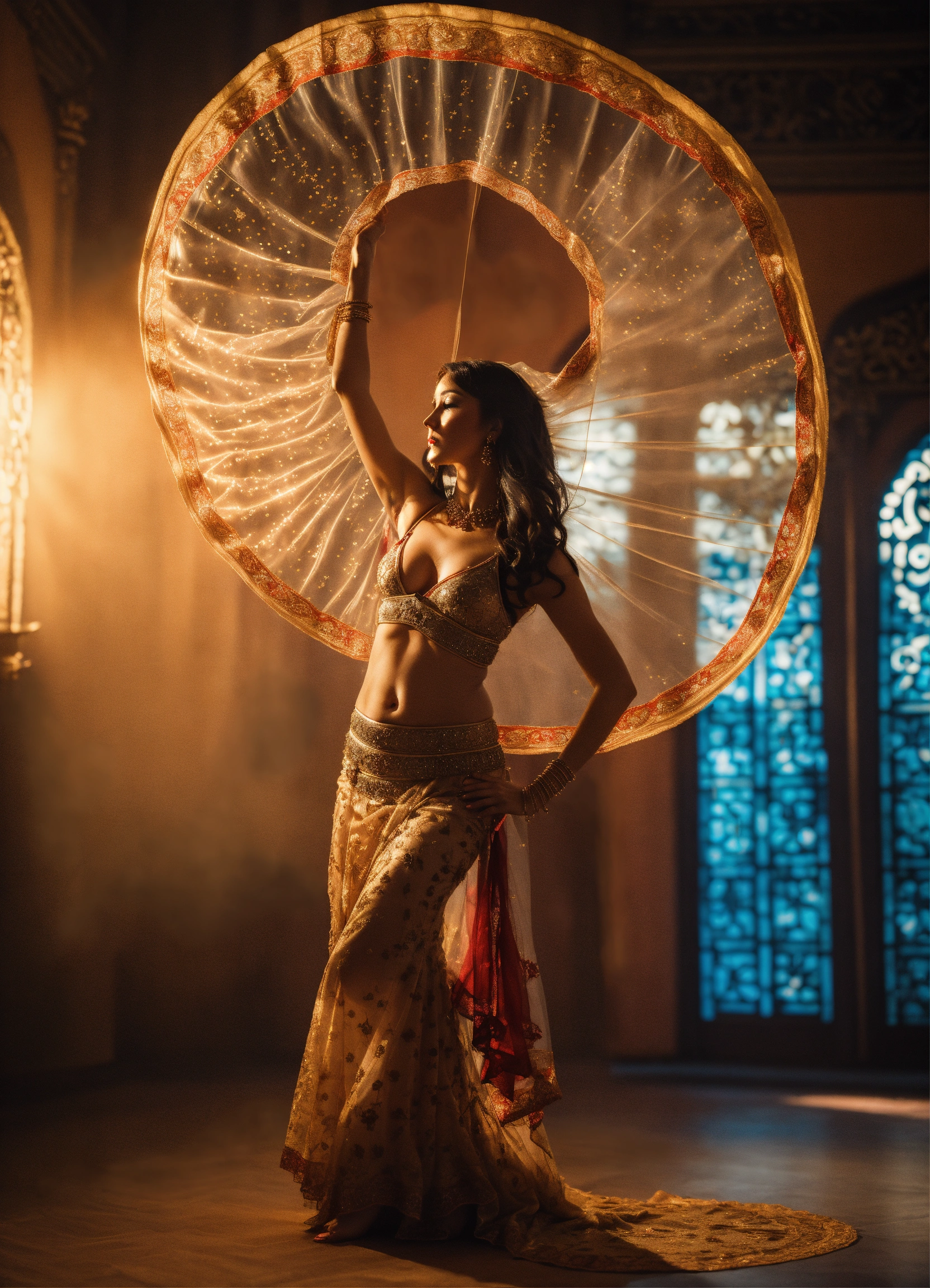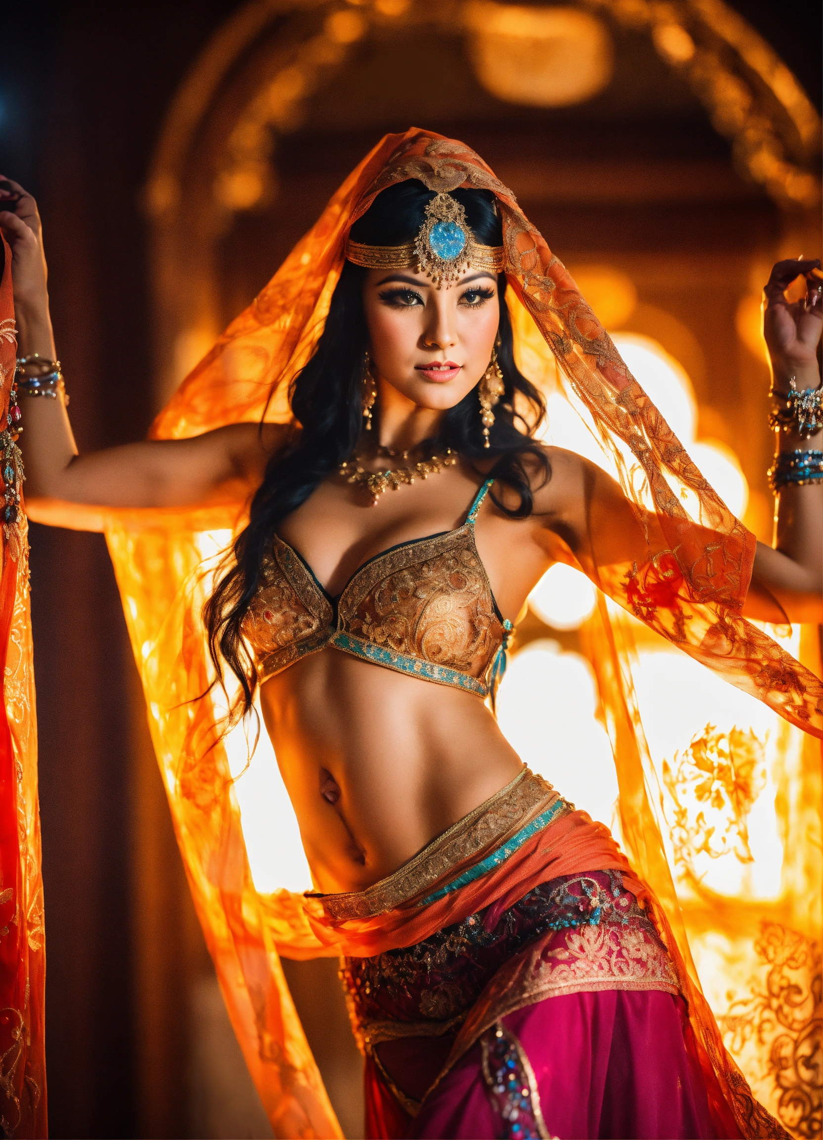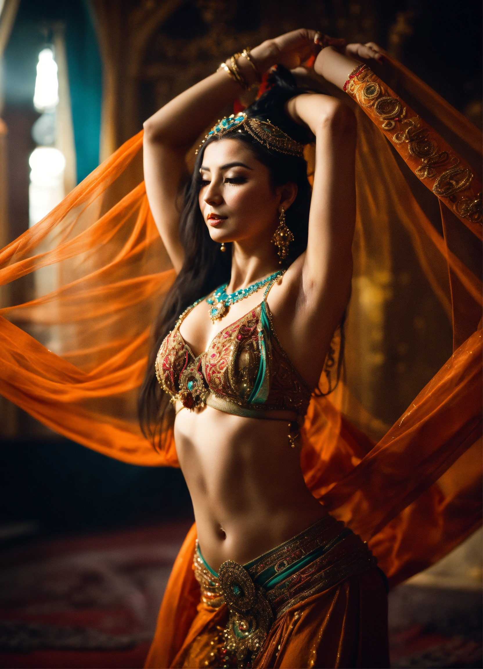 Detailed photo portrait of a small cat and a woman who is a dynamic sensuous spinning belly dancer, she is holding up a transparent veil in an oriental palace, spinning her body, lighting from upper right, chin up looking at viewer