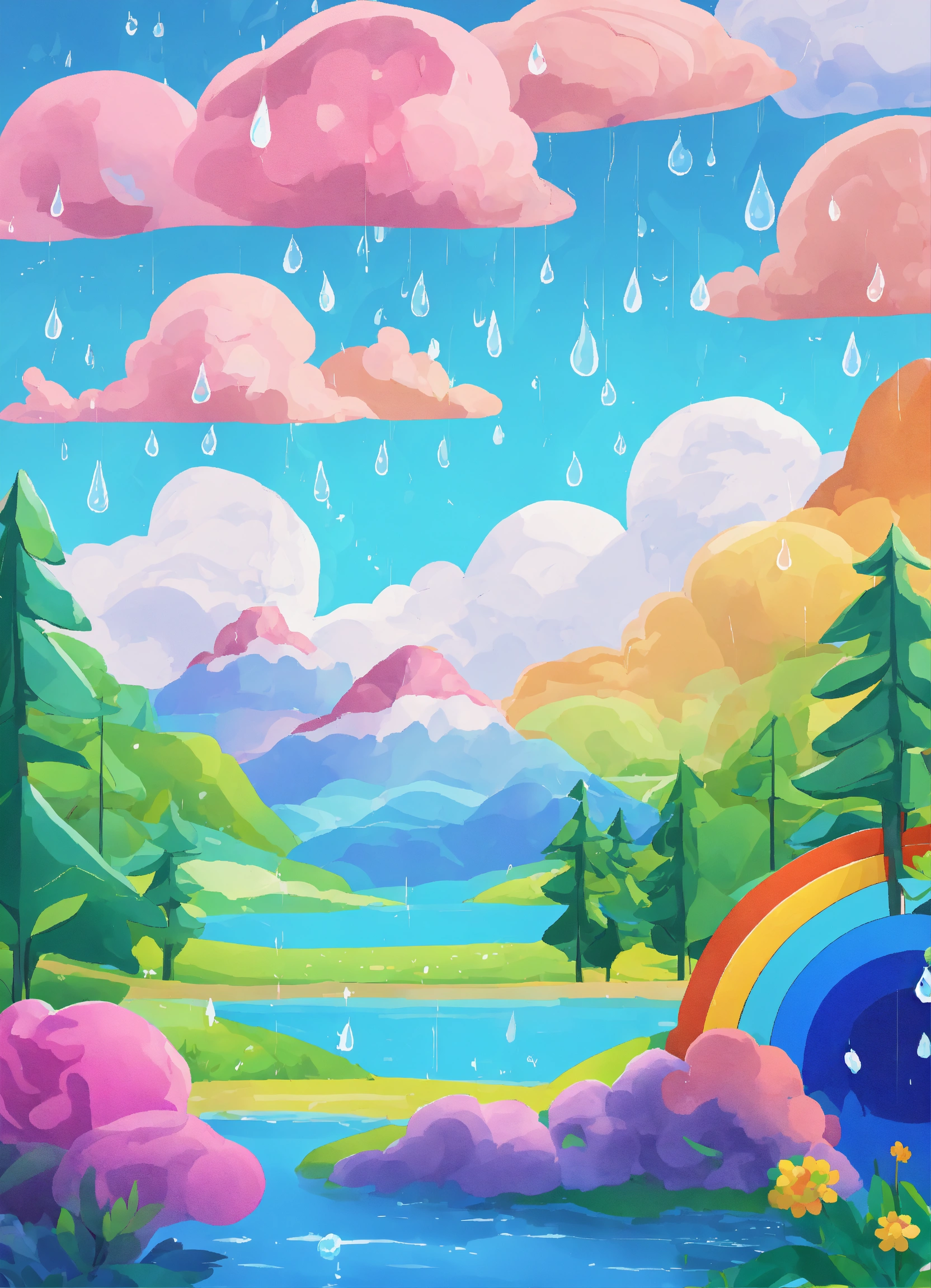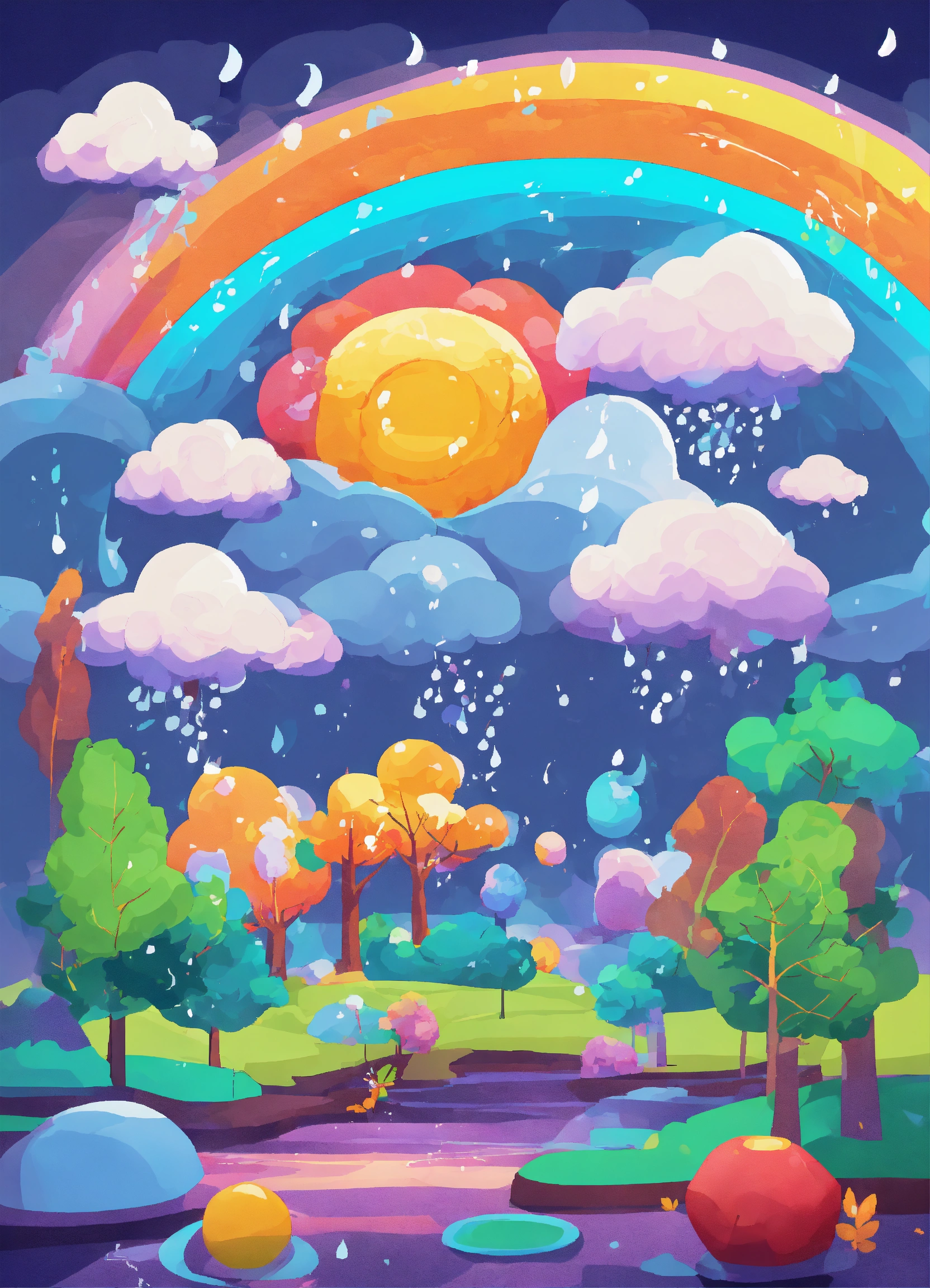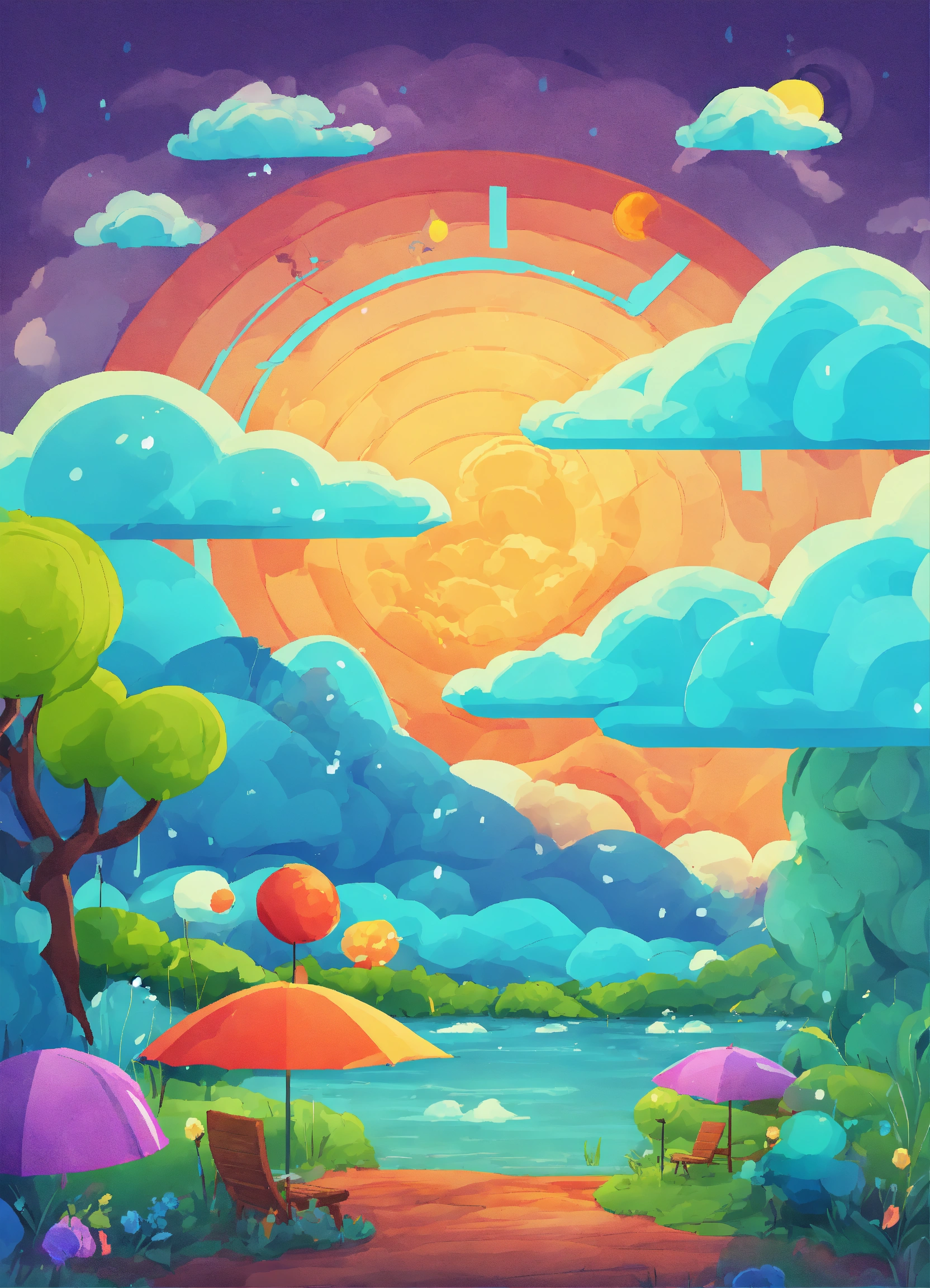 The image depicts a cartoonish weather forecast scene with a colorful
