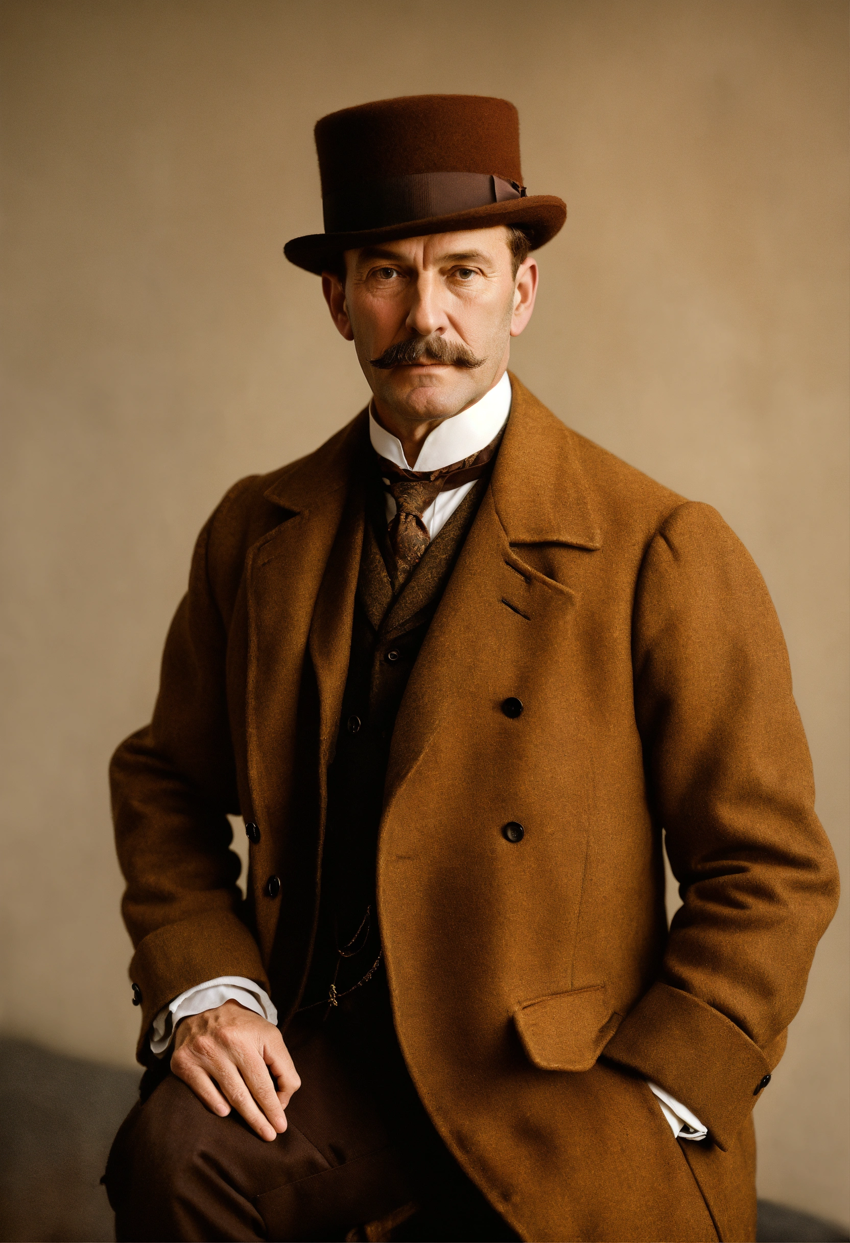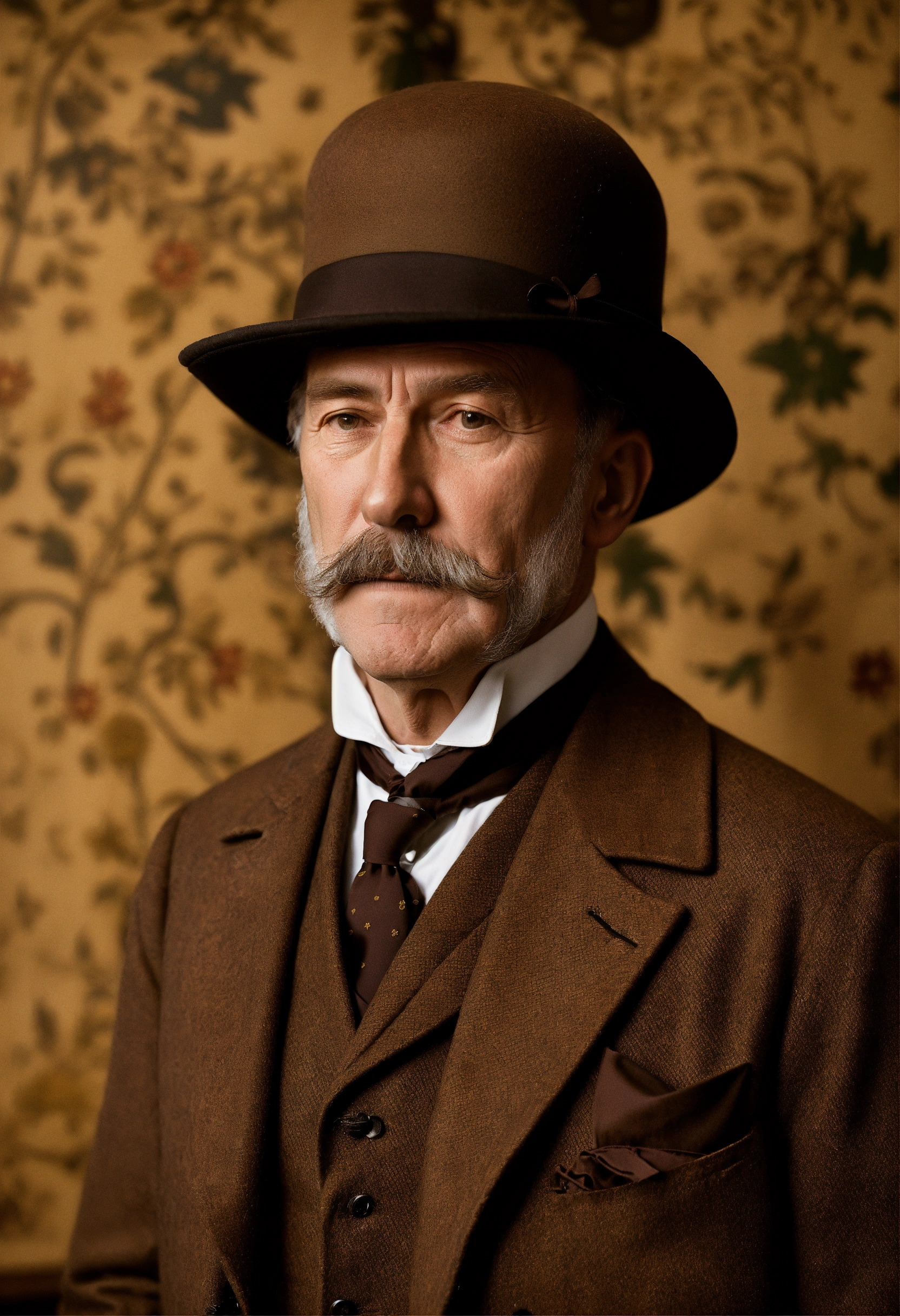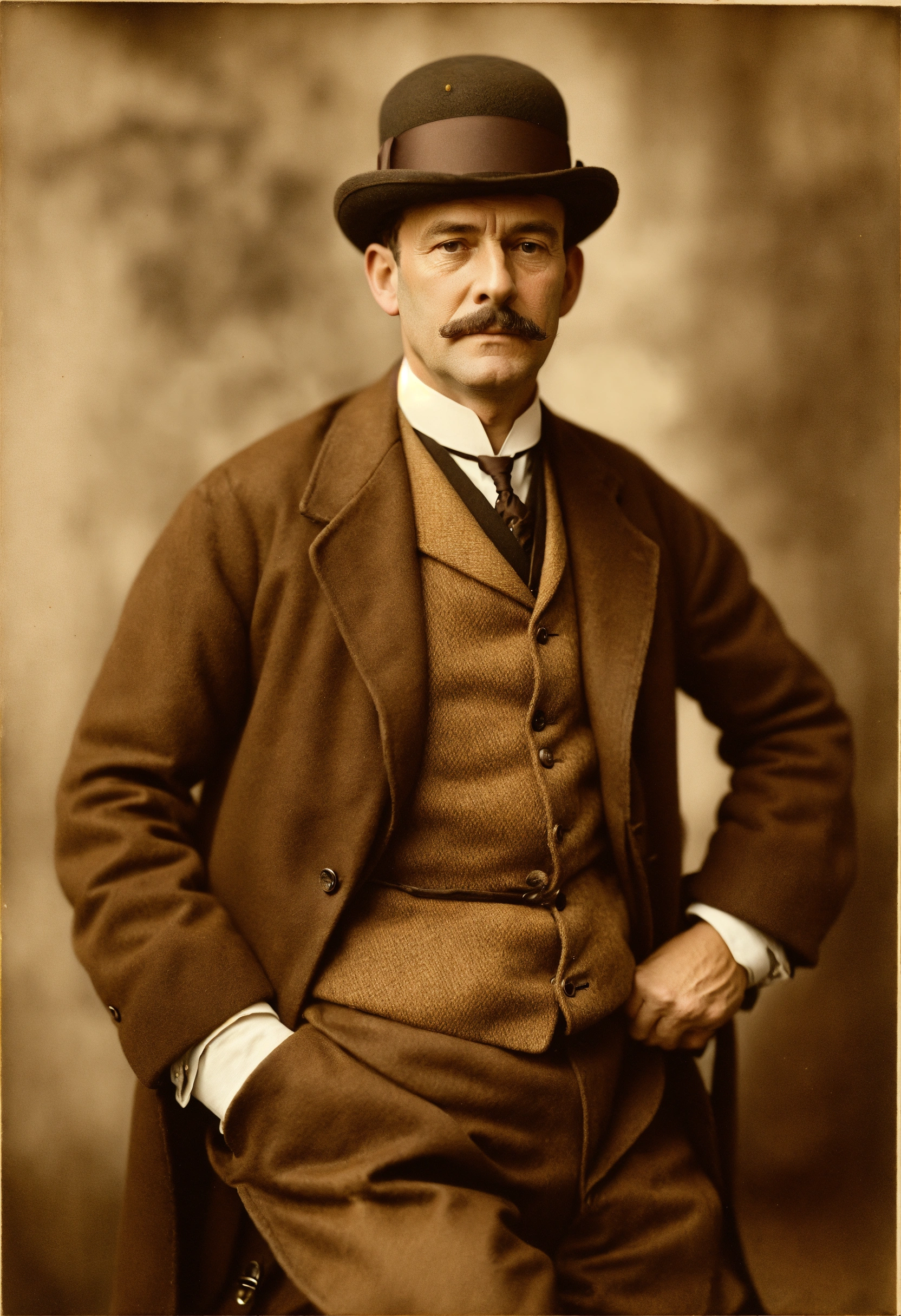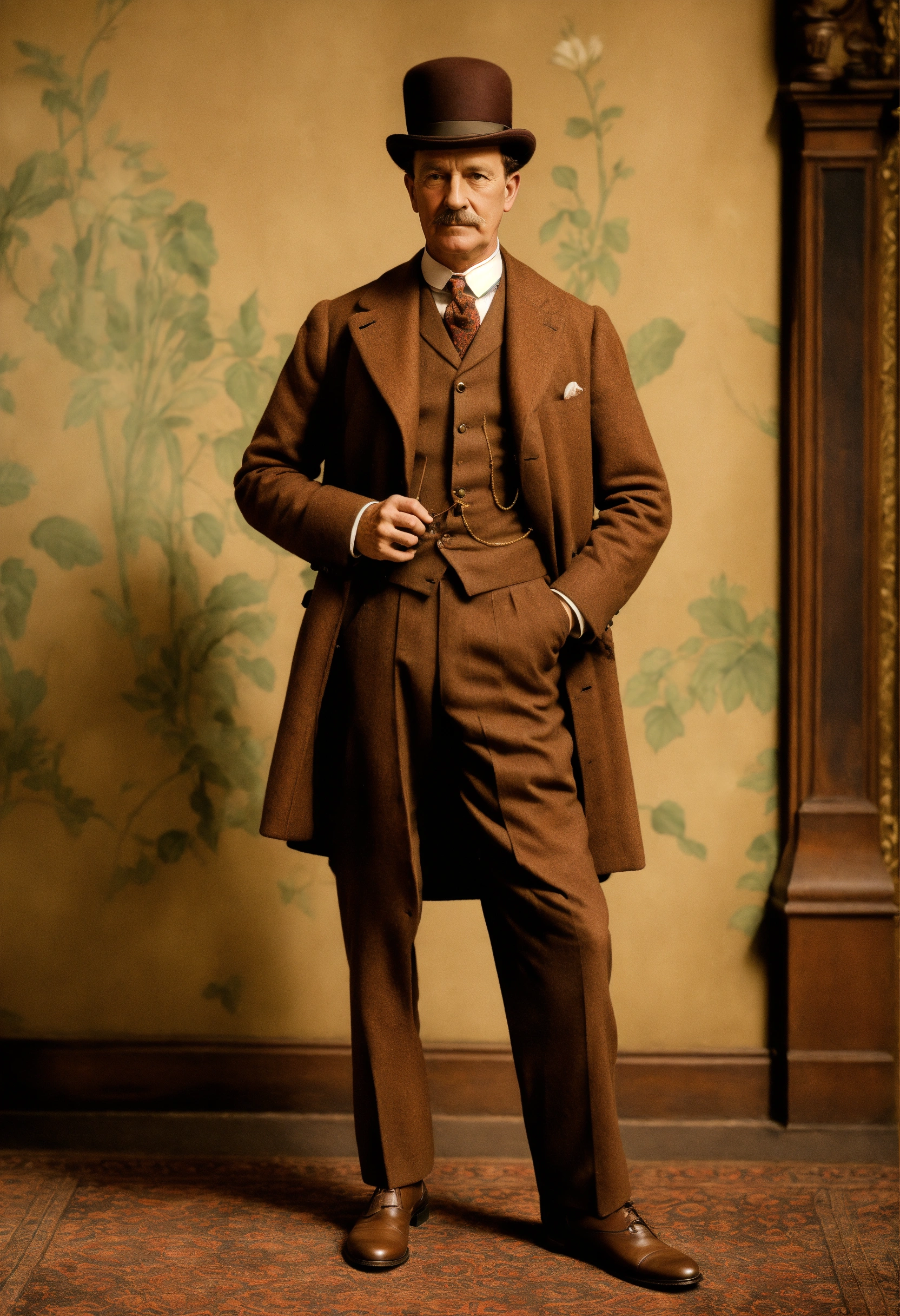 An edwardian man wearing a brown bowler hat and brown ensemble