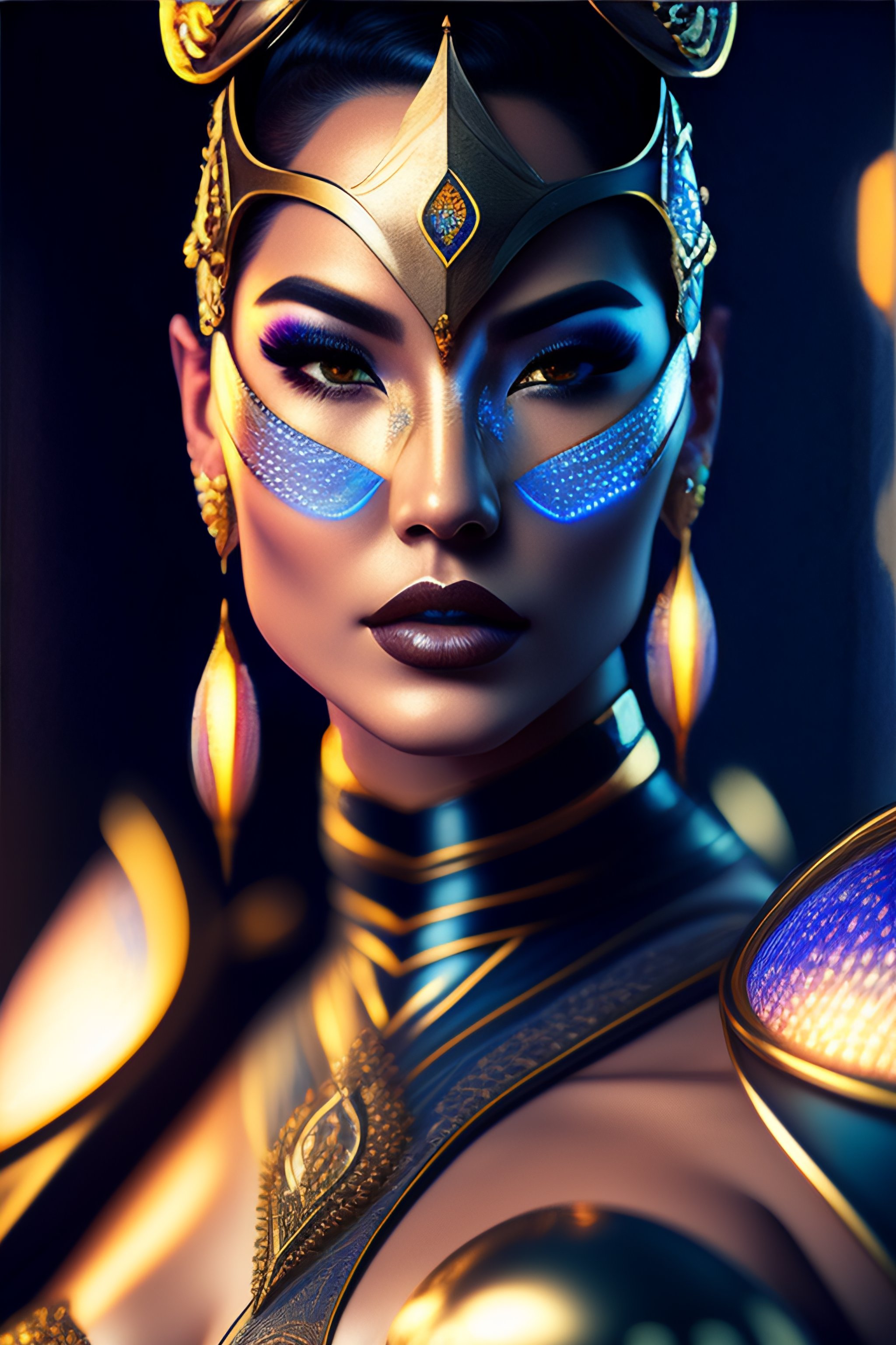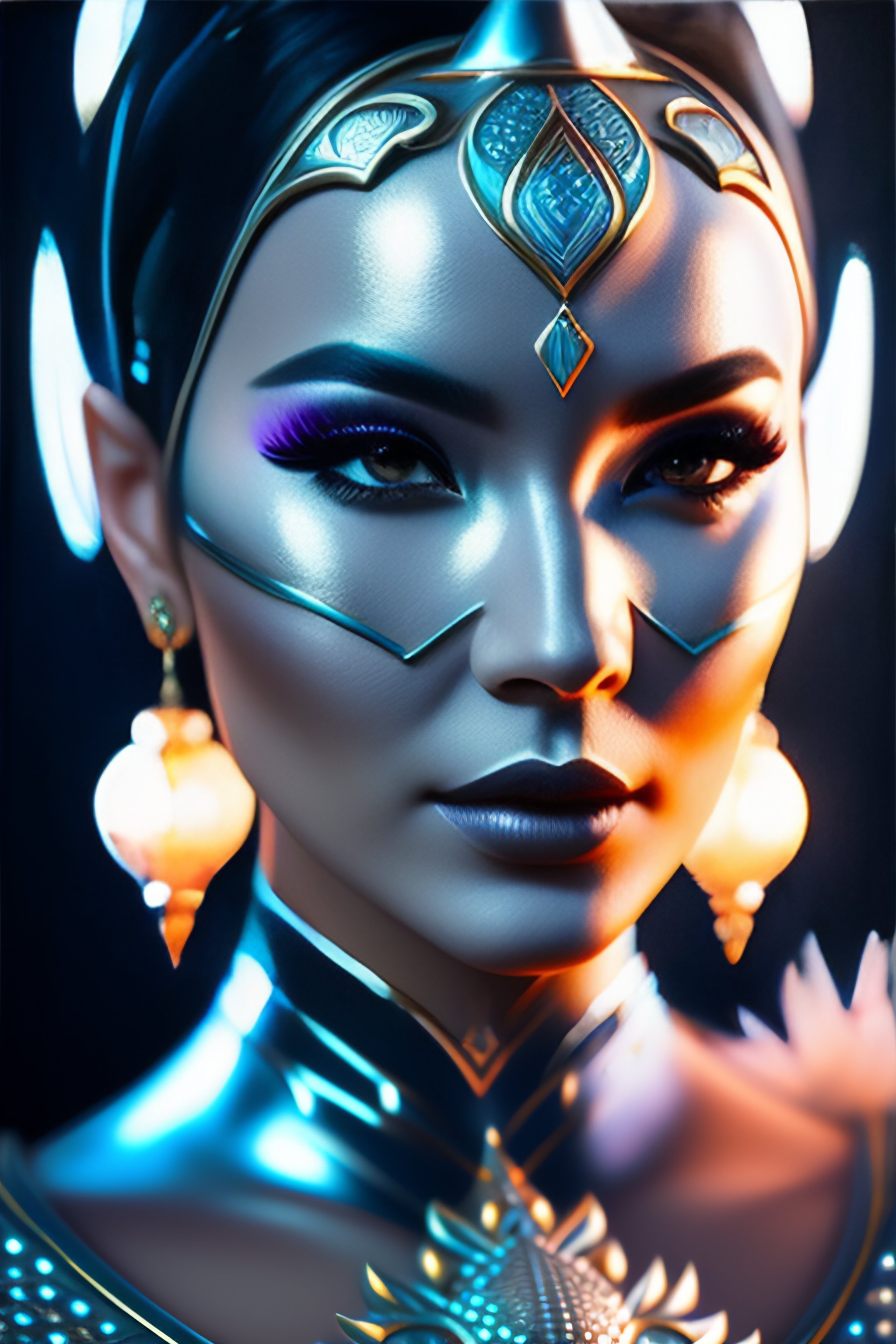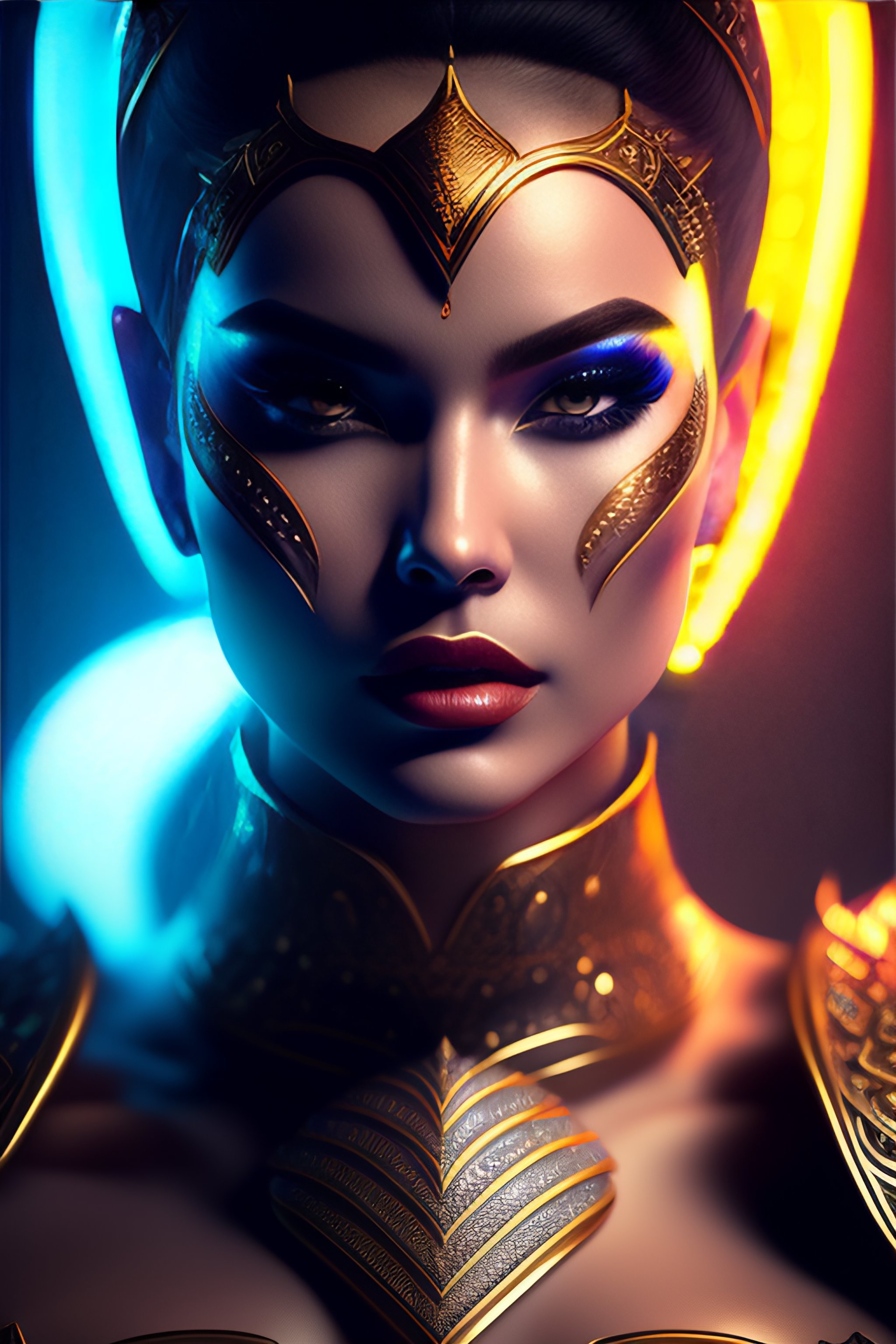 Kitana, sci fi, fantasy artwork, white, intricated detail, ornament mask, russian pottery, neon glow lights, porcelain greek, portrait, 3d, cgi, realistic light, trending on cgsociety, glowing eyes, artwork, neon details, ultra realistic details, sci fi atmosphere, global illumination, shadows, octane render, 8 k, ultra sharp, intricated detail, high detail