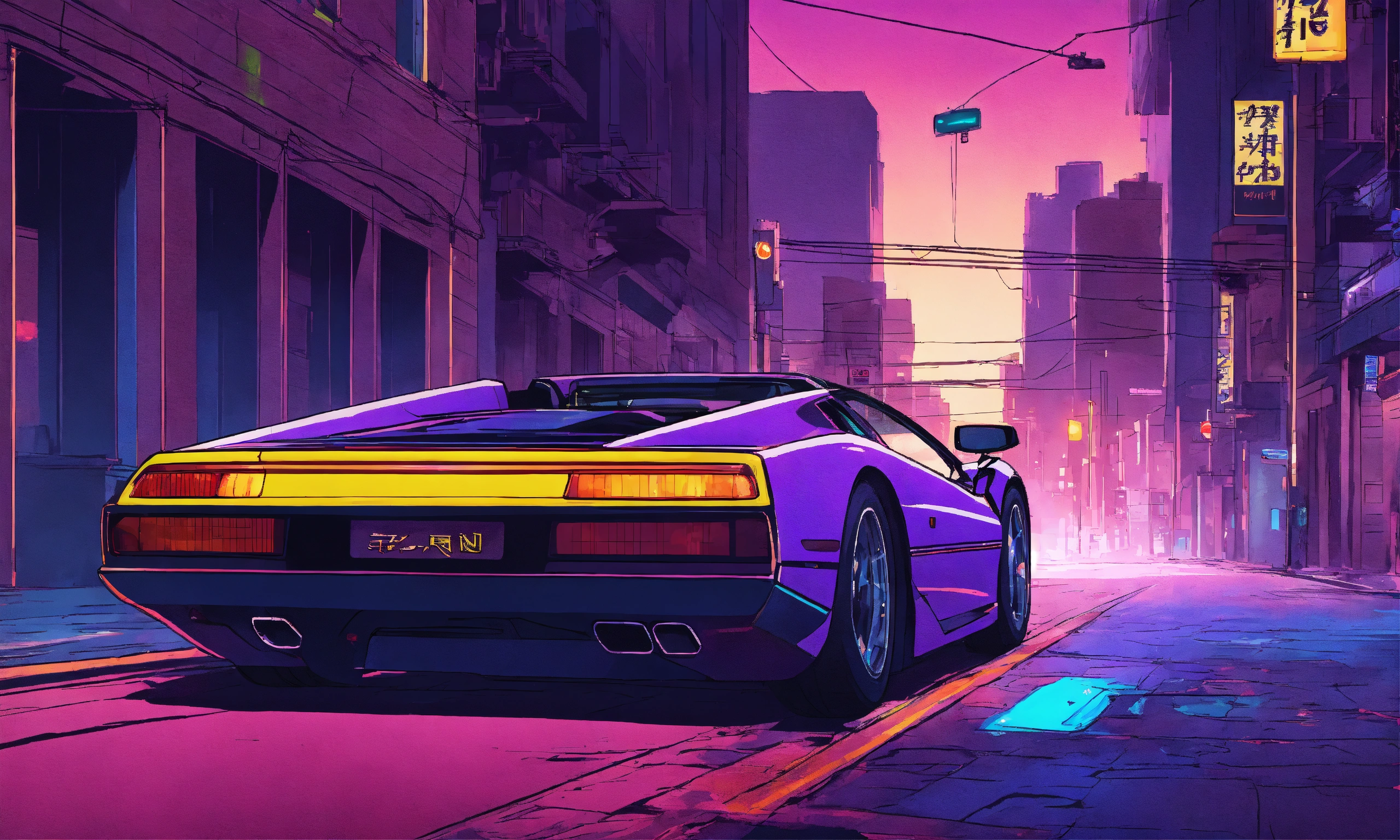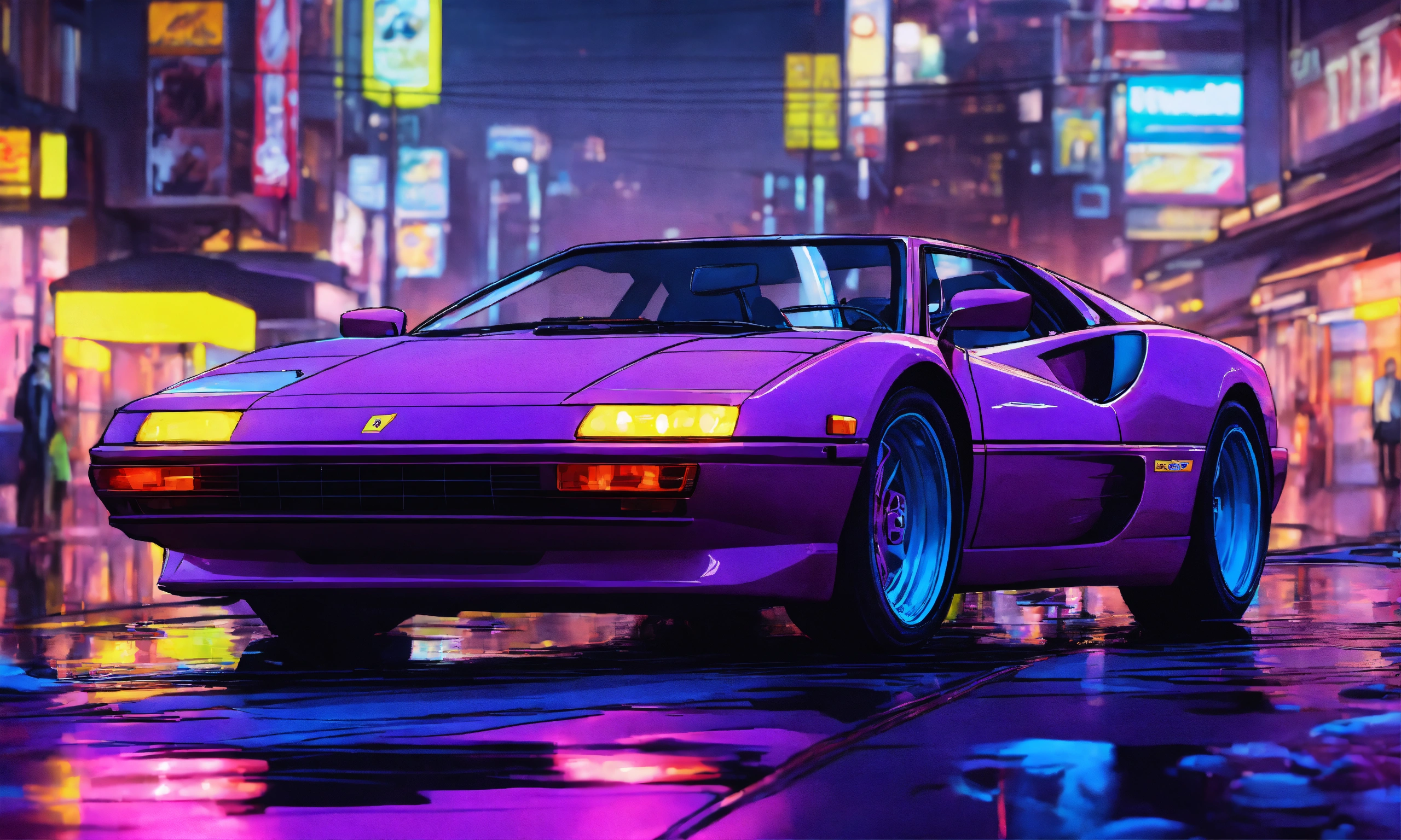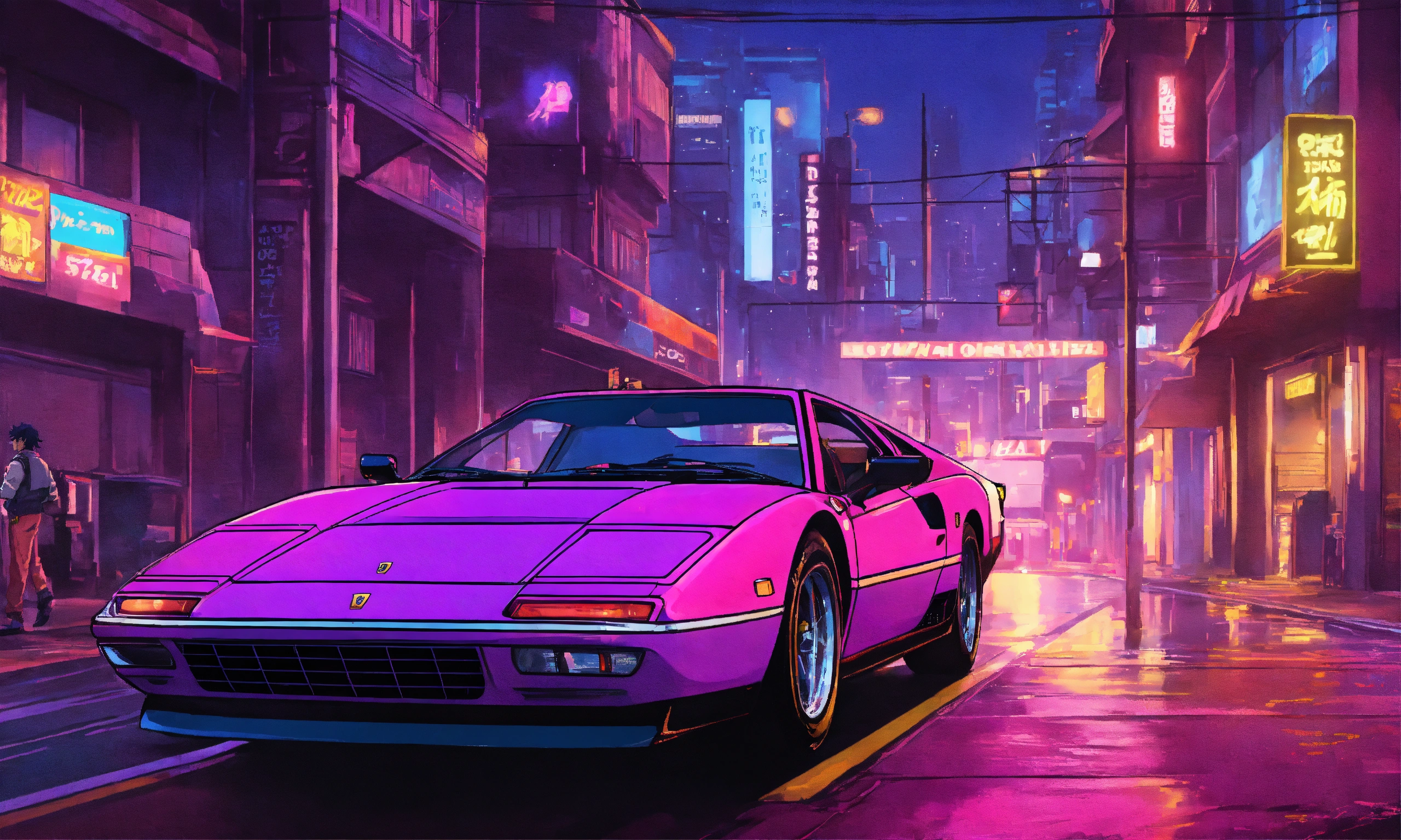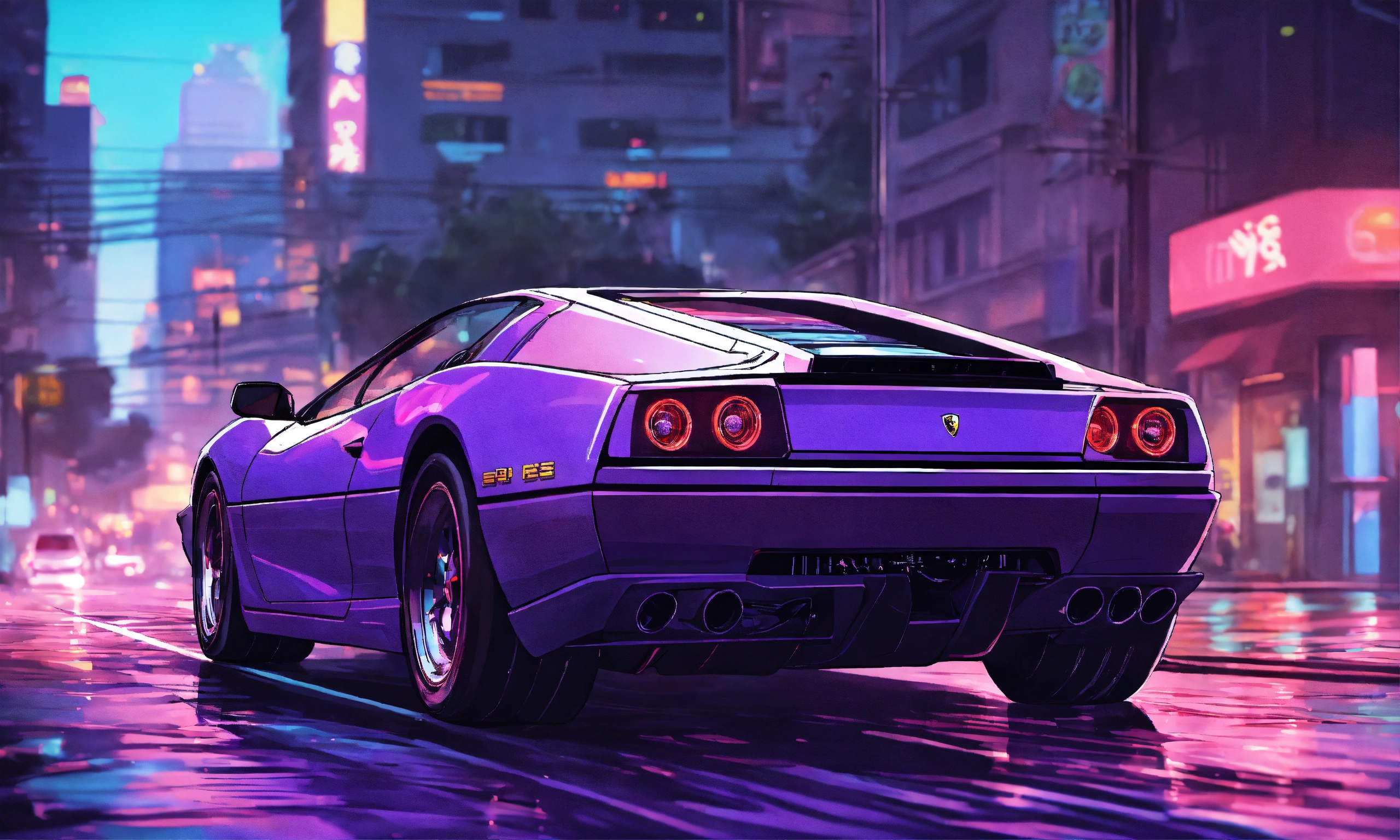 man driving a purple ferrari through city streets at night