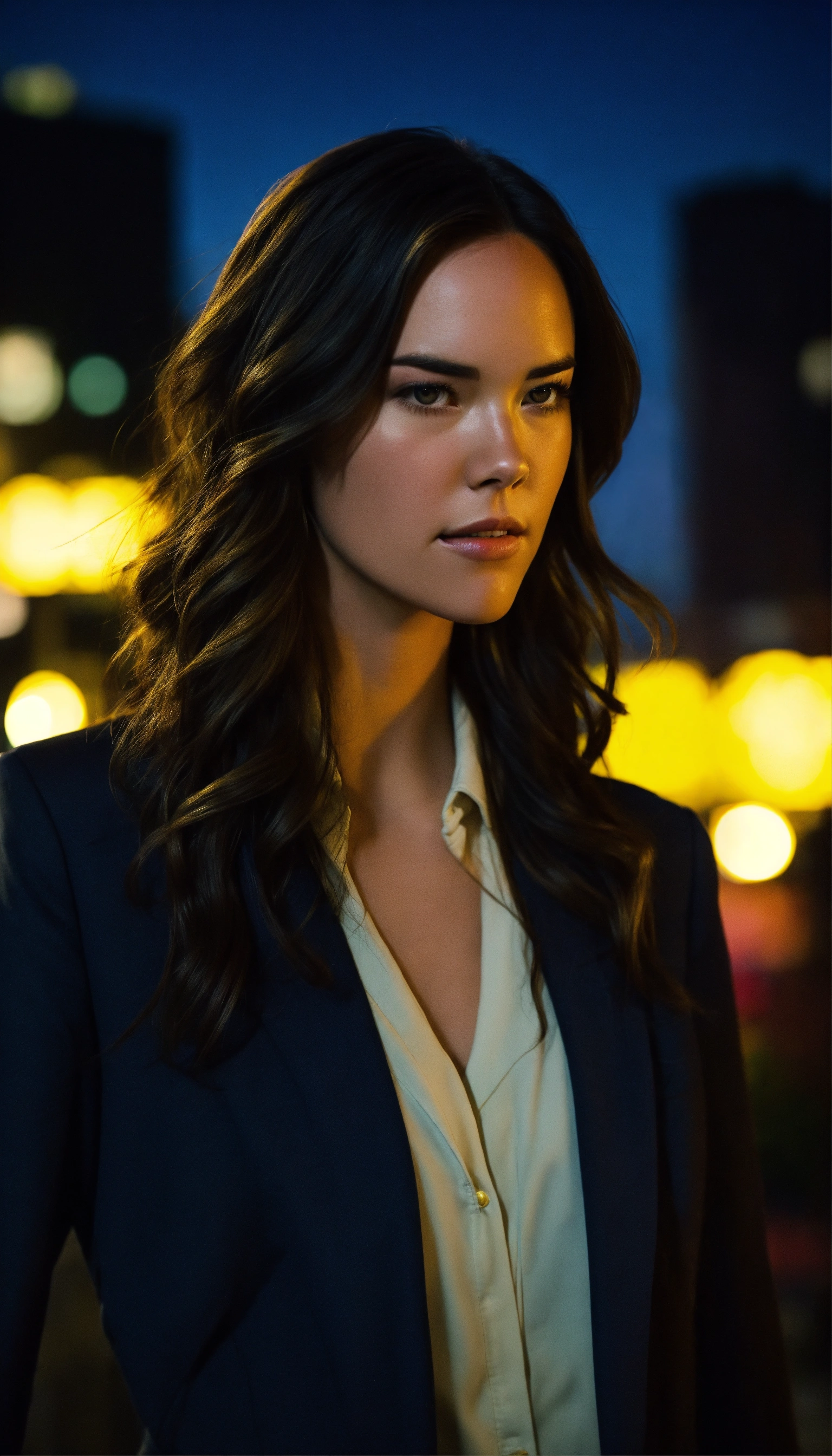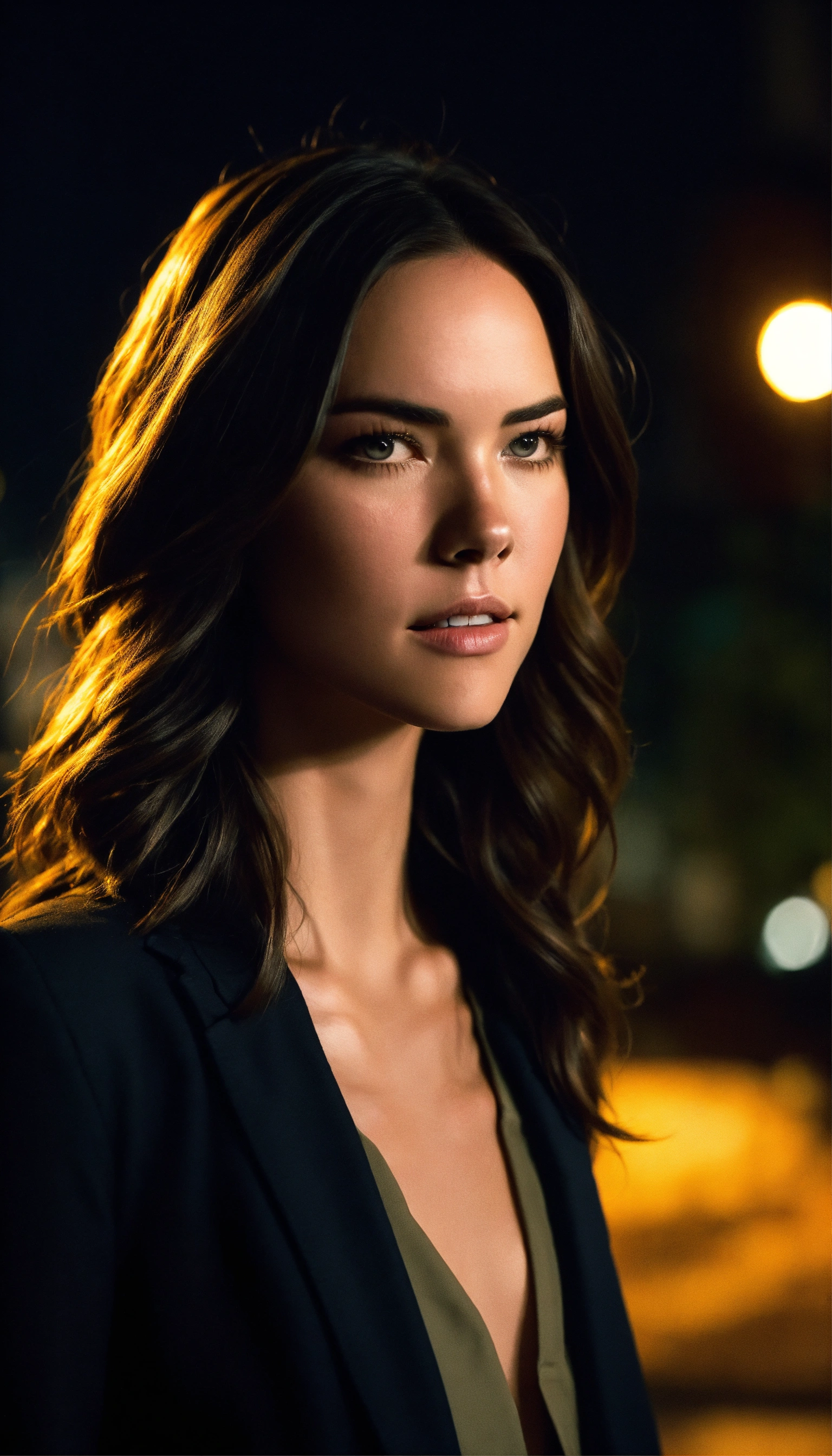 Very beautiful 25 years old odette annable, with cute big hazel eyes and long hair, appears indifferent in a night city life-or-death situation. she wears a cropped blazer, adding a cinematic and realistic walk to her presence. this scene is reminiscent of the arrow tv show.