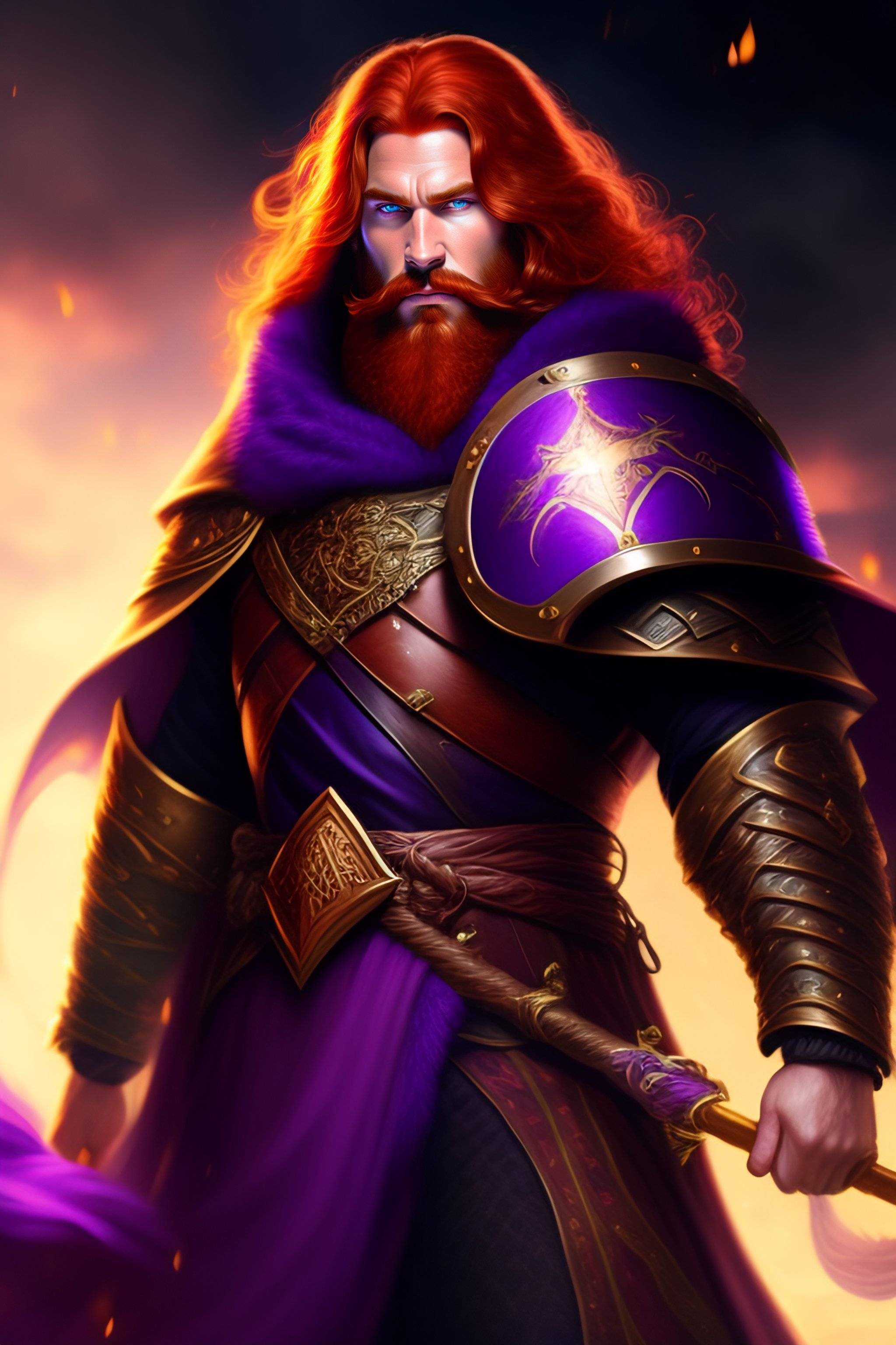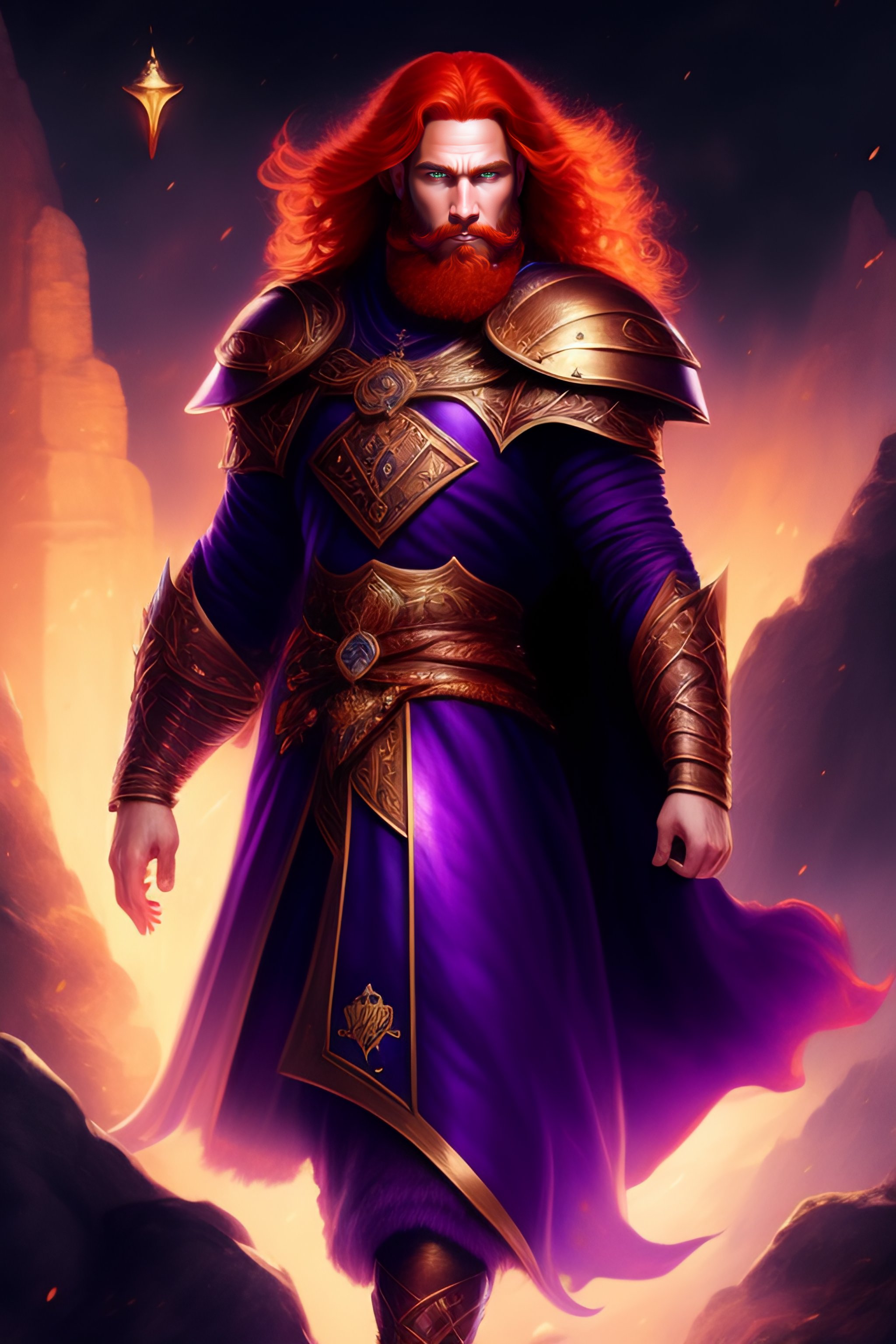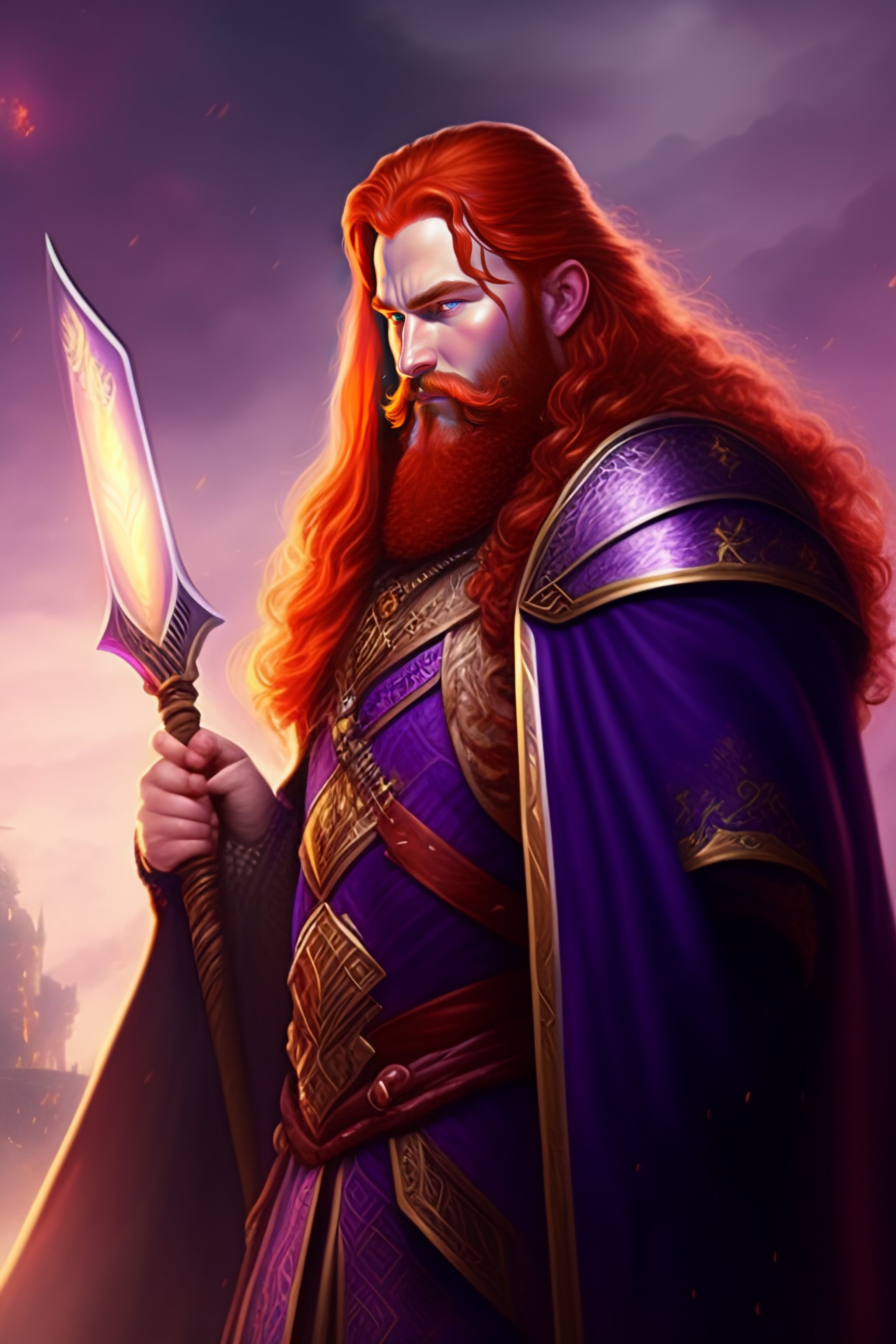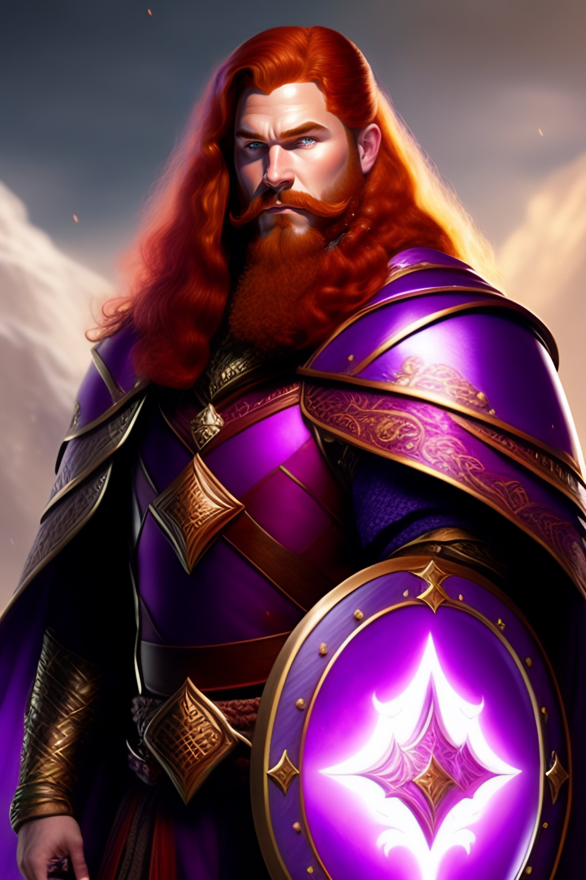 A redhead fantasy dwarf wearing purple robes and a shield with the symbol of selune, he is floating above ground and lighty surrounded by a dark twilight aura
