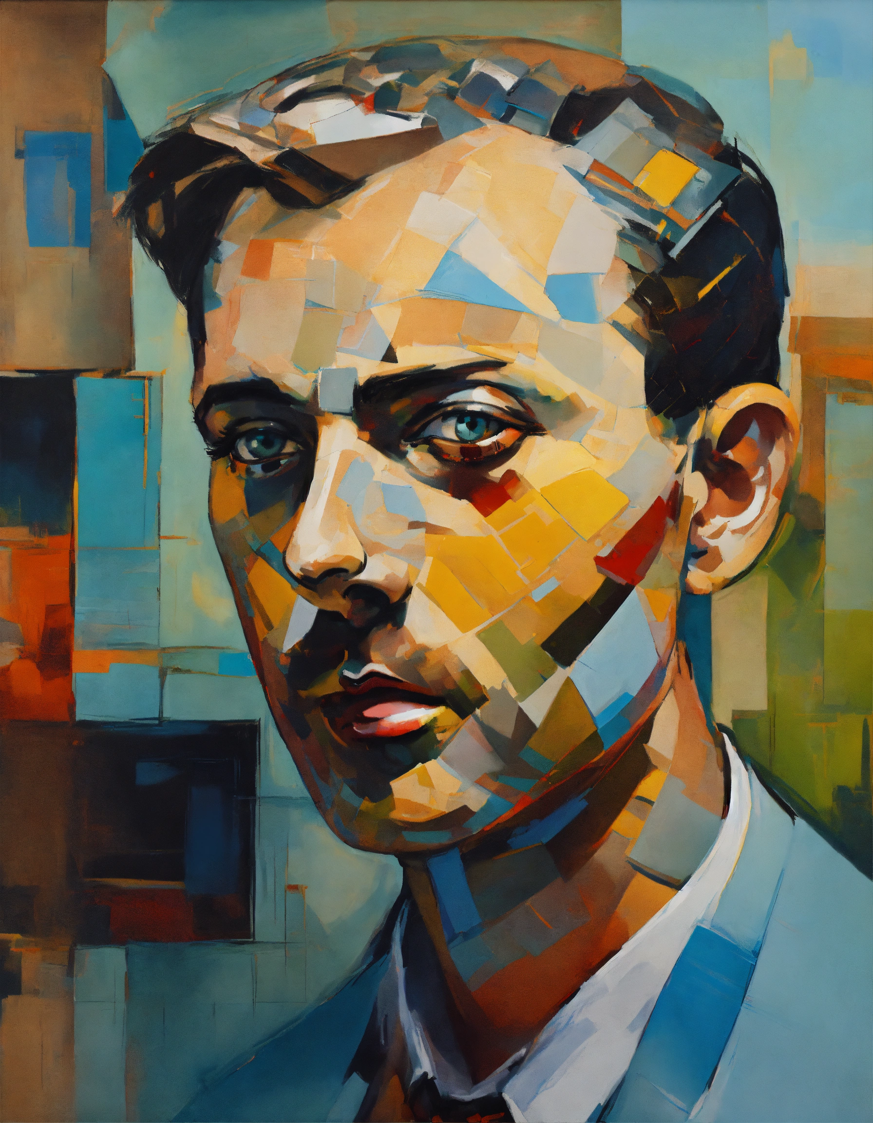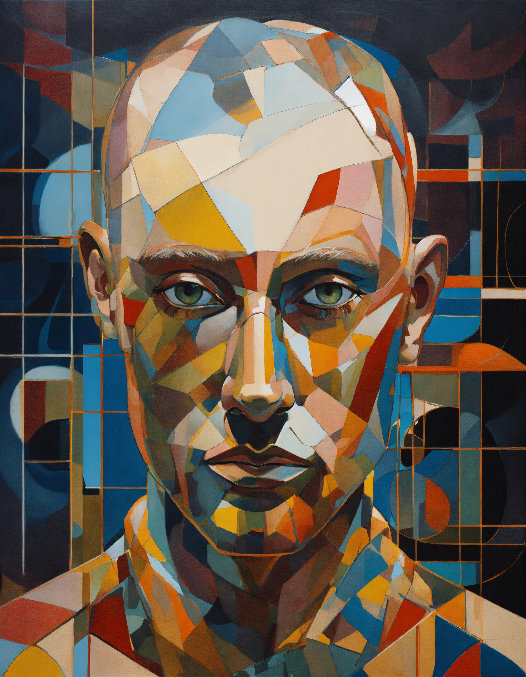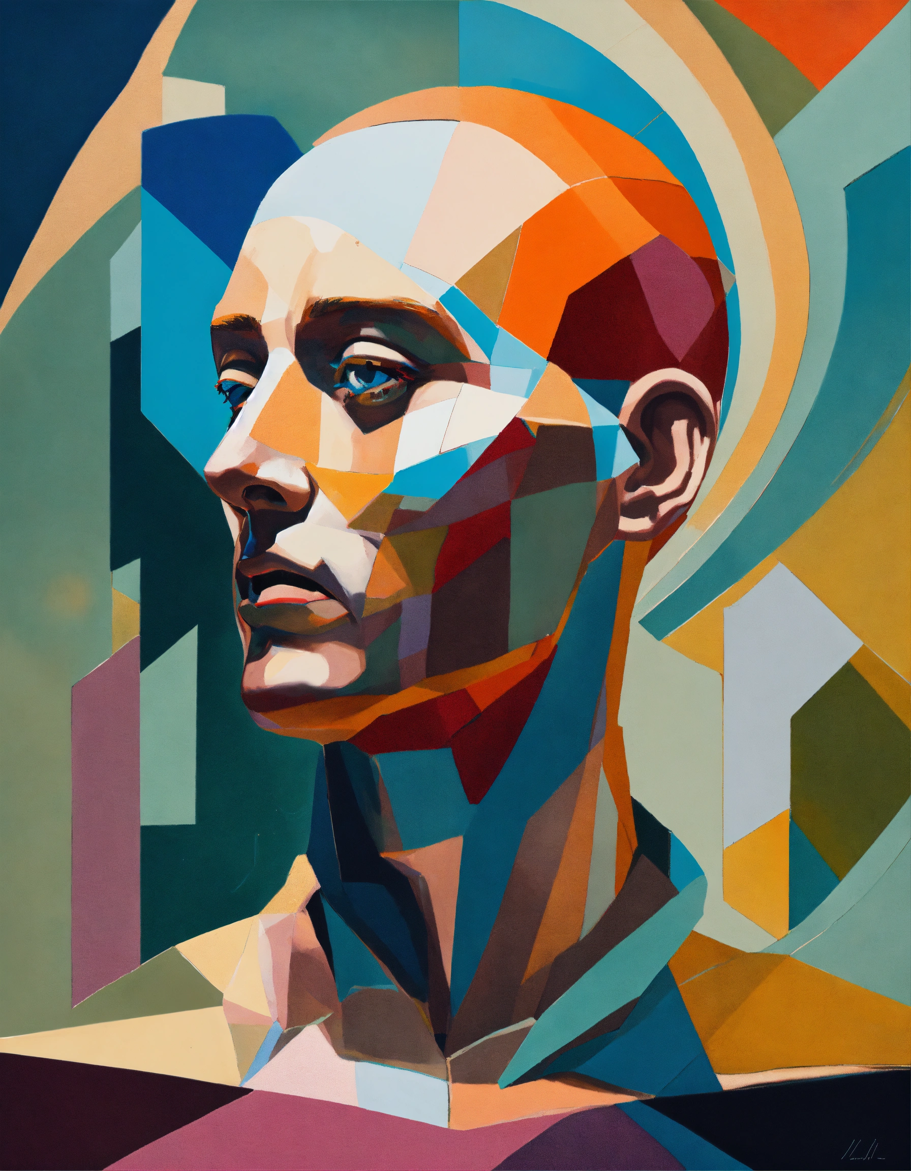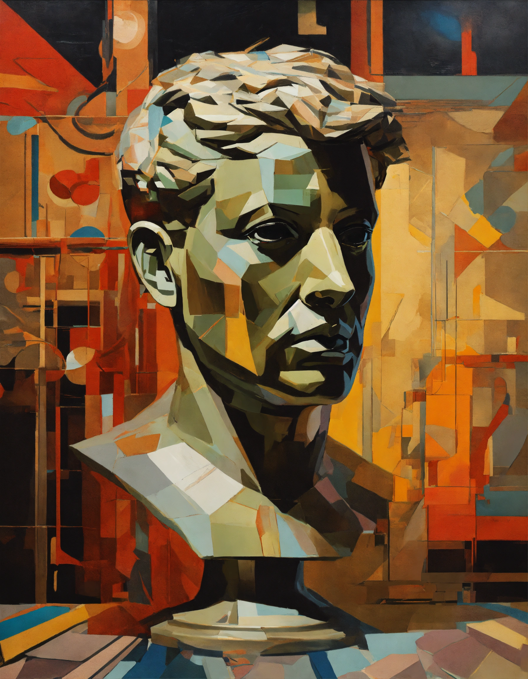 Create a visually striking and abstract portrait image that features a bust with a focus on the head of a man. the style should be influenced by the works of the best futurist modern painters, such as dali and picasso, and should incorporate bold, dynamic shapes, lines, and vibrant, contrasting colors. the image should exude a sense of energy and movement while maintaining a clear focus on the subject's head. the image should be super detailed and hq and should exude a contemporary and artistic feel.