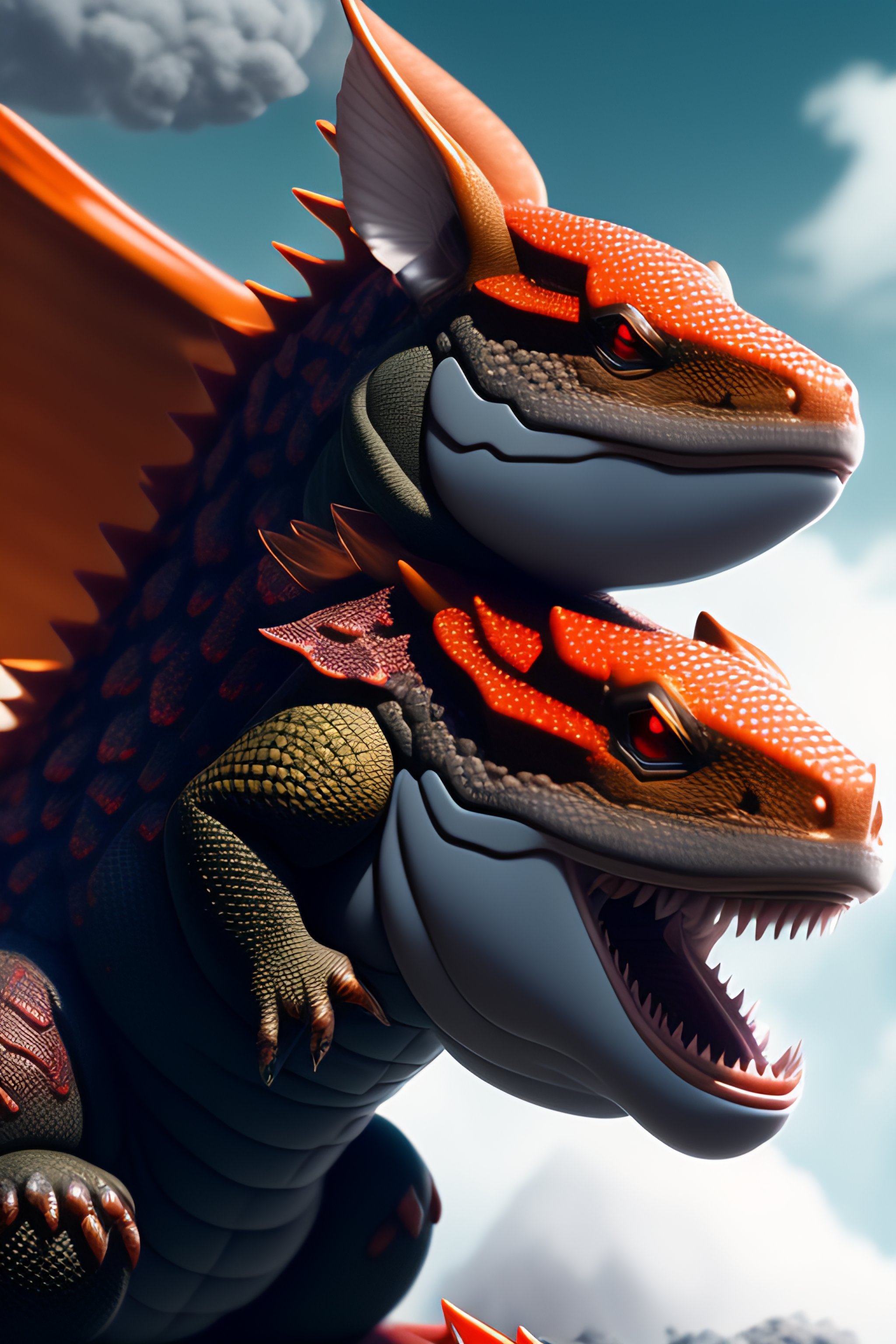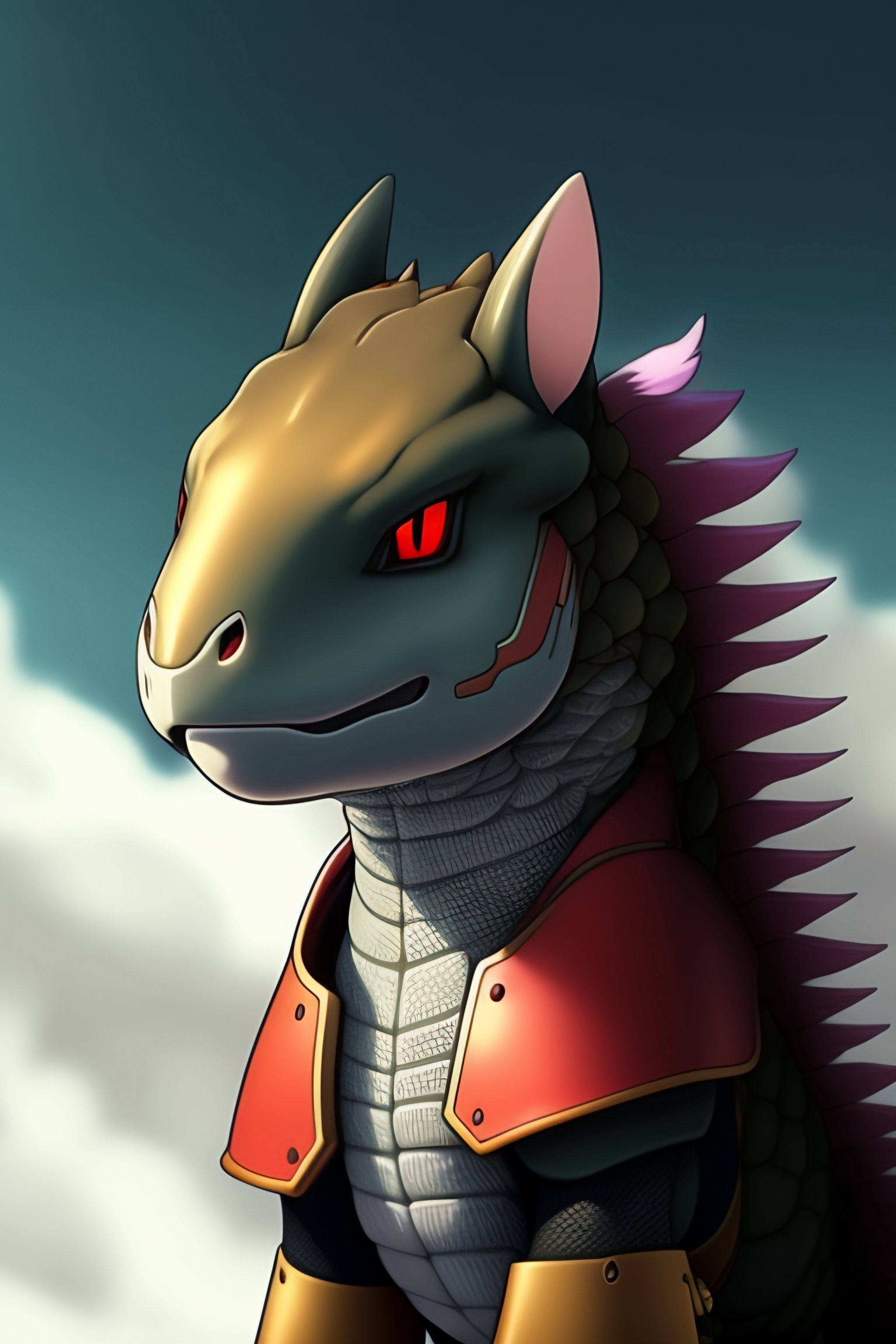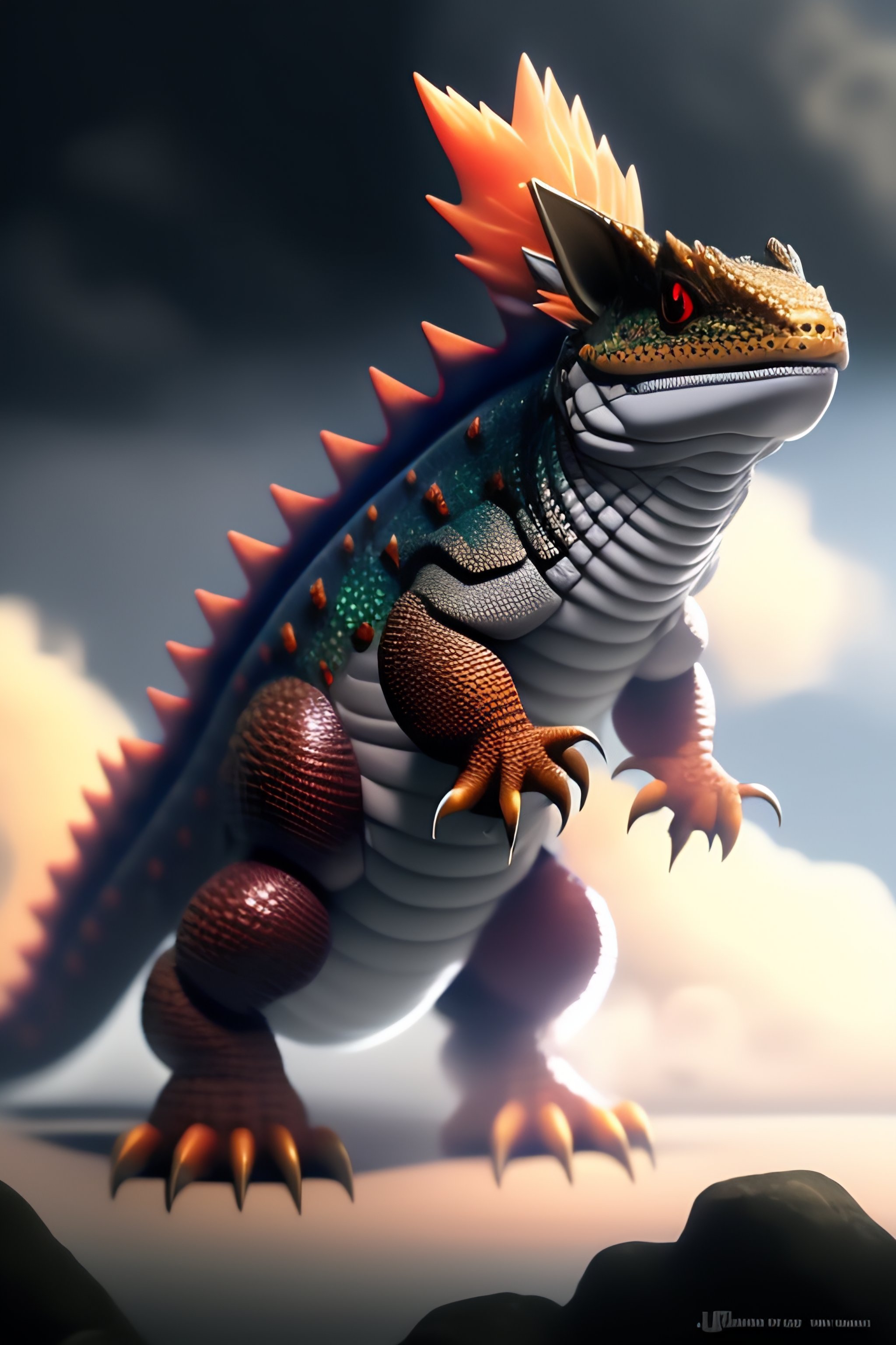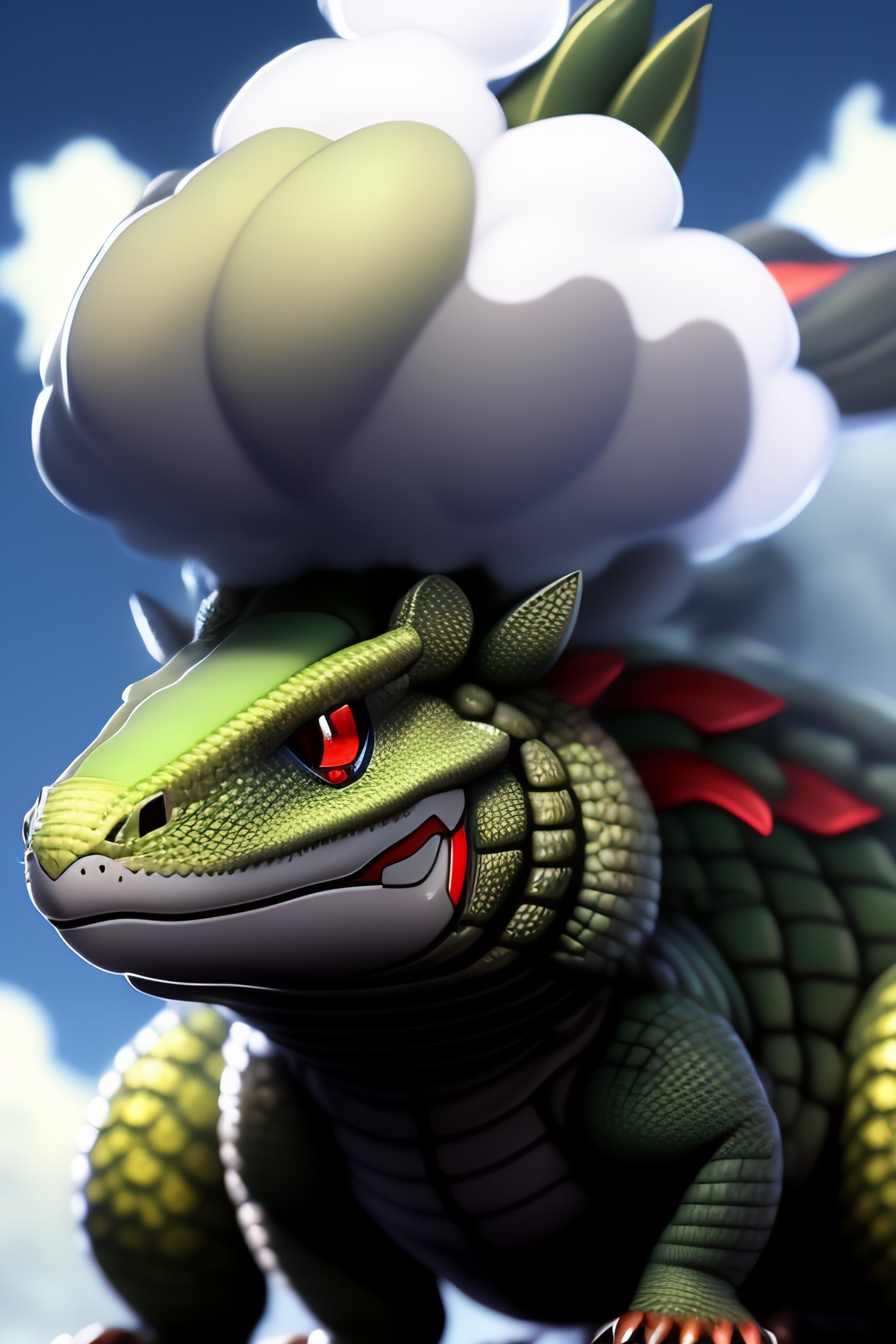 A gray cloudy smoky cloud creature with armored scale with a red magma rock four legged lizard like ken sugimori award winning manga art pokemon digital