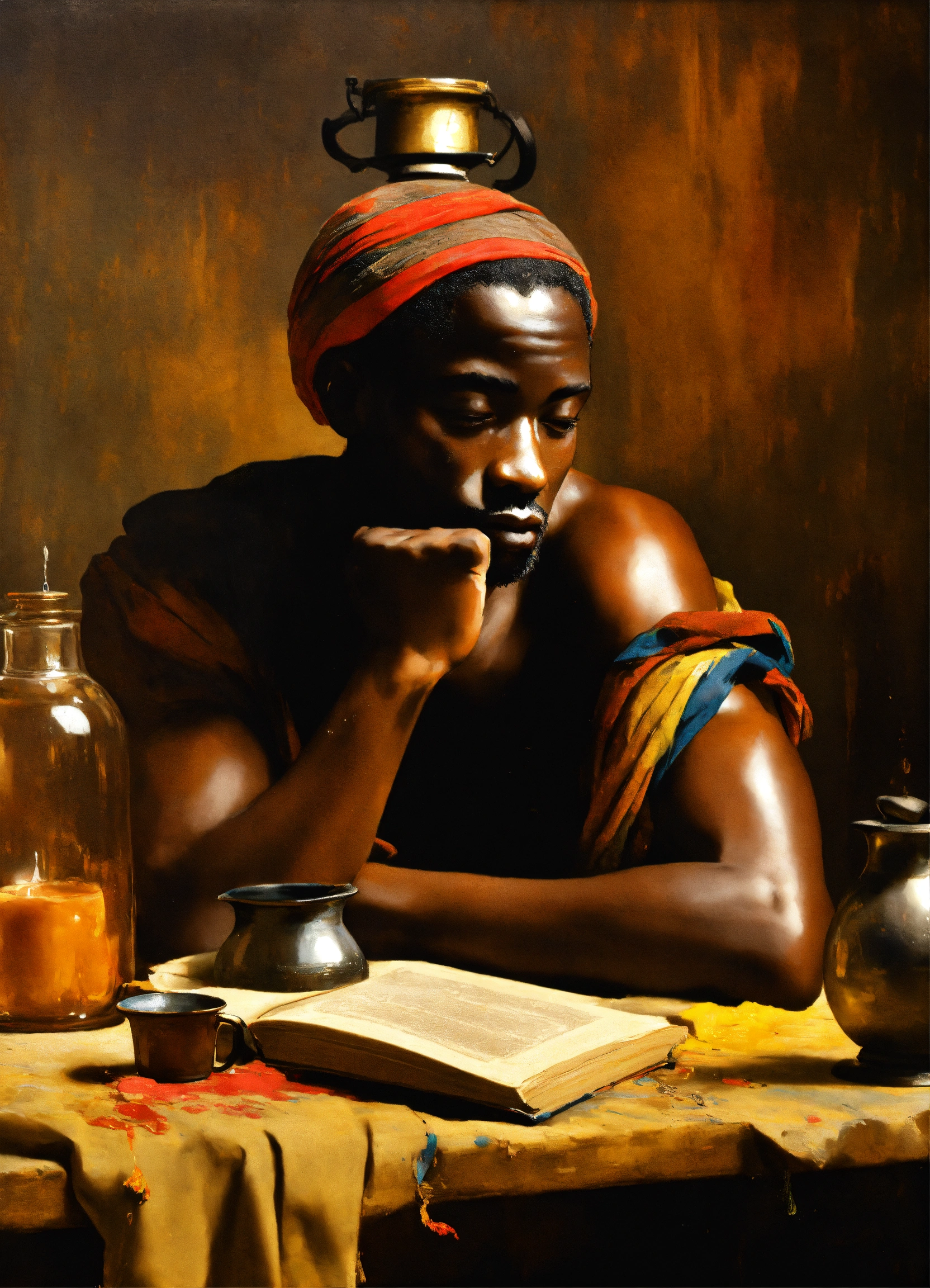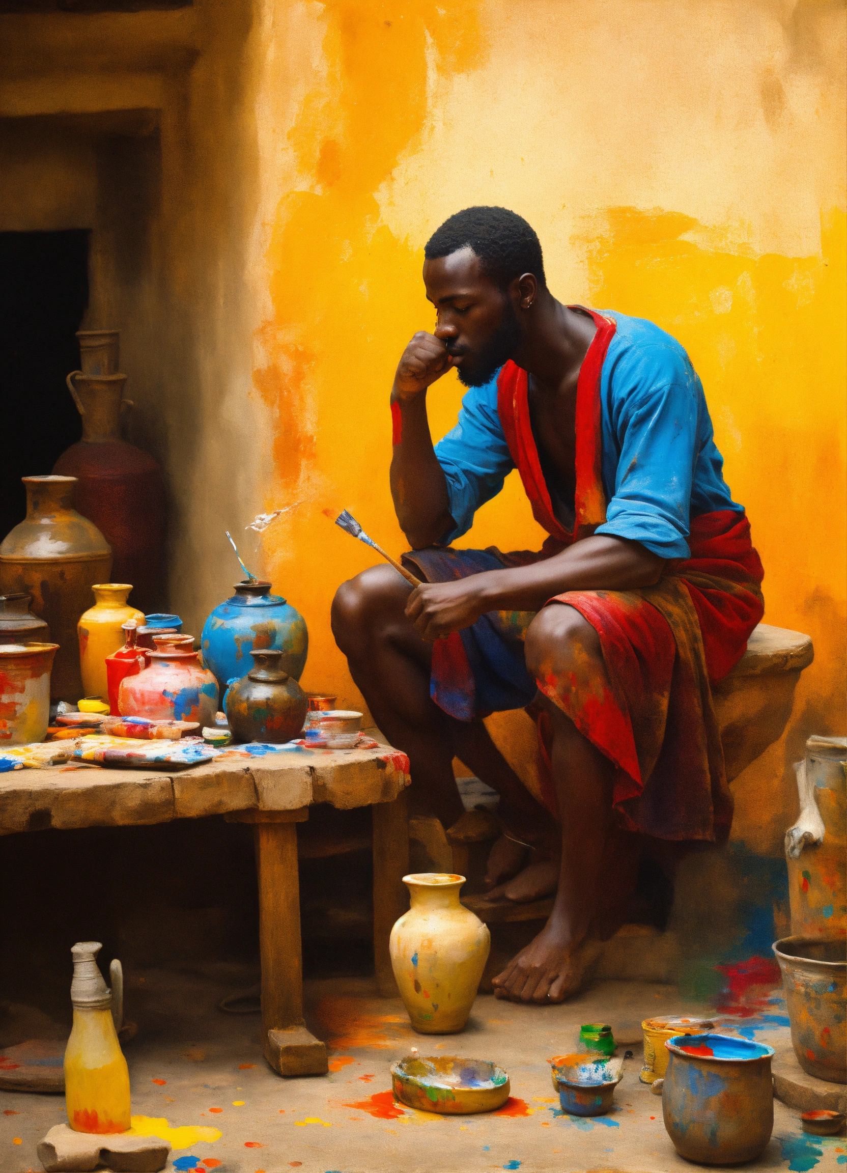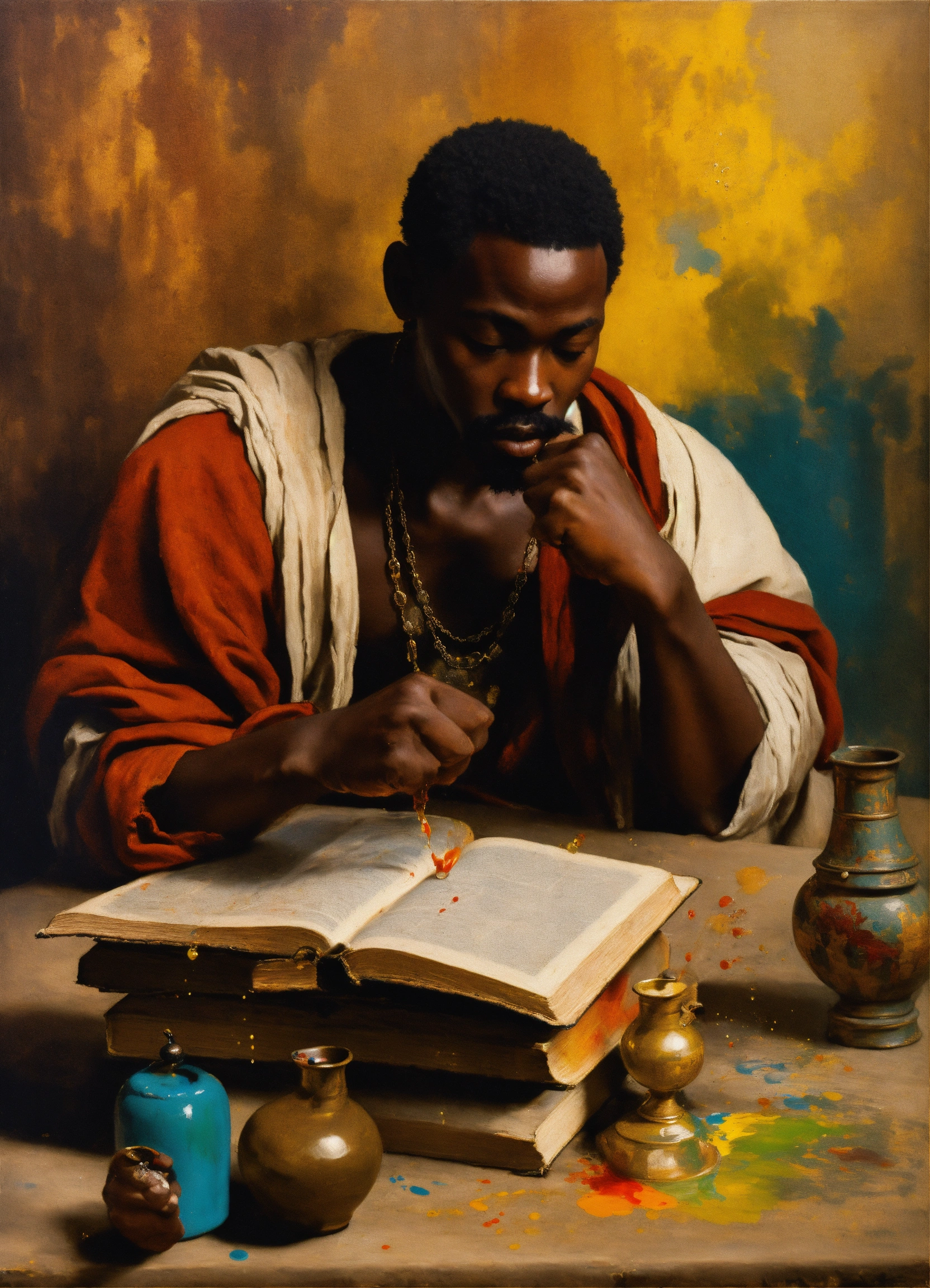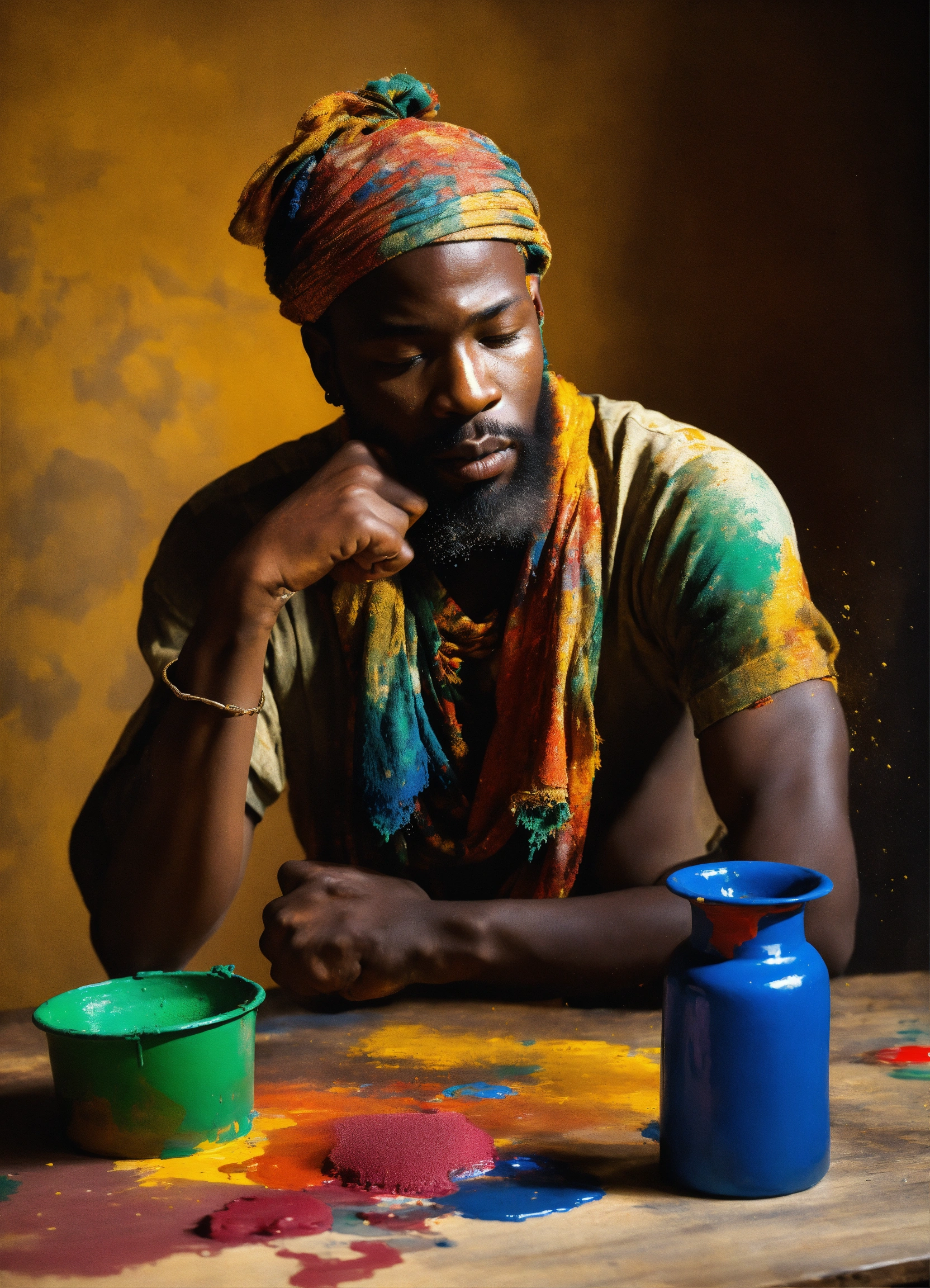 Potrait of a african village setting;the thinker, a male african artist, banging his fist on a table covered with paint, his face is splashed with several colors, very realistic, painted in the manner of leonardo da vinci, after the style of caravaggio light obscure, baroque with african motif, presence of paint pot, paint, and artist's effect, study books, kerosene lamp, baroque ornament