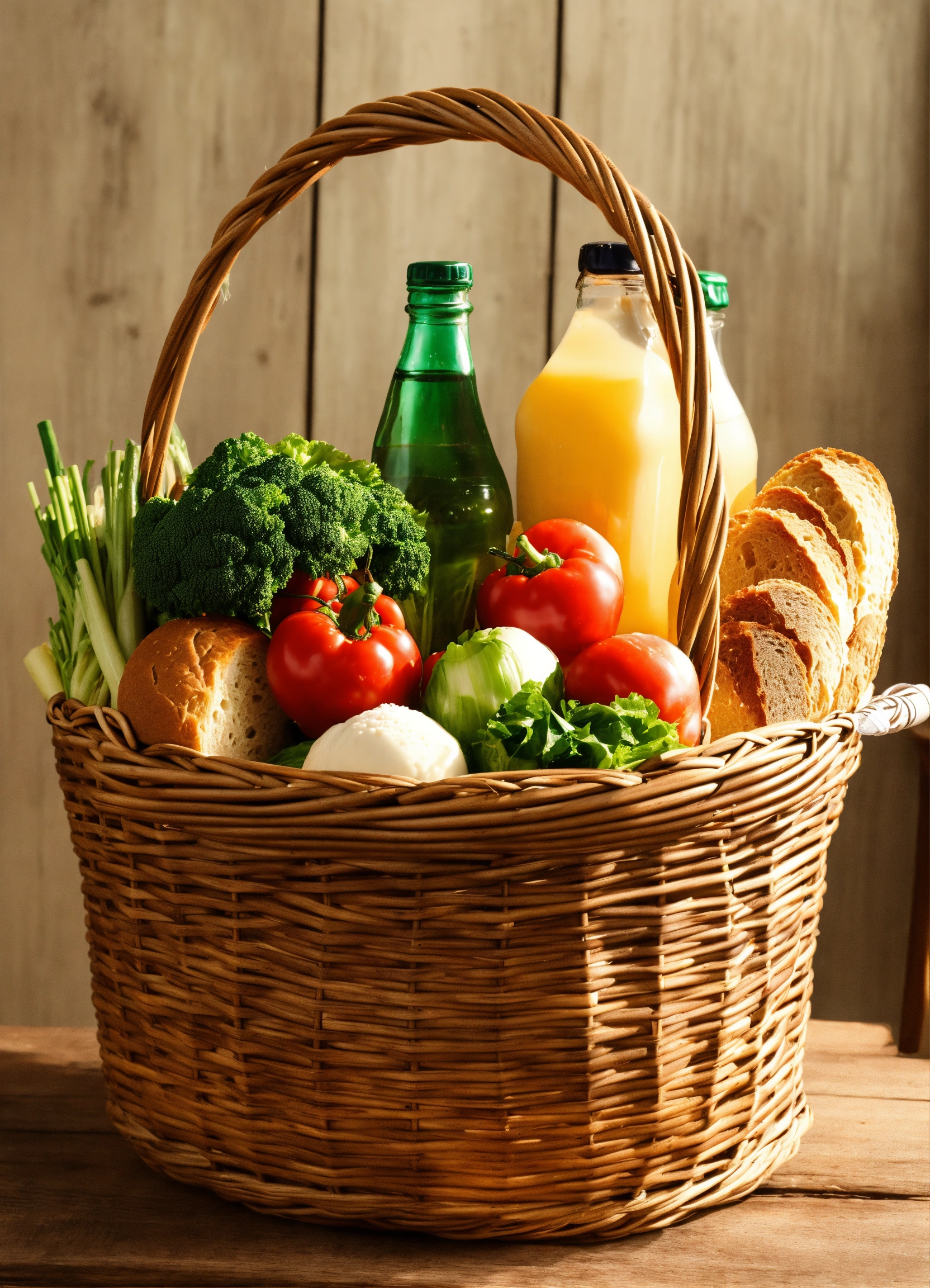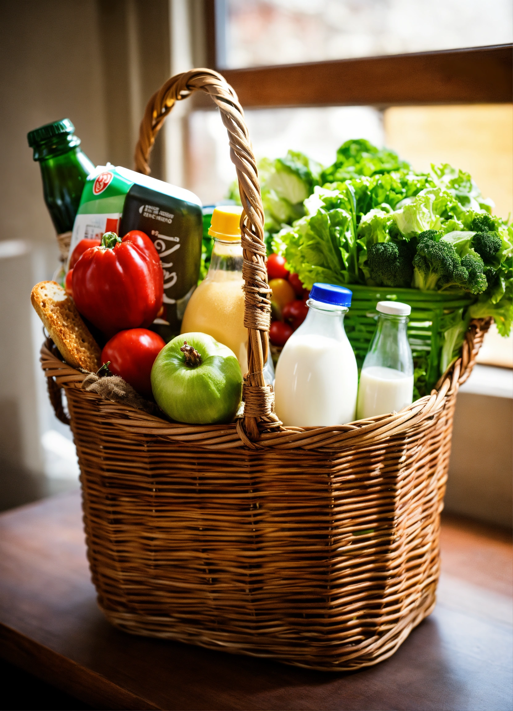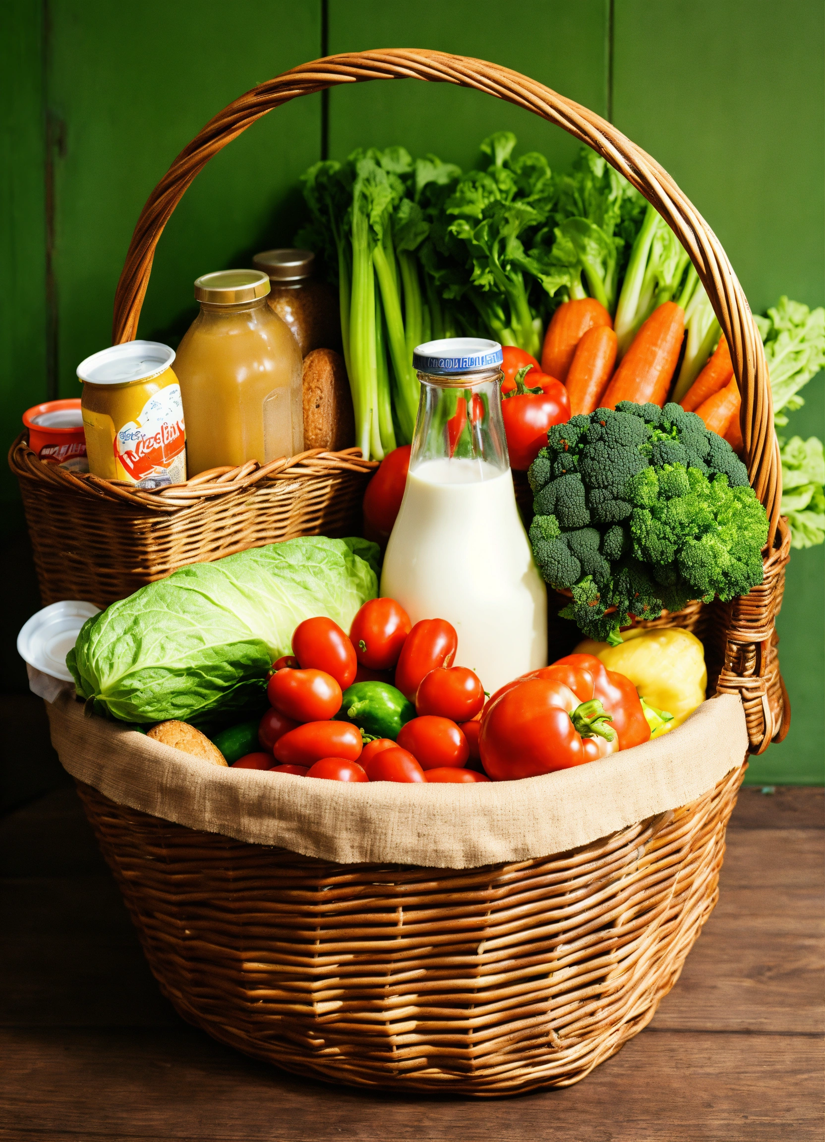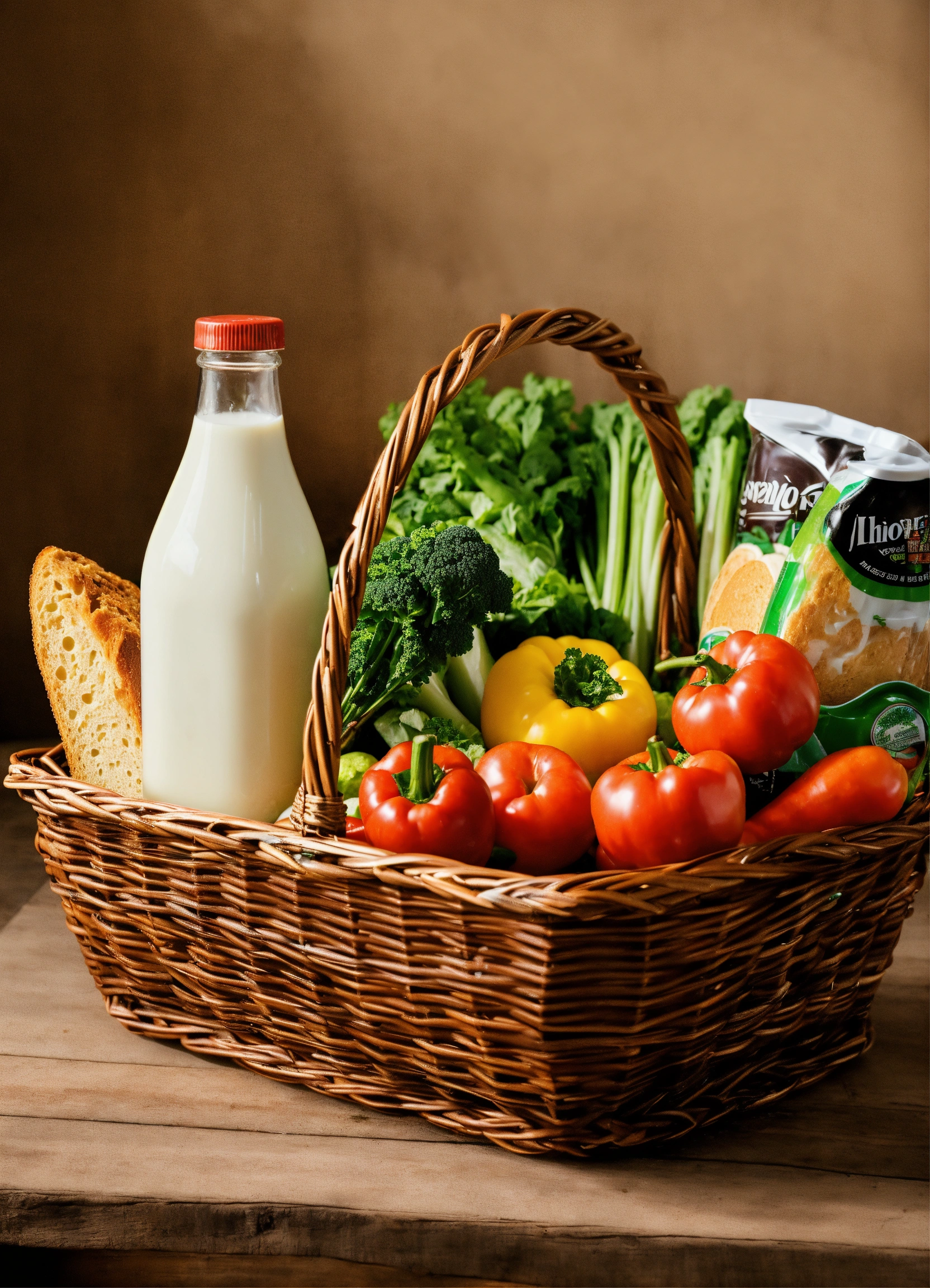 Groceries, assorted milk bottle, bread packed, soft drink, and some assorted vegetables basket. handle required to carry the basket. nothing outside of the basket