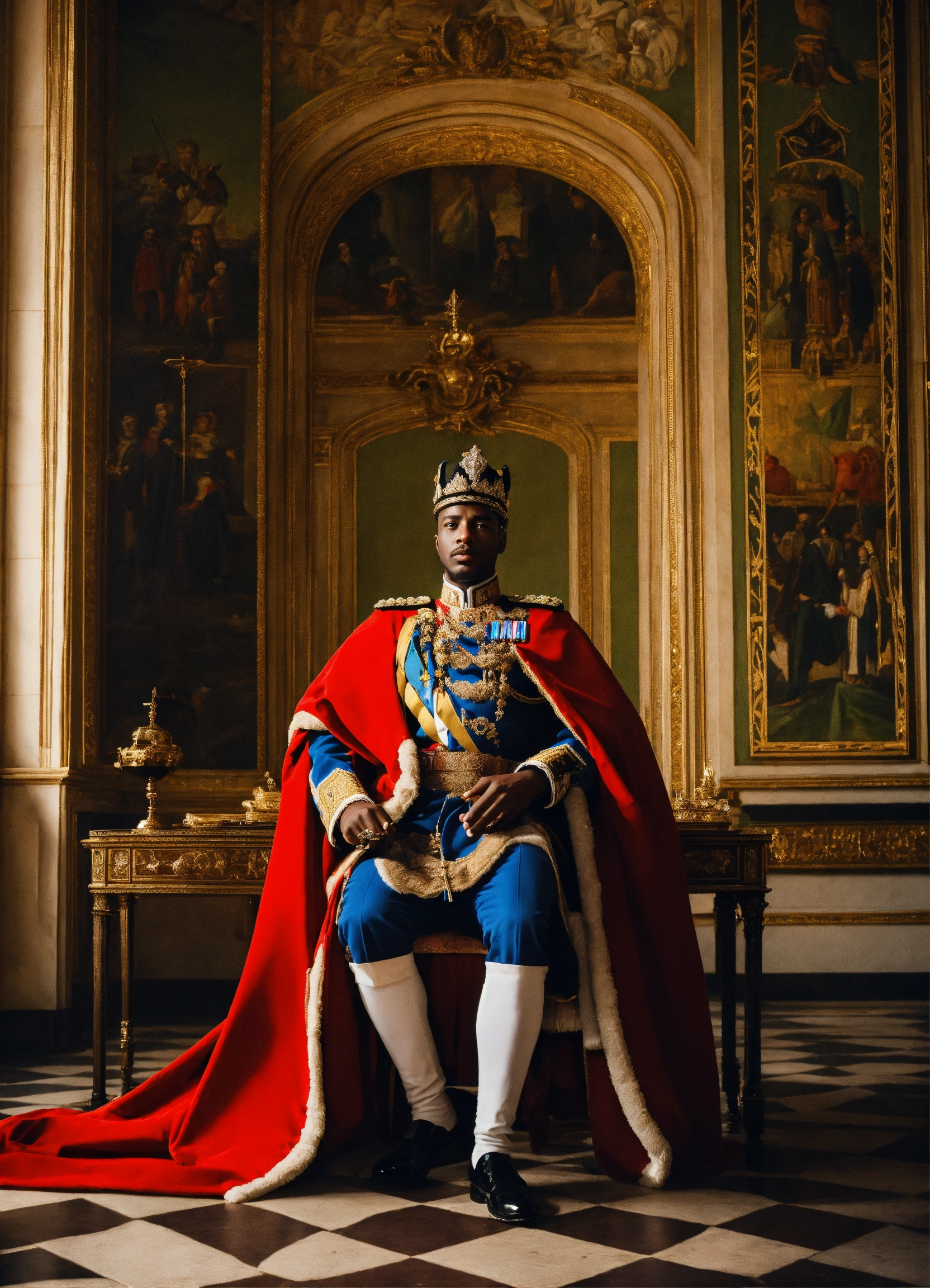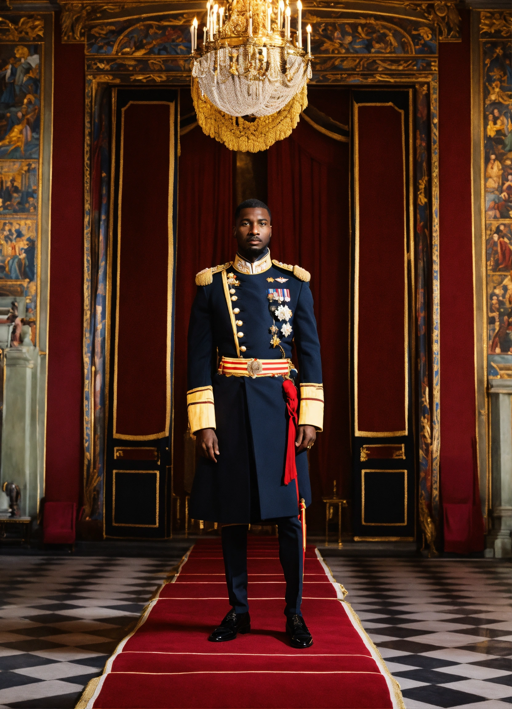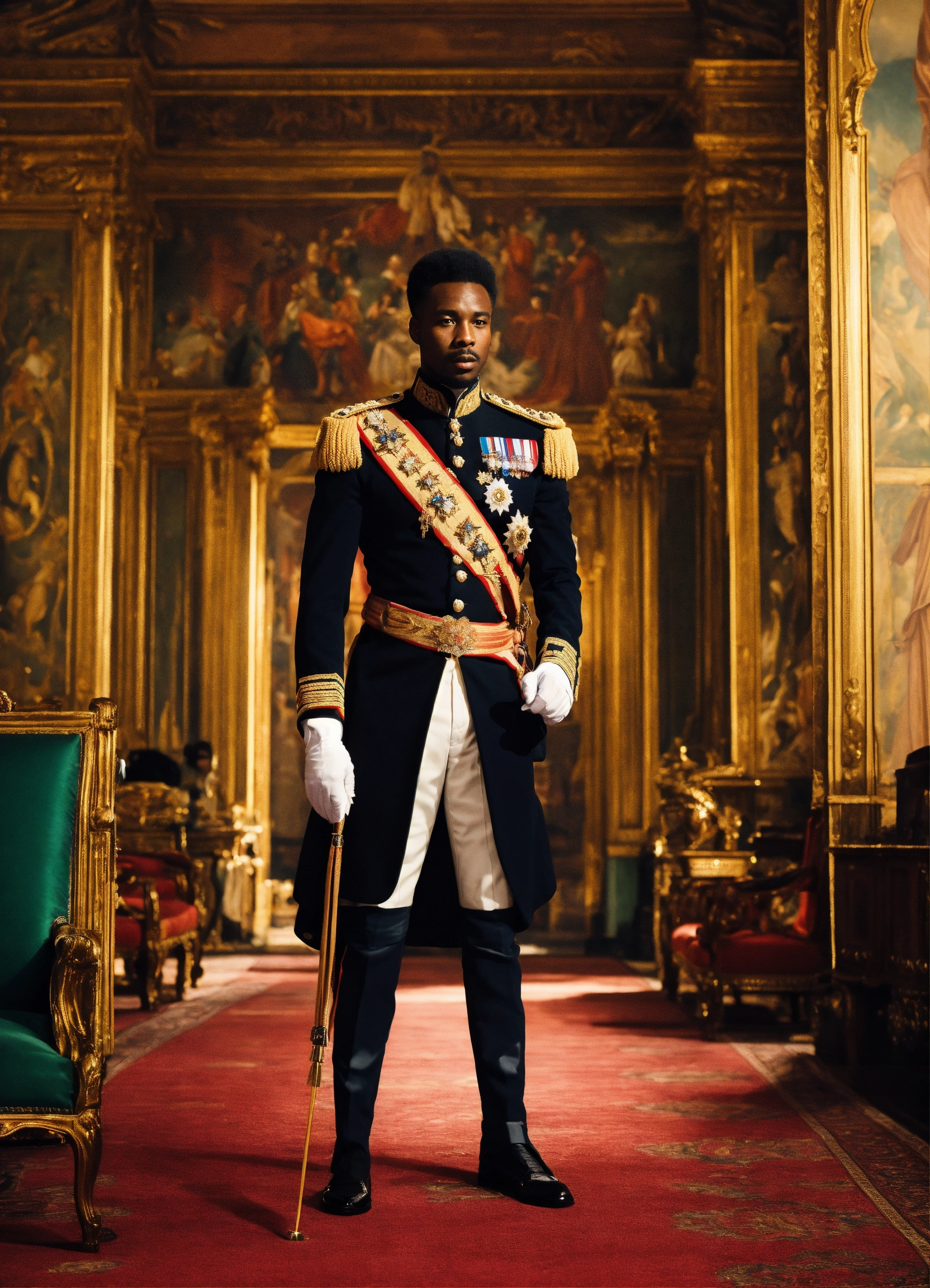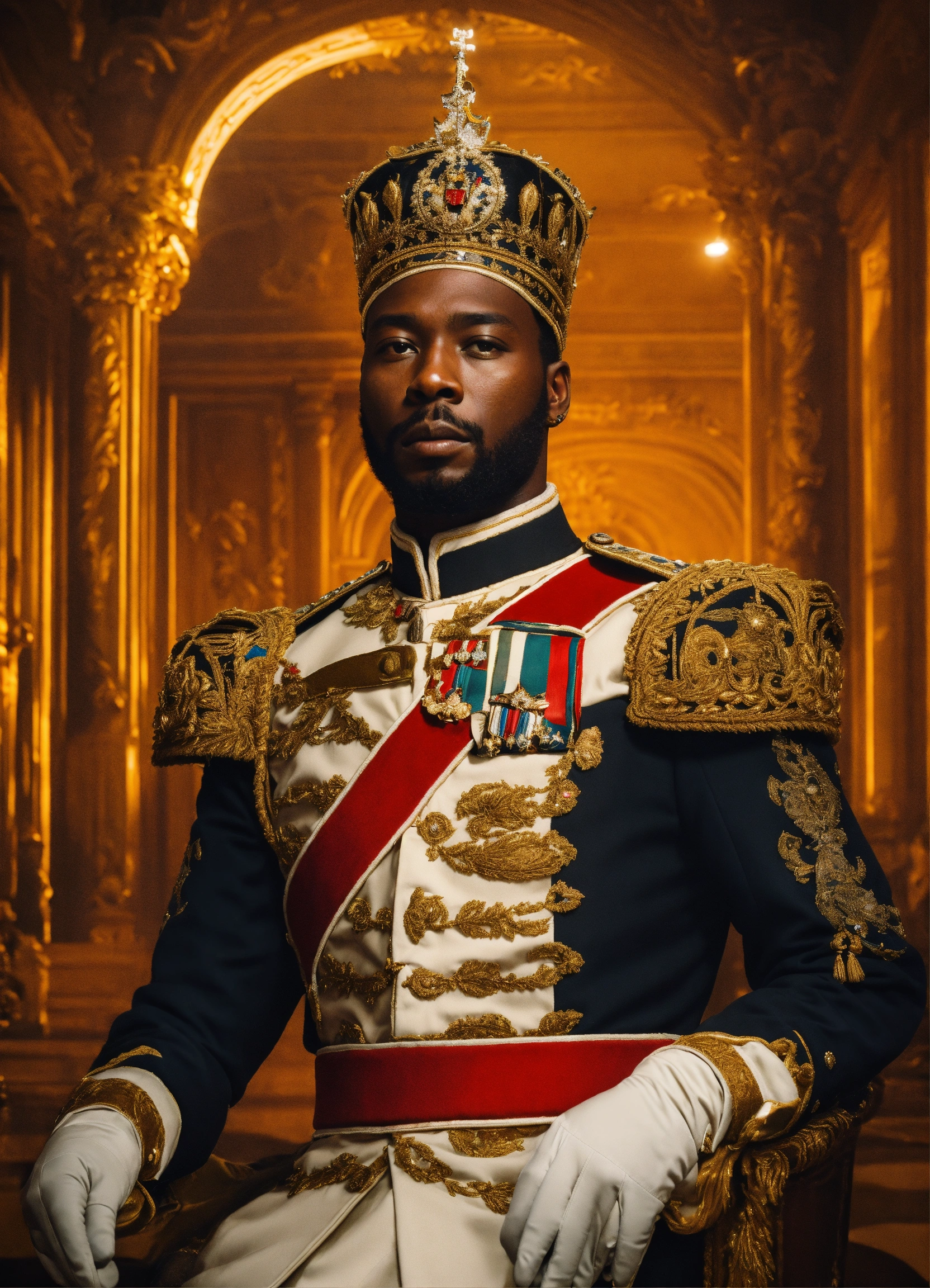 A black king in a royal palace with military uniform