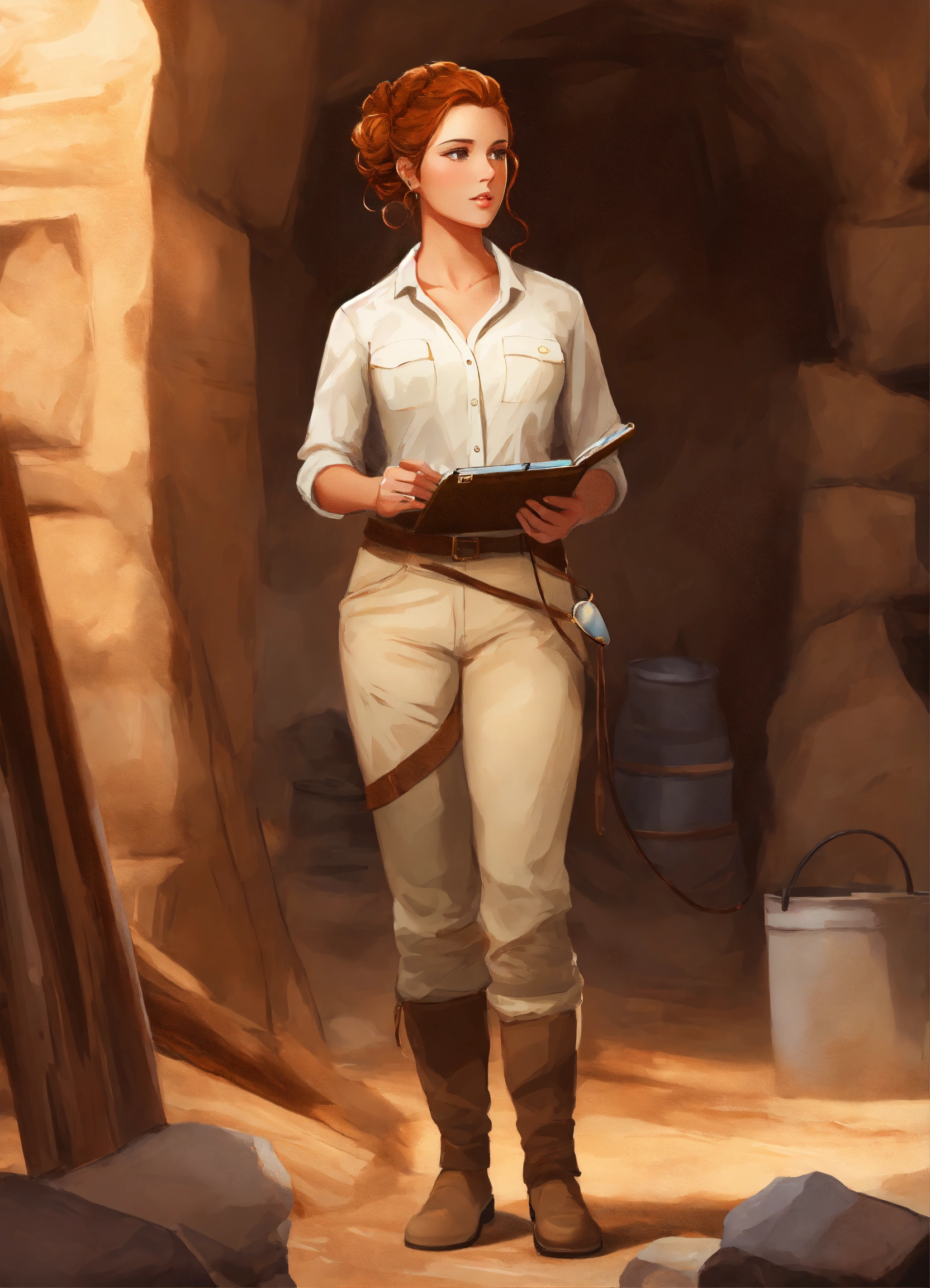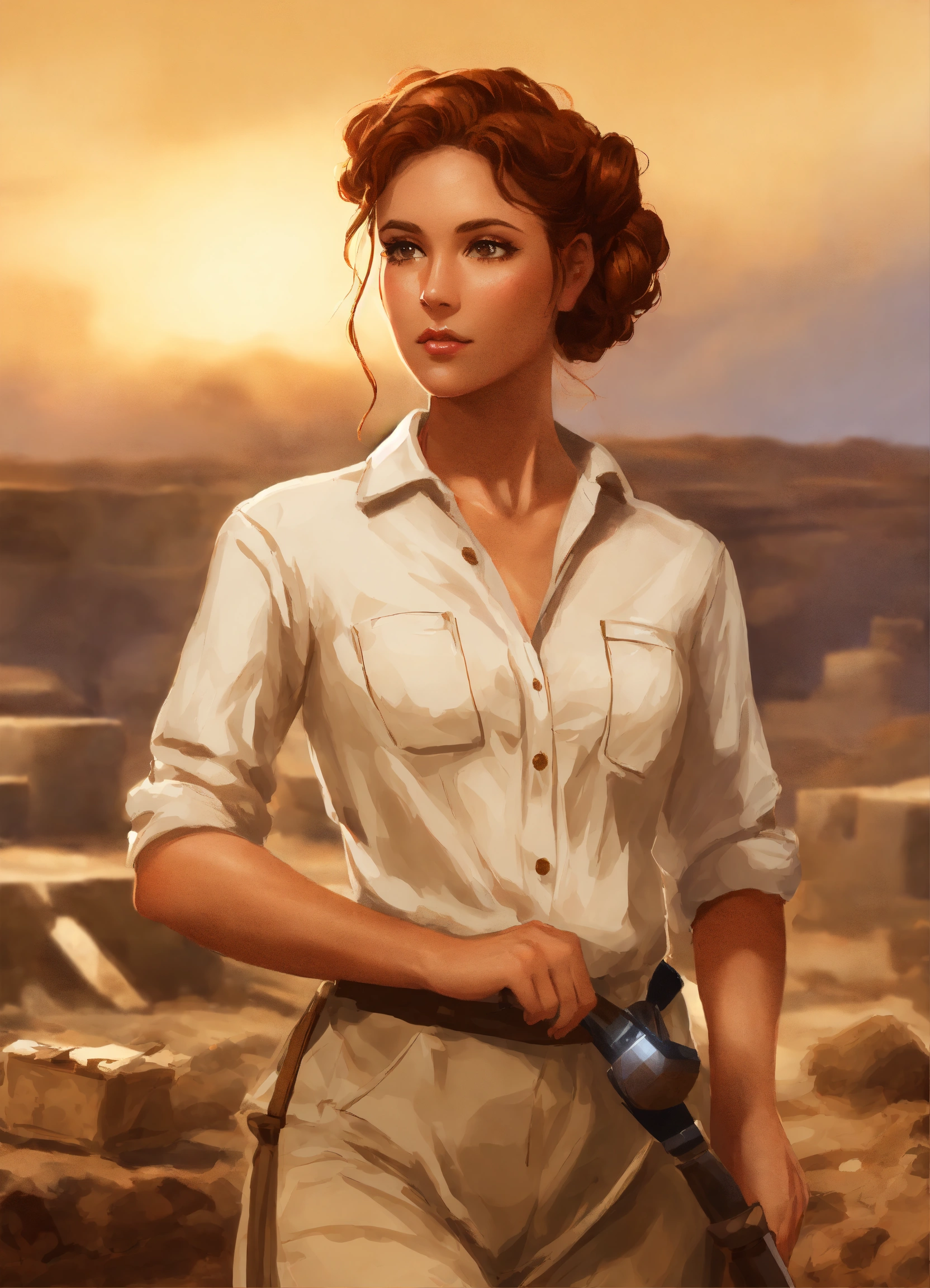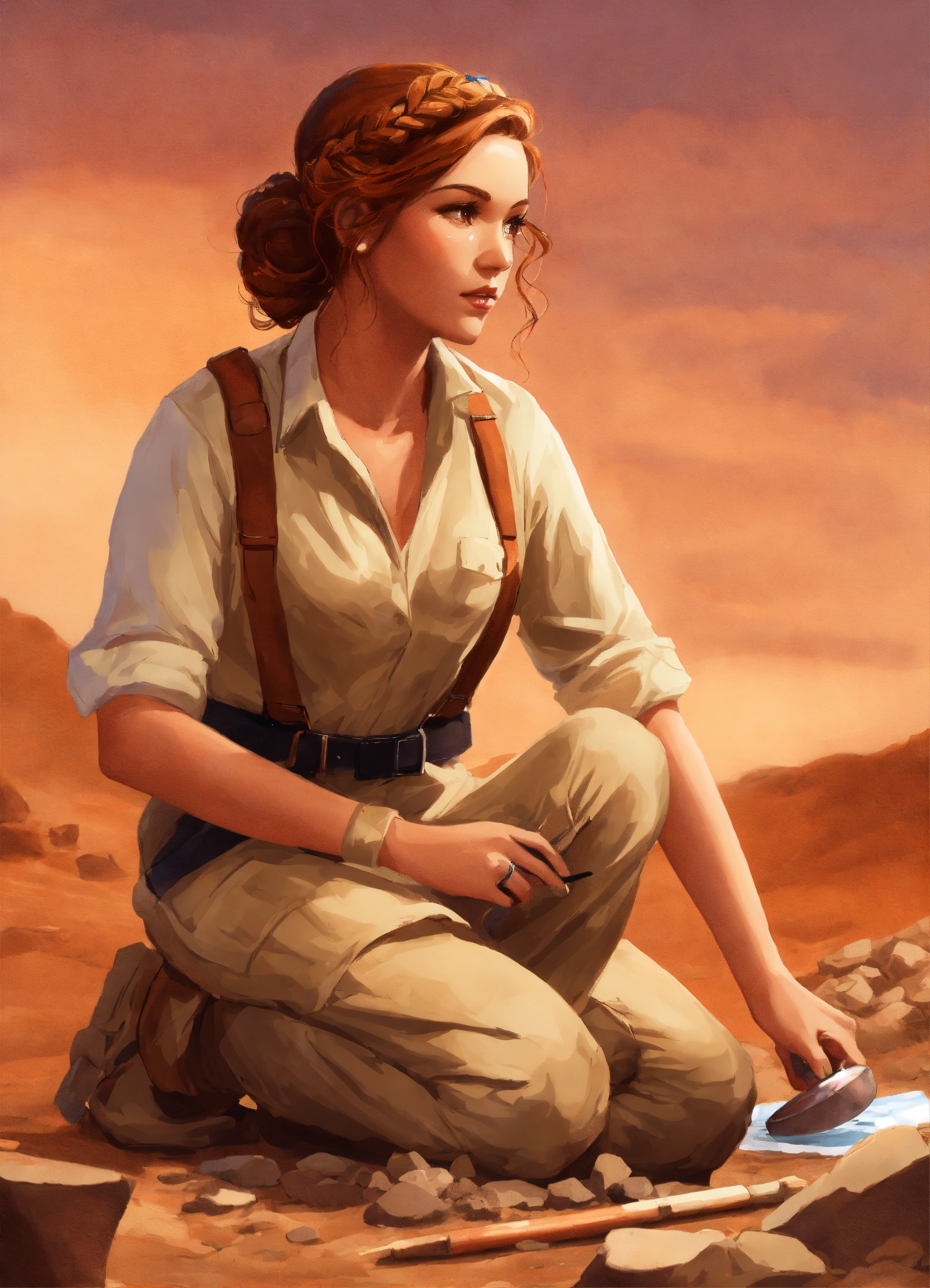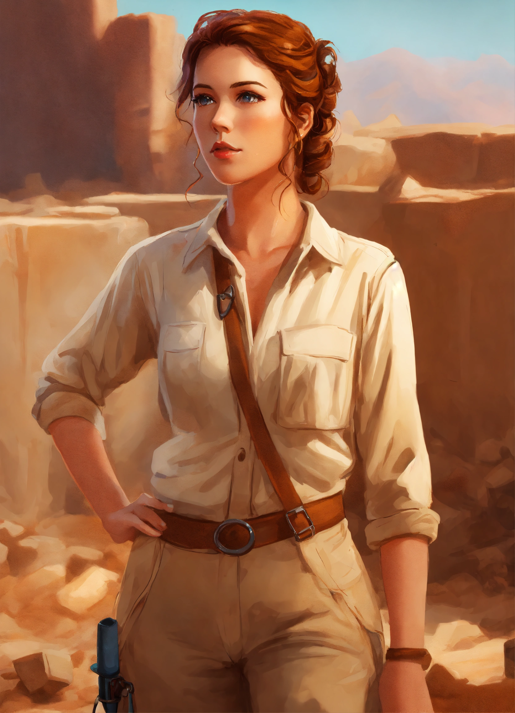 Digital art painting of a beautiful archaeologist woman with ringlet copper hair in an updo, wearing a cream blouse and tan pants. she is working at an archaeological dig site.