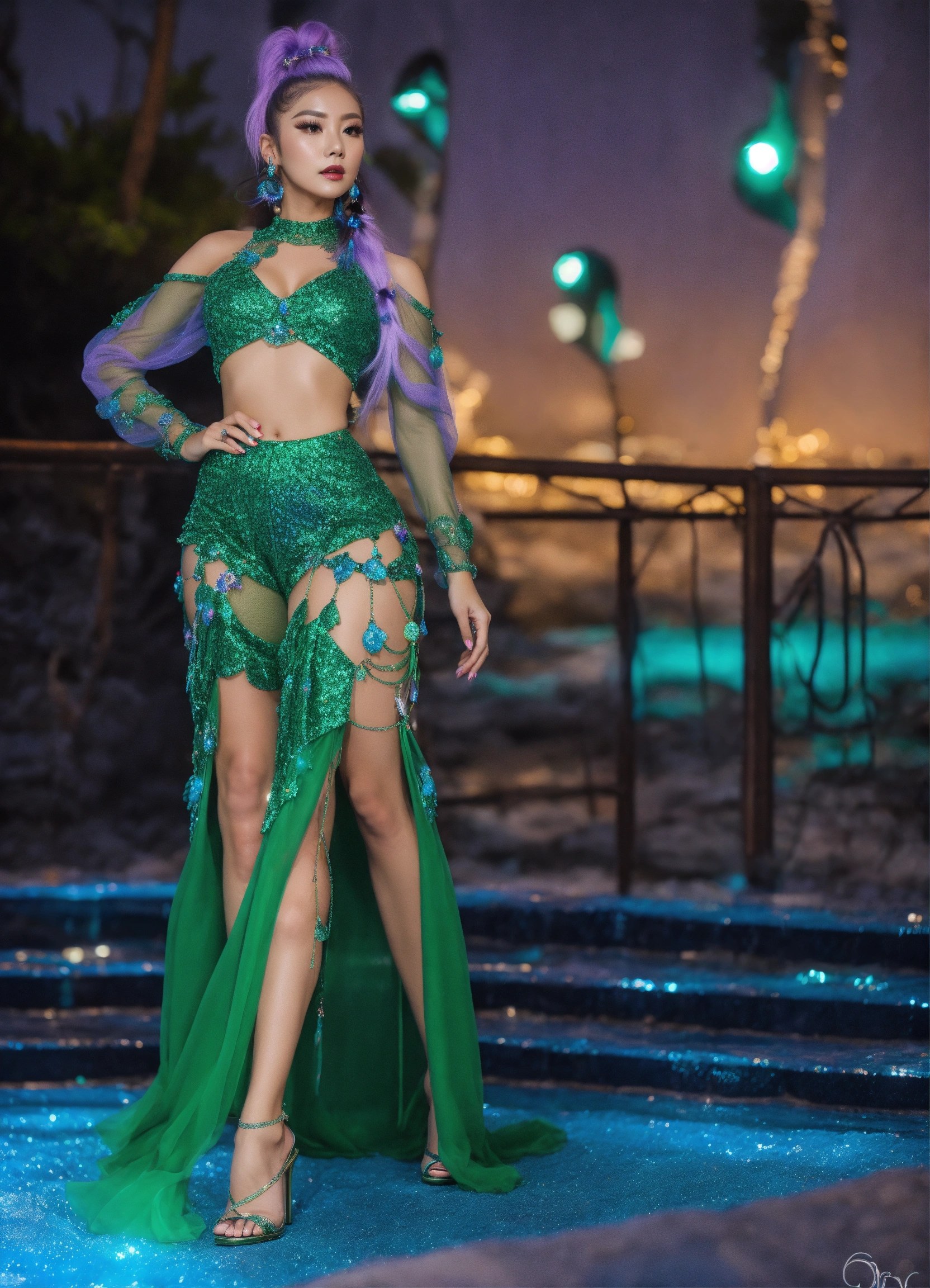 Dreamcatcher jiu glamorous sparkly mesh olive green, blue grotto, mint, and violet full outfit with high heels with ponytail