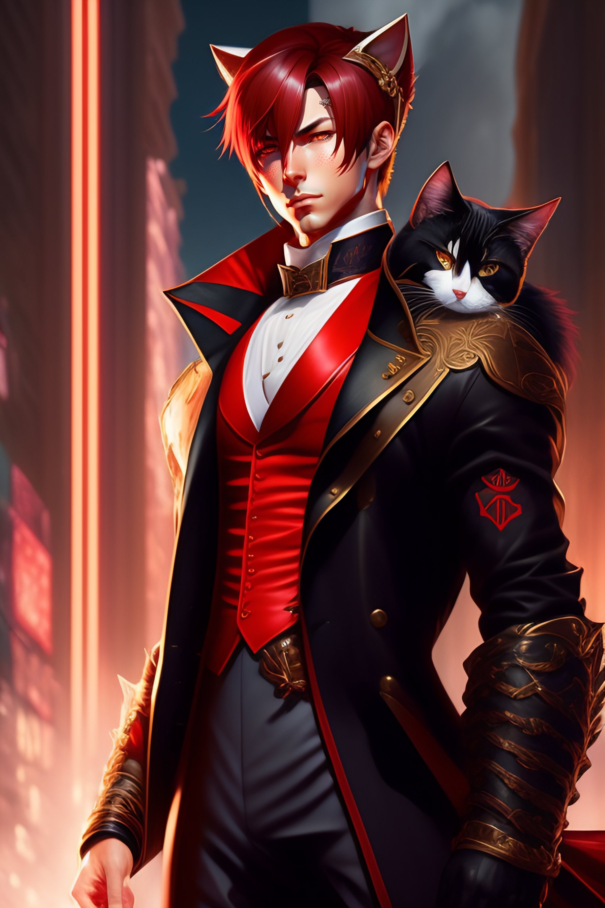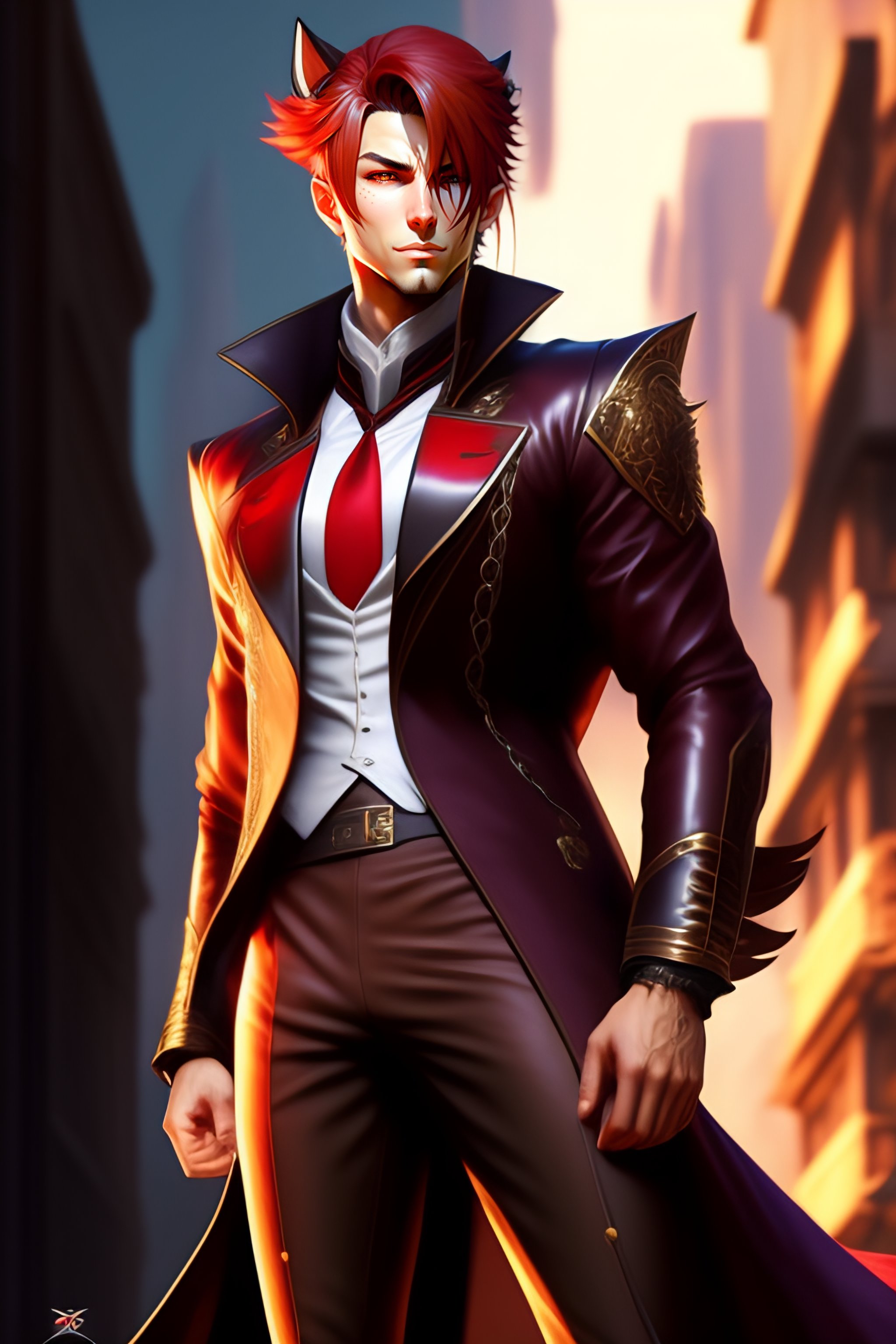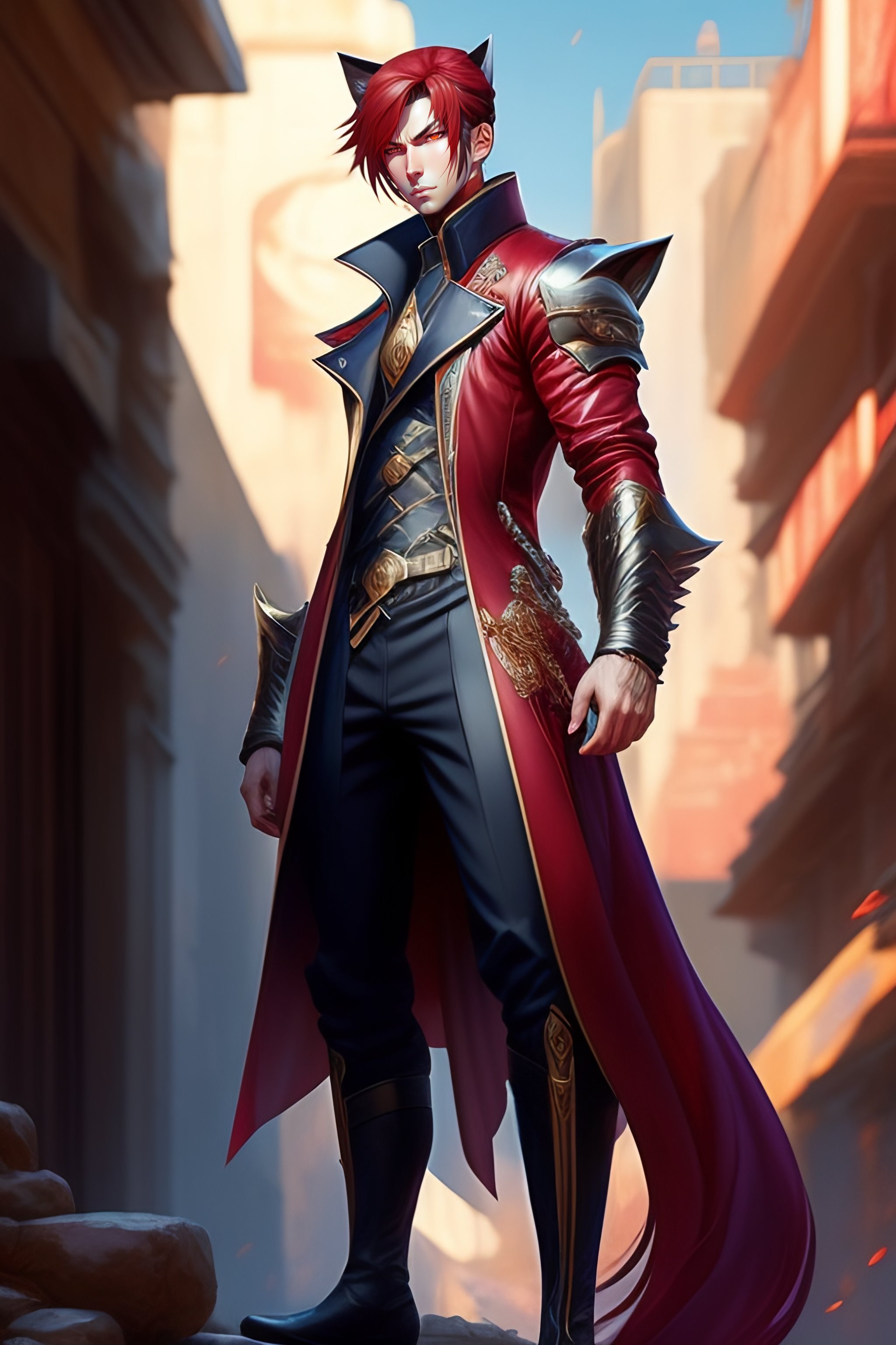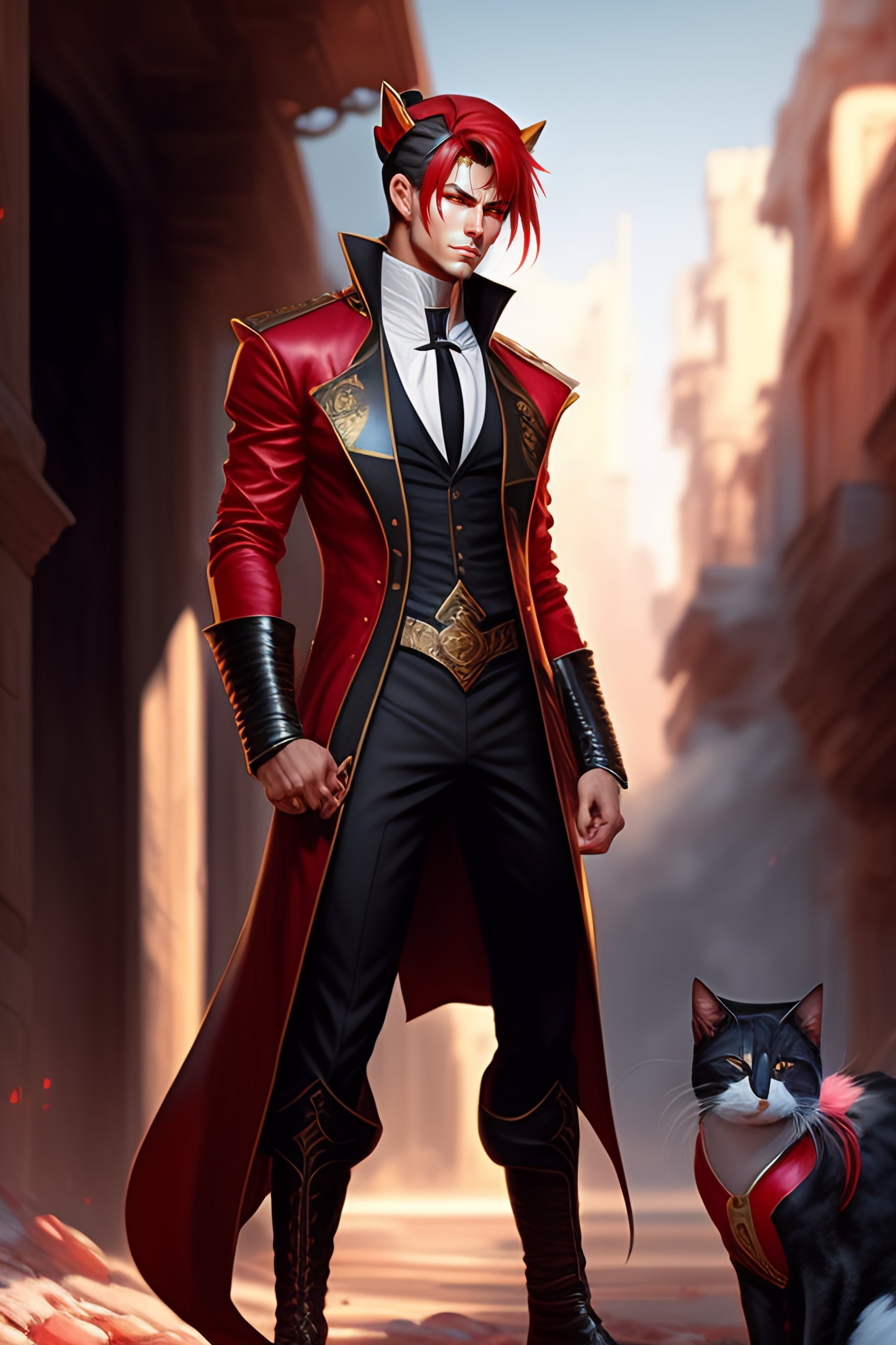 Harmony of red abandoned city, cute handsome iori yagami with cat ears & tail wearing jacket & pants, amazing composition & dynamic posing, by franz xavier leyendecker, wlop! muted colors, highly detailed, fantasy art by craig mullins, vice cfg _ scale 9