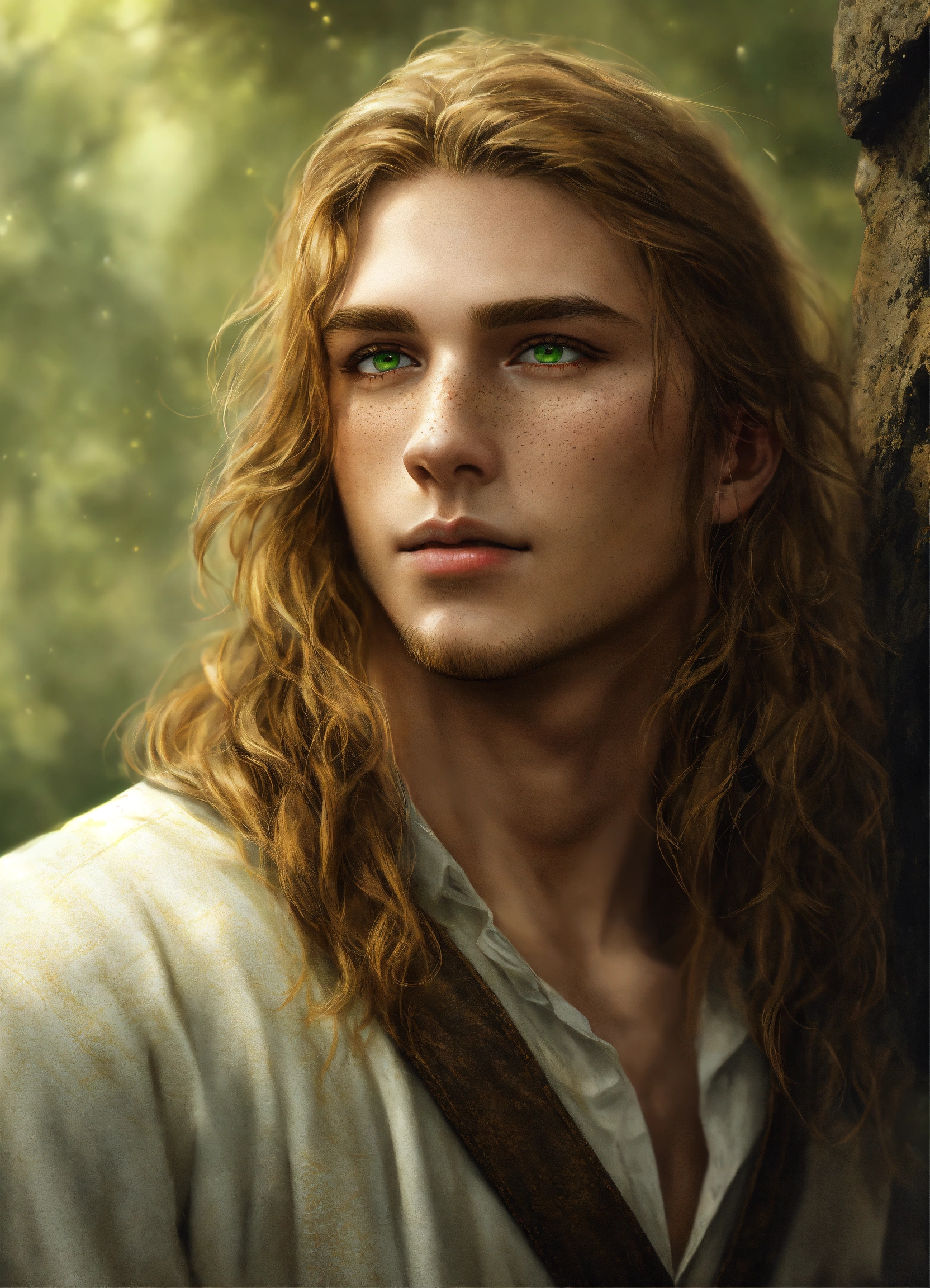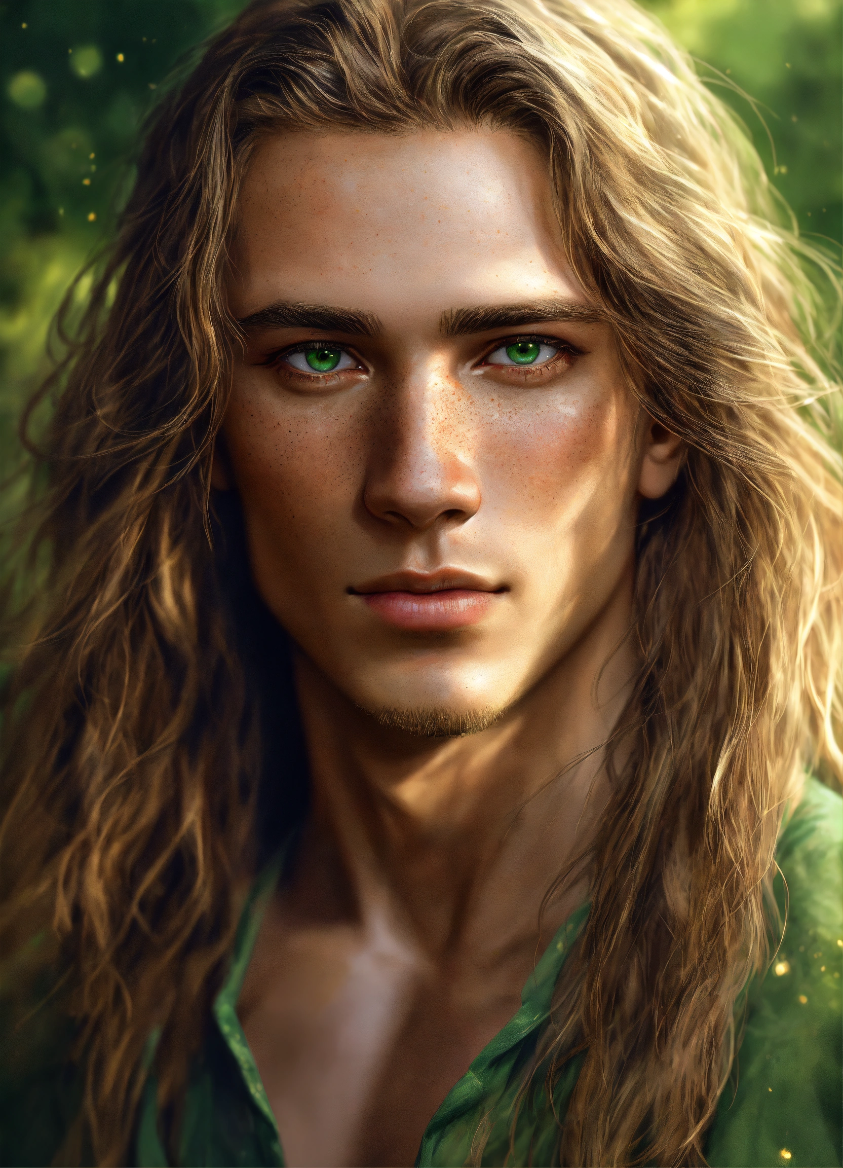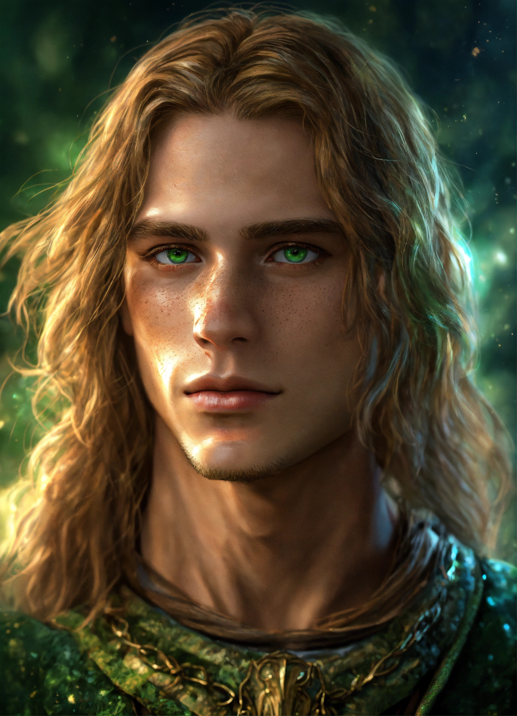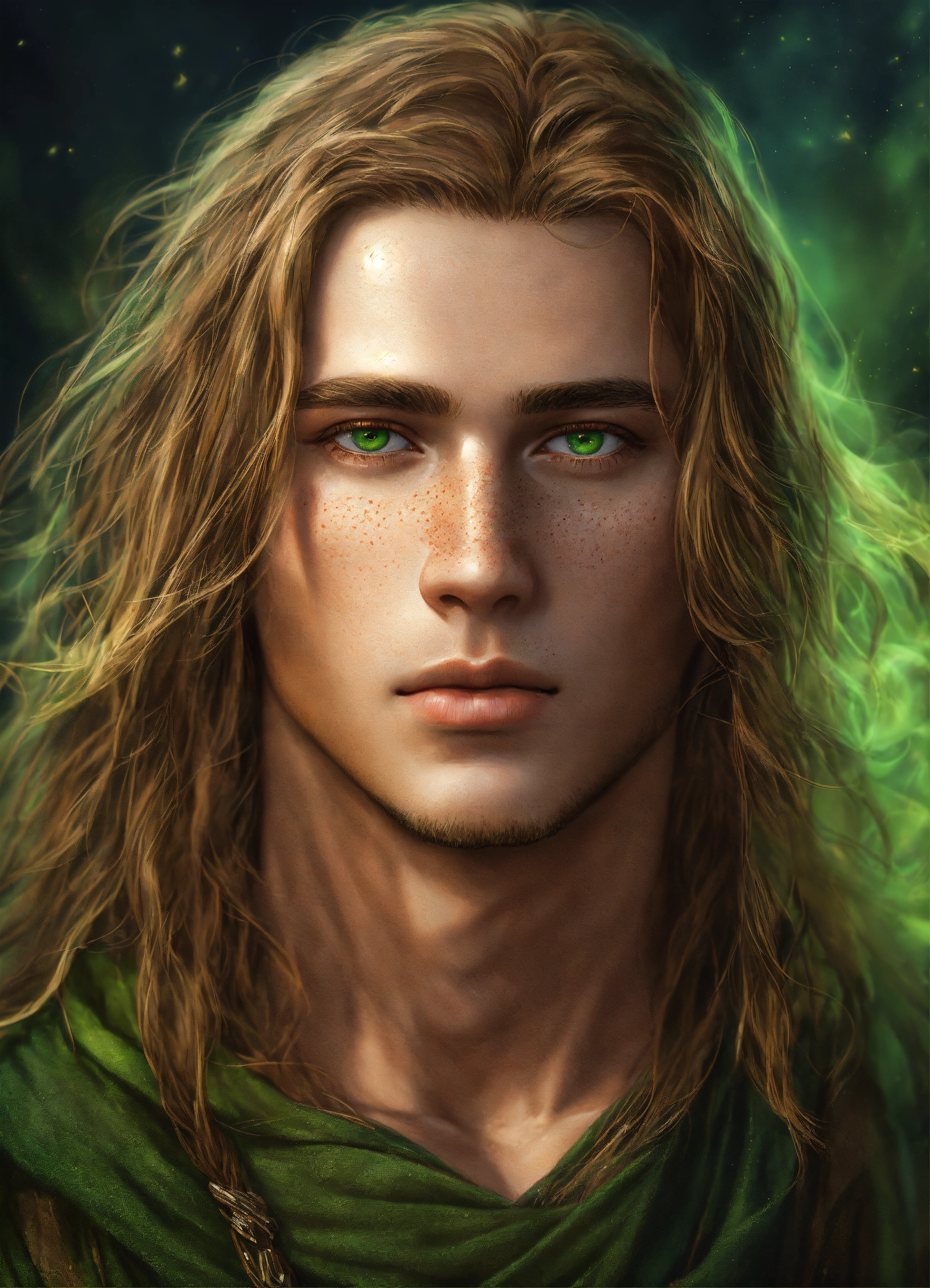 25-year-young man with long dark blond hair and green eyes, white skin and freckles, realistic digital art, fantasy