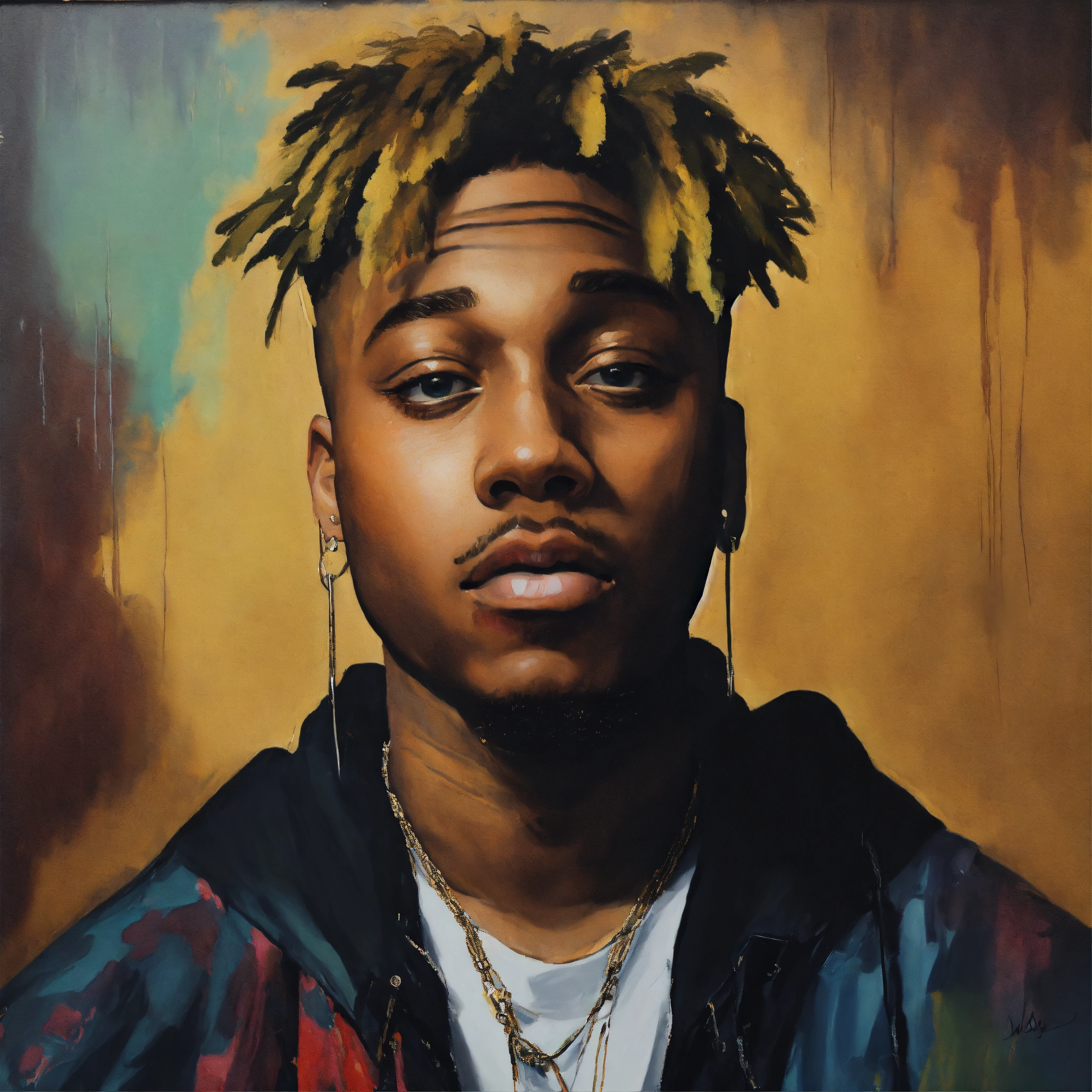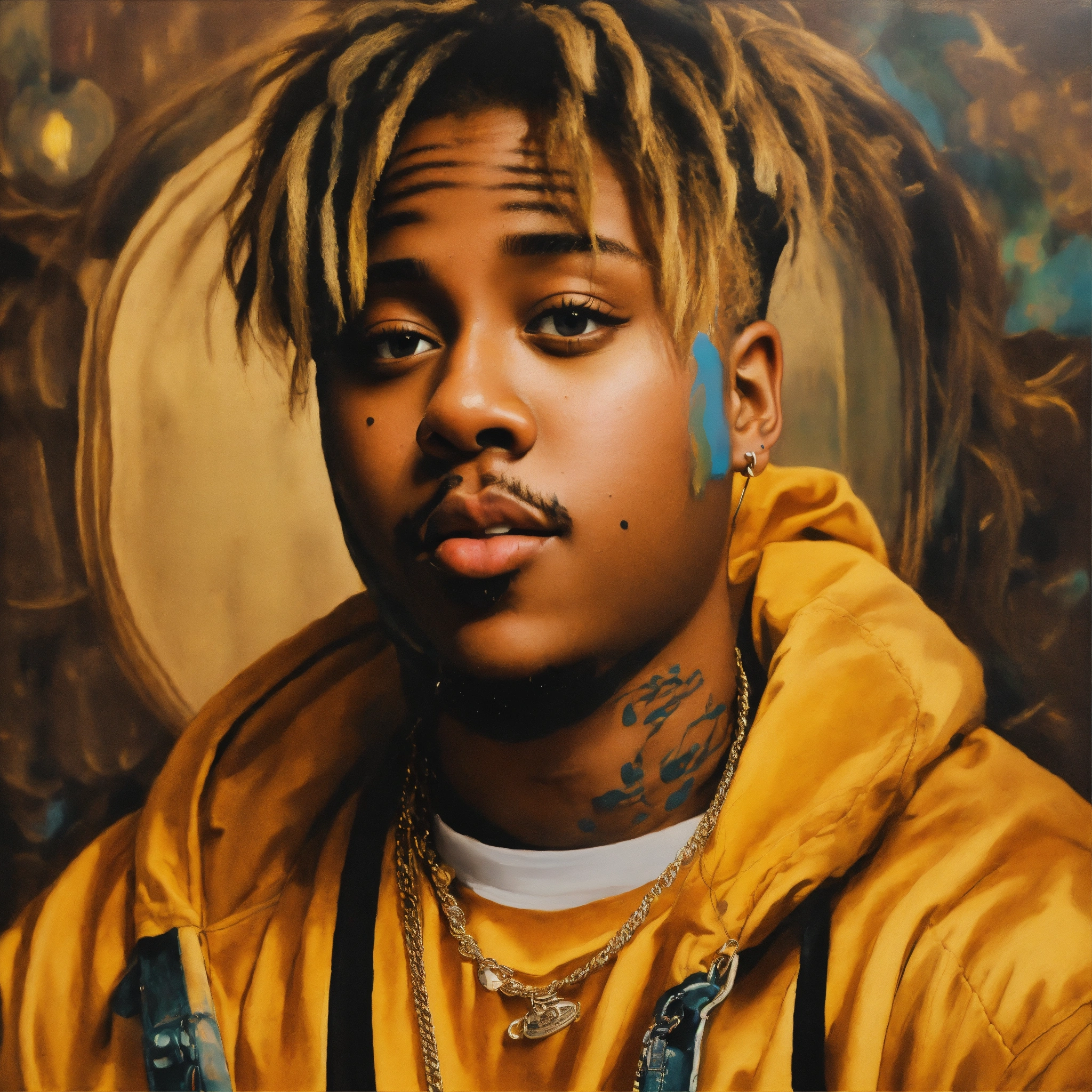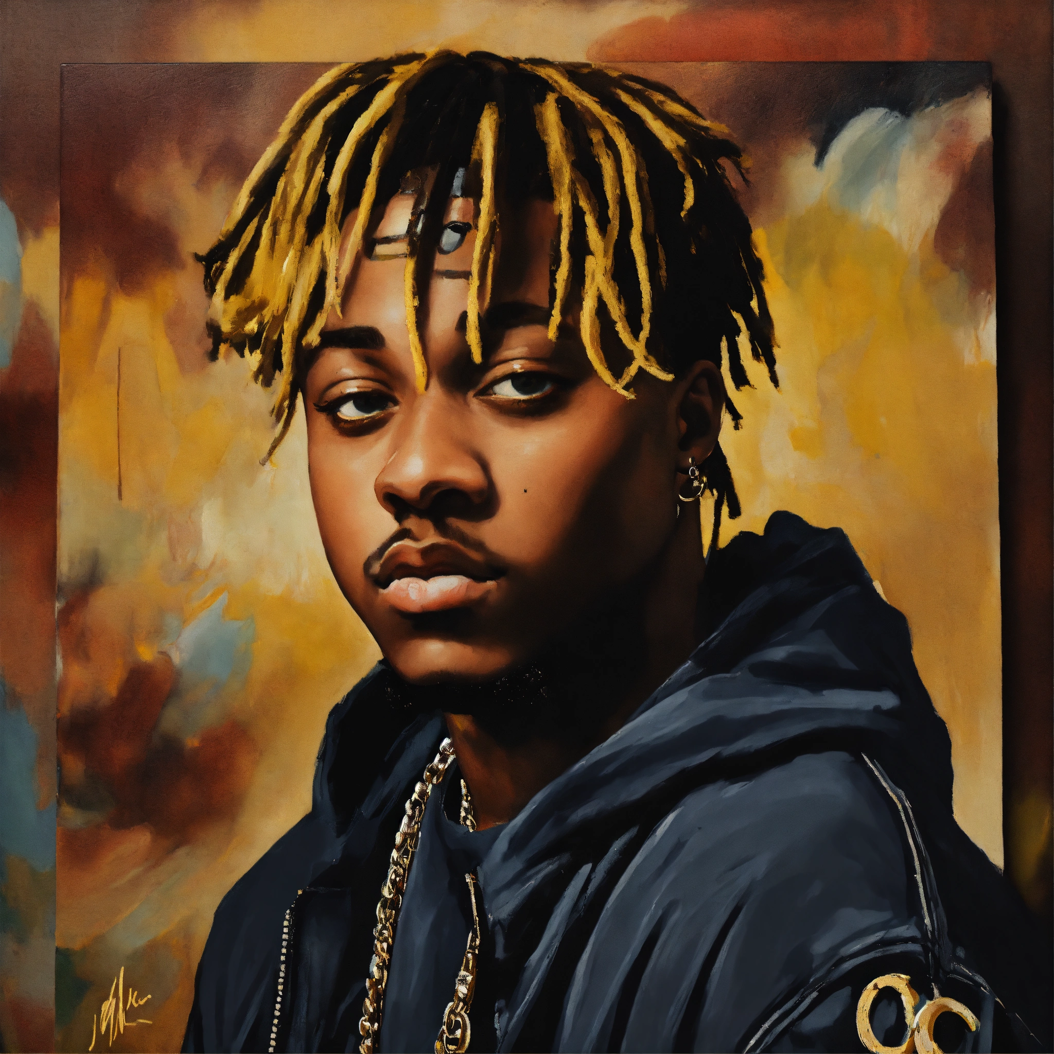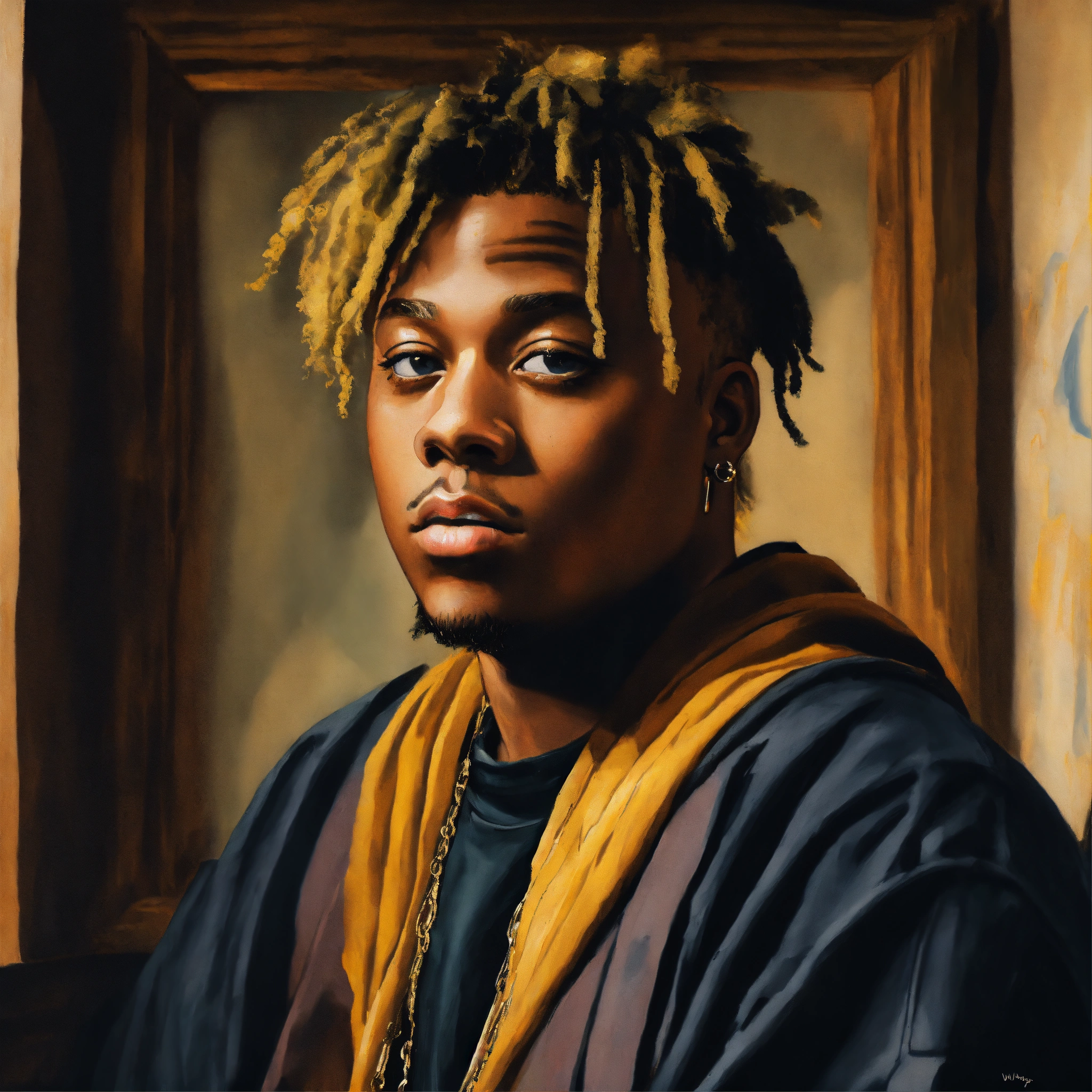 A portrait of juice wrld in the style of leonardo da vinci, with a similar vibe to the mona lisa. juice wrld should be seated in a chair, with a slightly enigmatic smile. the painting should be set in a dark, atmospheric room with a single window letting in a shaft of light. the overall tone of the painting should be moody and introspective. additional instructions use high-quality brushstrokes and a smooth, blended finish. pay close attention to the details of juice wrld's face, including his facial features, hair, and skin texture. use a limited palette of colors, with an emphasis on earthy tones. create a sense of depth and dimension in the painting.
