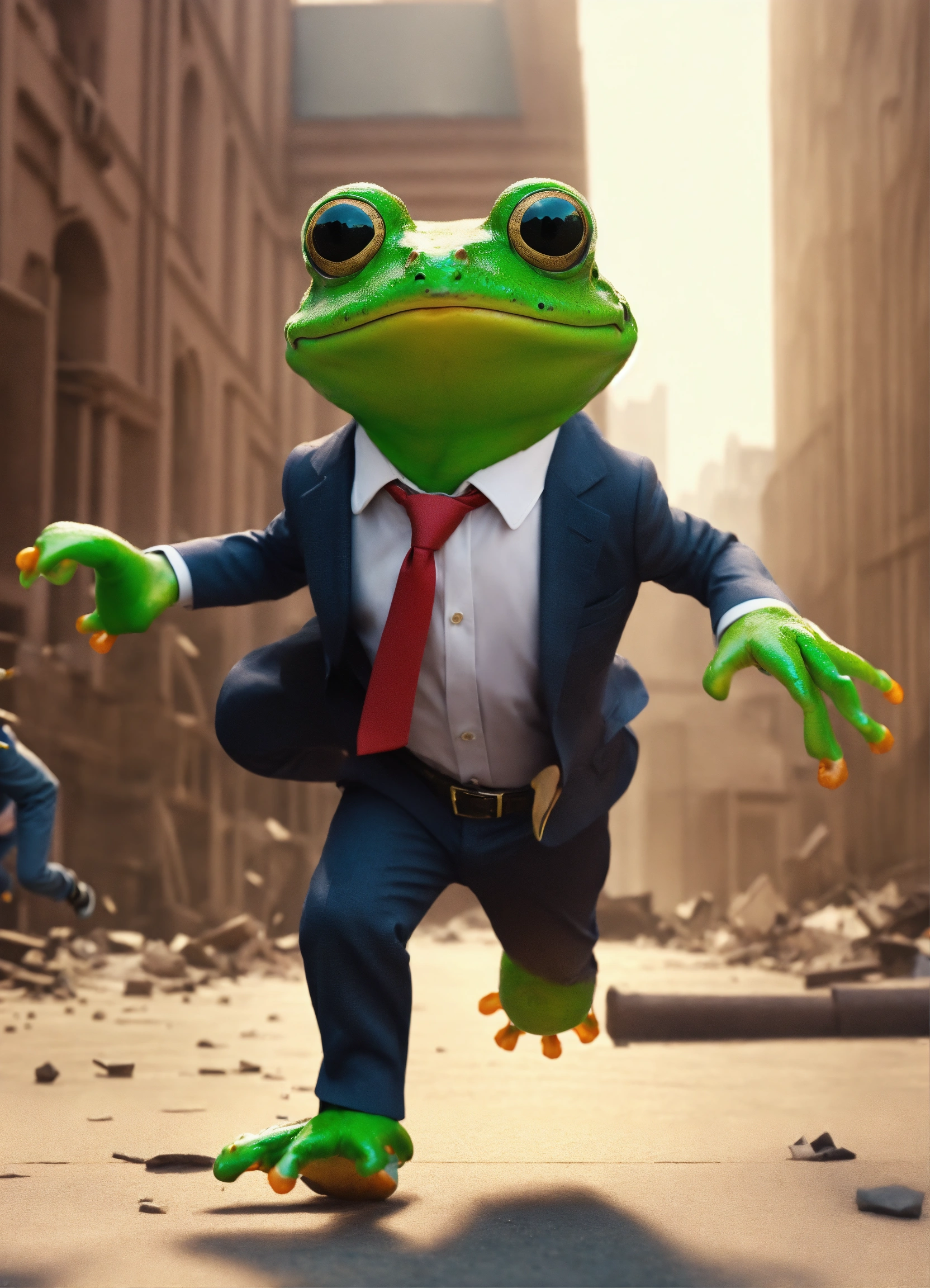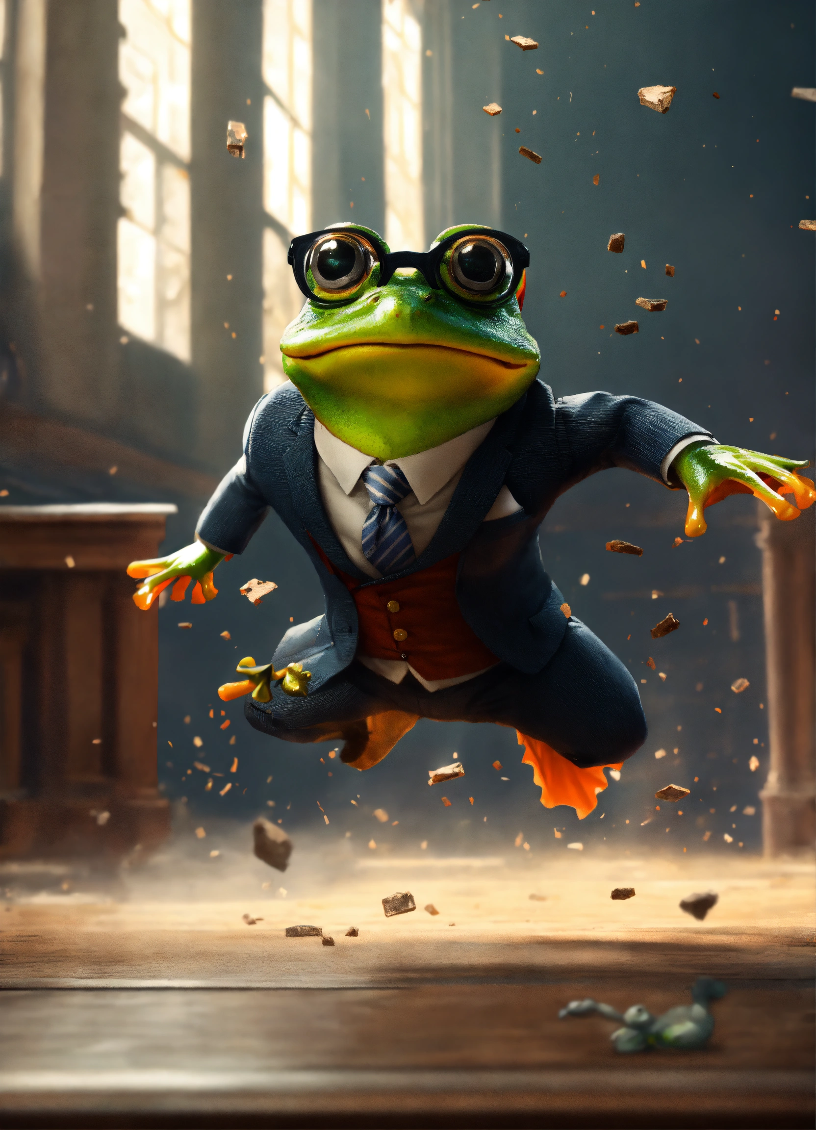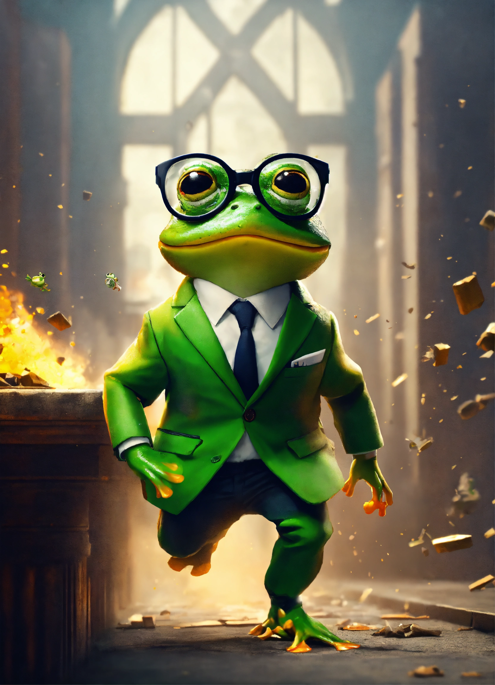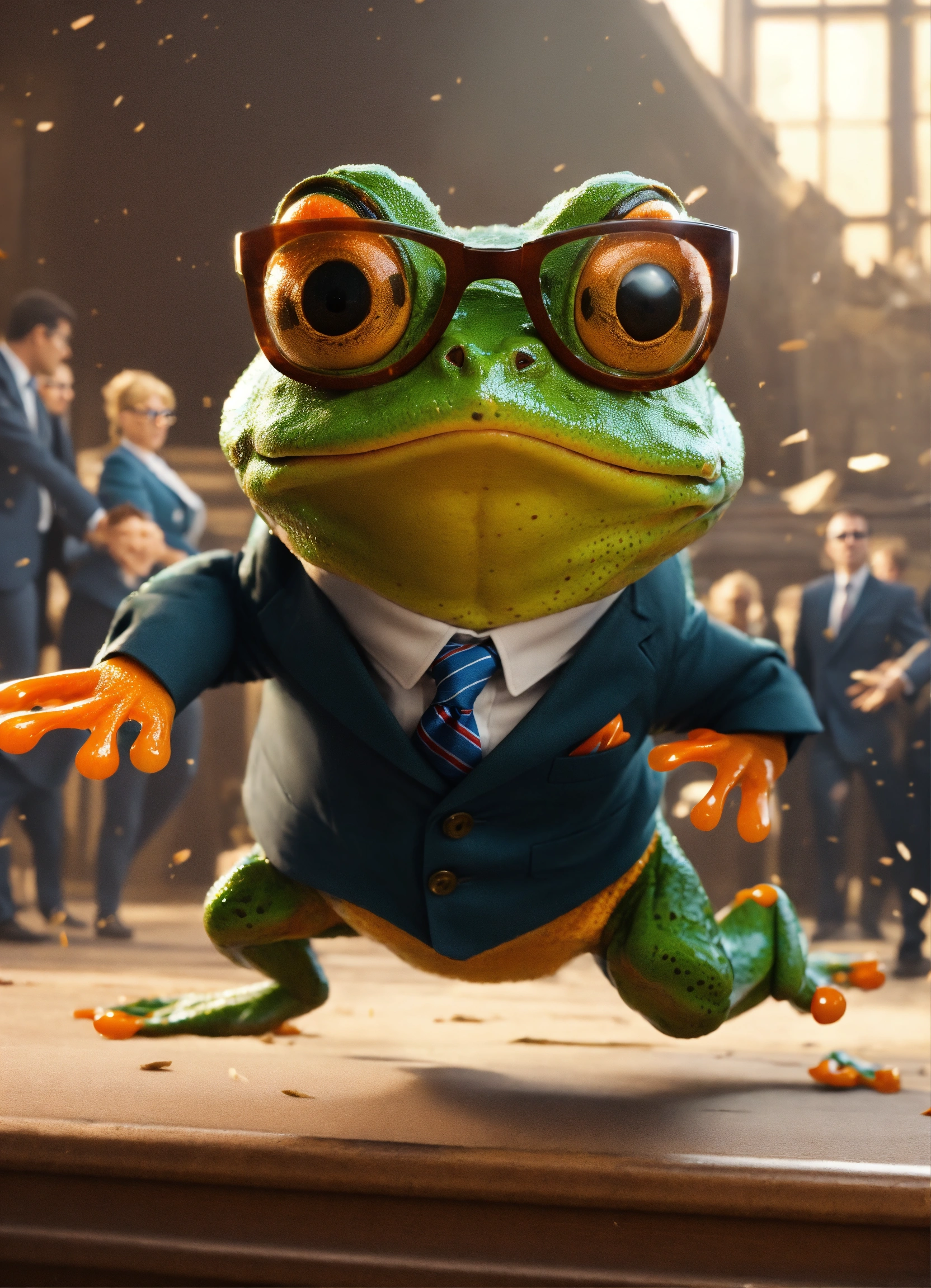 Cute frog in suit and glasses running from judge in crown court cinematic environment while building is falling crushing down