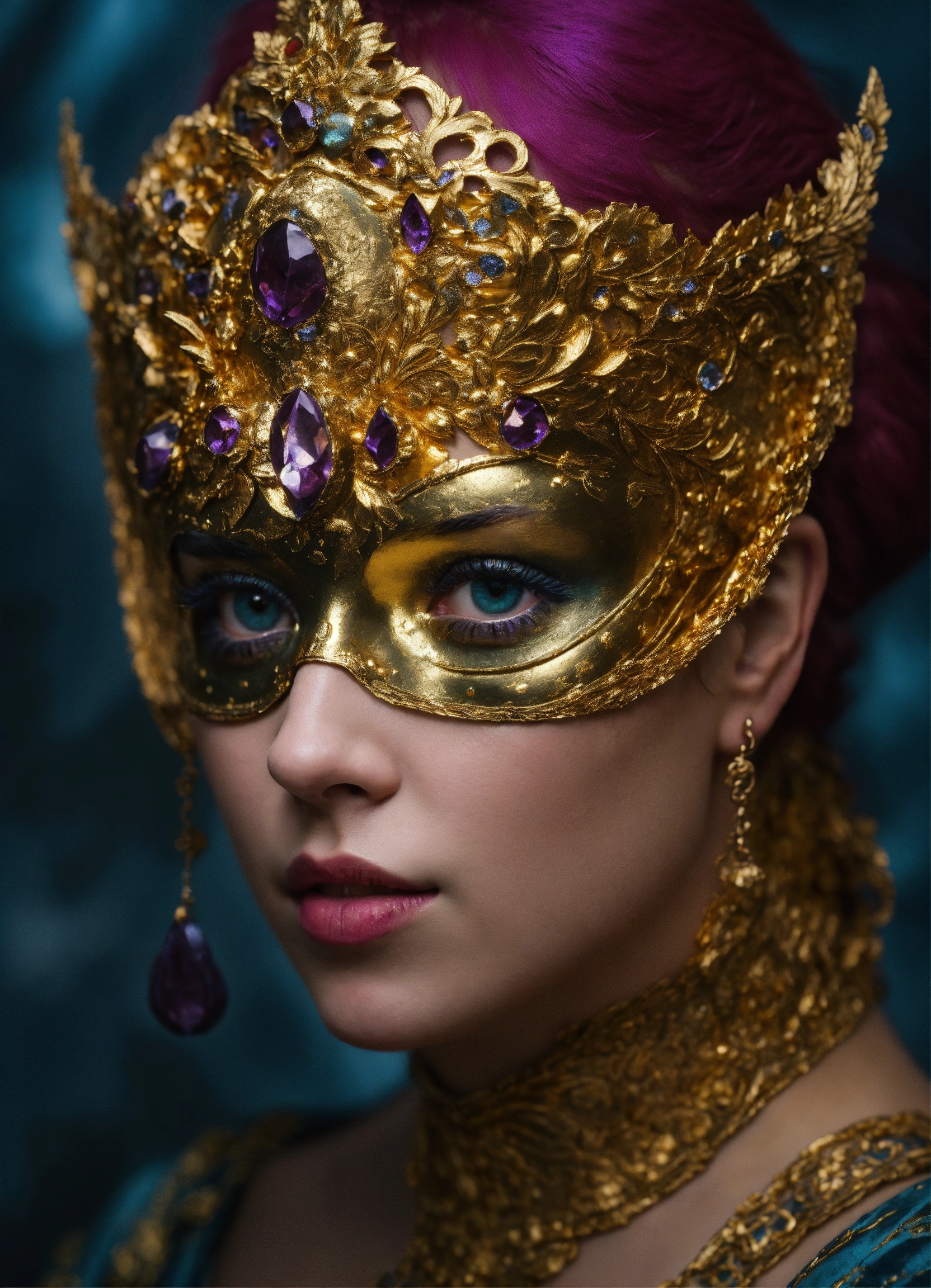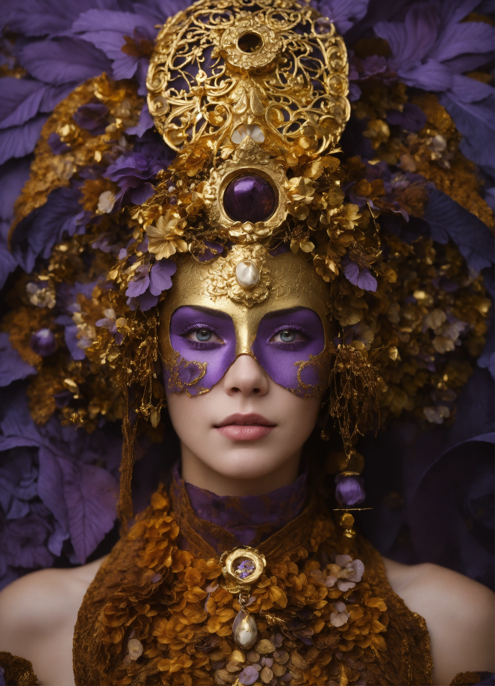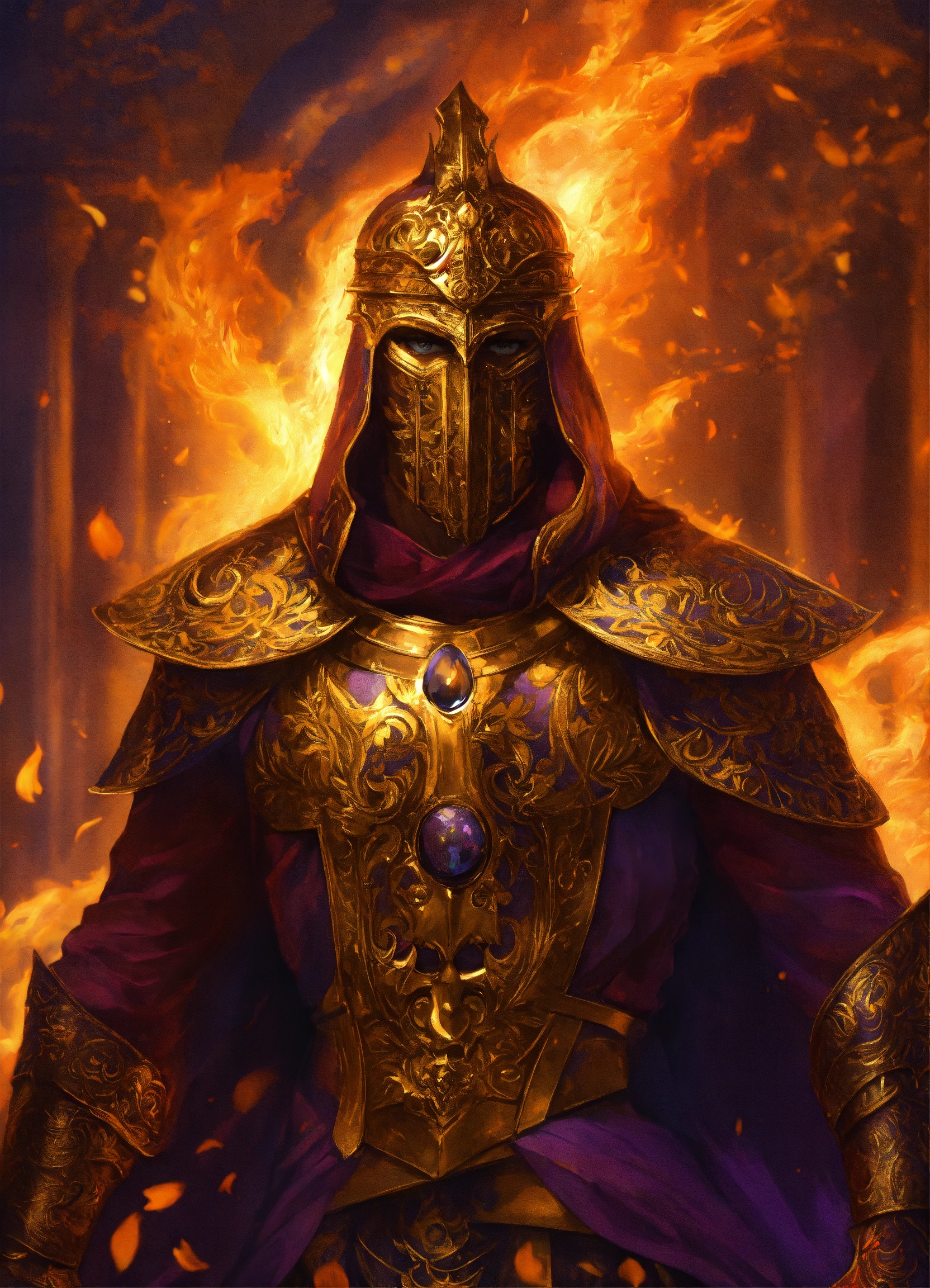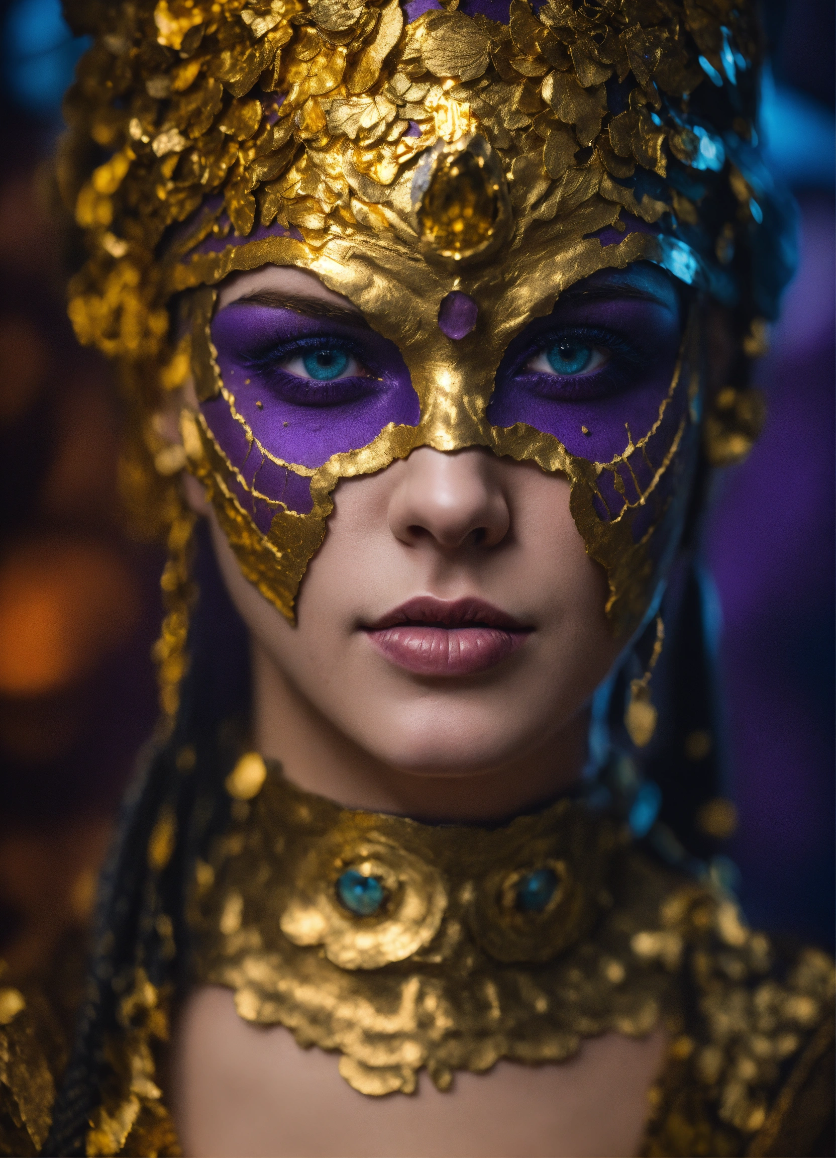 Schöner mann mit weissen haaren und augenbrauen mit glatter maske die den mund bedeckt die augen jedoch freilässt, trägt ein kompliziertes tuch, in einem dunklen tempel des feuers, dunkles gold und dunkles lila, kraftvolle porträts, von der popkultur durchdrungen, style by artgerm maschinenästhetik, fabelwesen in vornehmer kleidung und langem schal, glühend violette augen, dicht gemusterte bilder, stilvolles kostümdesign