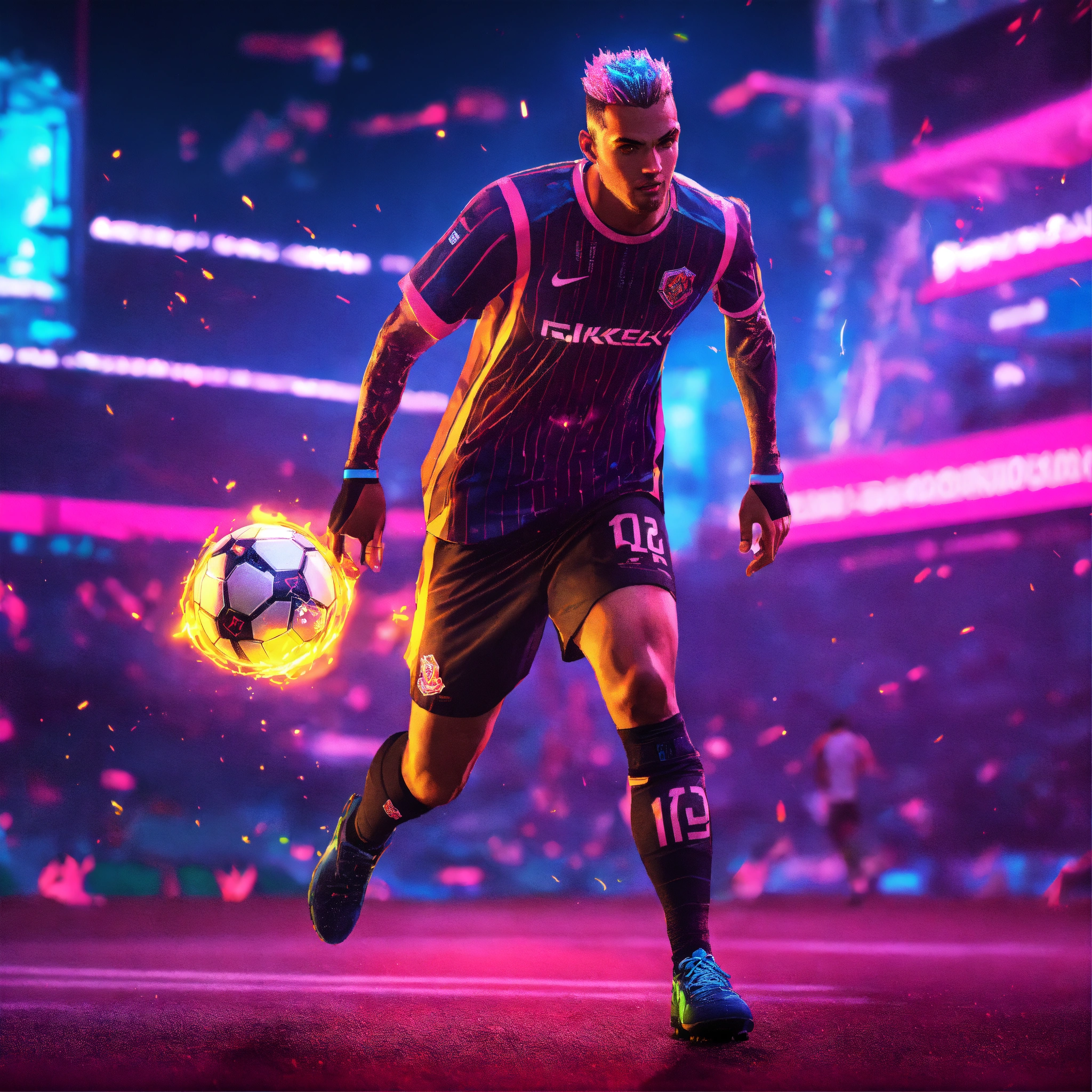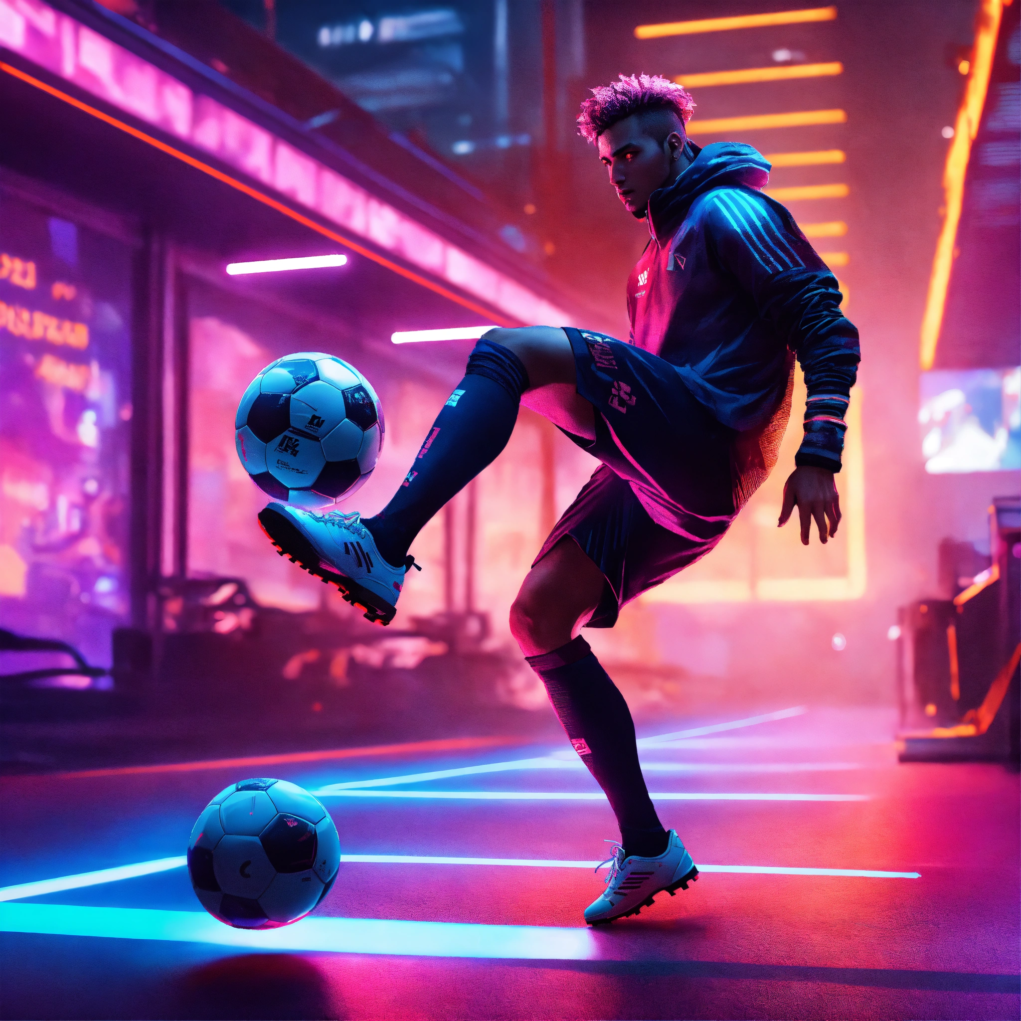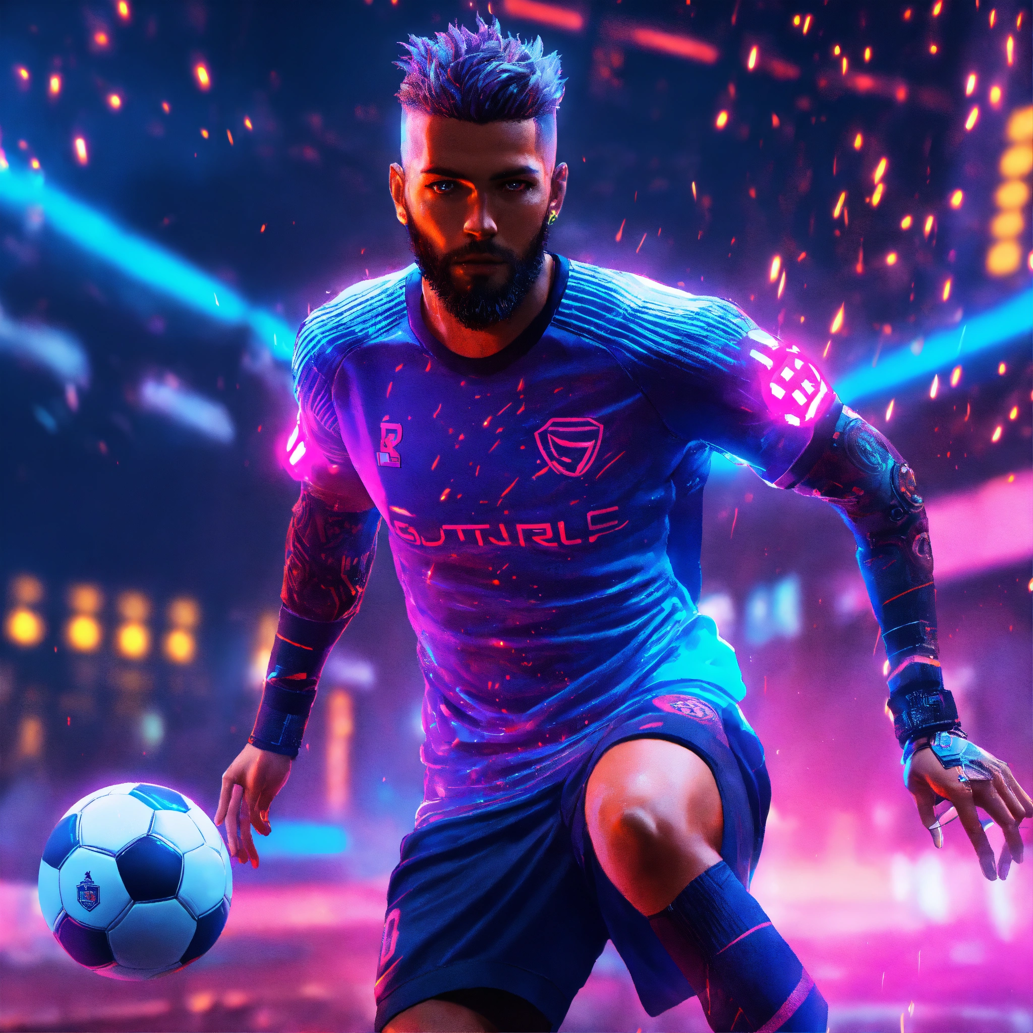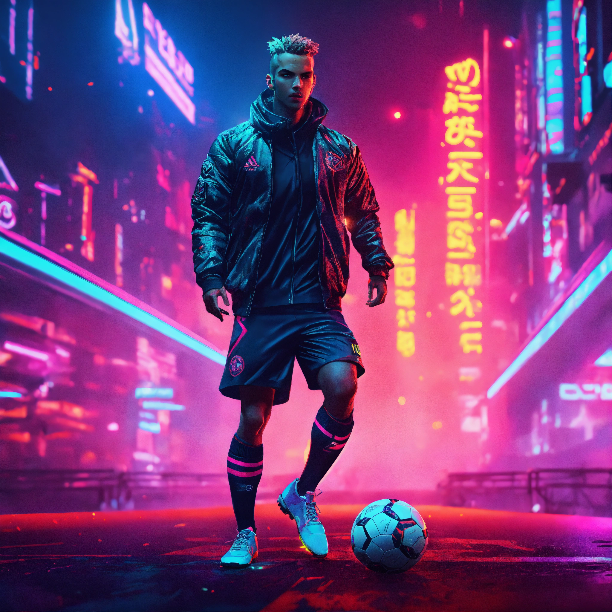 Cyberpunk style soccer player, neon lit cyberpunk city, cinematic lighting, hyper-detailed, 8k, volumetric lighting, flame particles, high details, face hyper details full body