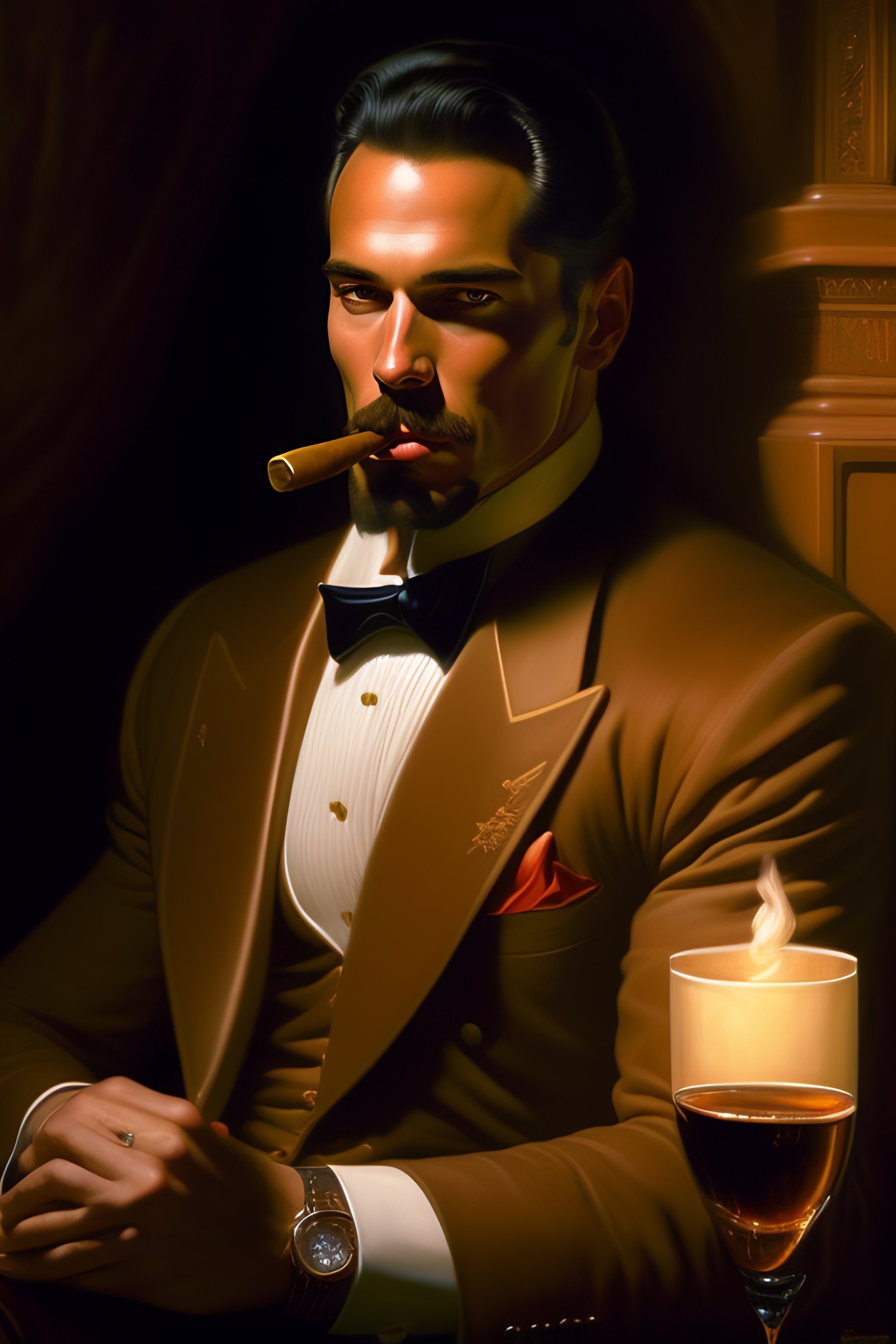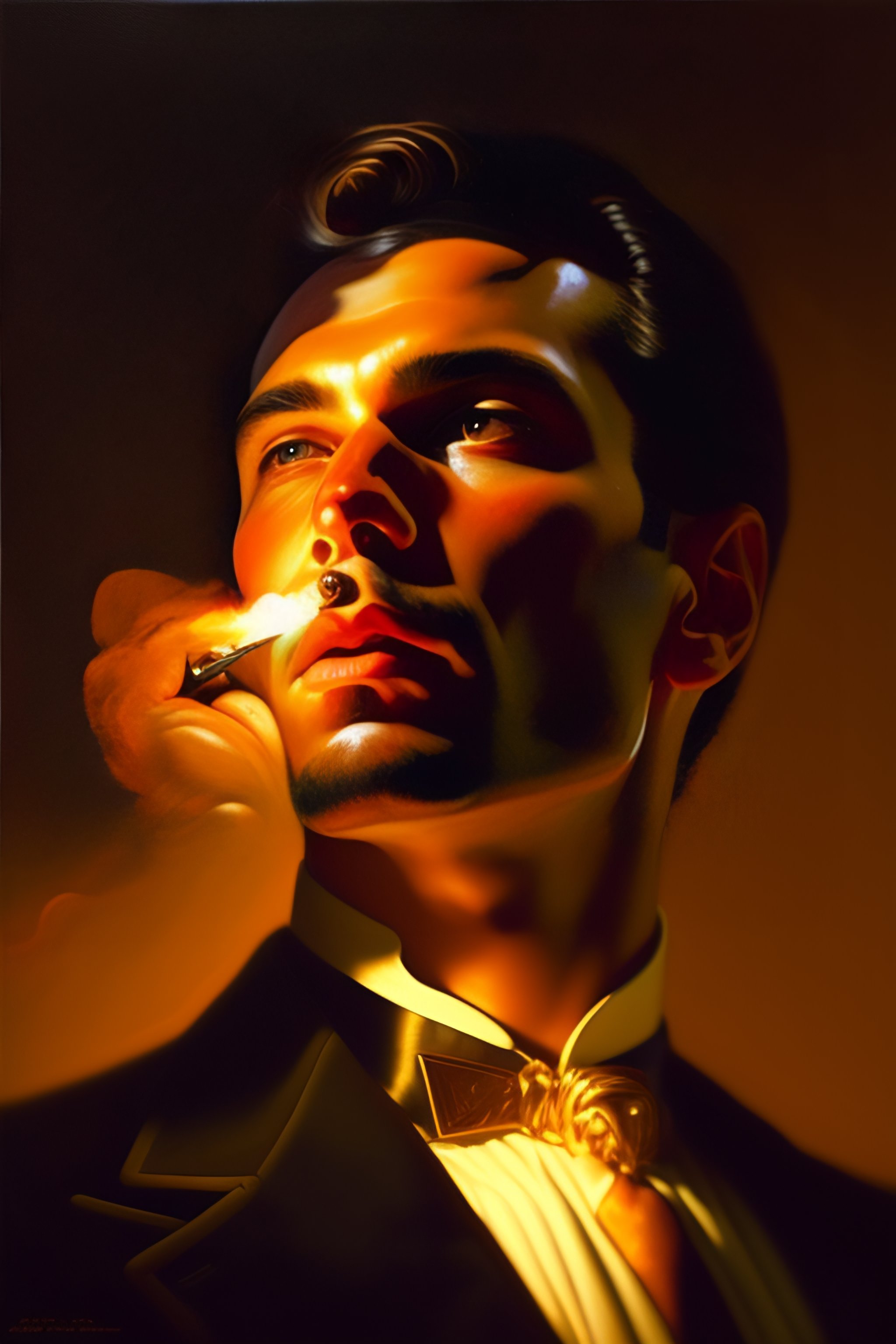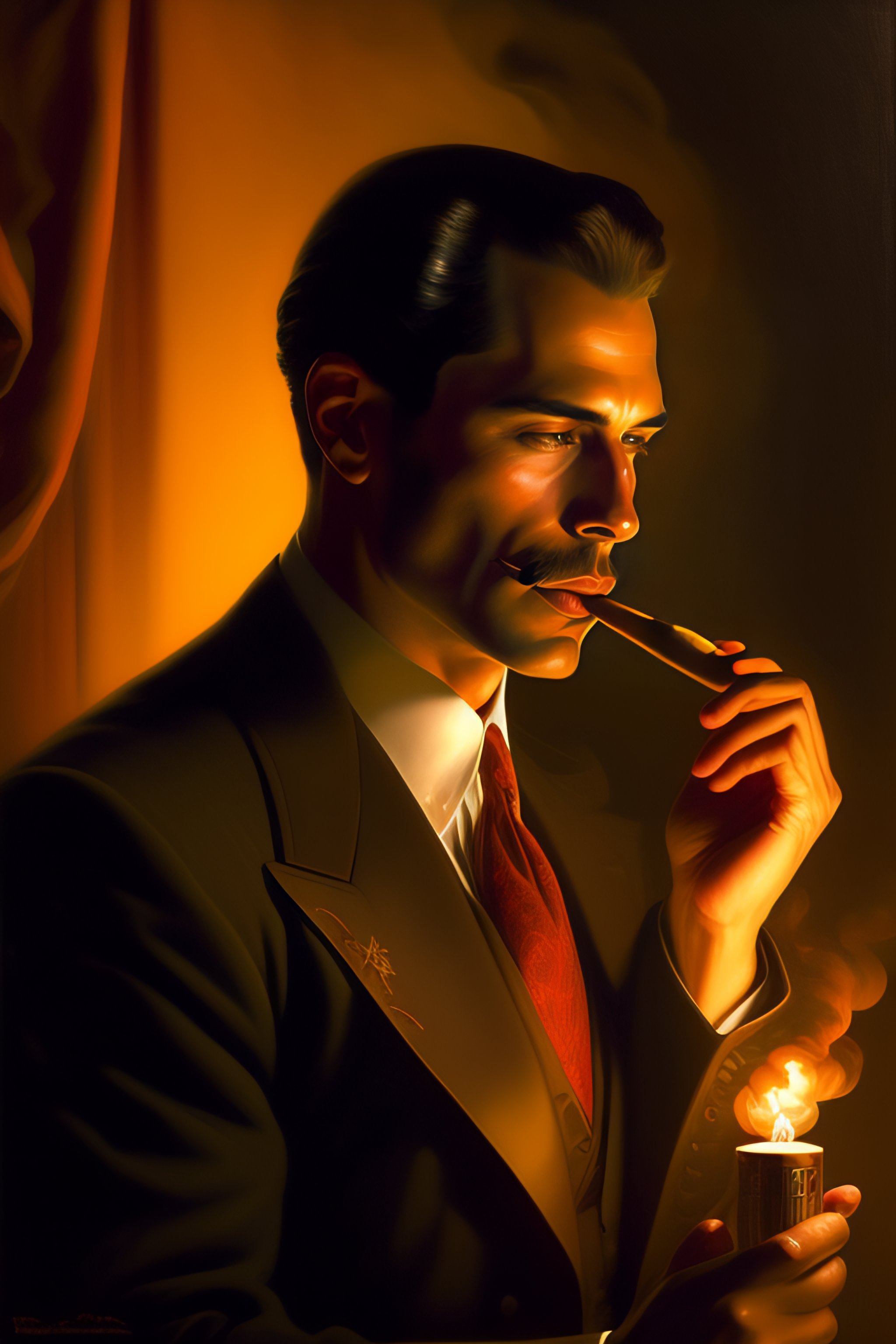 A portrait of a man smoking a cigar in a dark room with low lighting, highly detailed, centered, digital painting, artstation, concept art, donato giancola, joseph christian leyendecker, wlop, boris vallejo, breathtaking