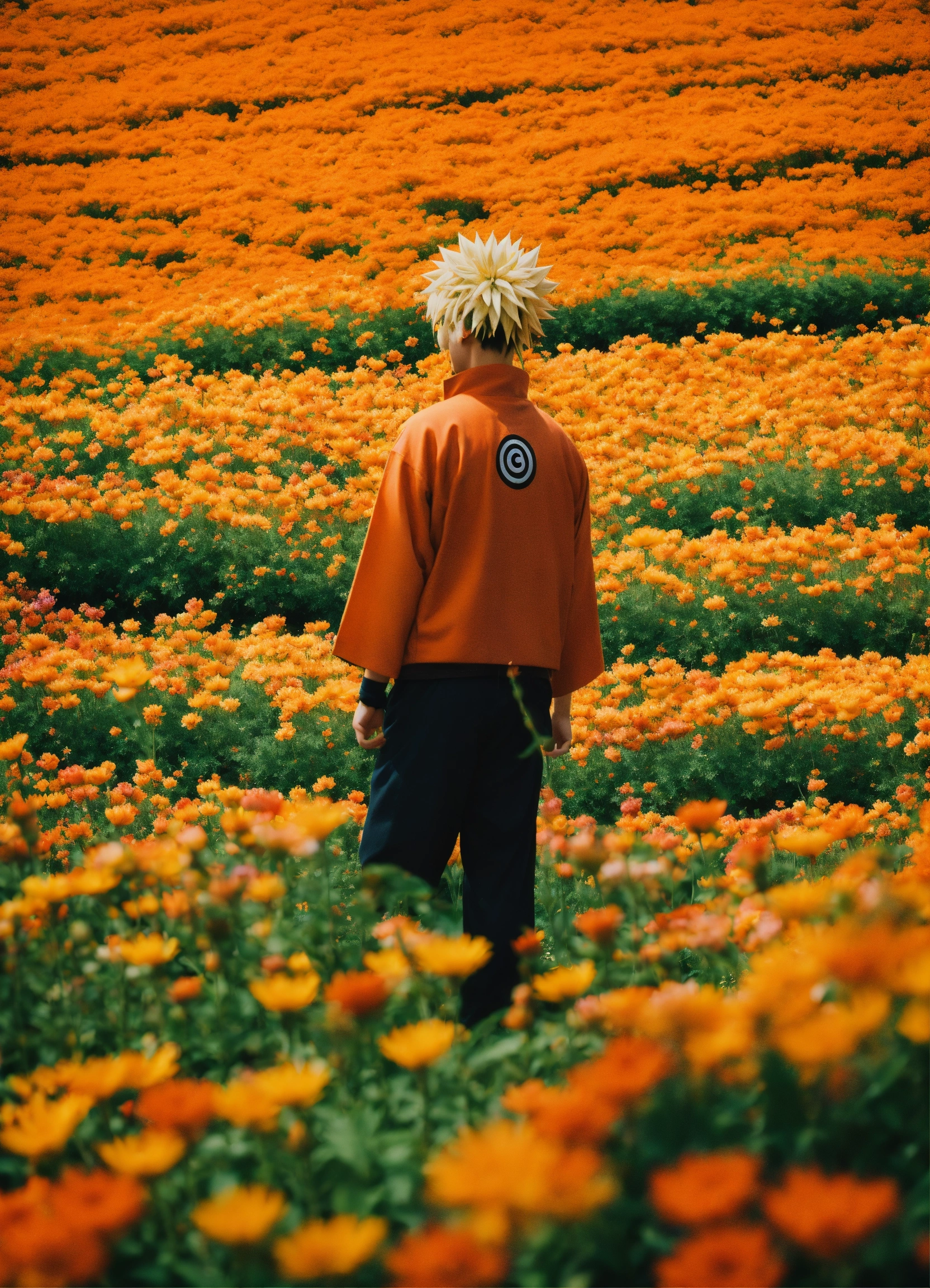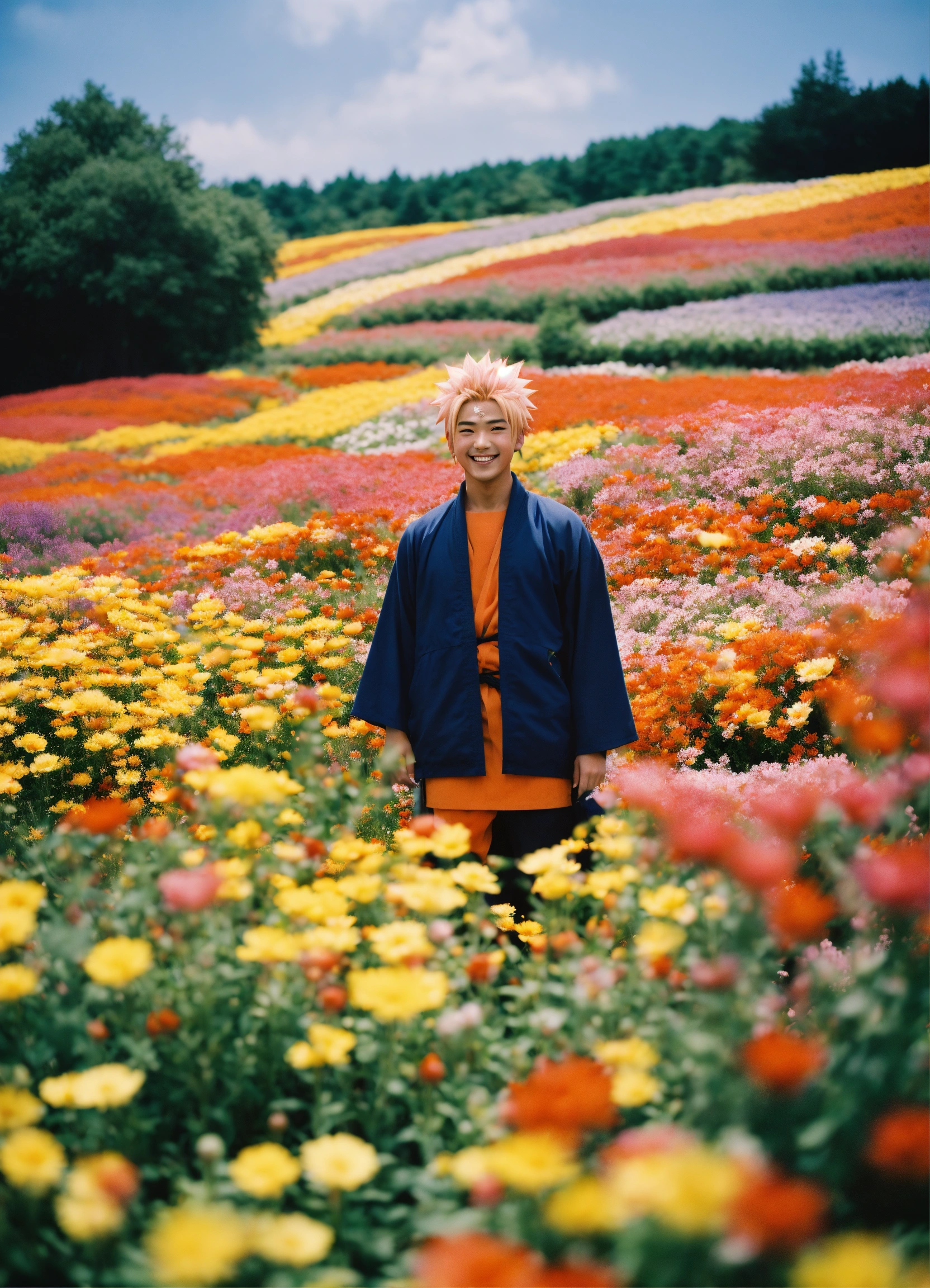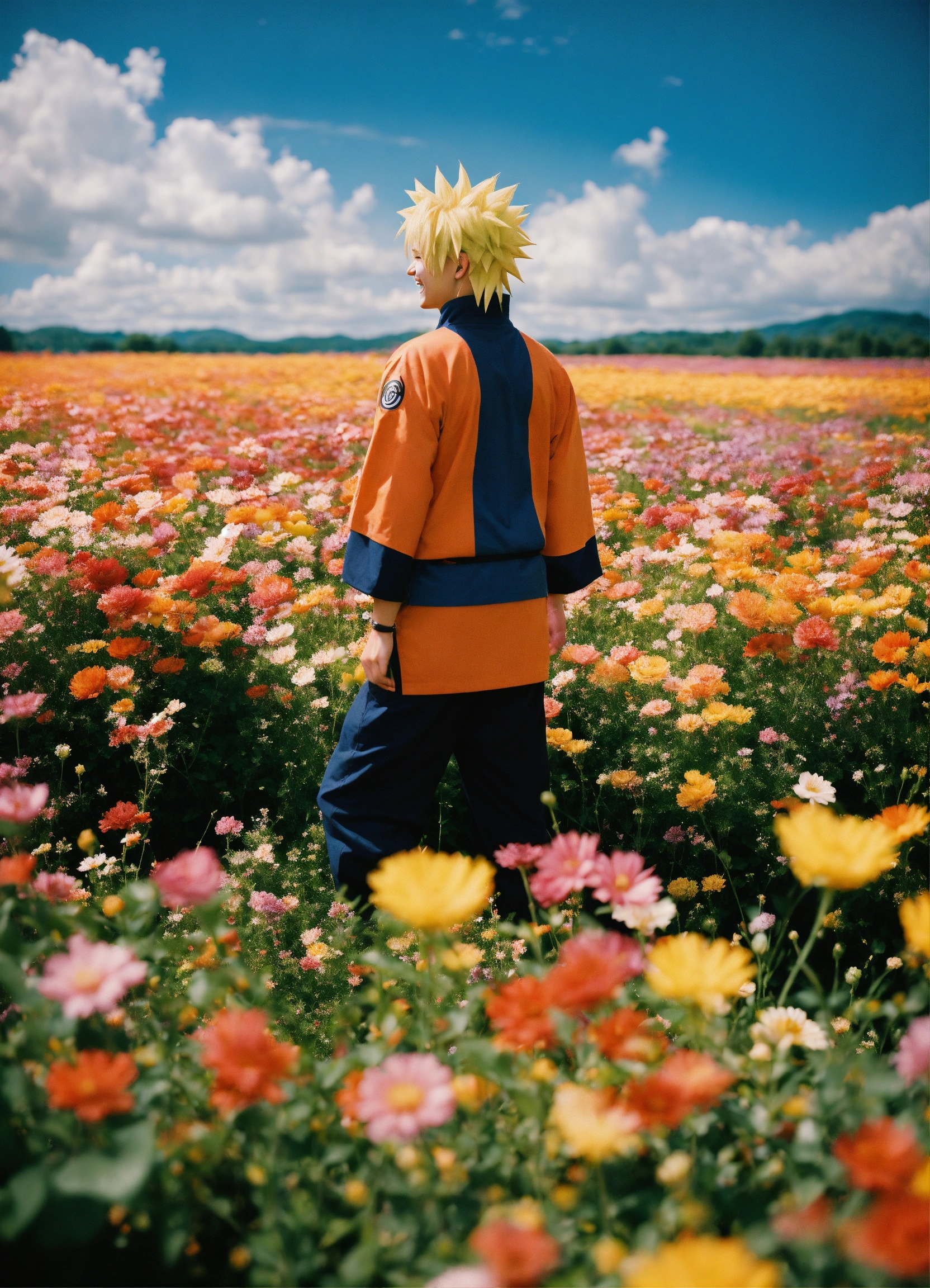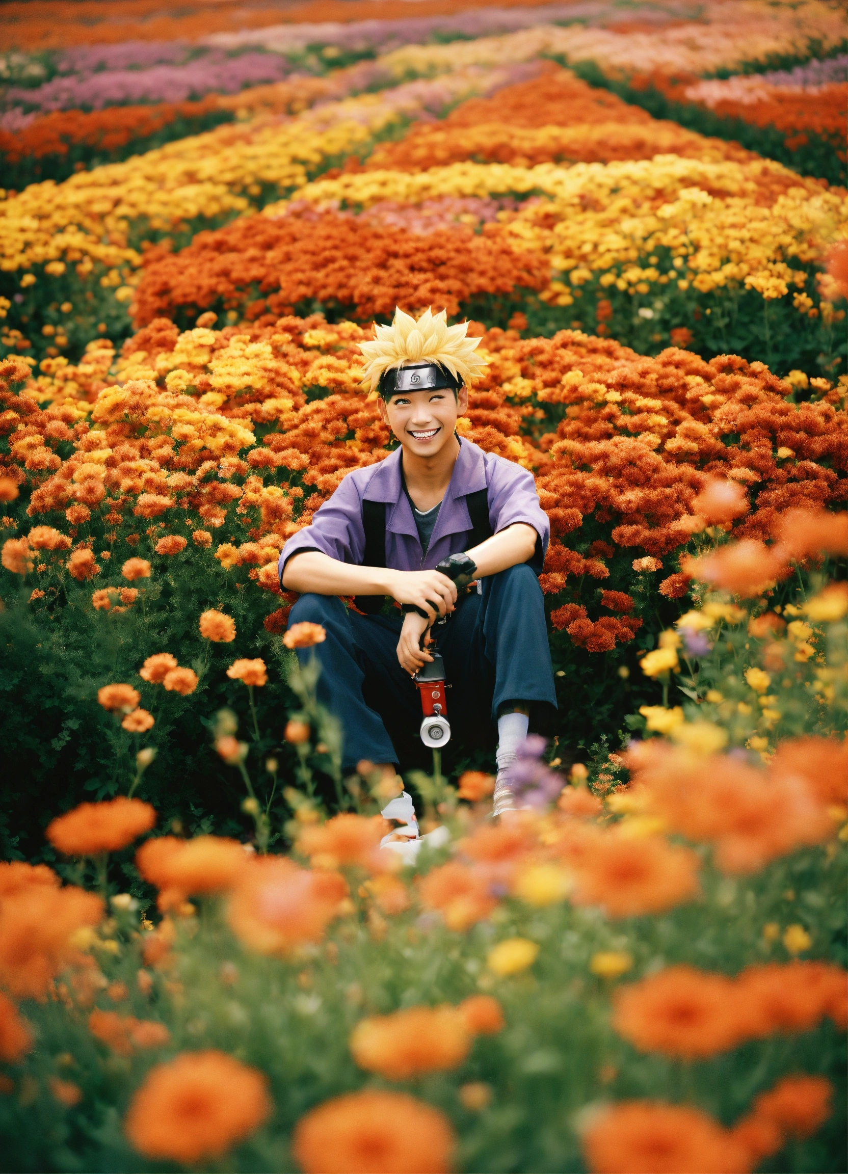 Happy naruto in a beautiful field of flowers, colorful flowers everywhere, perfect lighting, leica summicron 35mm f2.0, kodak portra 400, film grain, naruto fan art