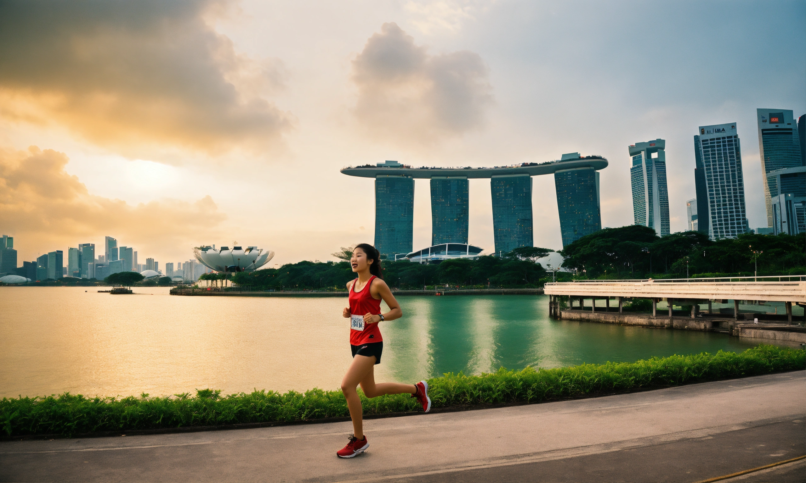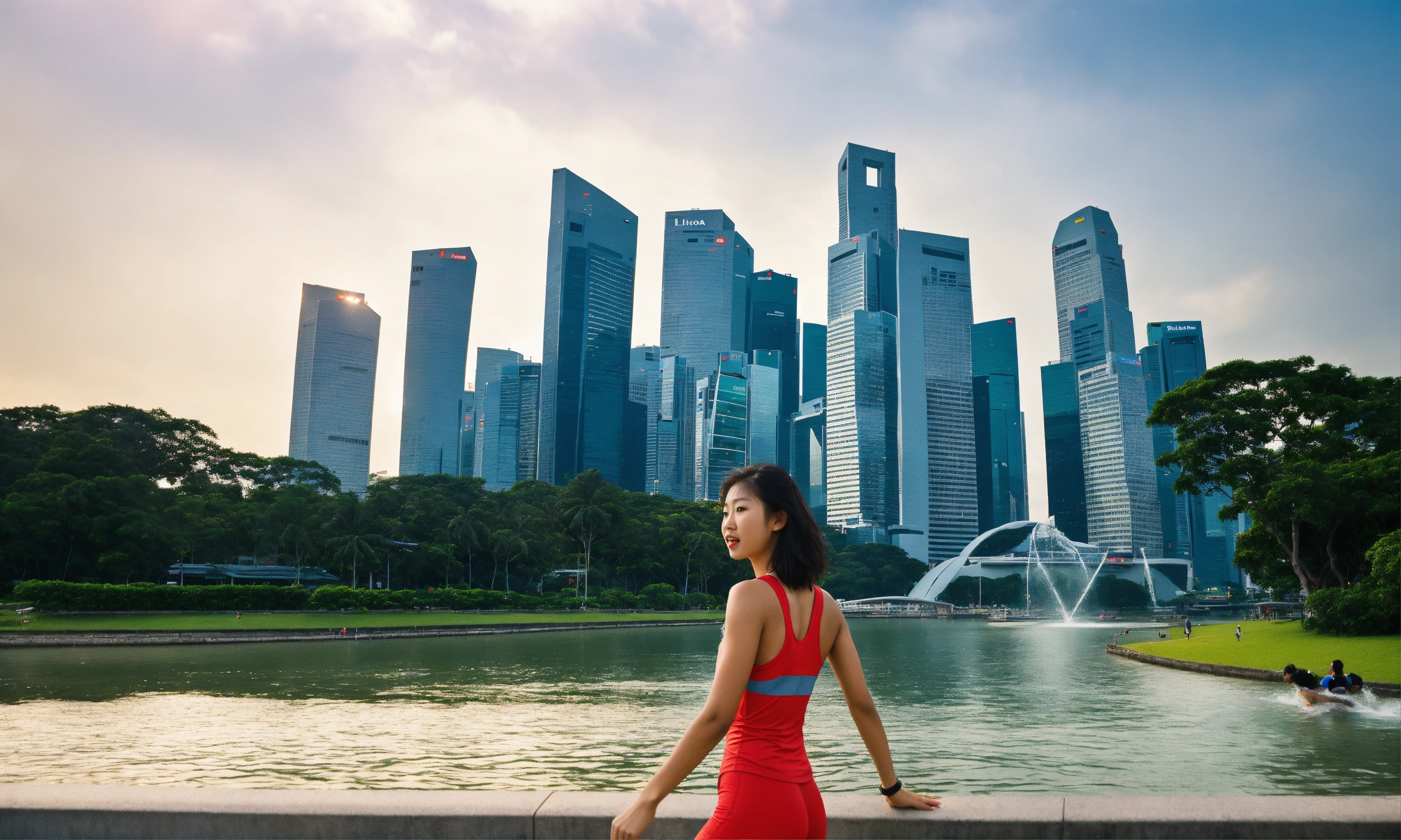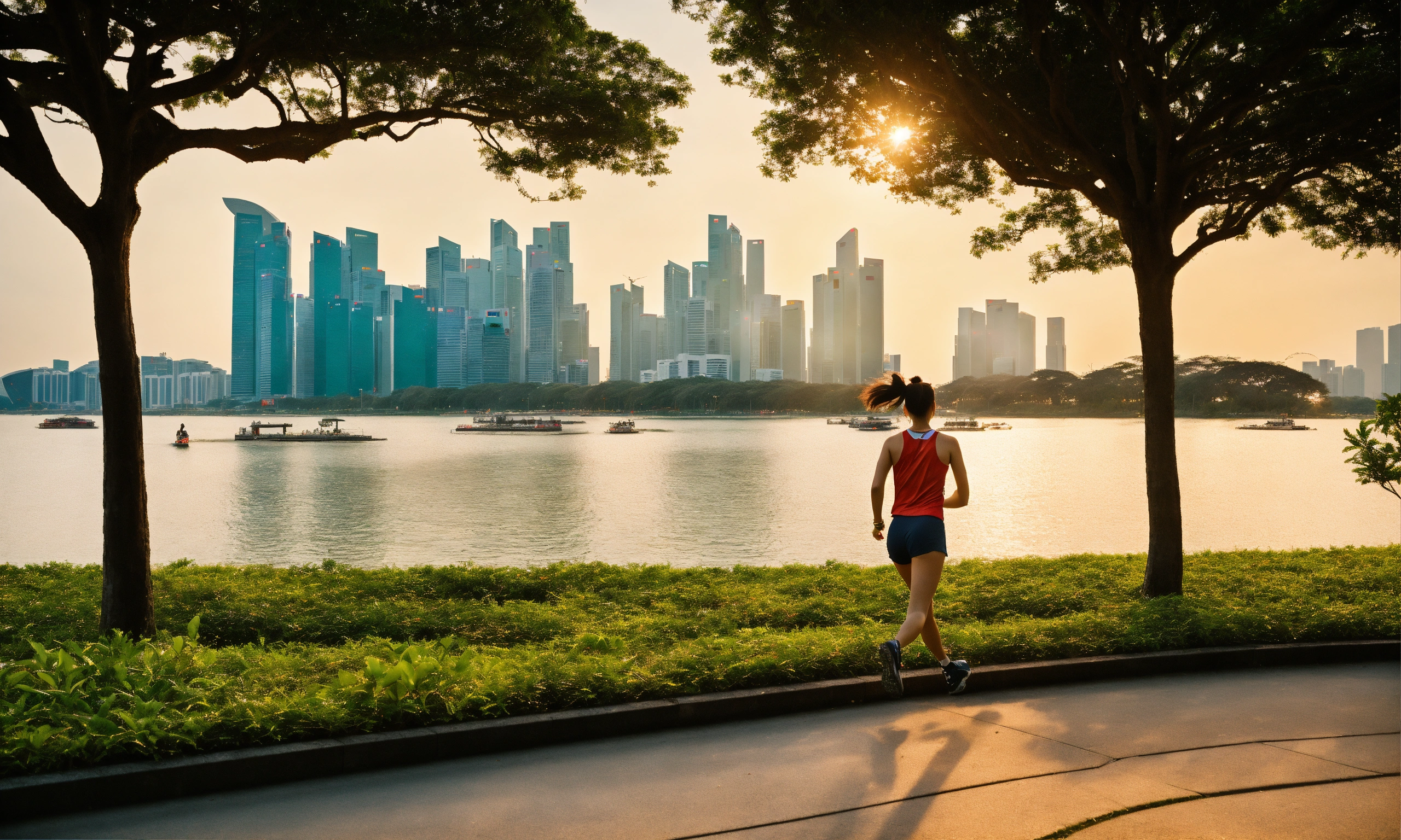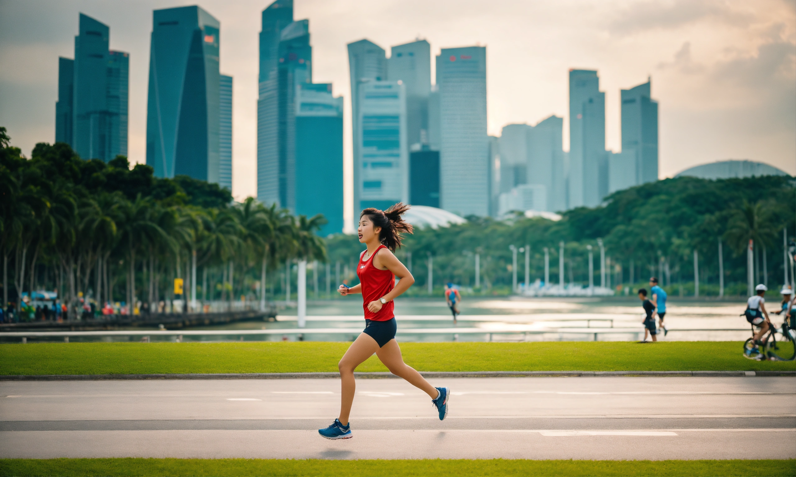 Full establishing shot of singapore's east coast park, towering trees, backdrop is the iconic singapore cityscape rises with modern skyscrapers and marina barrage, an athletic 18-year-old asian girl running in the centre of the screen, a sleeveless plain red singlet, determined expression and vibrant attire symbolize the energy of this unique urban park, a leica summicron 35mm f2.0 lens to enhance the colors, shooting with kodak portra 400 film to add cinematic richness.