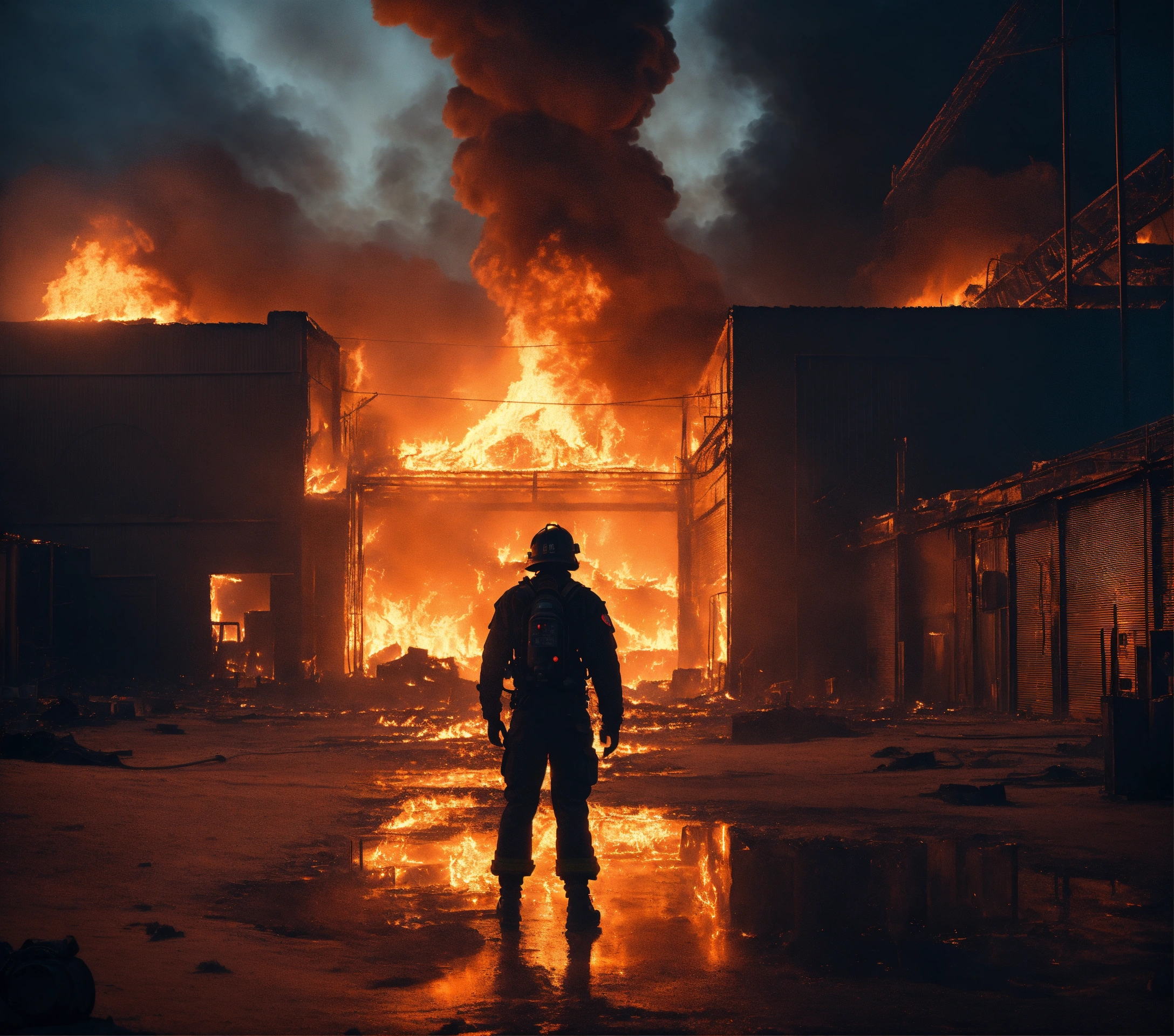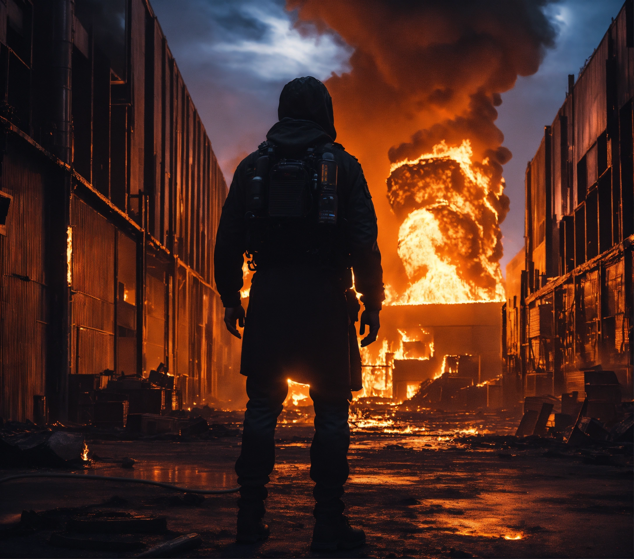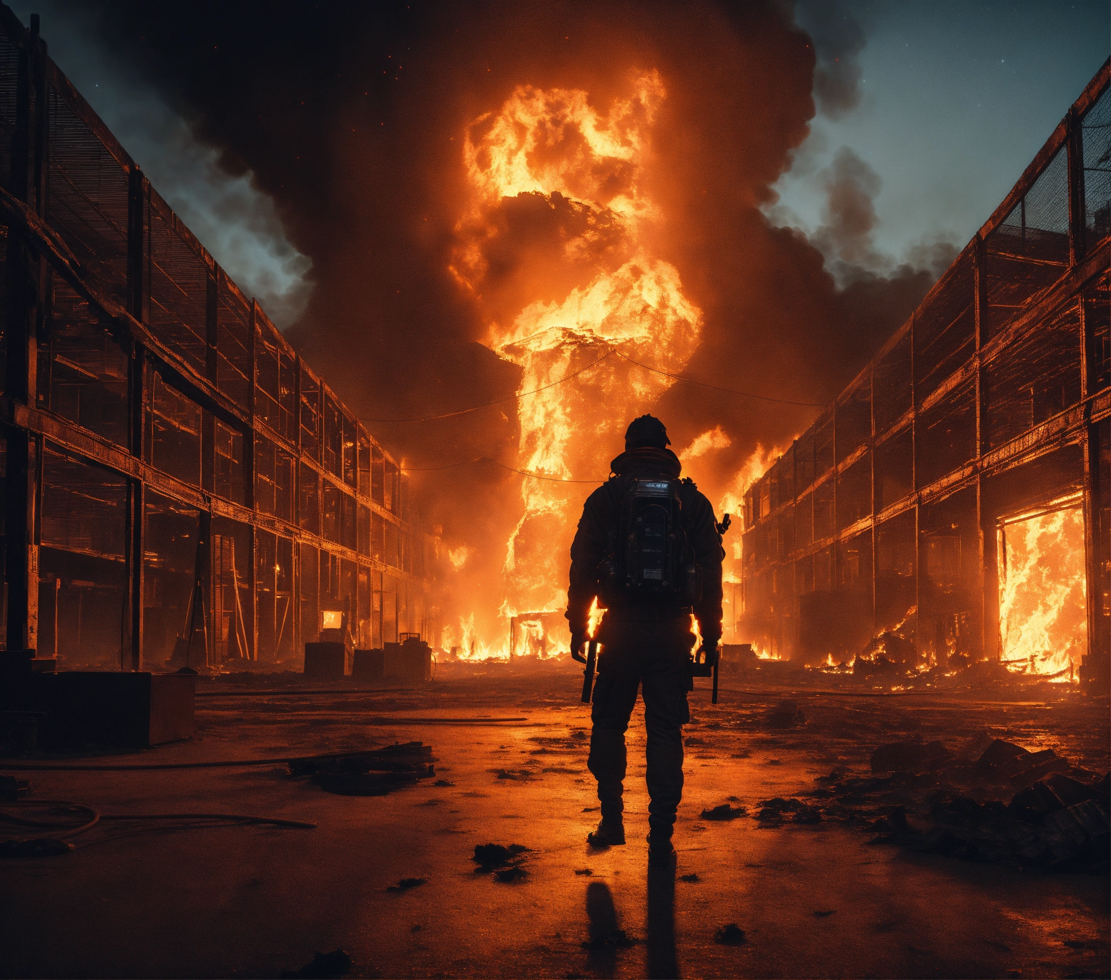 A highly realistic night photo of, a man's dark silhouette in the center, in the background a sci-fi high-tech warehouse completely on fire, in the middle of a city in the desert, scary, imposing, dramatic, hyperdetailed, hyperrealistic, 8k