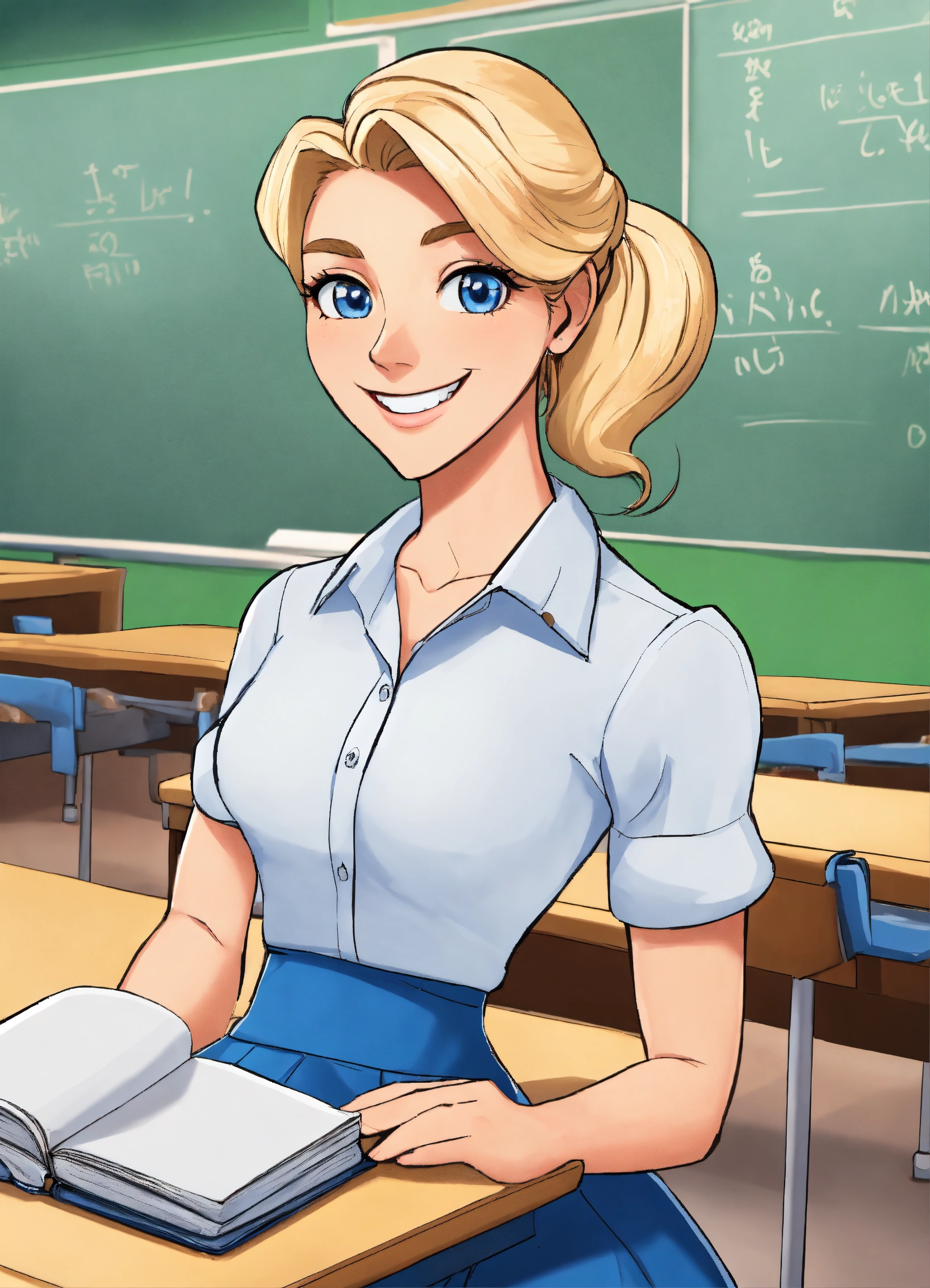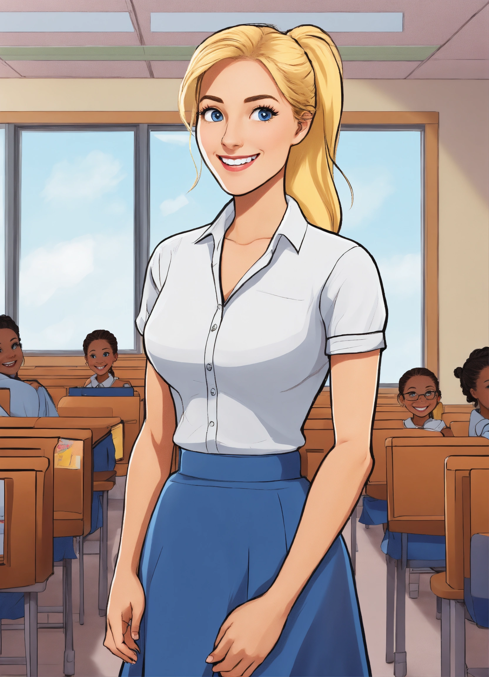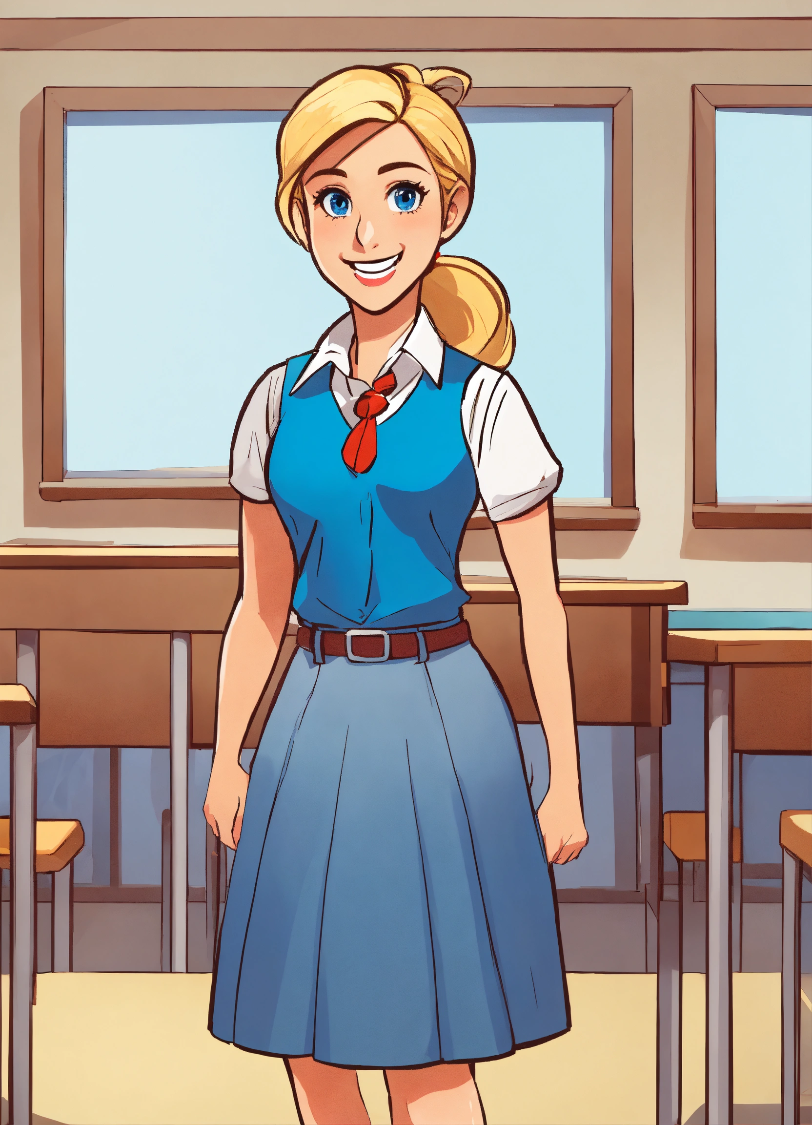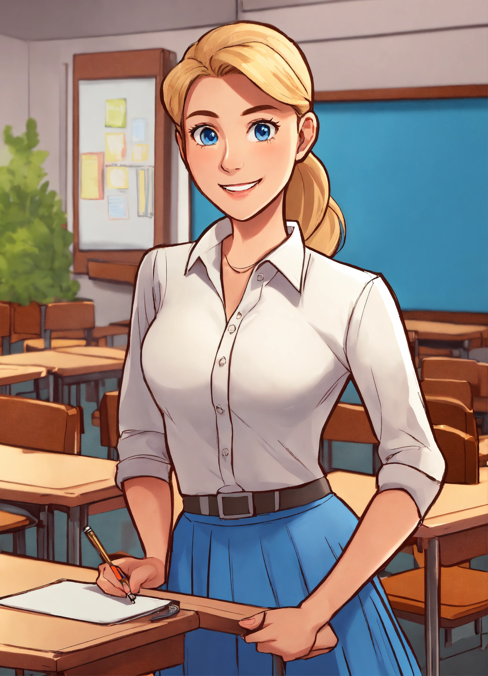 In a cartoon style, a full body of a female teacher in her 30s with blonde hair up in a ponytail. she has blue eyes. she is wearing a white shirt and a blue skirt. she is facing forward smiling. she is in a class room.