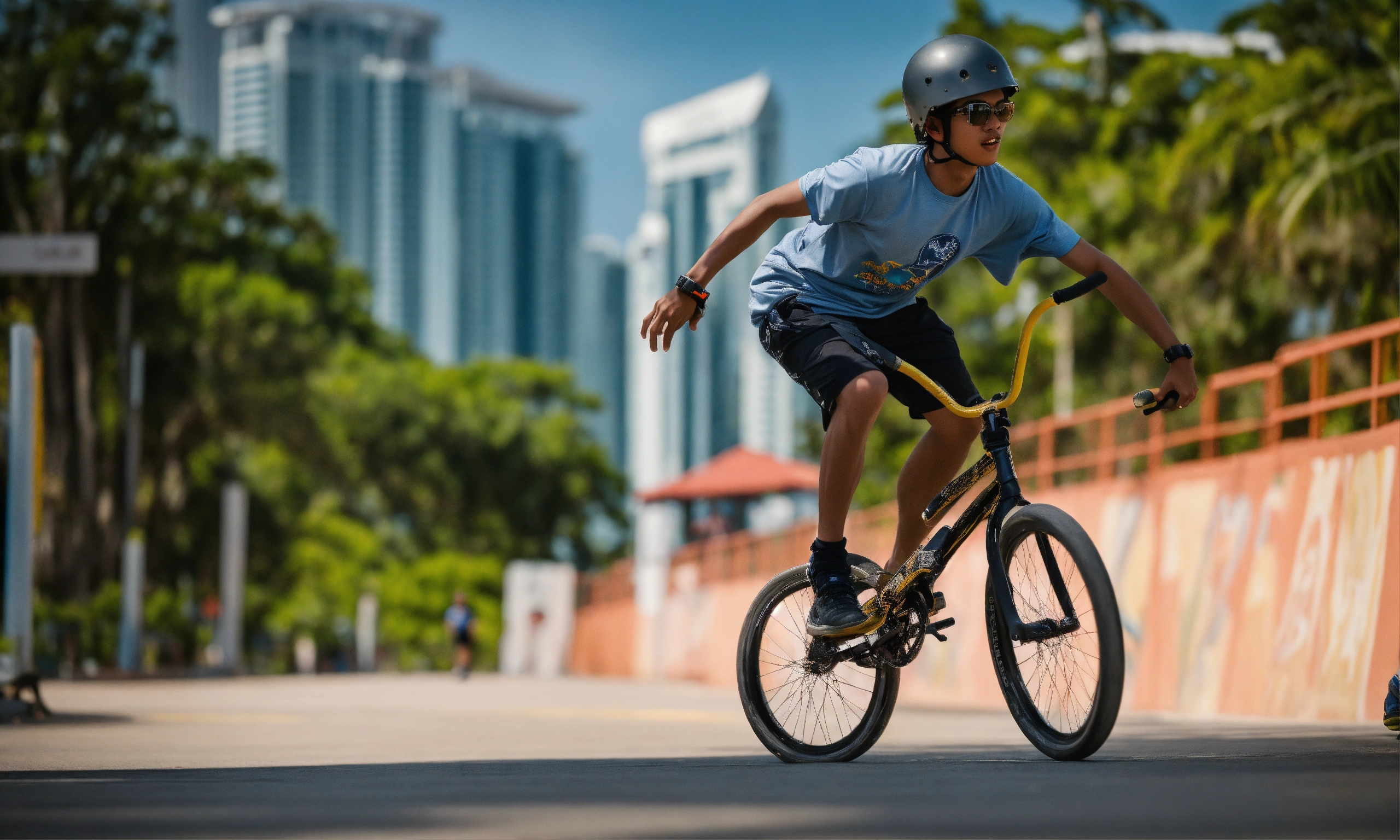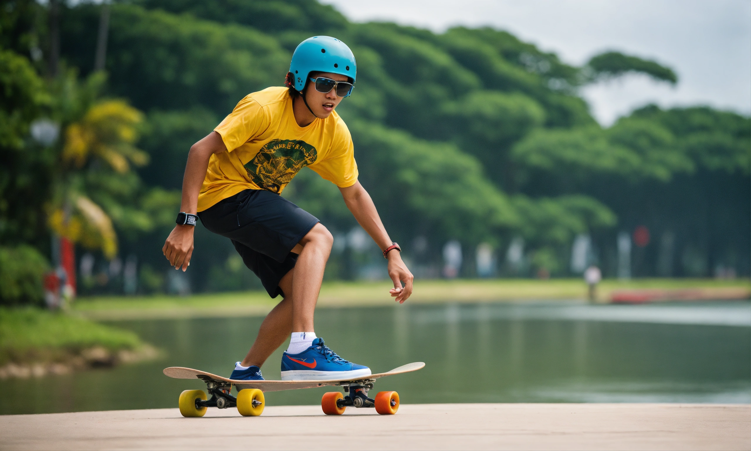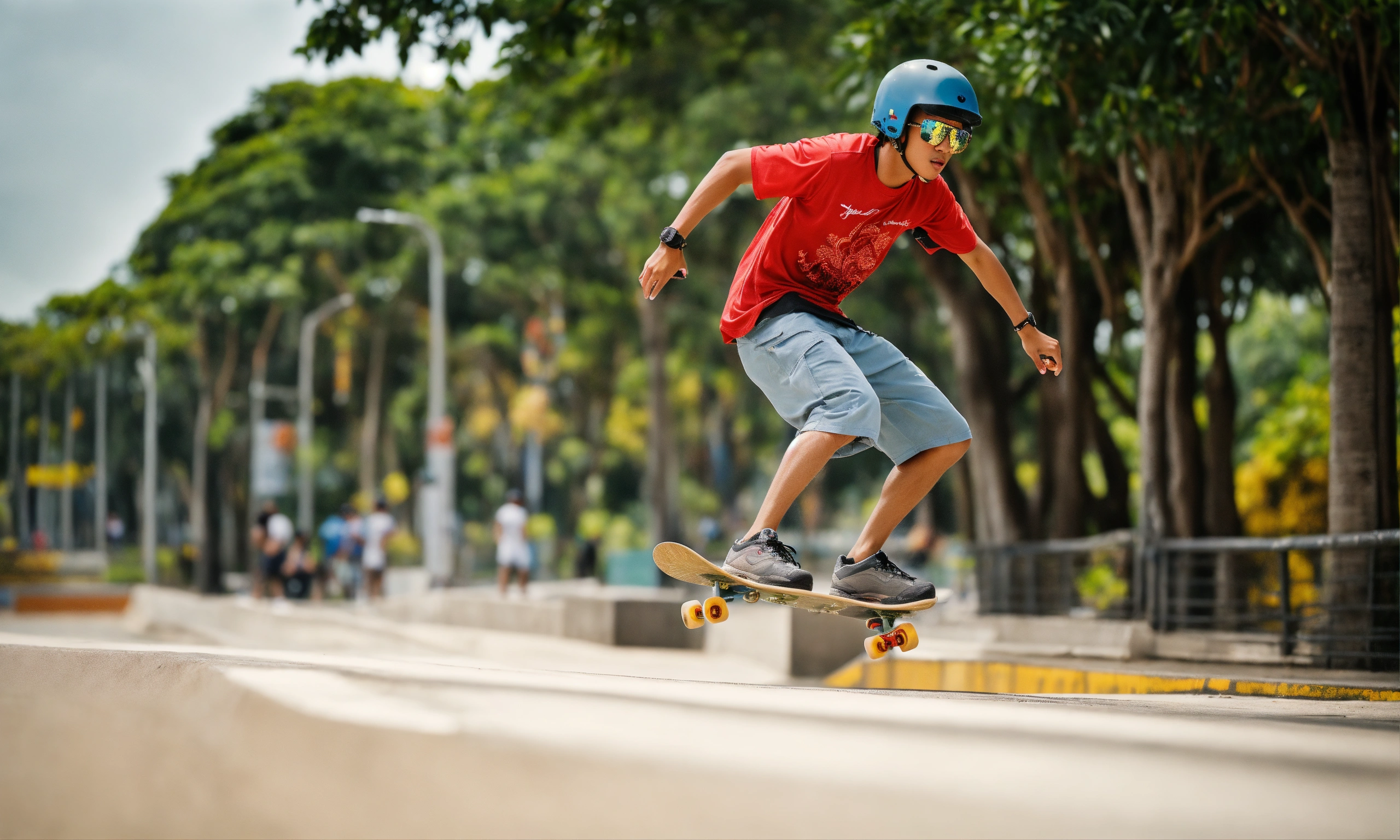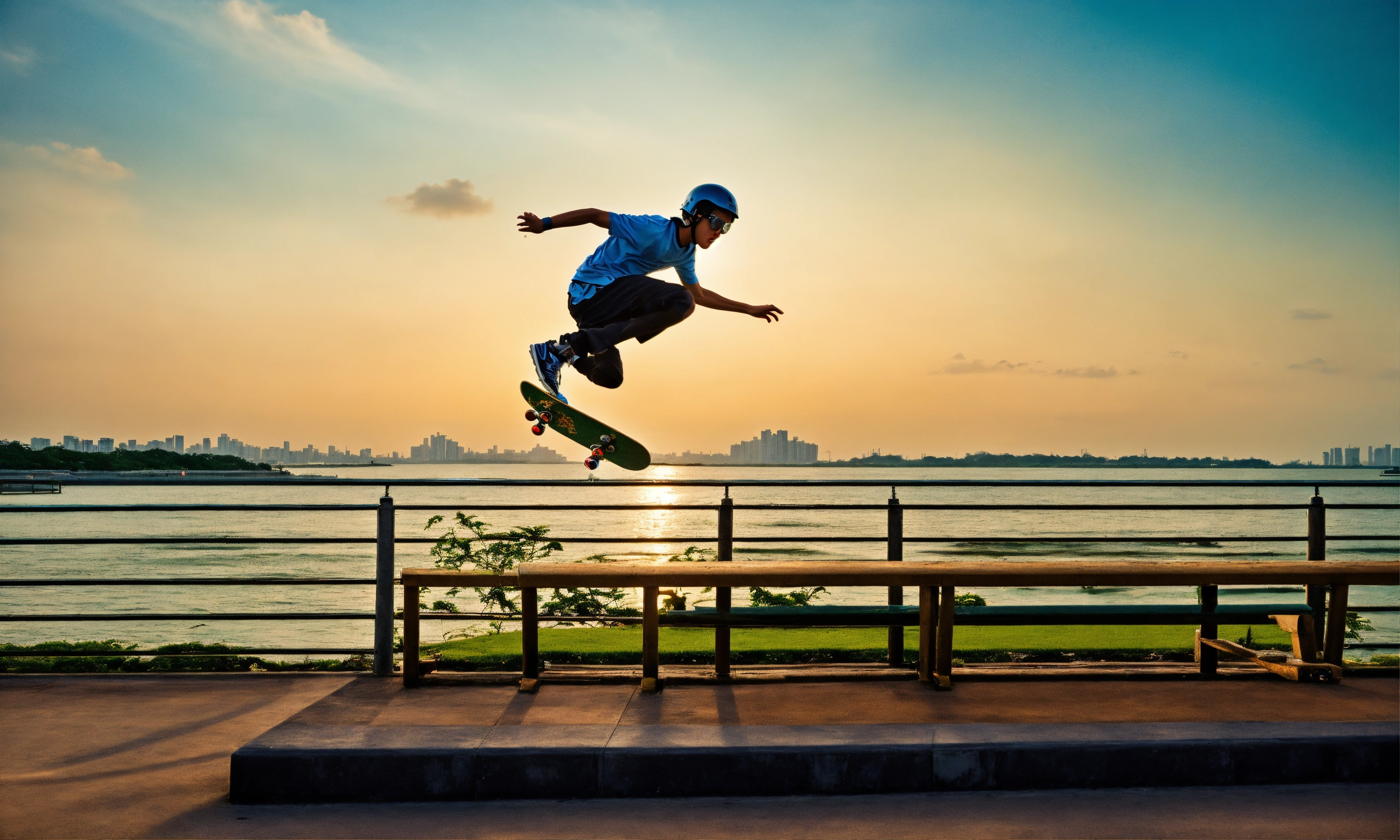 Day, ultra-realistic photo, cinematic quality, close-up action shot at singapore's east coast park, singapore, the backdrop showcases the iconic scenery of the park. main focus a 18-year-old malay skateboarder with helmet and sunglasses in mid-air executing a challenging trick, his body contorted in concentration. intense focus radiates from his eyes, sweat glistening on his brow, exuding raw passion and unyielding perseverance; clothing contemporary skateboarding attire including protective gear, a t-shirt, shorts, and sneakers. expression grit and determination, a testament to his dedication to the sport. themes modern nostalgia, overcoming adversity, dynamic lighting emphasizes the contours of his face and body against the backdrop of east coast park, 50mm camera lens producing sharpness with a blurred background, portra 400 film, subtle film grain adding depth and emphasizing the raw energy of the moment.