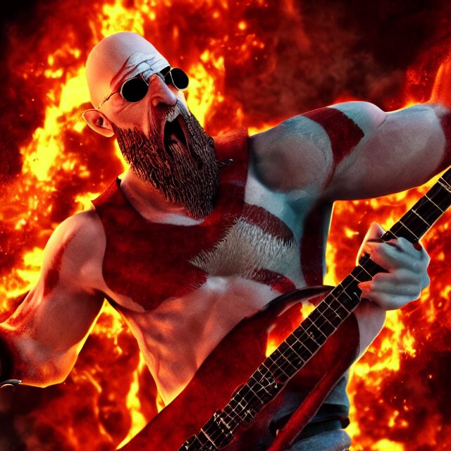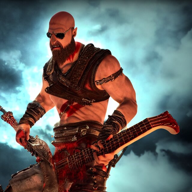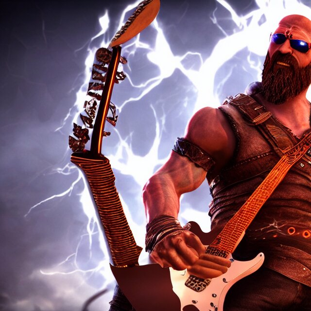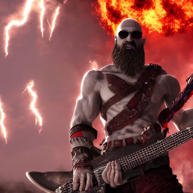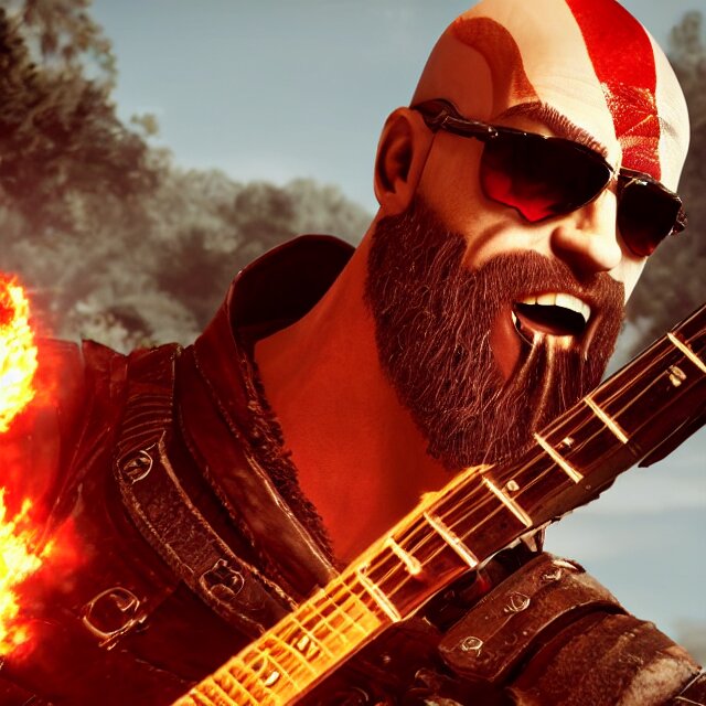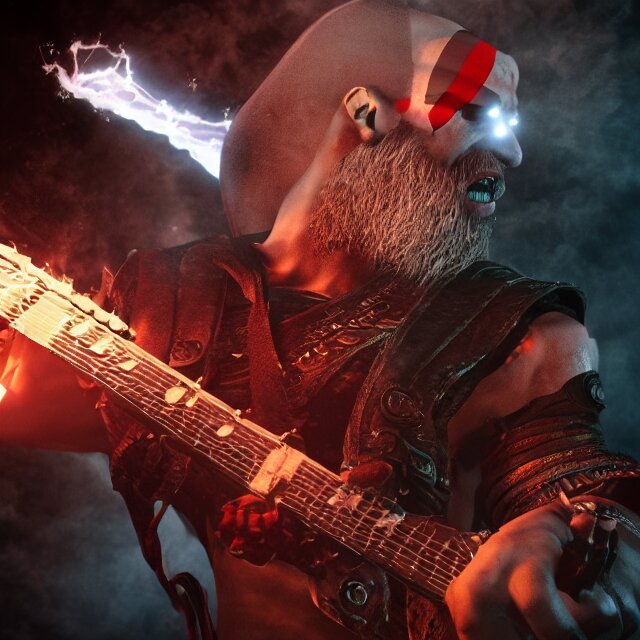Sunglasses wearing kratos rocking out on a stratocaster guitar, cinematic render, god of war 2 0 1 8, playstation studios official media, sunglasses, lightning, flames, red stripe tattoo