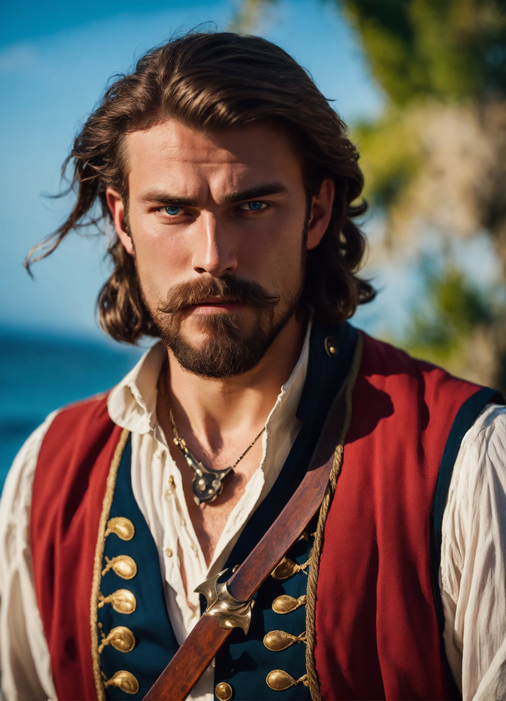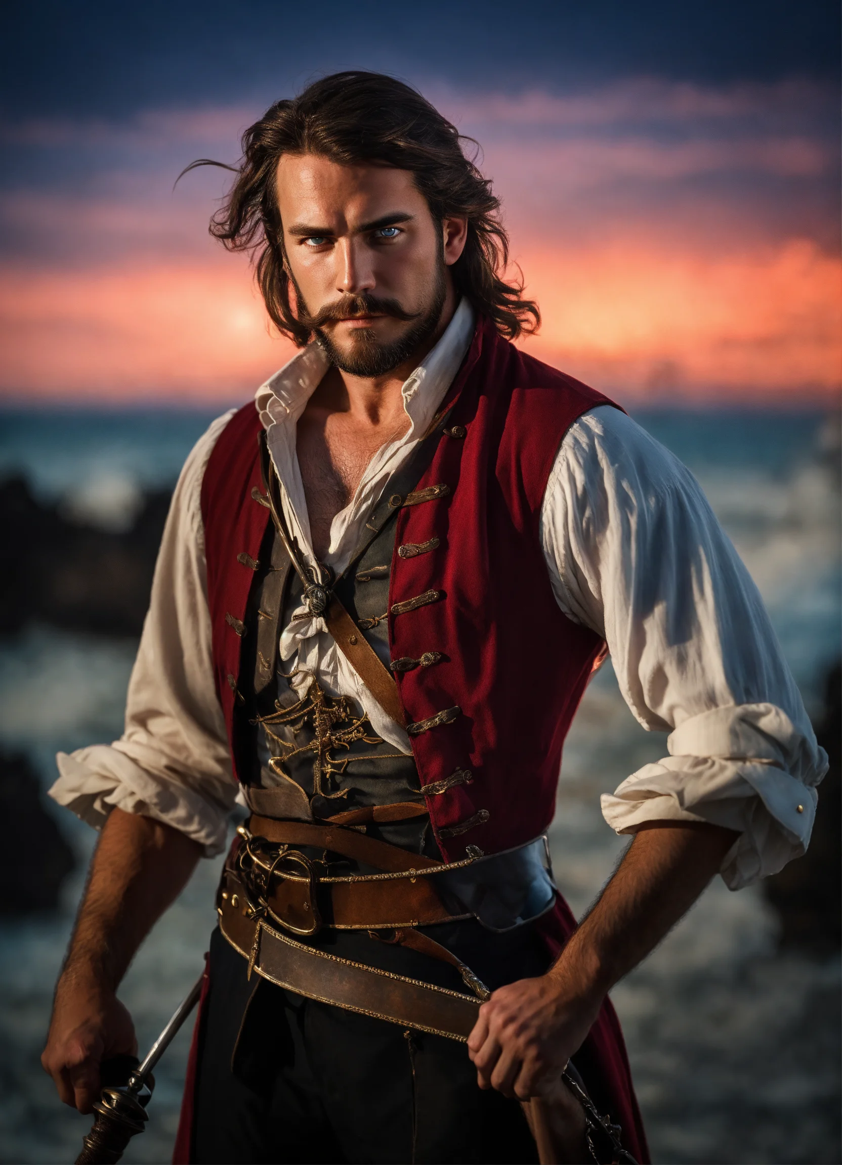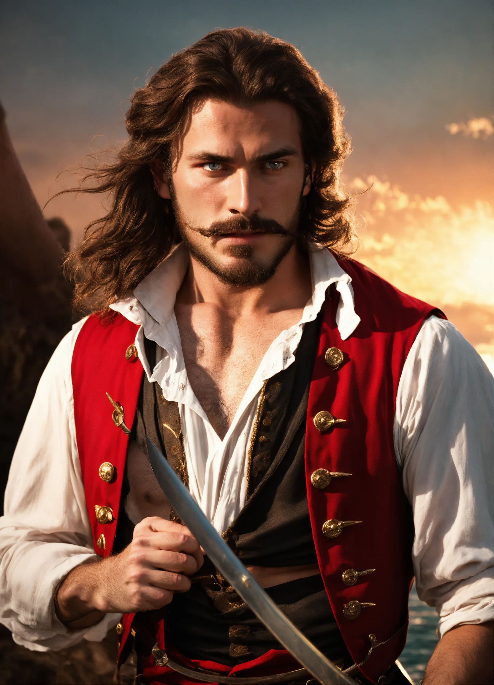 Holding a rapier an adult male pirate with long swept back brown hair, light blue eyes, stumbled facial hair, 1820s era white shirt and red vest, chest hair, holding a rapier, chest hair, 8k, cinematic lighting, island background