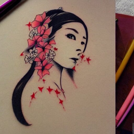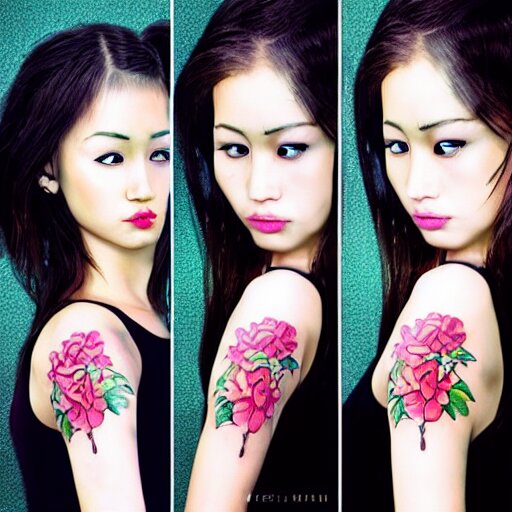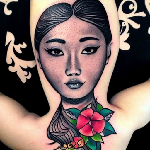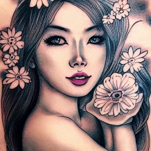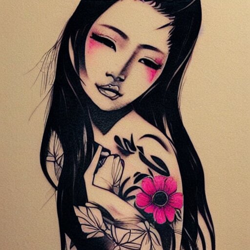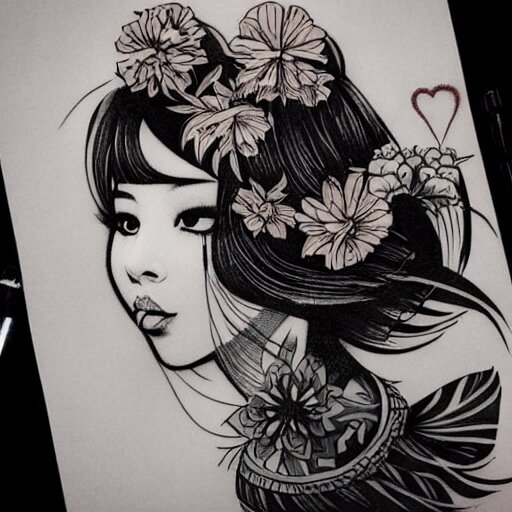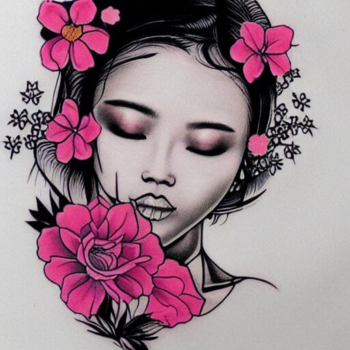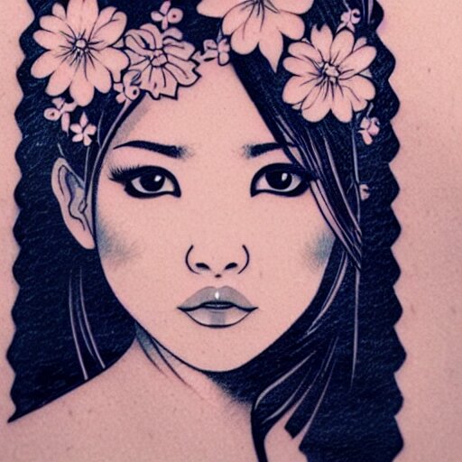 Tattoo design, stencil, traditional, beautiful portrait of a asian girl with flowers in her hair, upper body, by artgerm, artgerm, digital art, cat girl, sexy