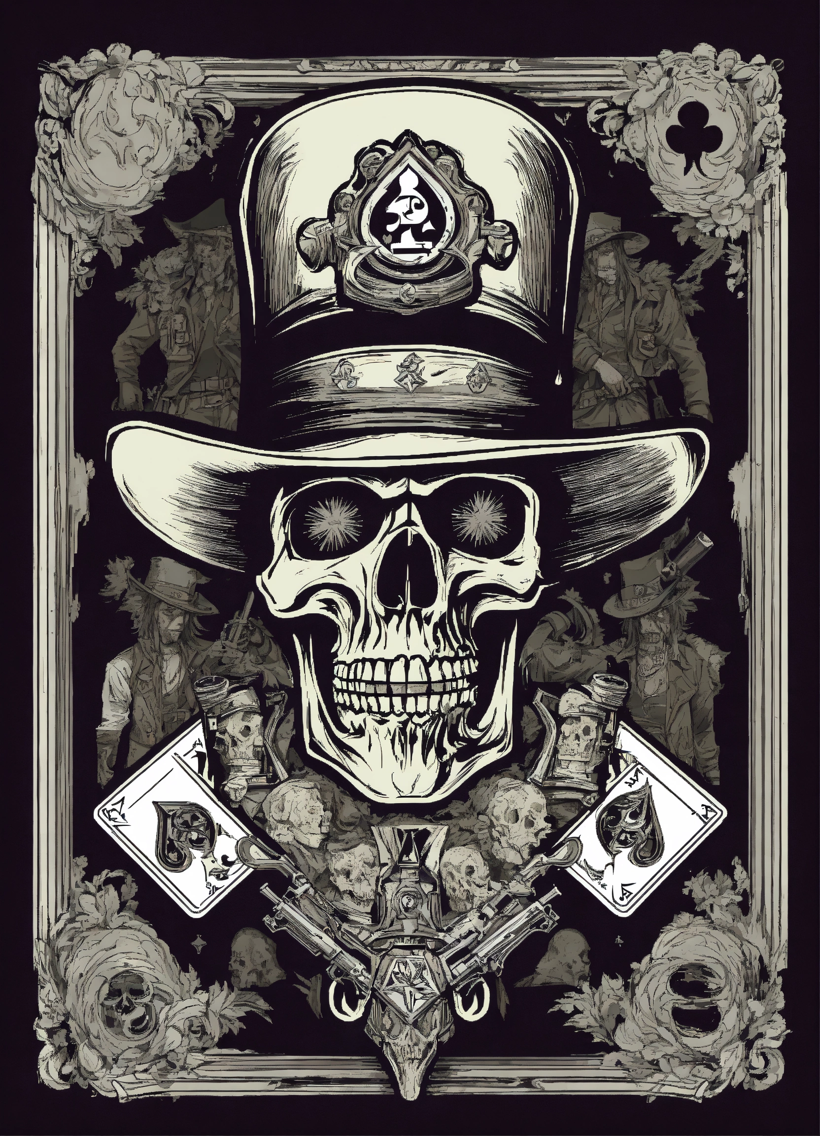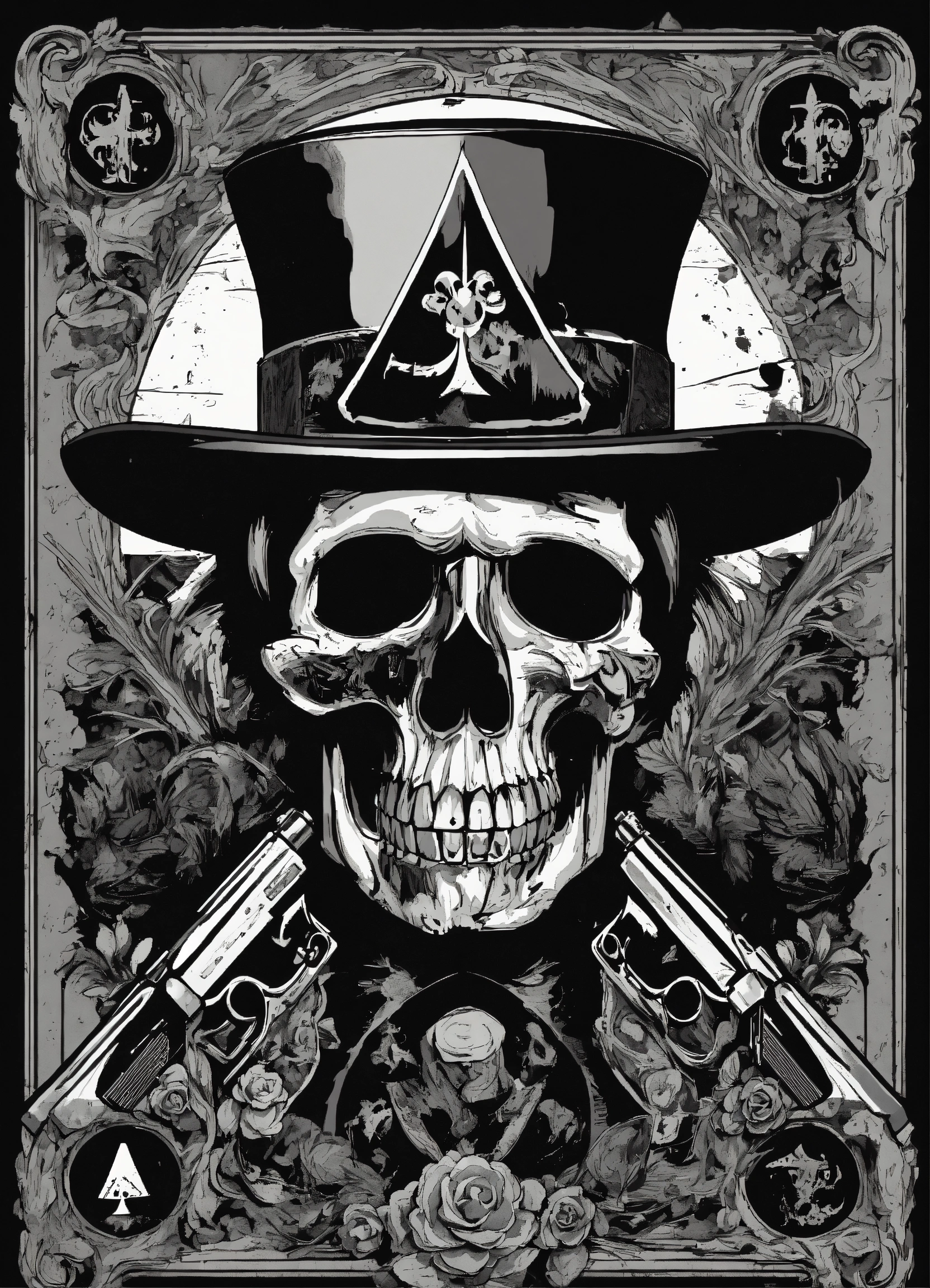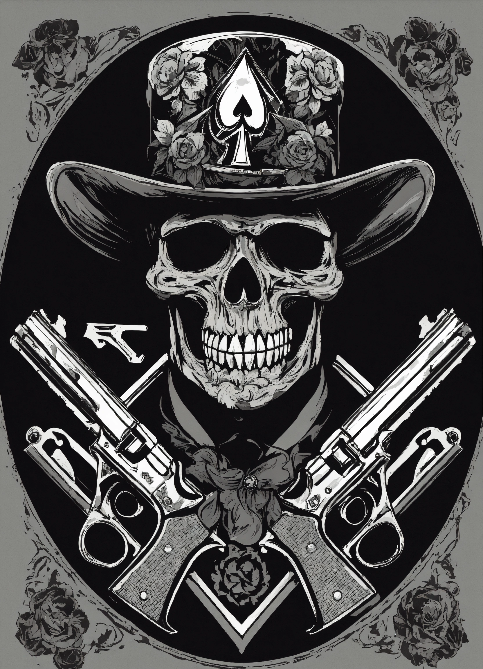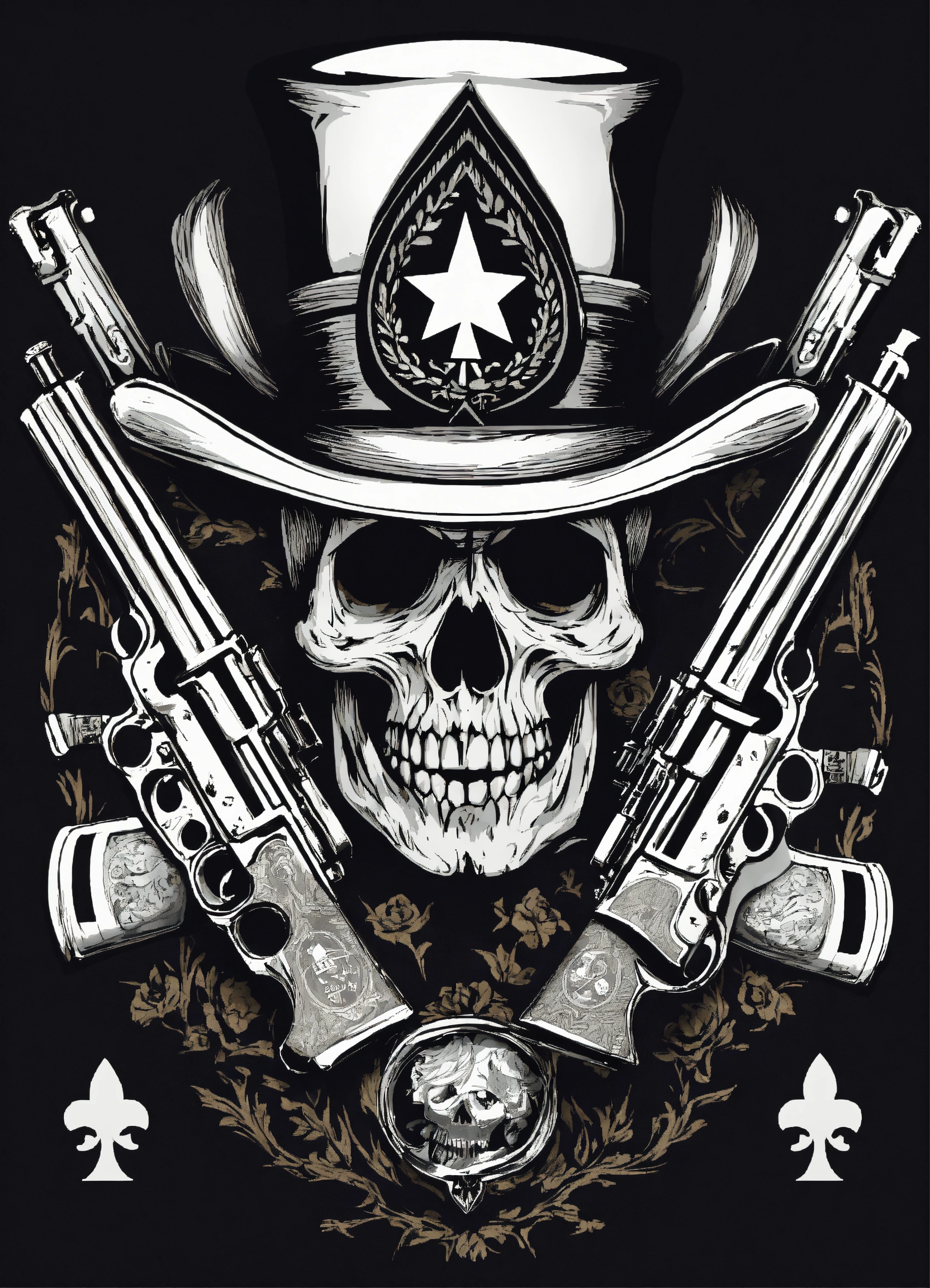 Zombie ace of spades with confederate hat on his head and colt guns around, face view, symmetrical view, tshirt design, vector design, flat design, black background, black and white