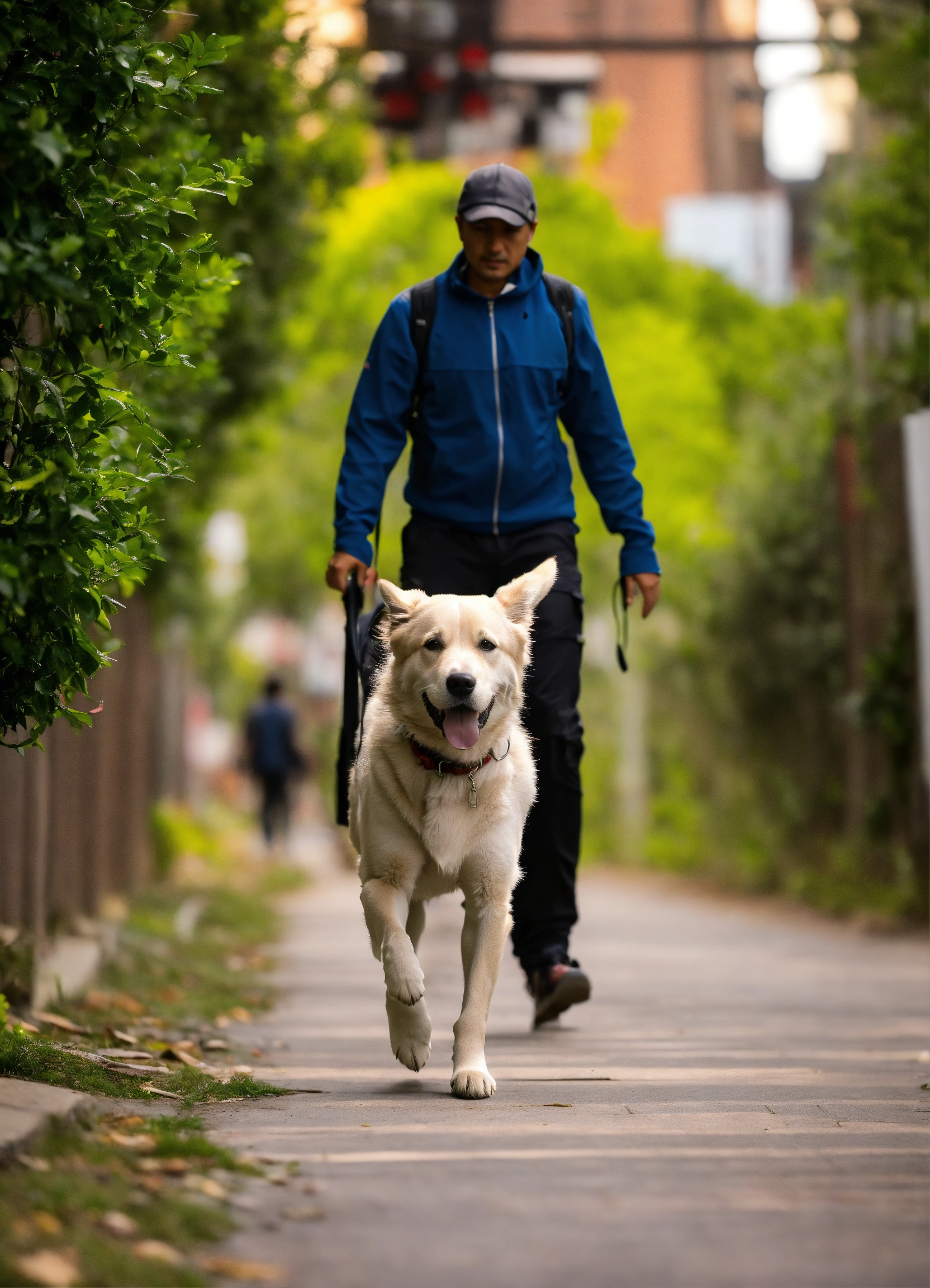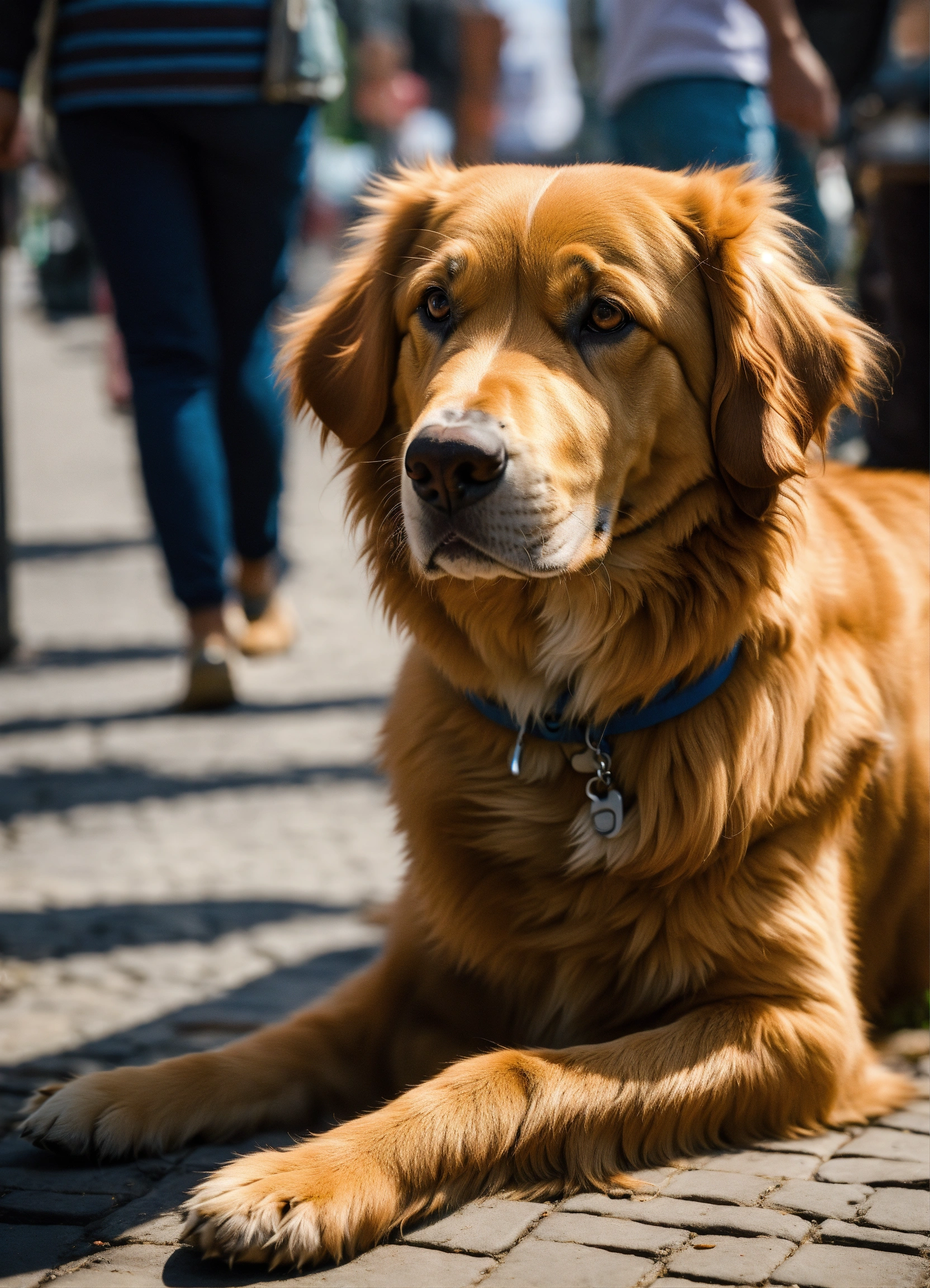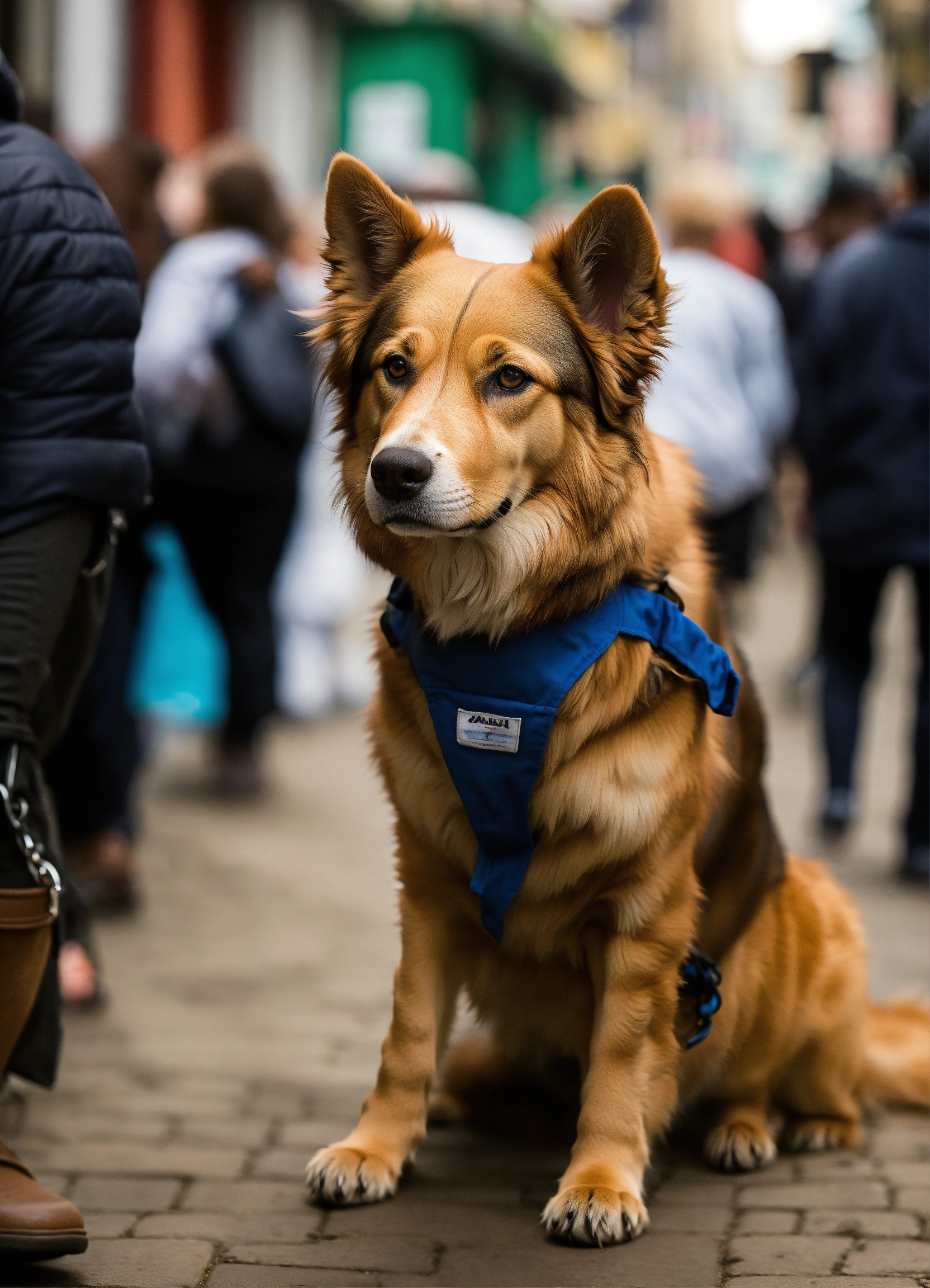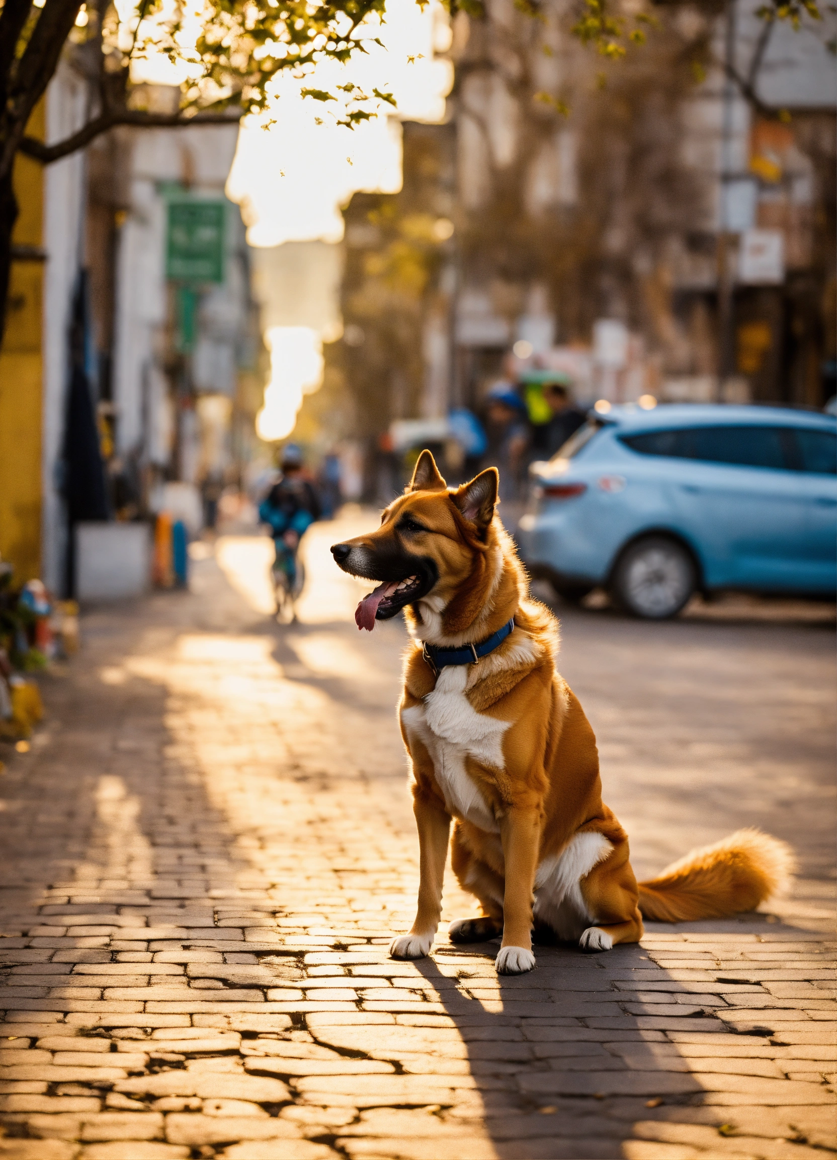 Cuerpo humano con cabeza de perro caminando en la ciudad