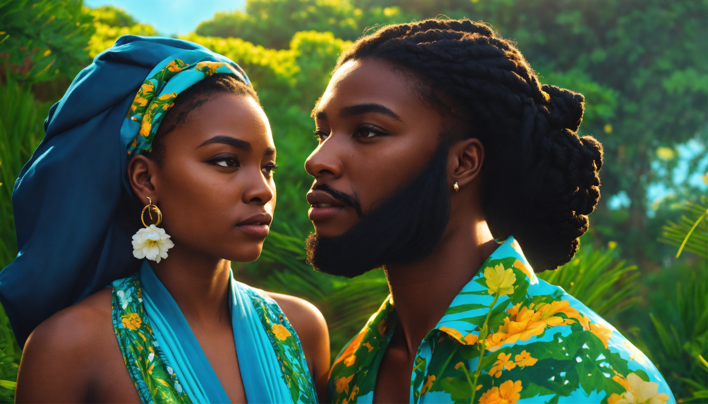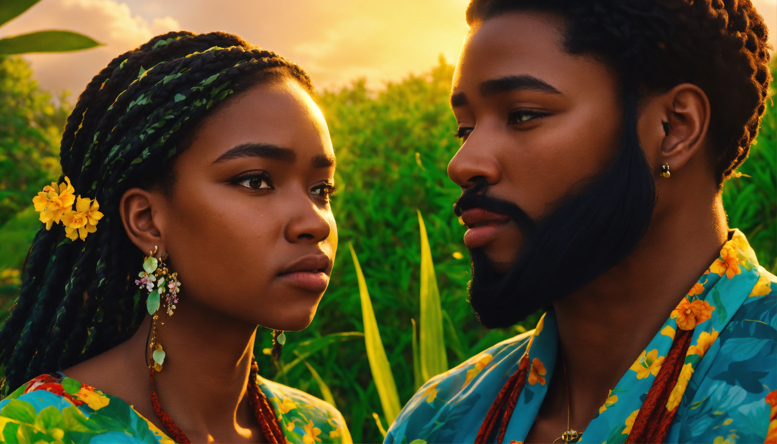 Illustrate a view of a handsome black ghanaian man and a very pretty small black ghanaian woman with long bushy braids. their hair is black. they are hiding behind some bushes. only their faces show. they are in a beautiful grassy lush area with flowering trees, foliage, and flowers. there is a beautiful blue sky with bright clouds. they wear dark green leafy print clothing. a strong beam of sunlight shines on their faces from above. they sob hard. full of regret, sorrow, and fear are on their faces. close-up view. photorealistic. 8k.